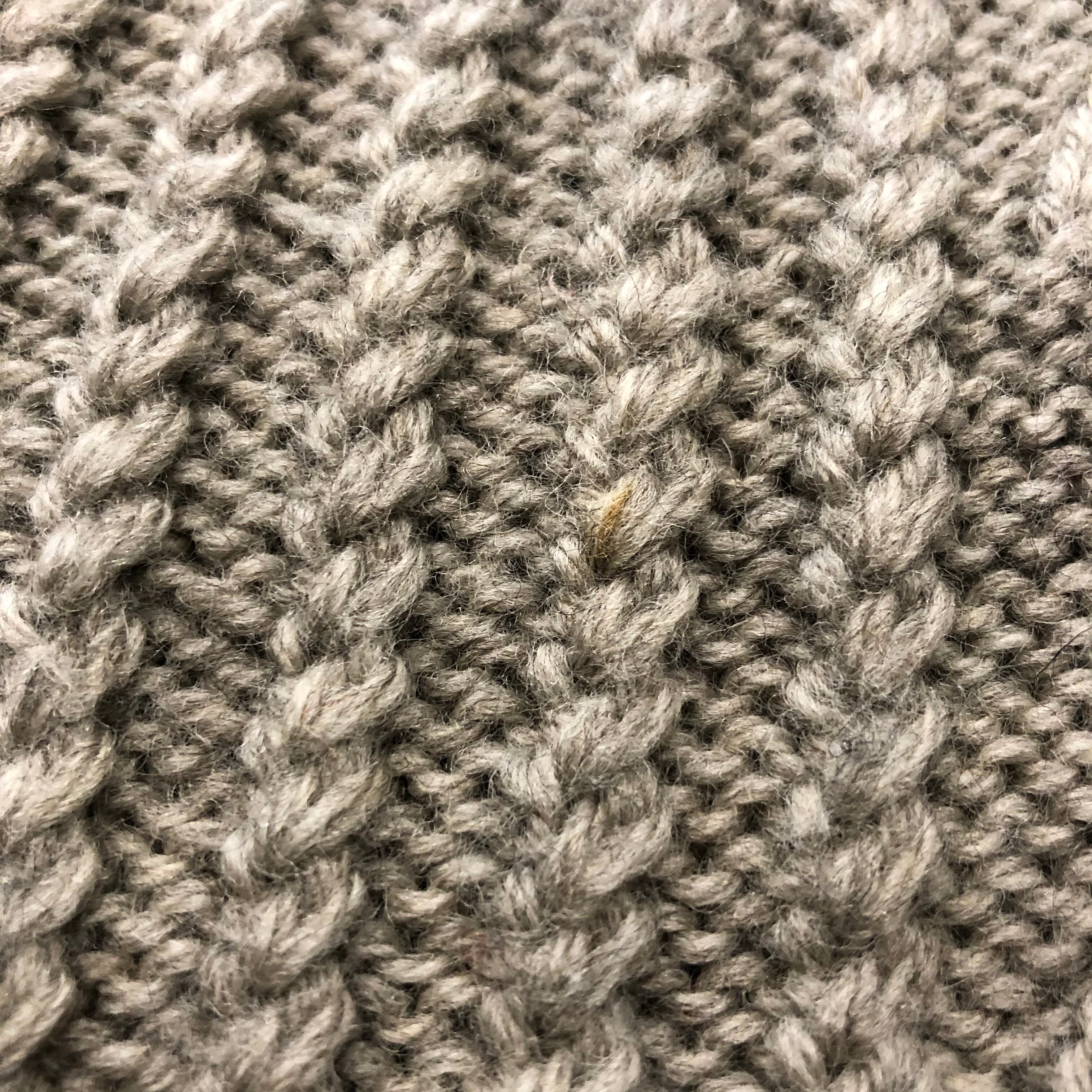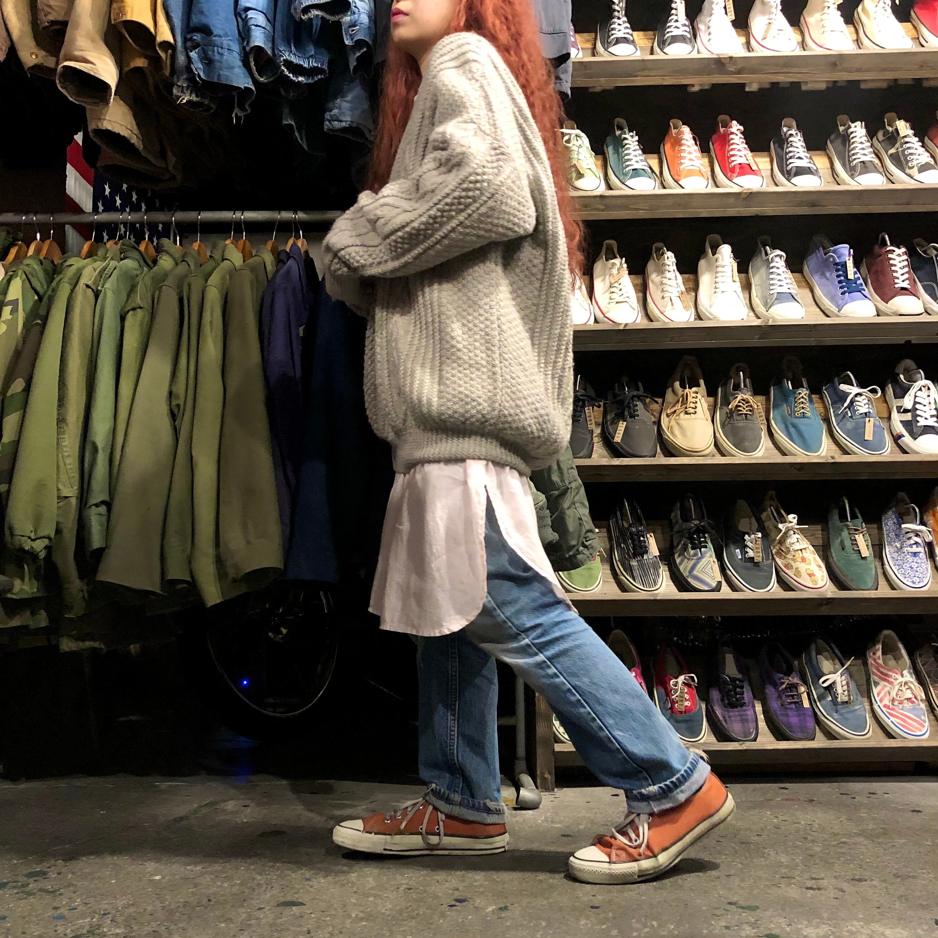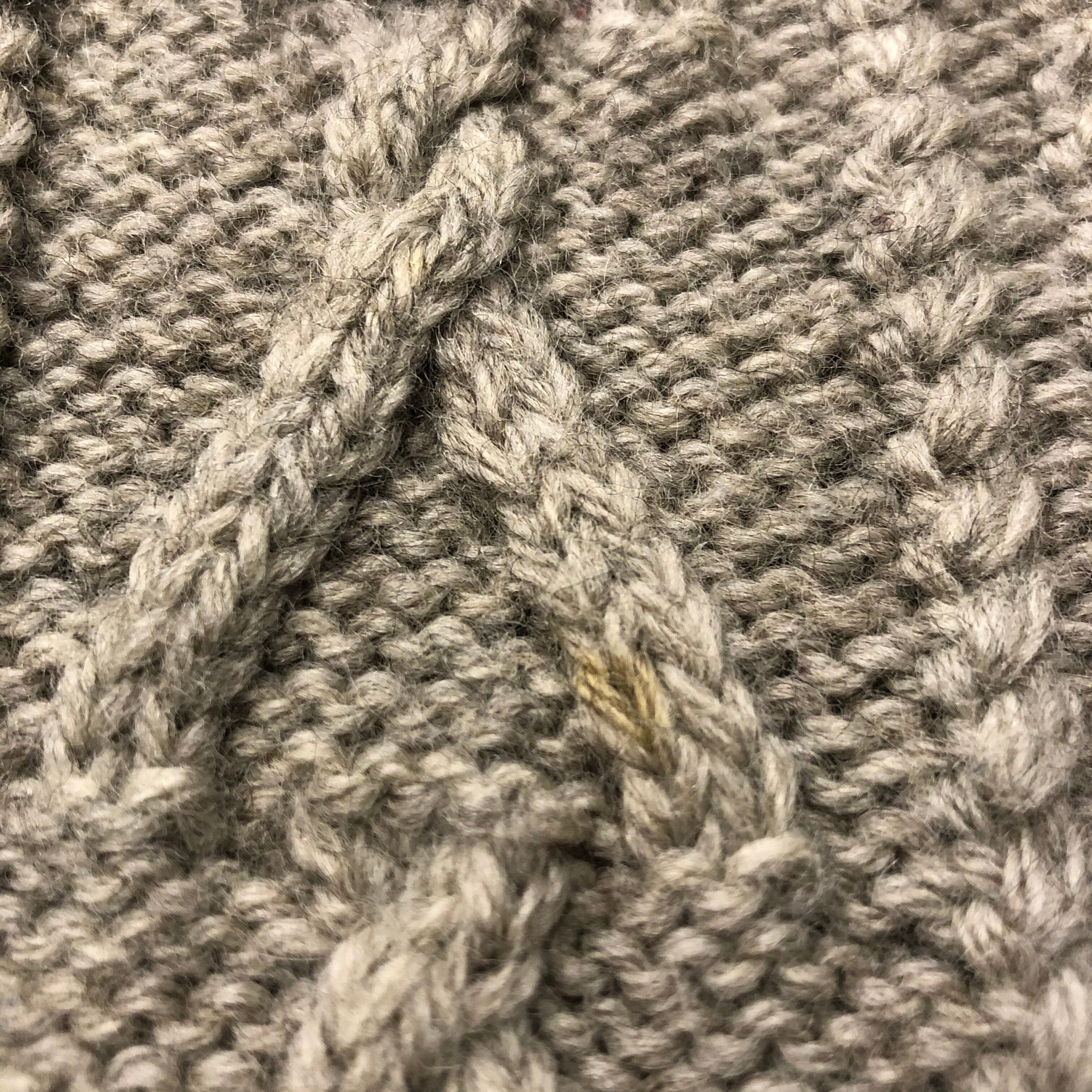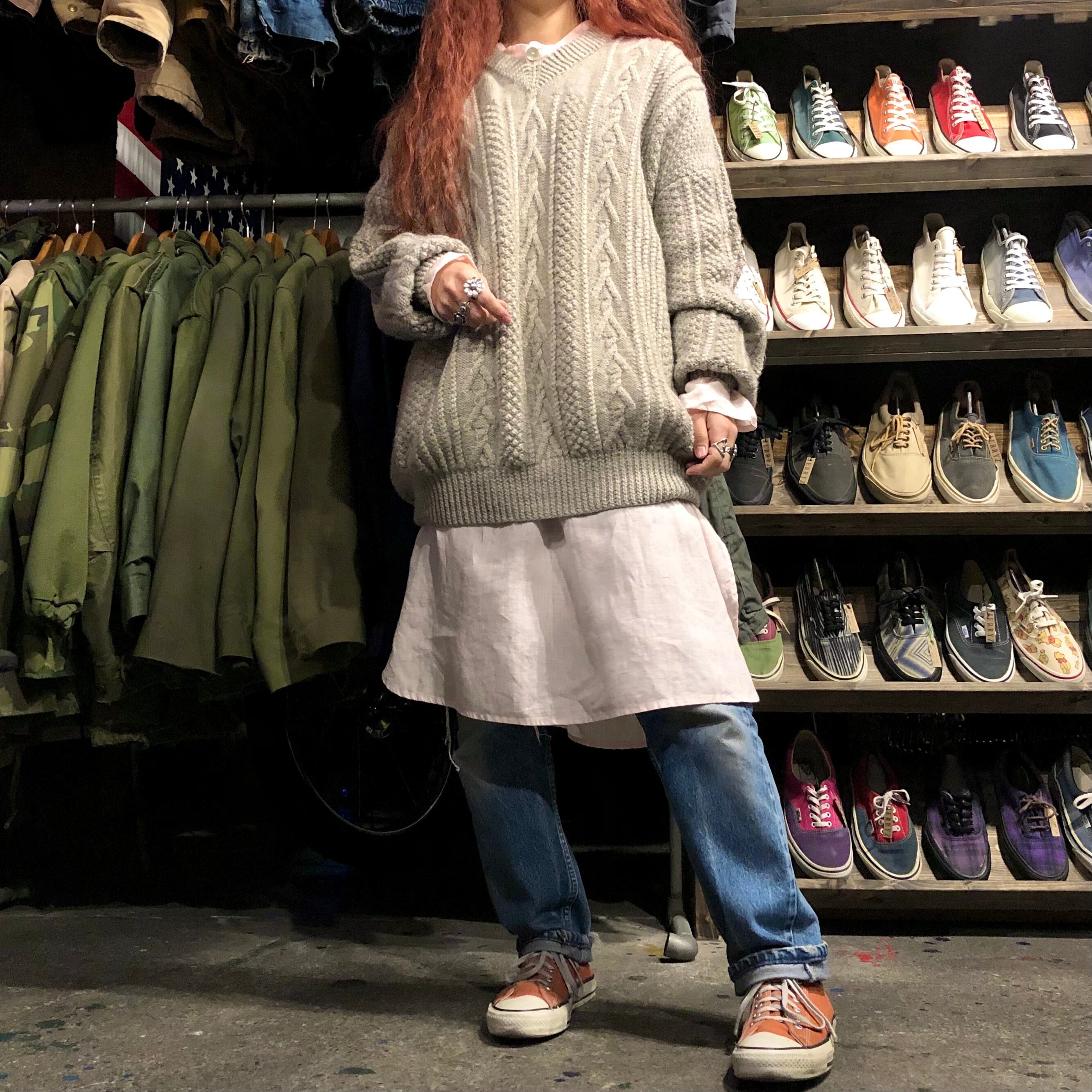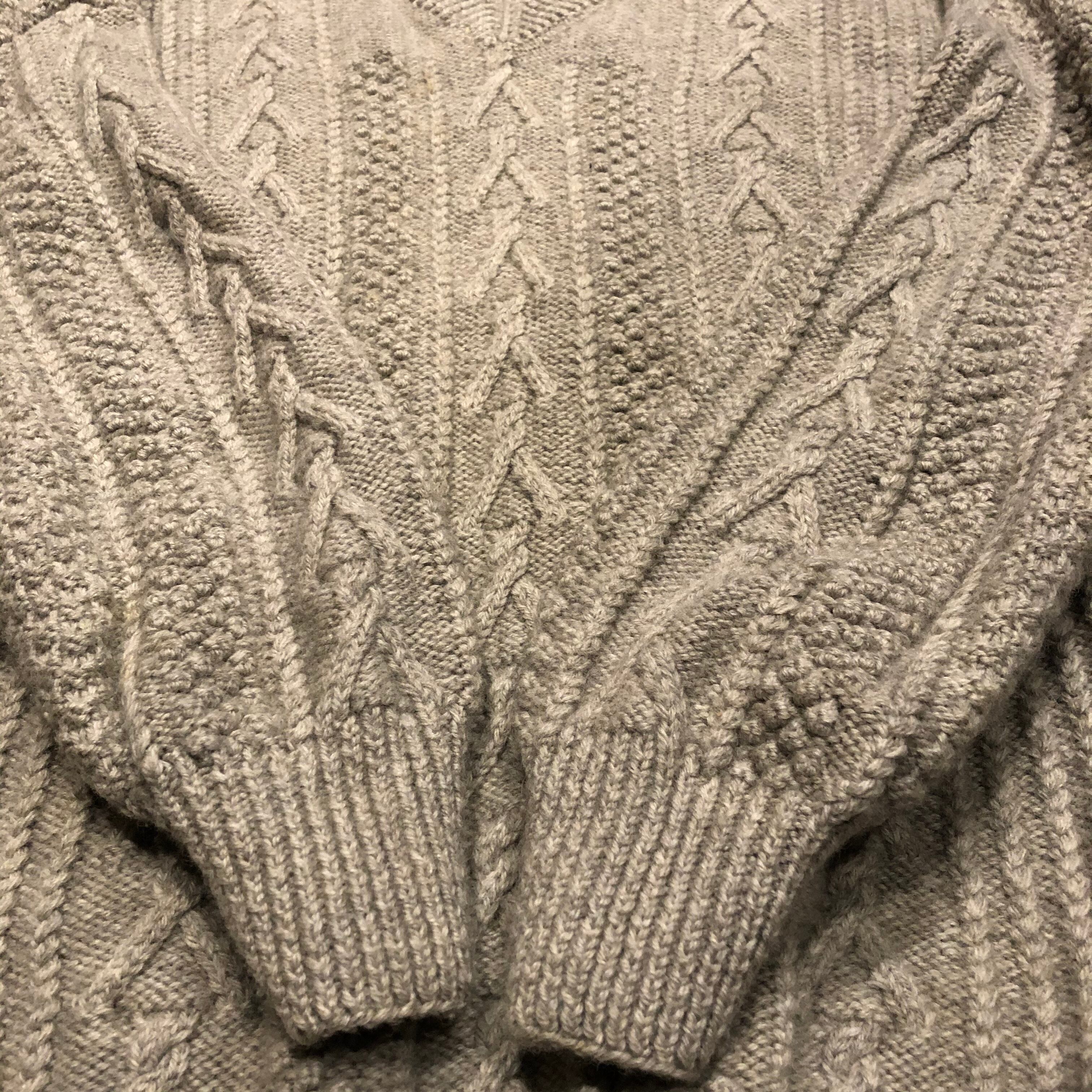 大きいサイズでゆったりしていて若干重みはありますが、とても温かい一着です。狭めのVネックが大人っぽく、編み地も独特でかわいいです。