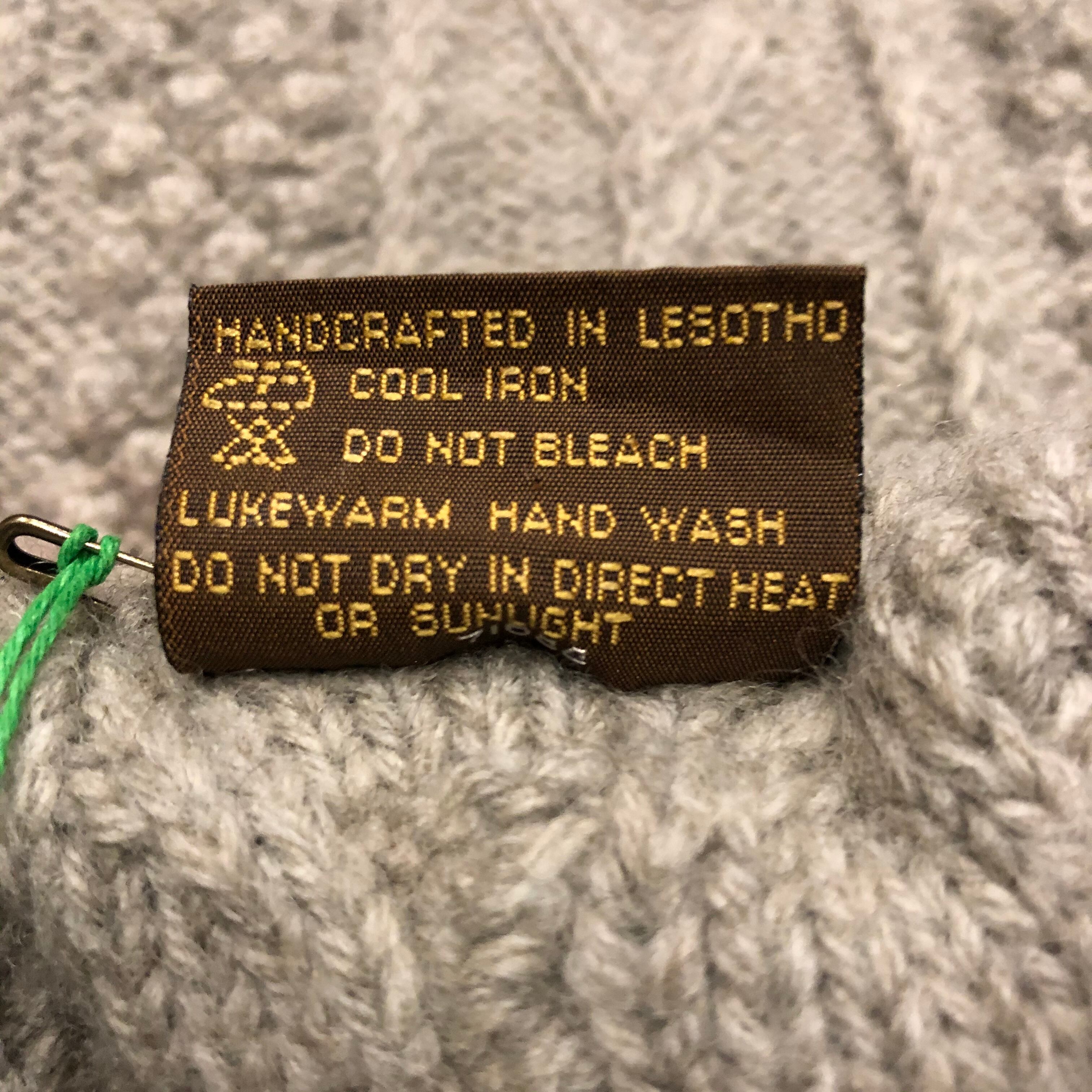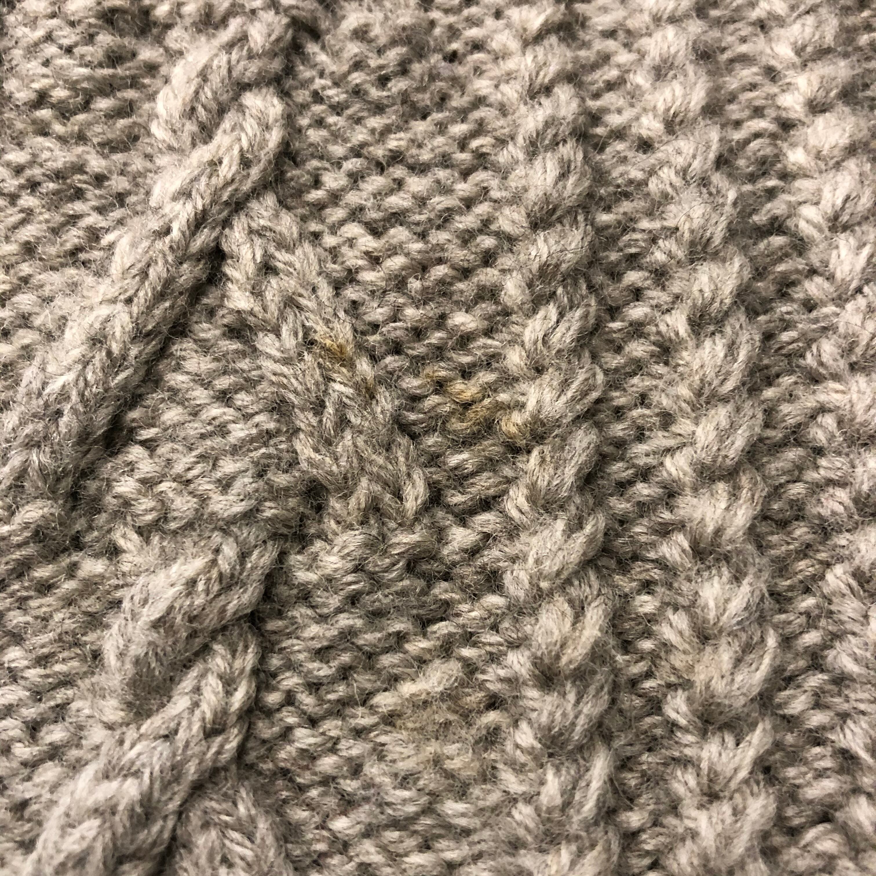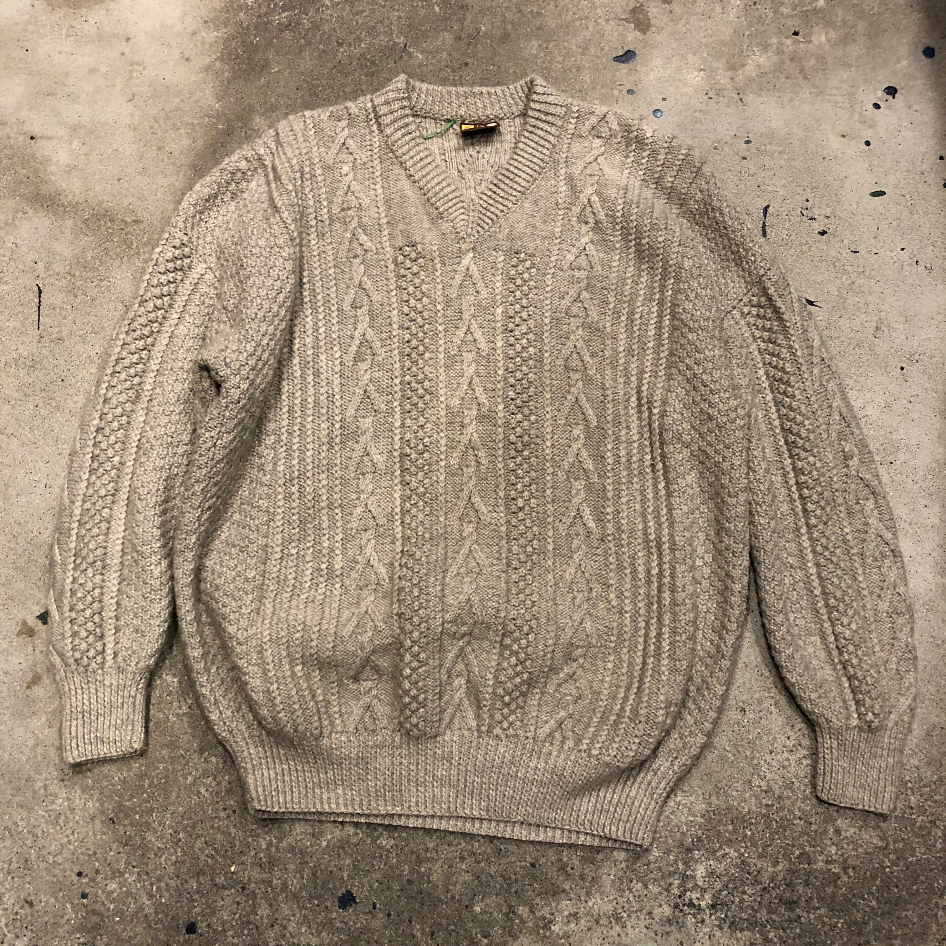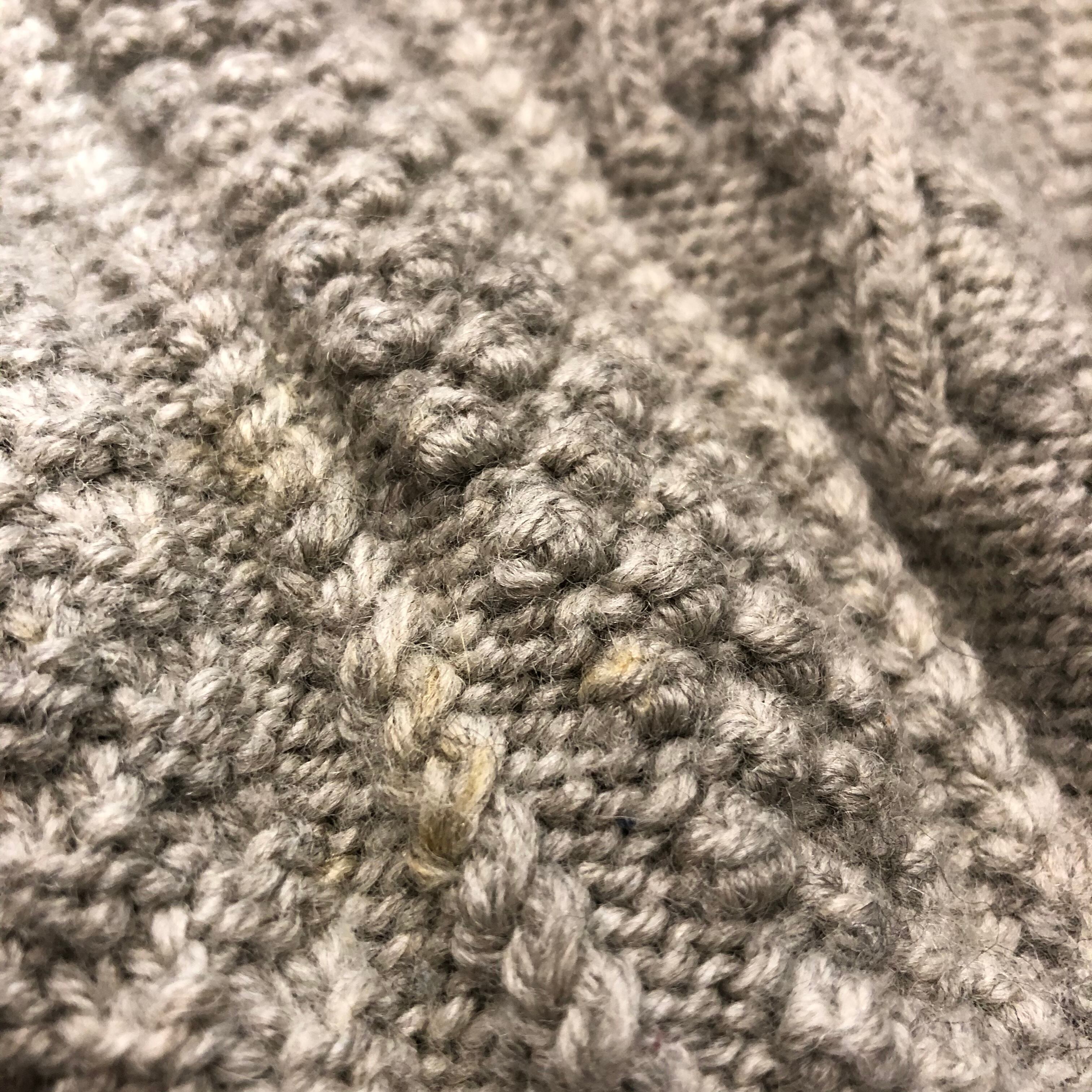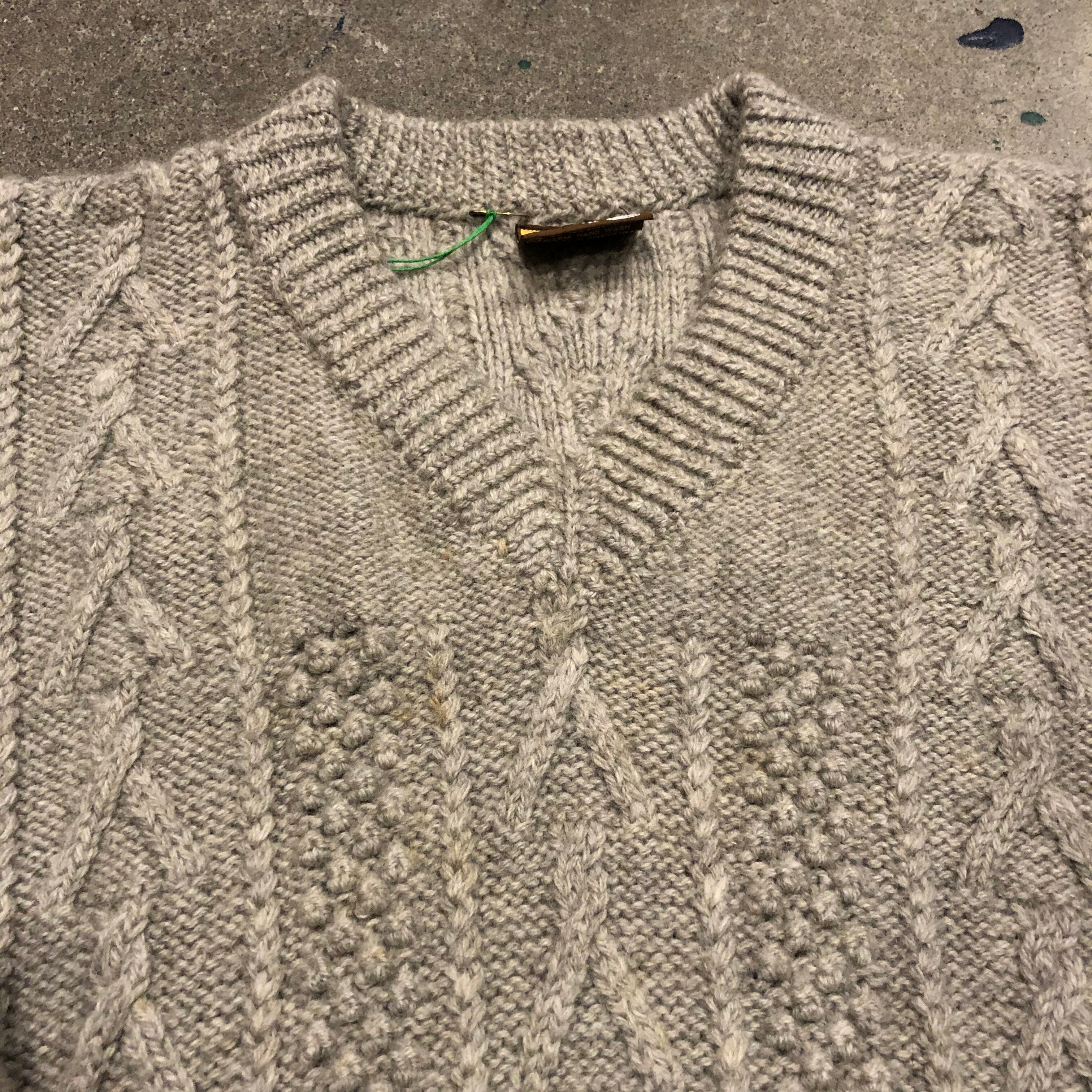 グレーと生成りを混ぜたような優しい色味の手編みのセーターです。