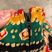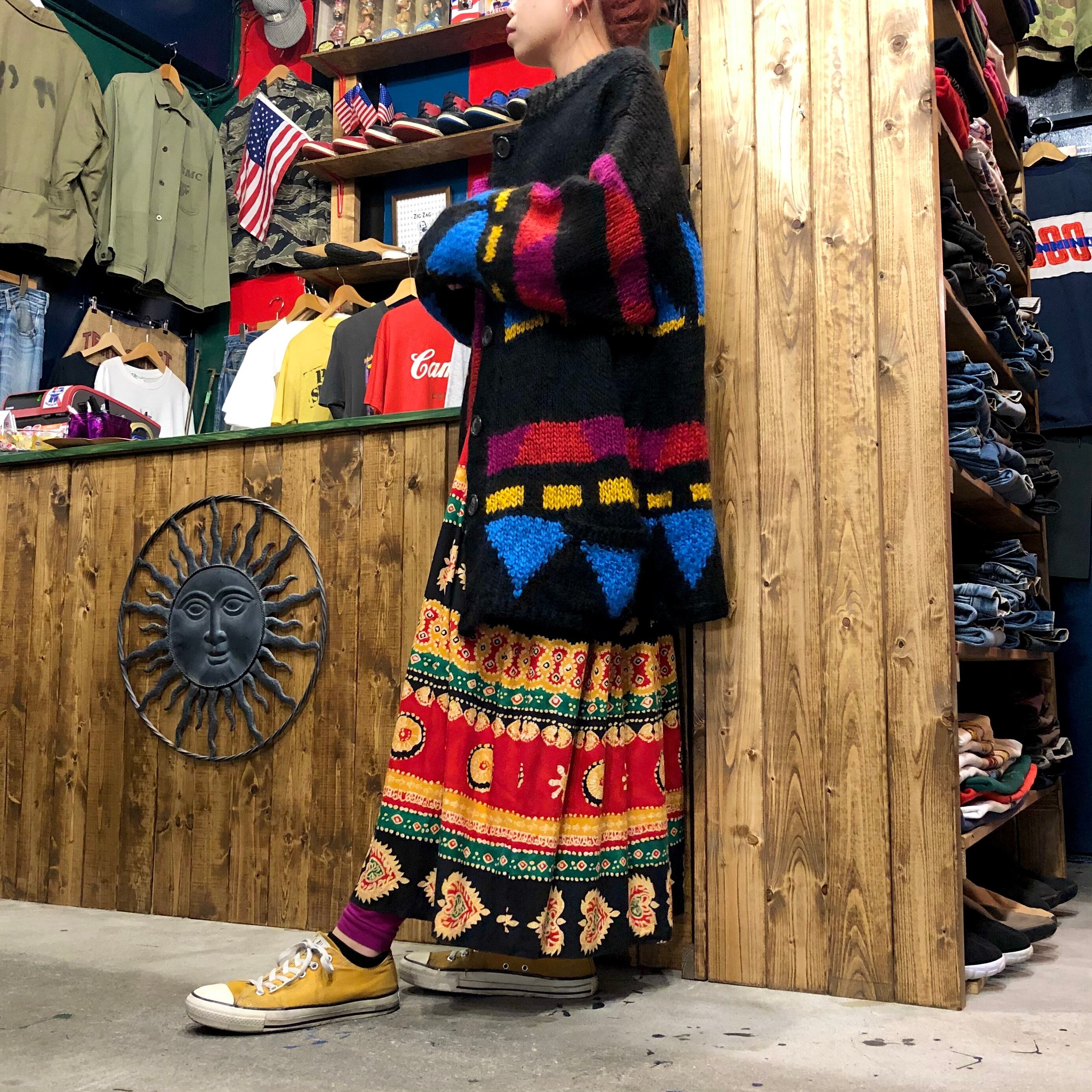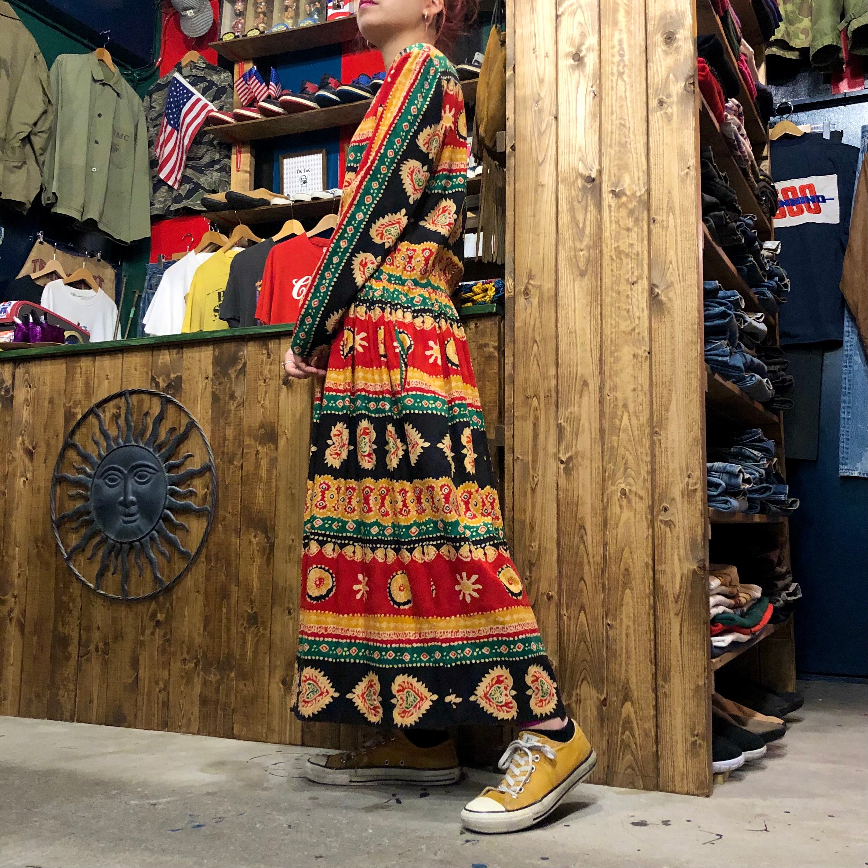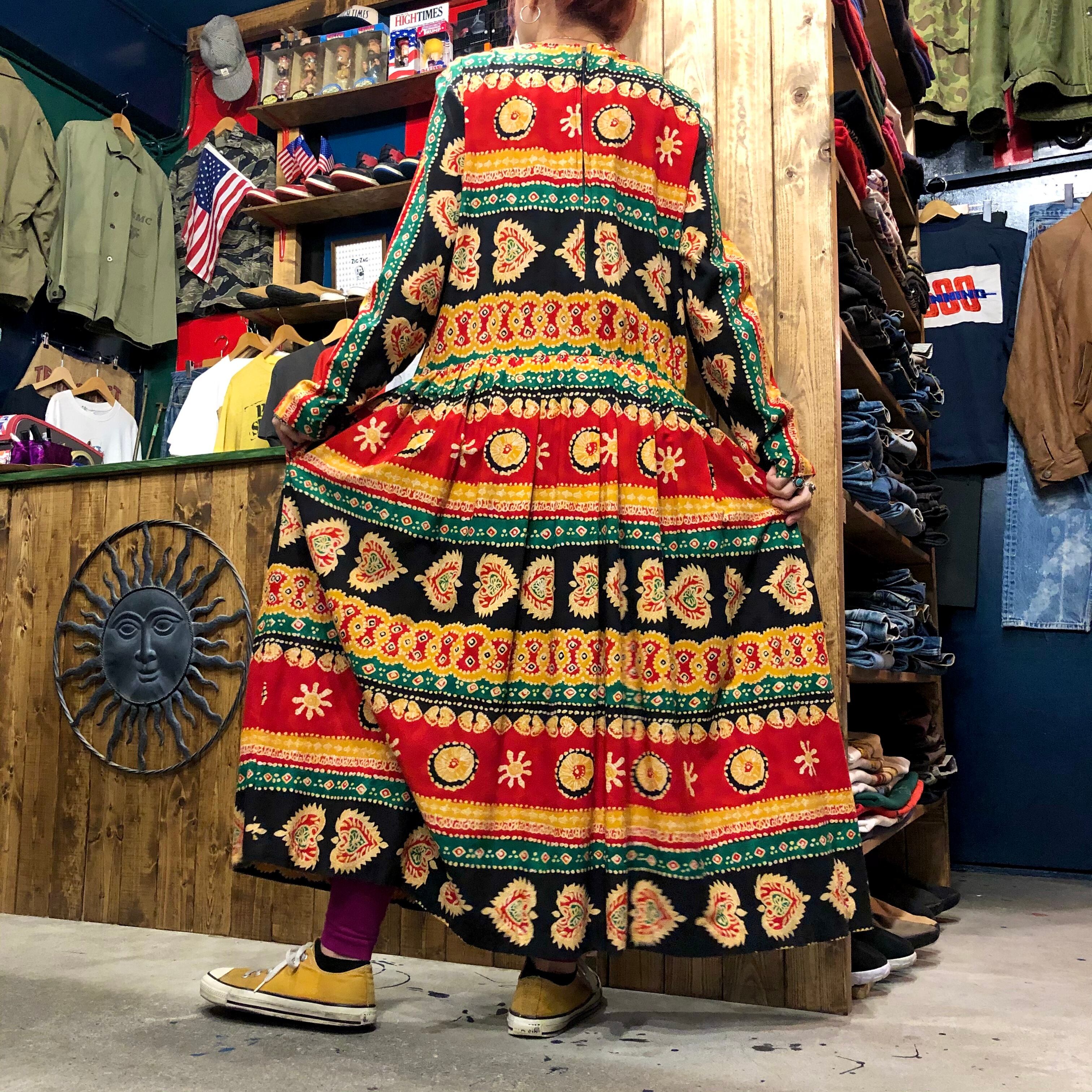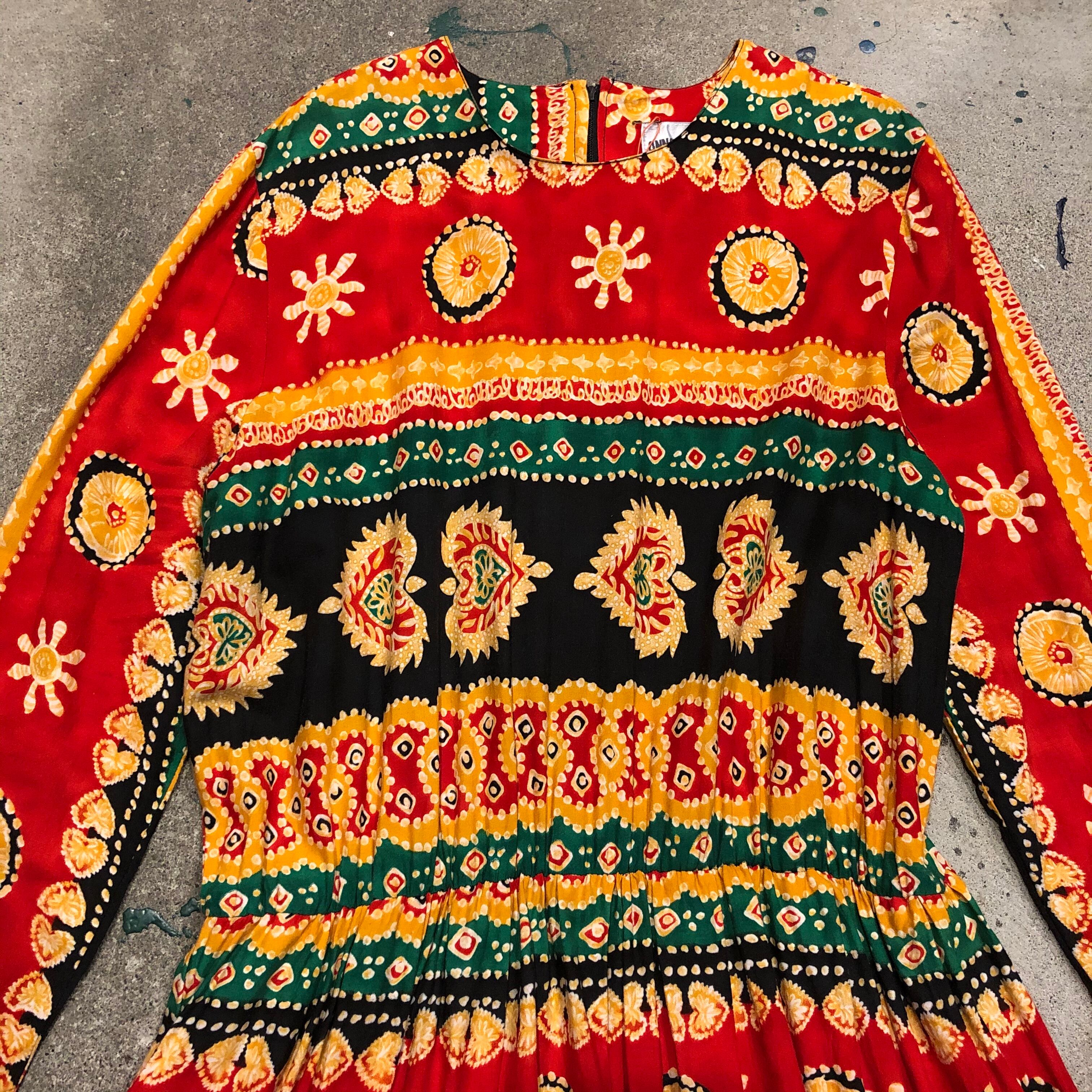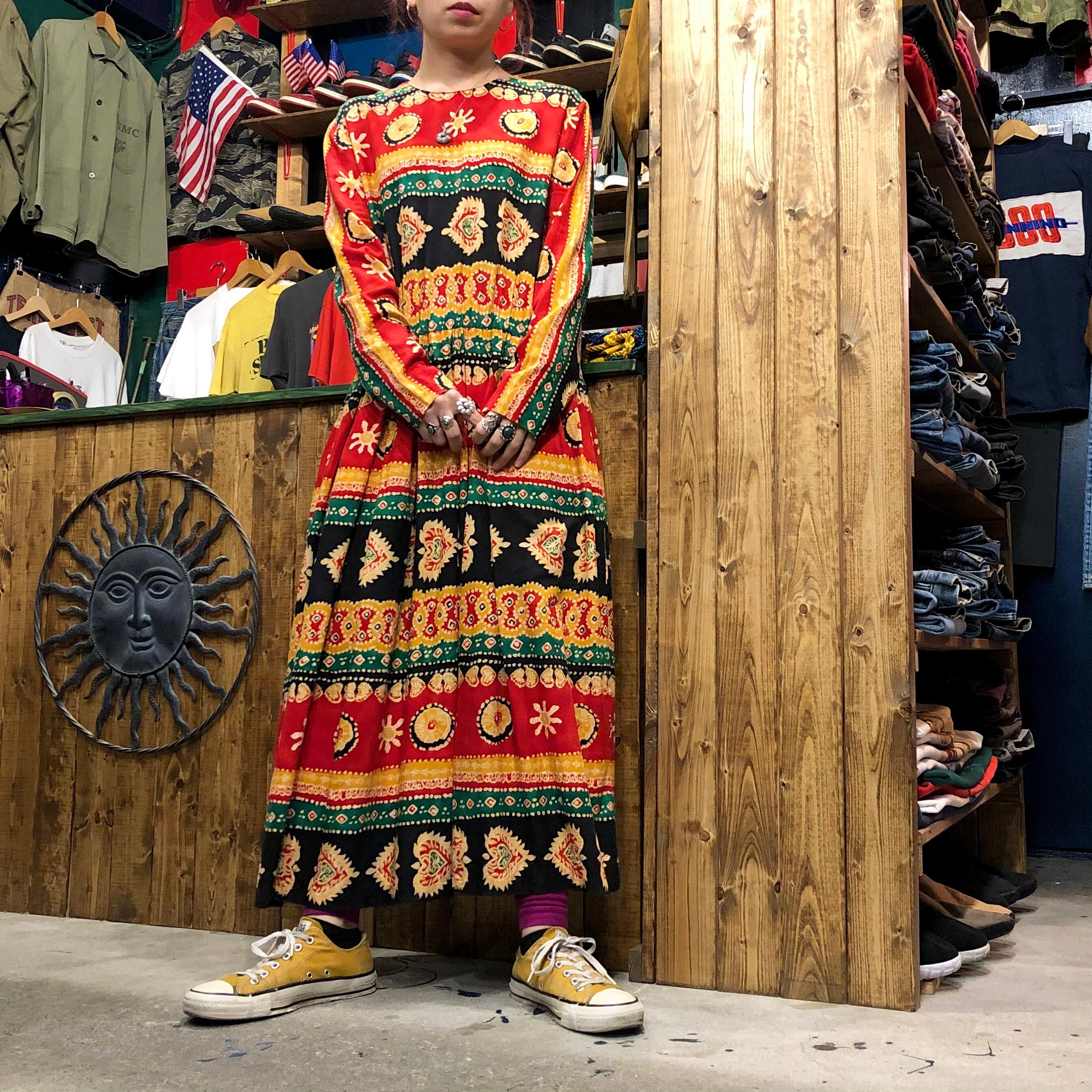 エスニックな柄がかわいい長袖のワンピースです。独特な雰囲気が素敵ですが、シルエットは至って普通でウエストはゴムになっていたり気楽に着られる一着です。