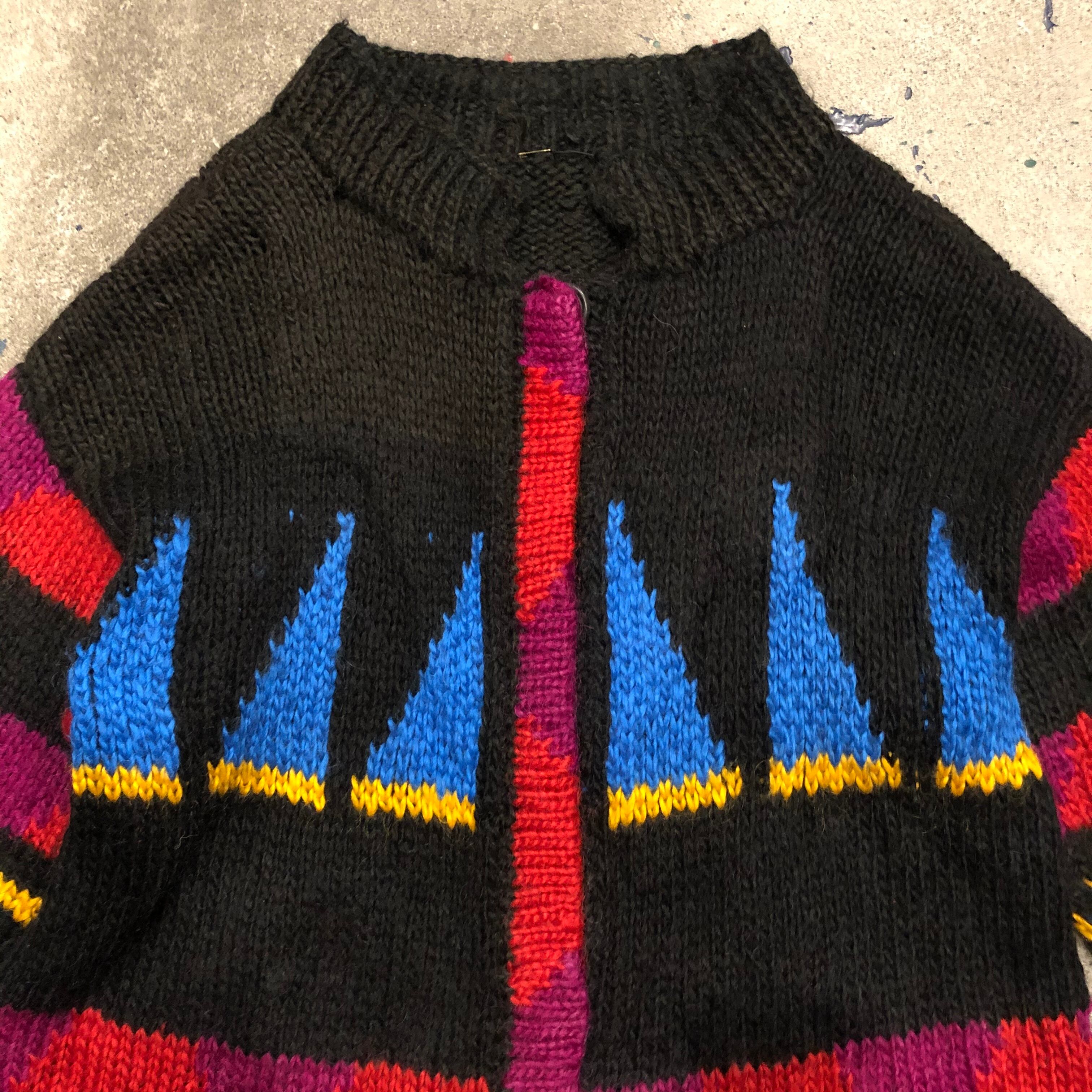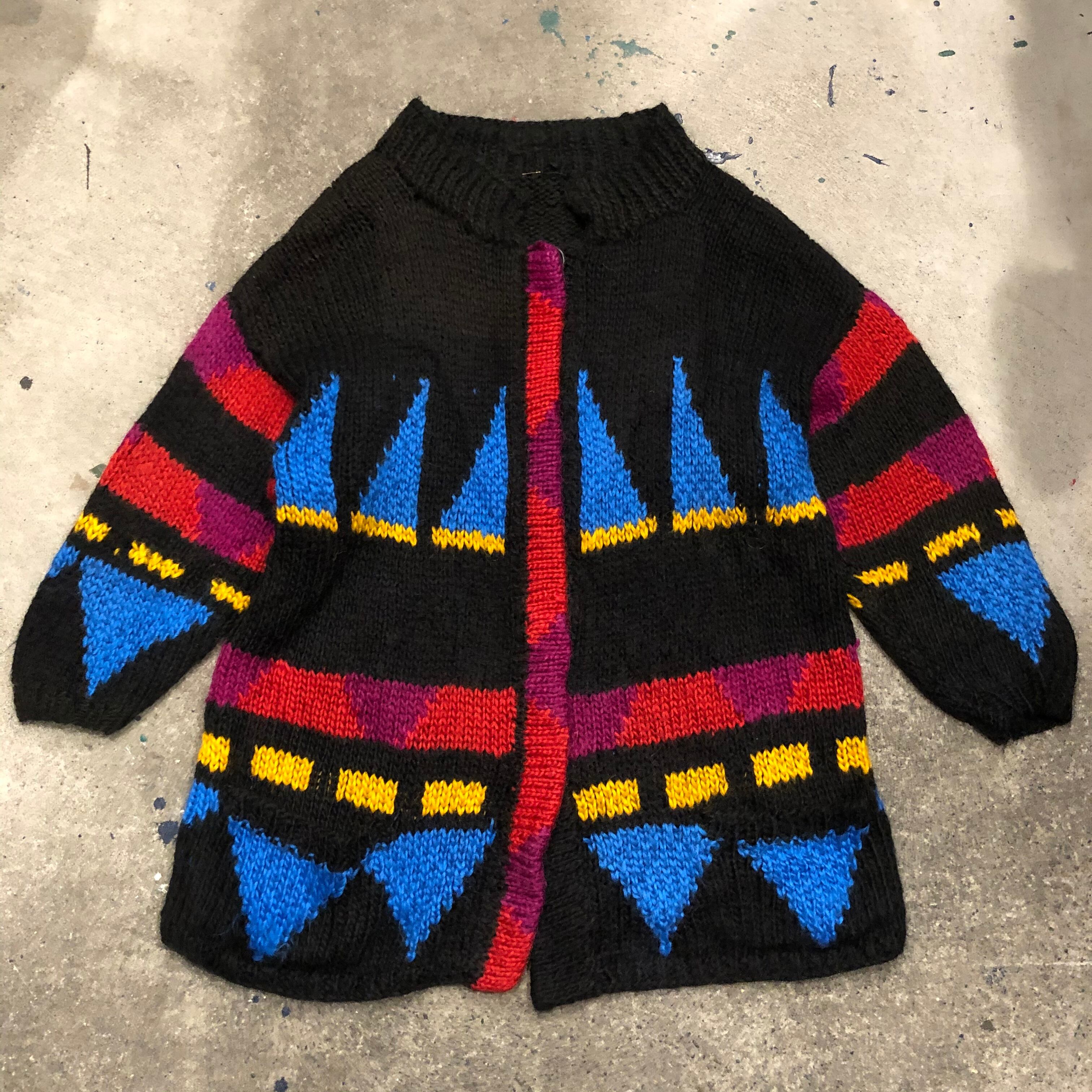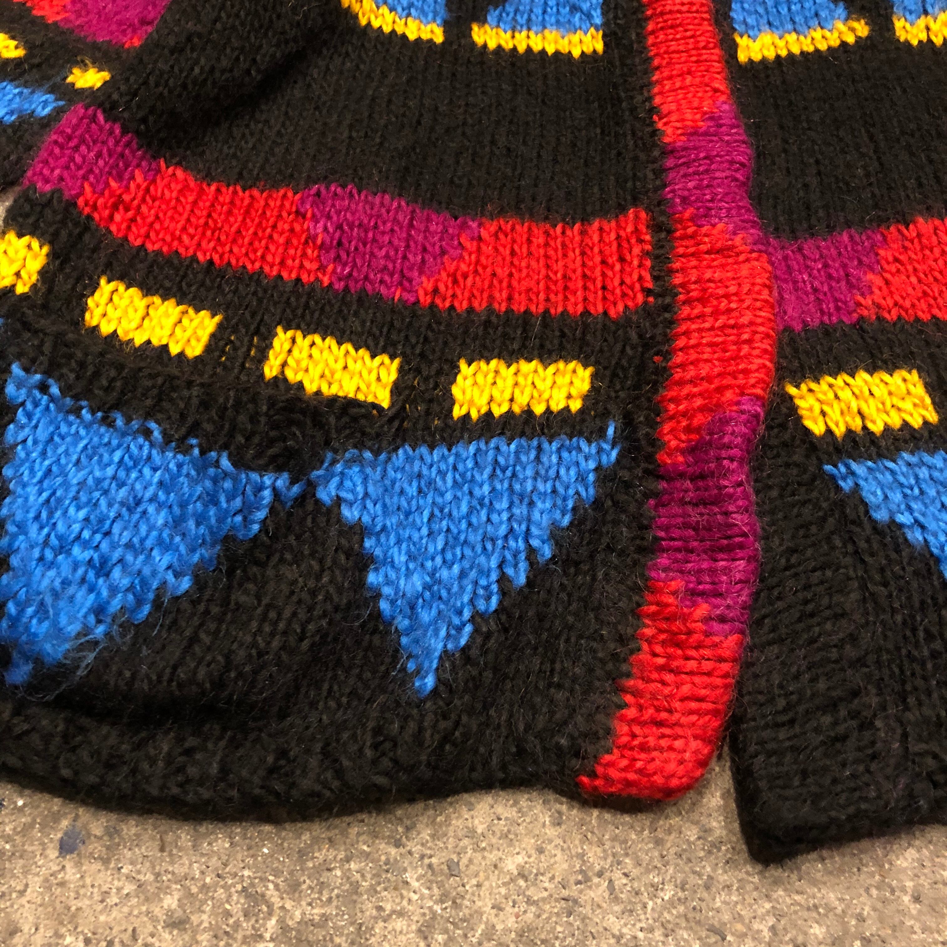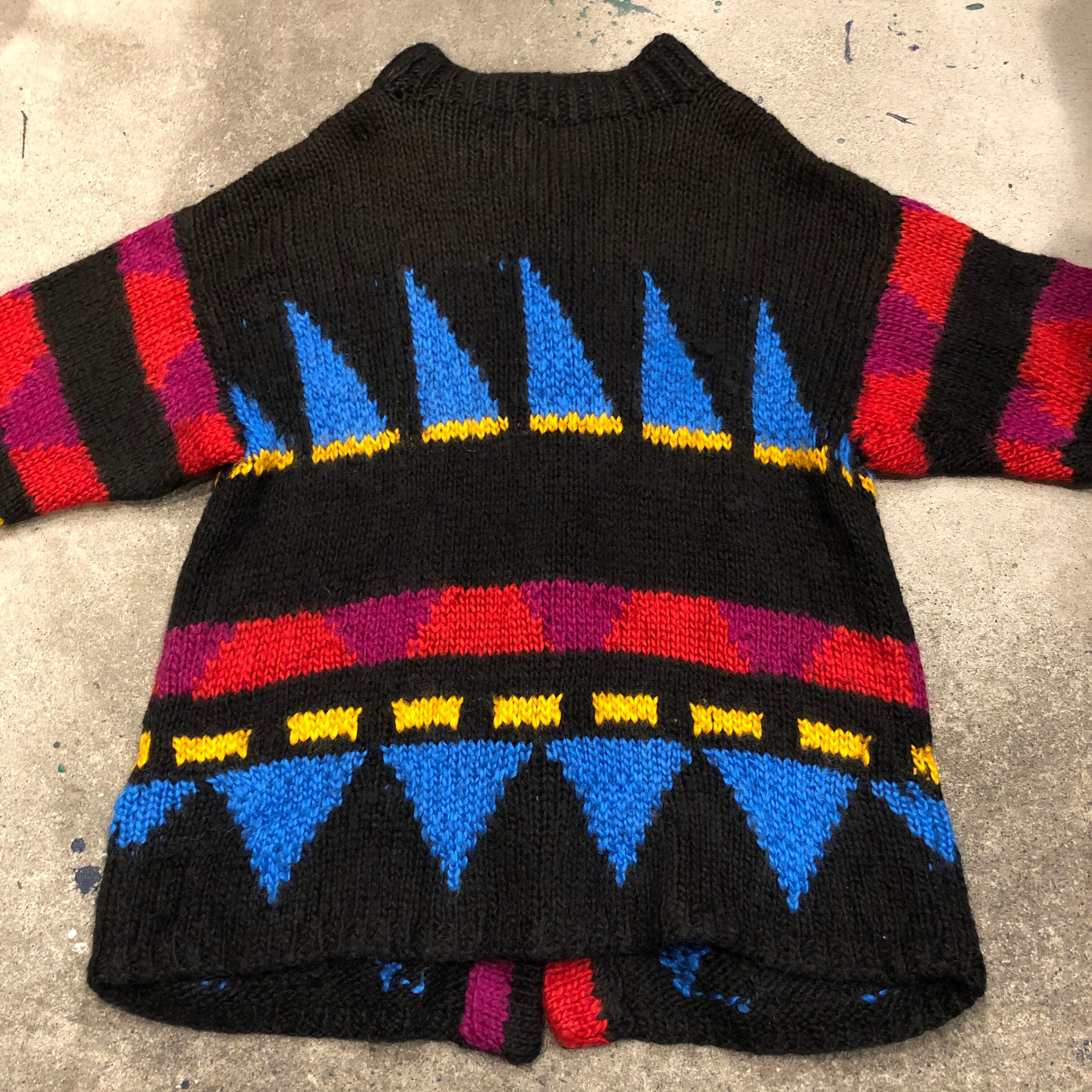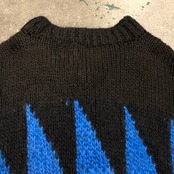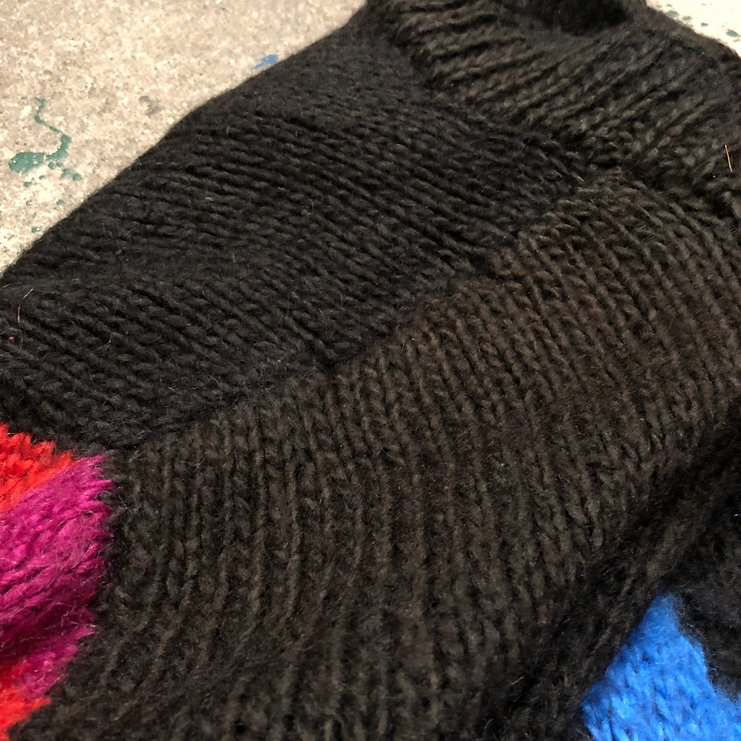 柔らかい毛糸でざっくり編まれており襟ぐりや肩周りが伸びています。