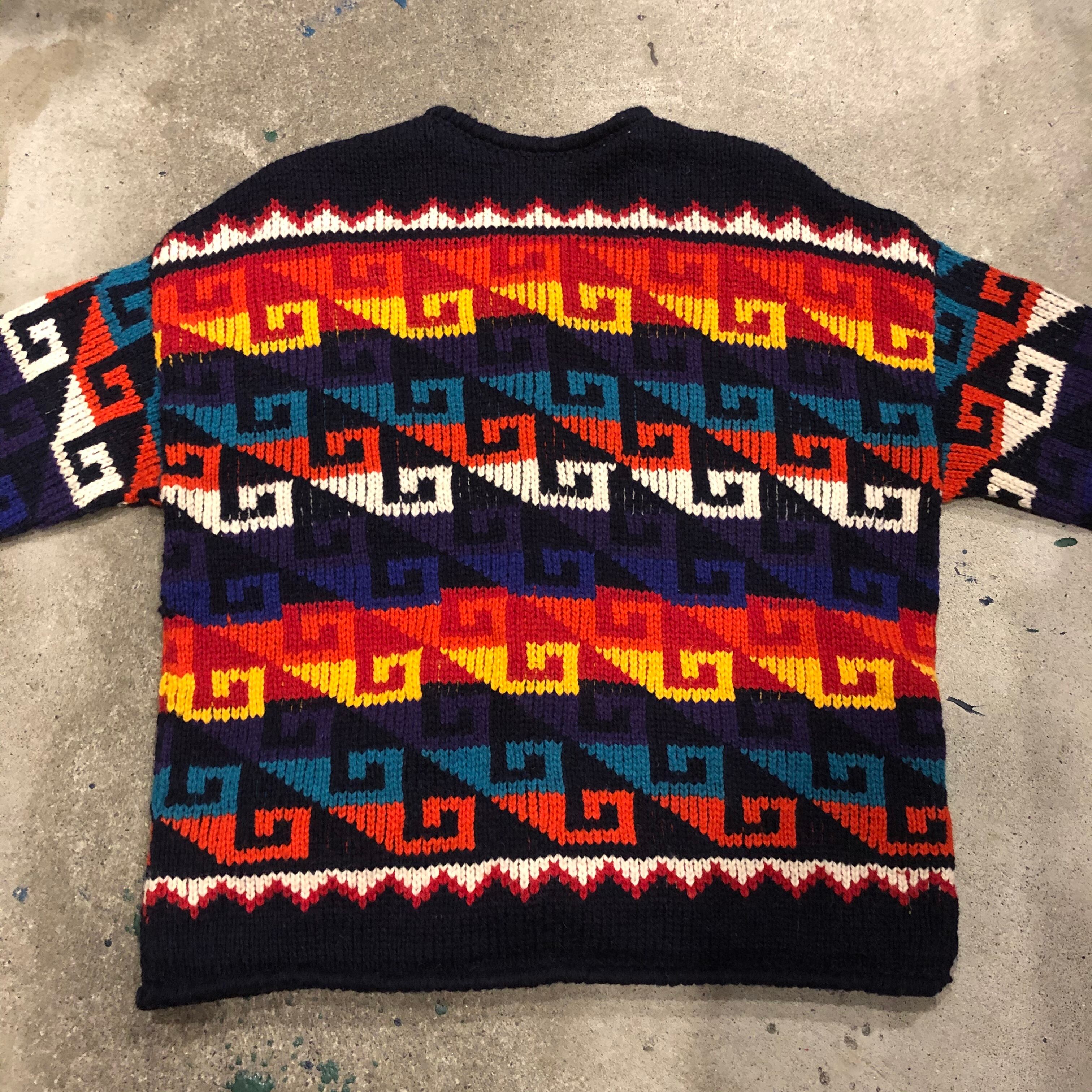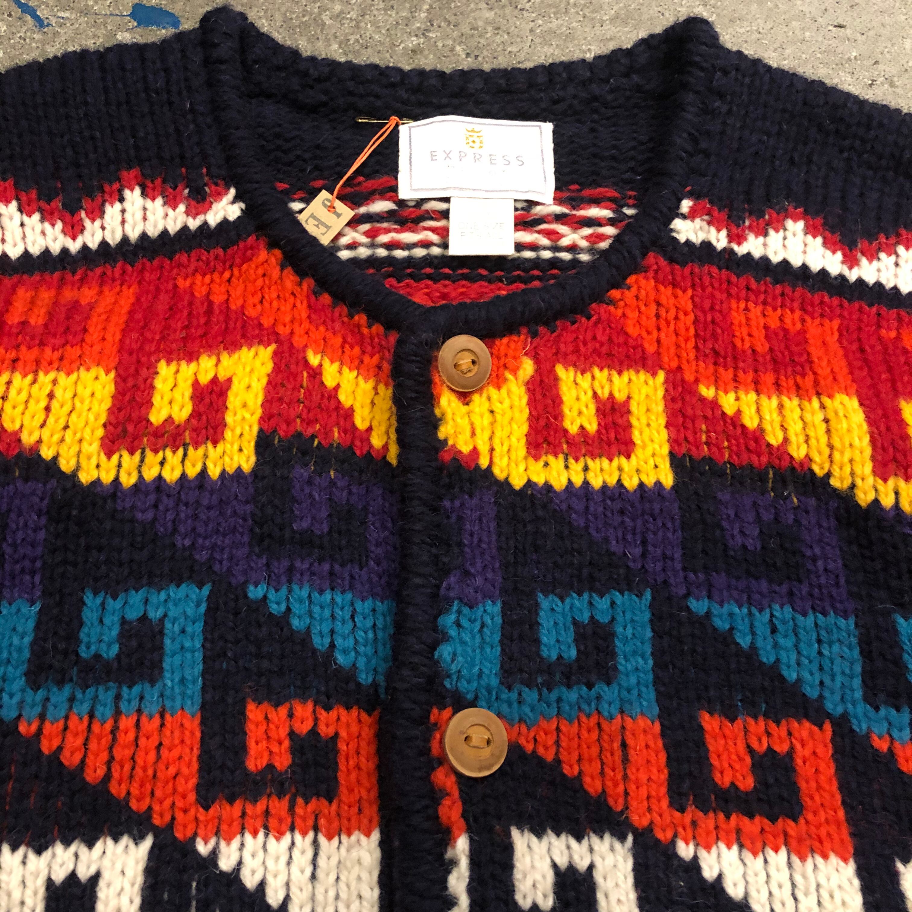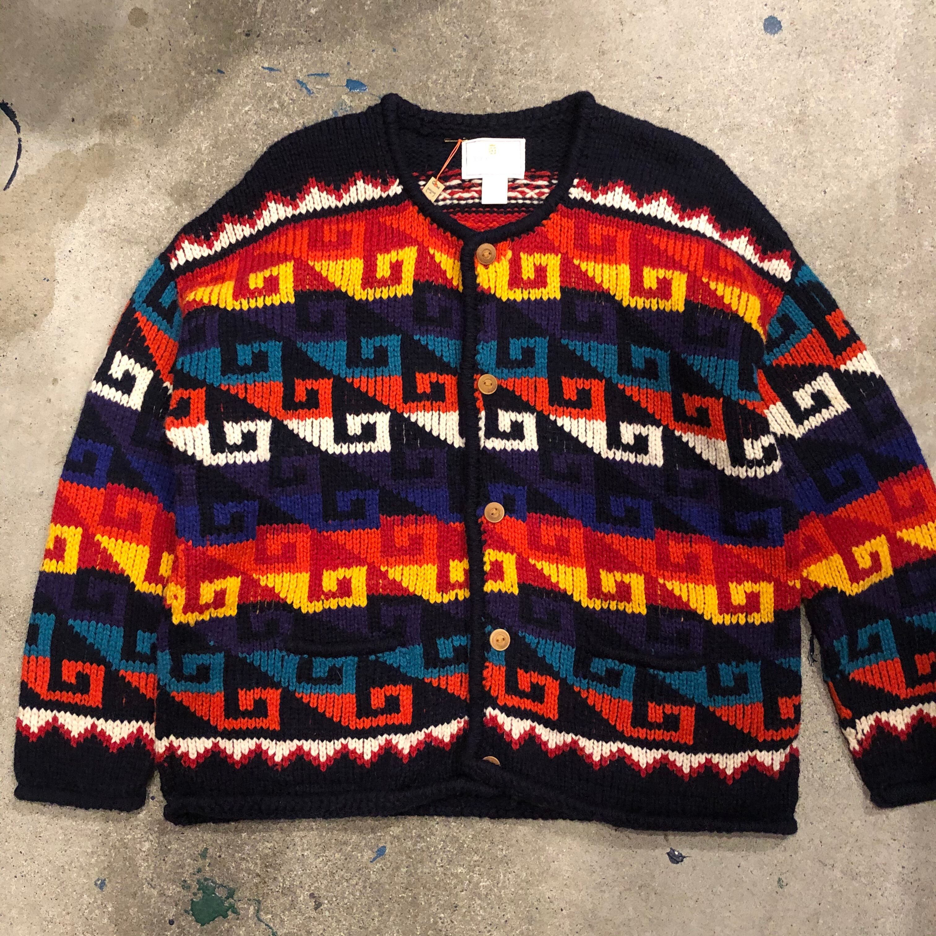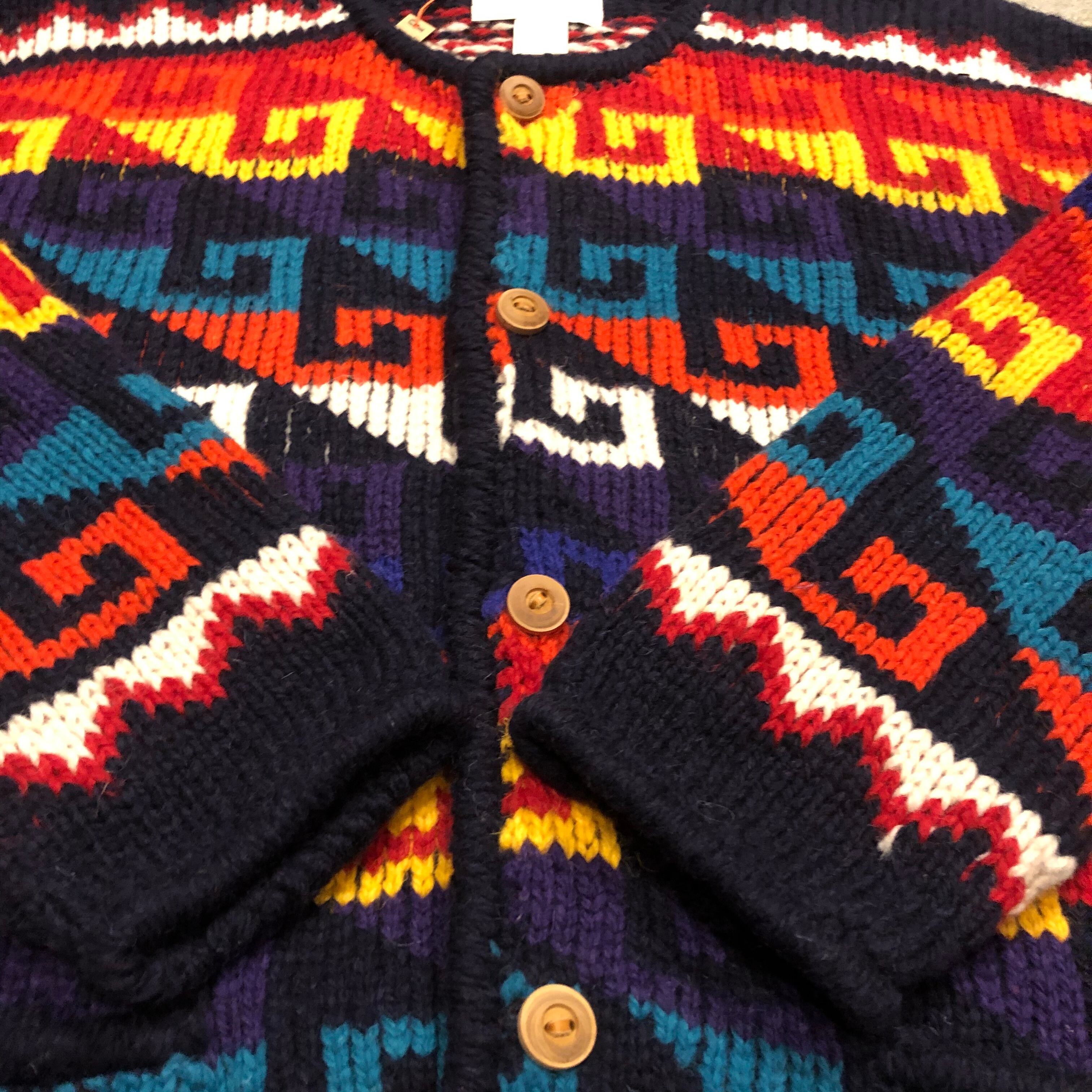 このカラフルな色合いに独特の模様、木のボタンがレザーの紐で止められておりとてもかわいい一着です。カラフルですが深いネイビーがメインなので派手すぎず良い雰囲気です。肉厚なウールでしっかり編まれておりとても暖かいと思います。