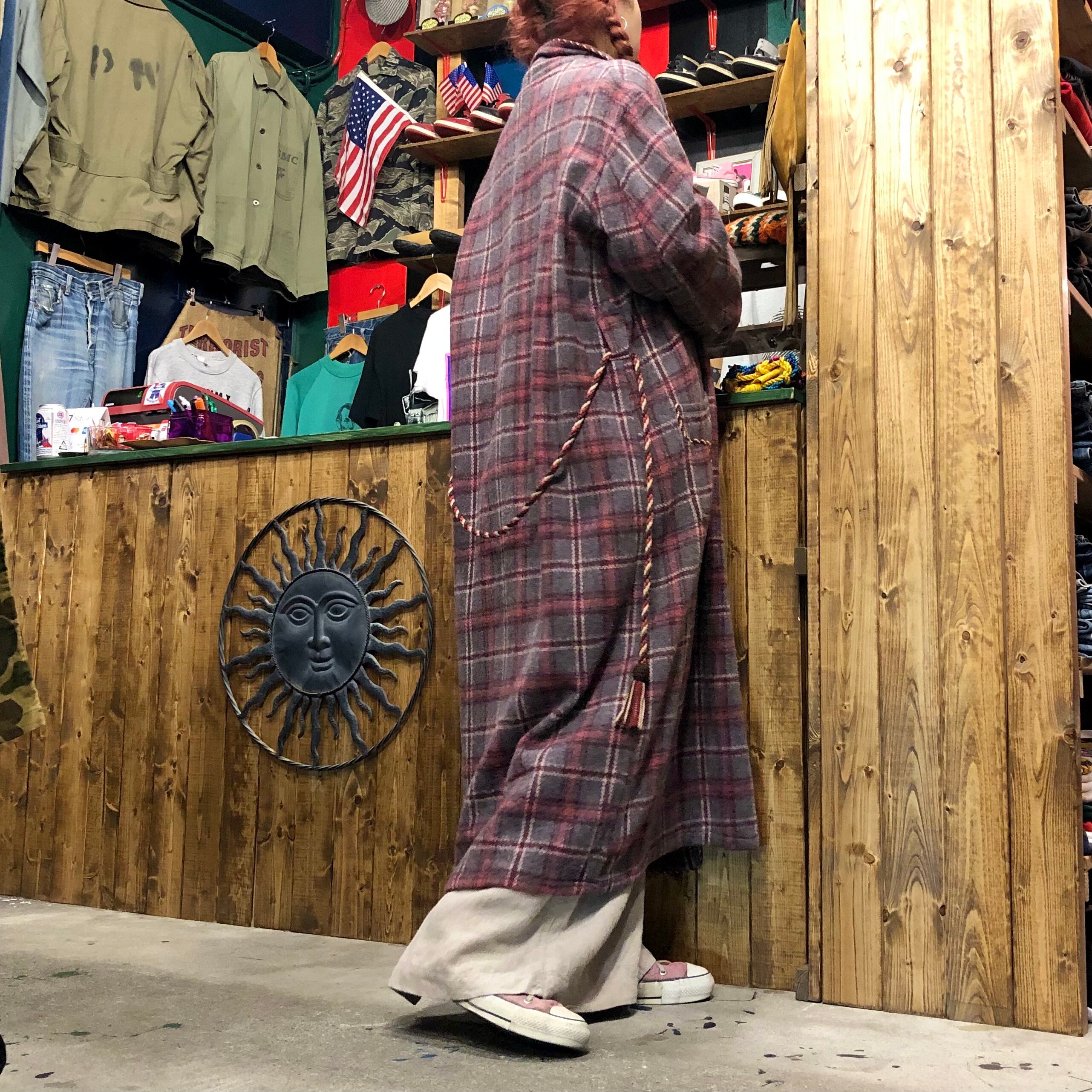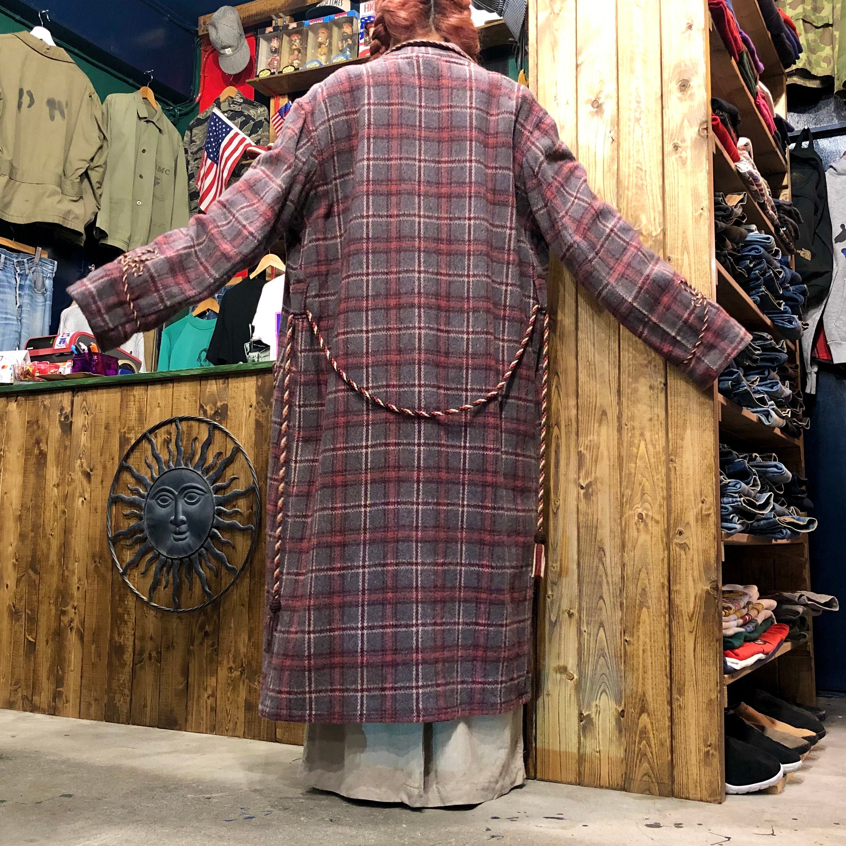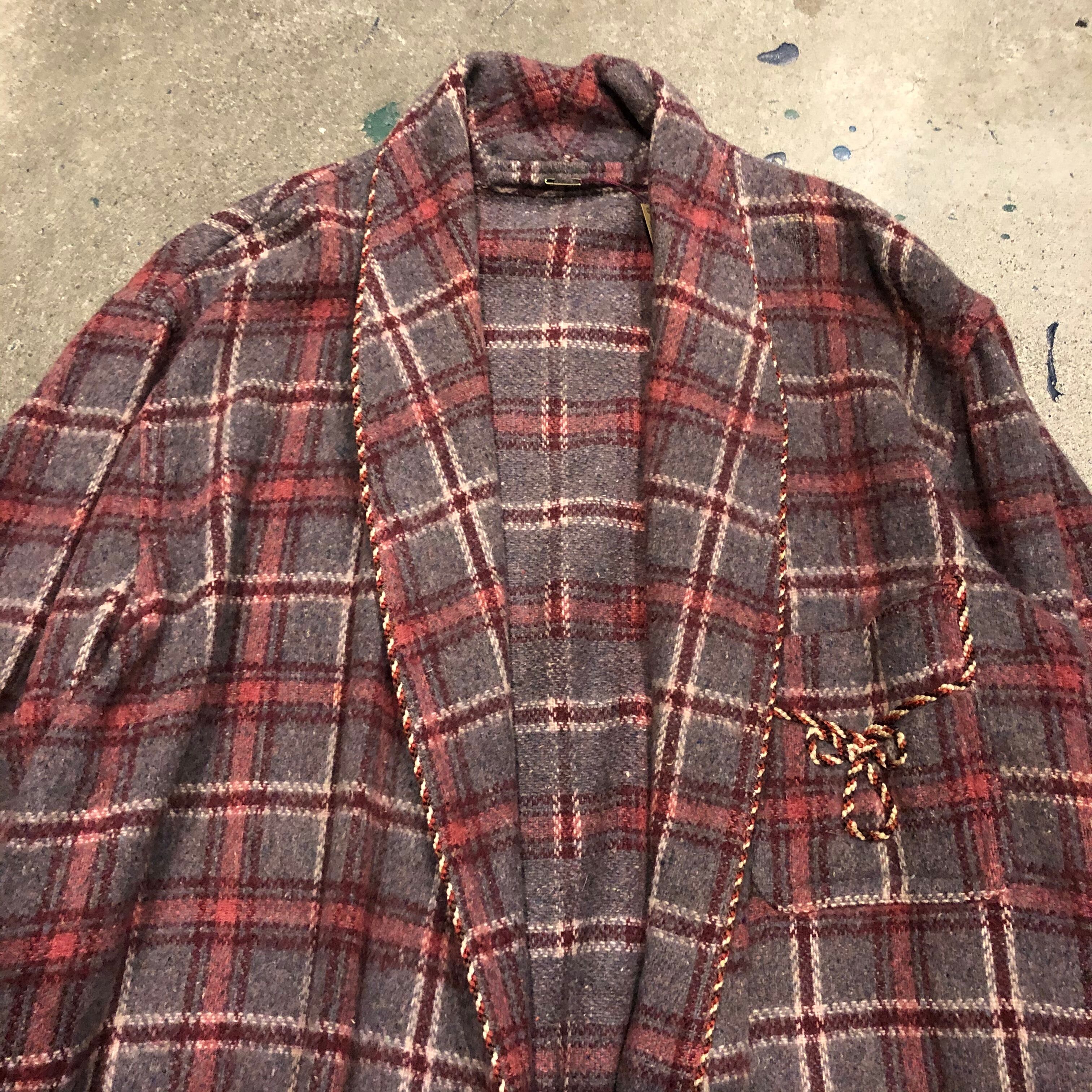 グレーとピンクのチェックがかわいい60〜70年代ごろのガウンです。細いロープでパイピングがされていたり袖口やポケットに模様が刺繍されていたりタッセルベルトが付いていたり、おしゃれな一着です。オーバーオールやワンピースの上に着るのもかわいいとは思います。