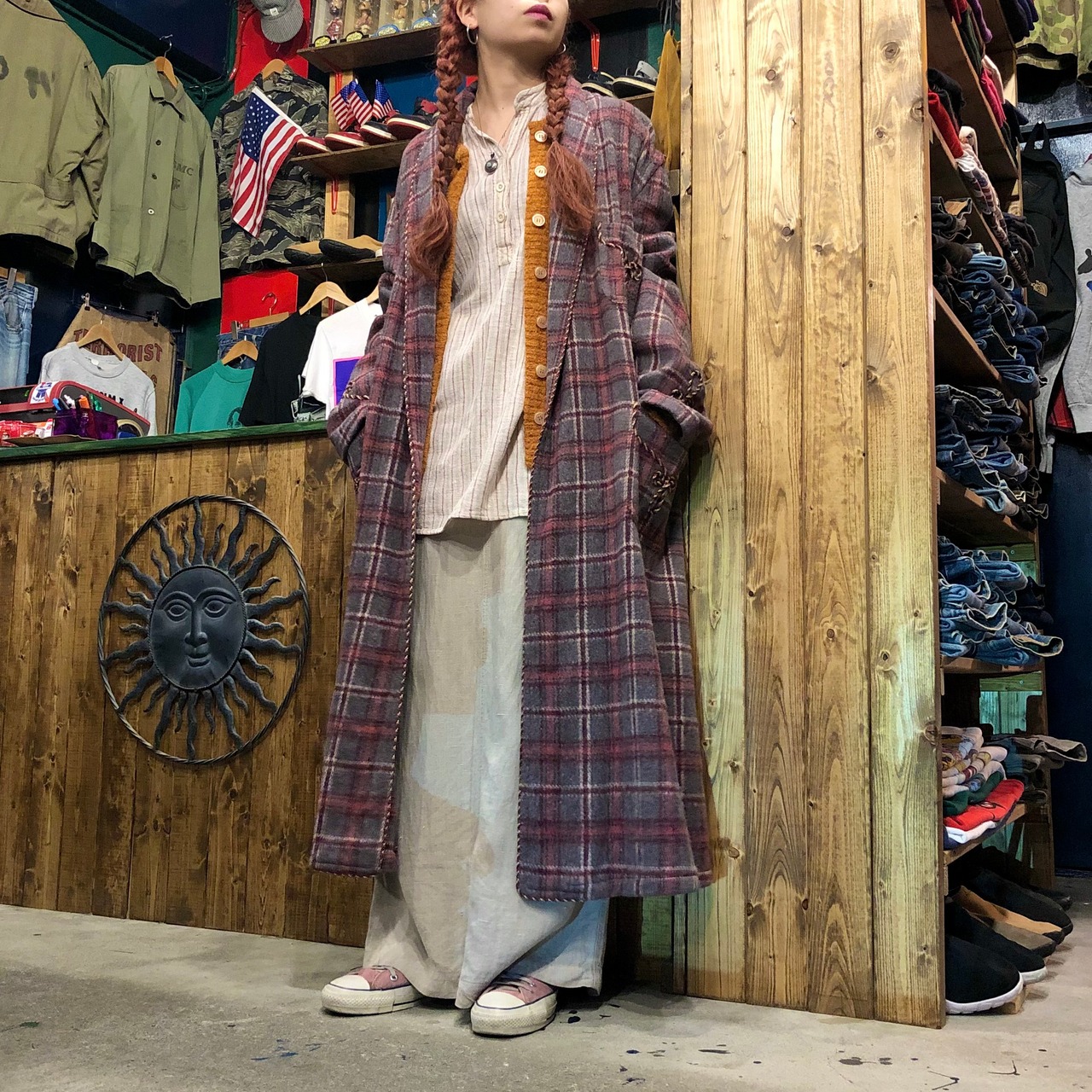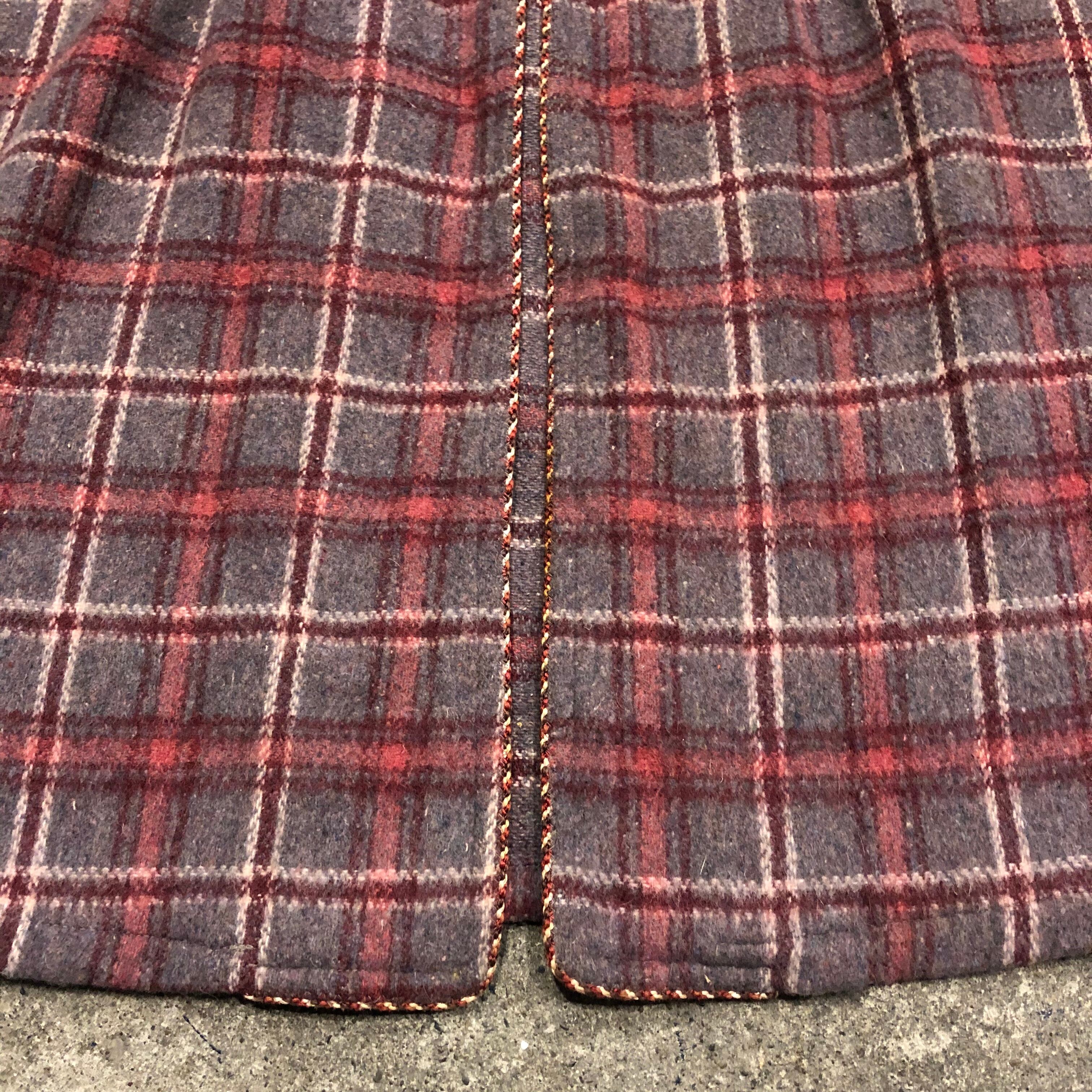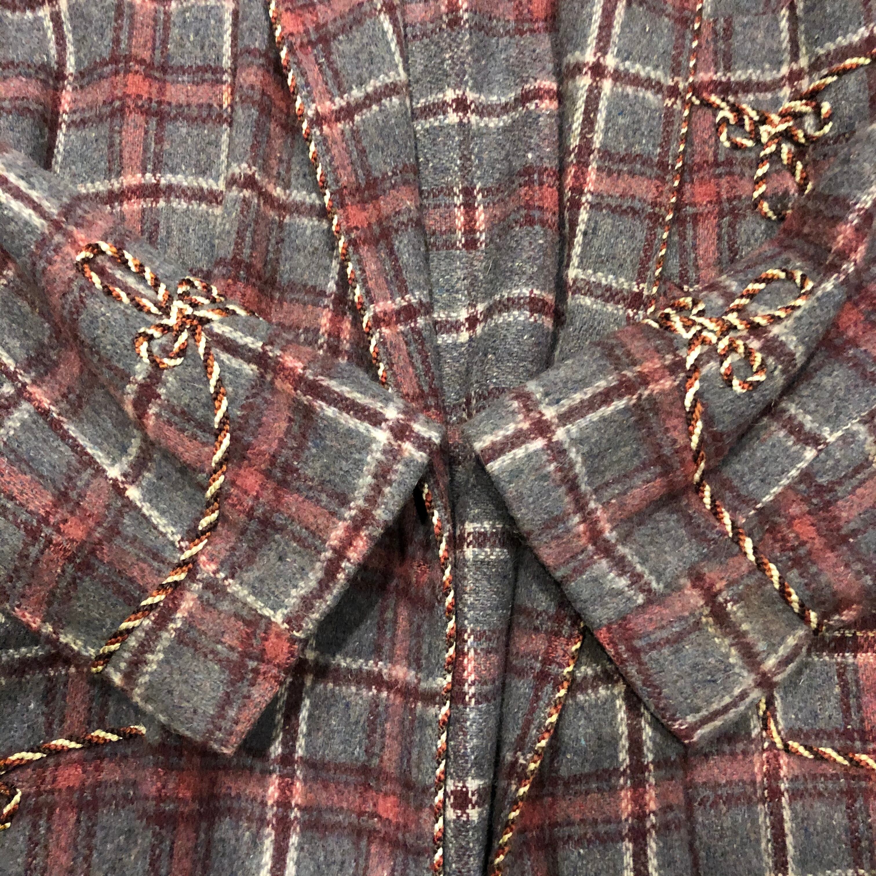 グレーとピンクのチェックがかわいい60〜70年代ごろのガウンです。細いロープでパイピングがされていたり袖口やポケットに模様が刺繍されていたりタッセルベルトが付いていたり、おしゃれな一着です。オーバーオールやワンピースの上に着るのもかわいいとは思います。