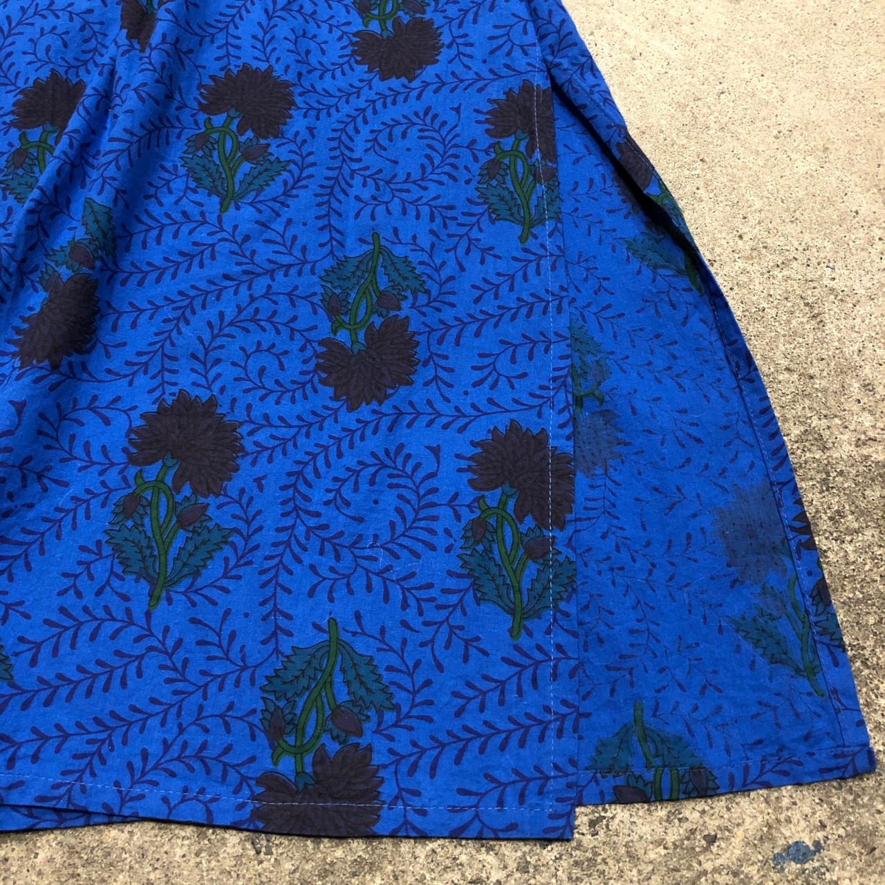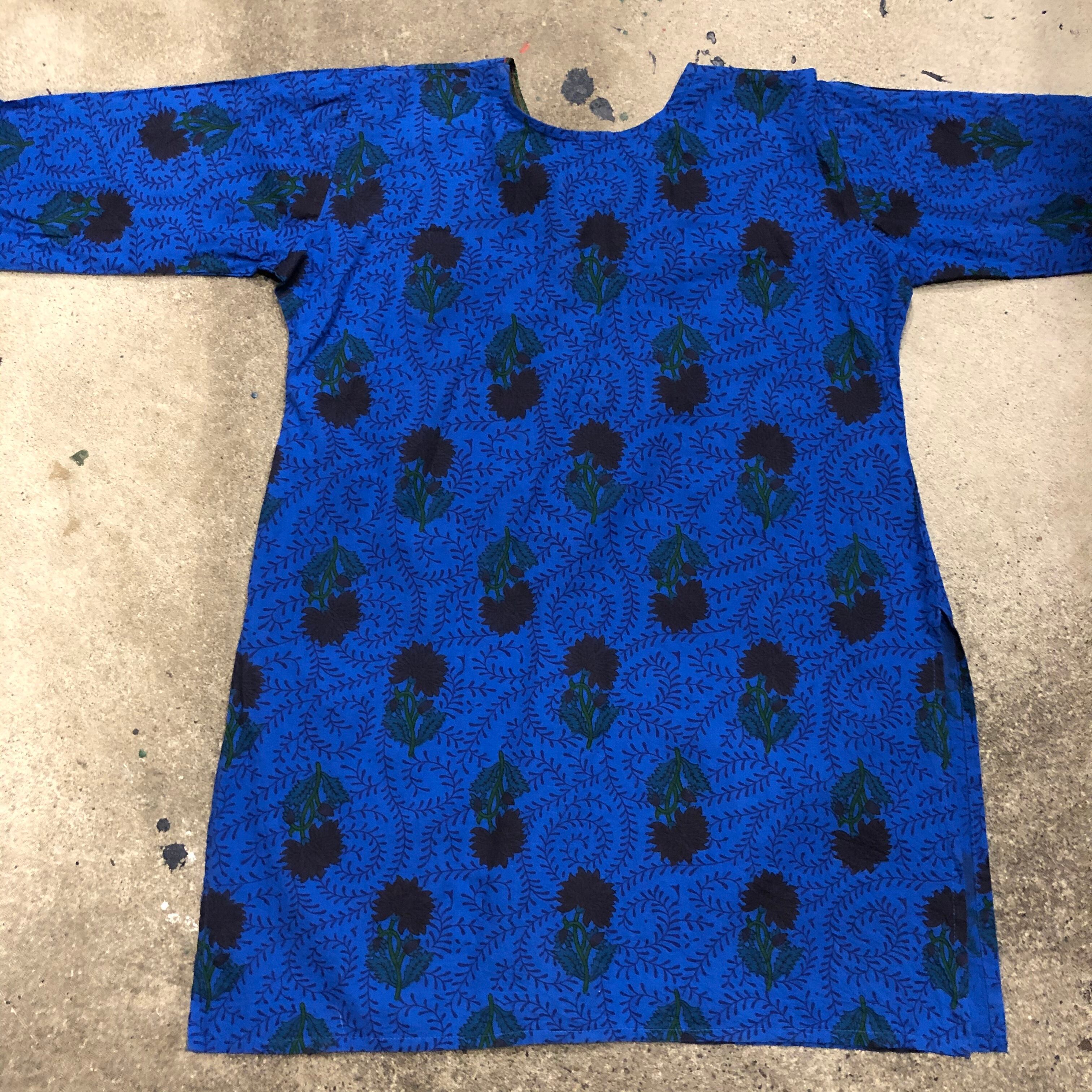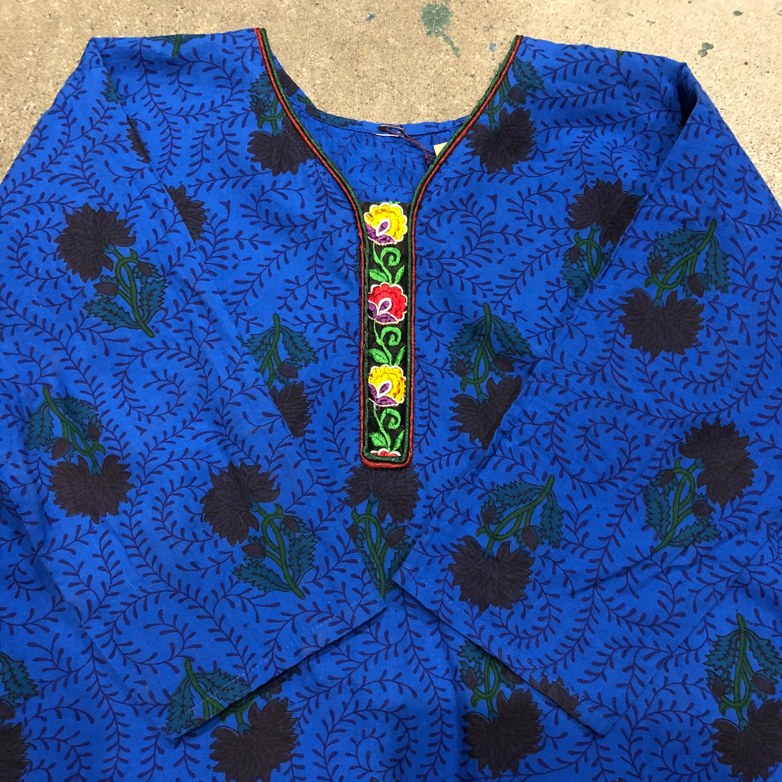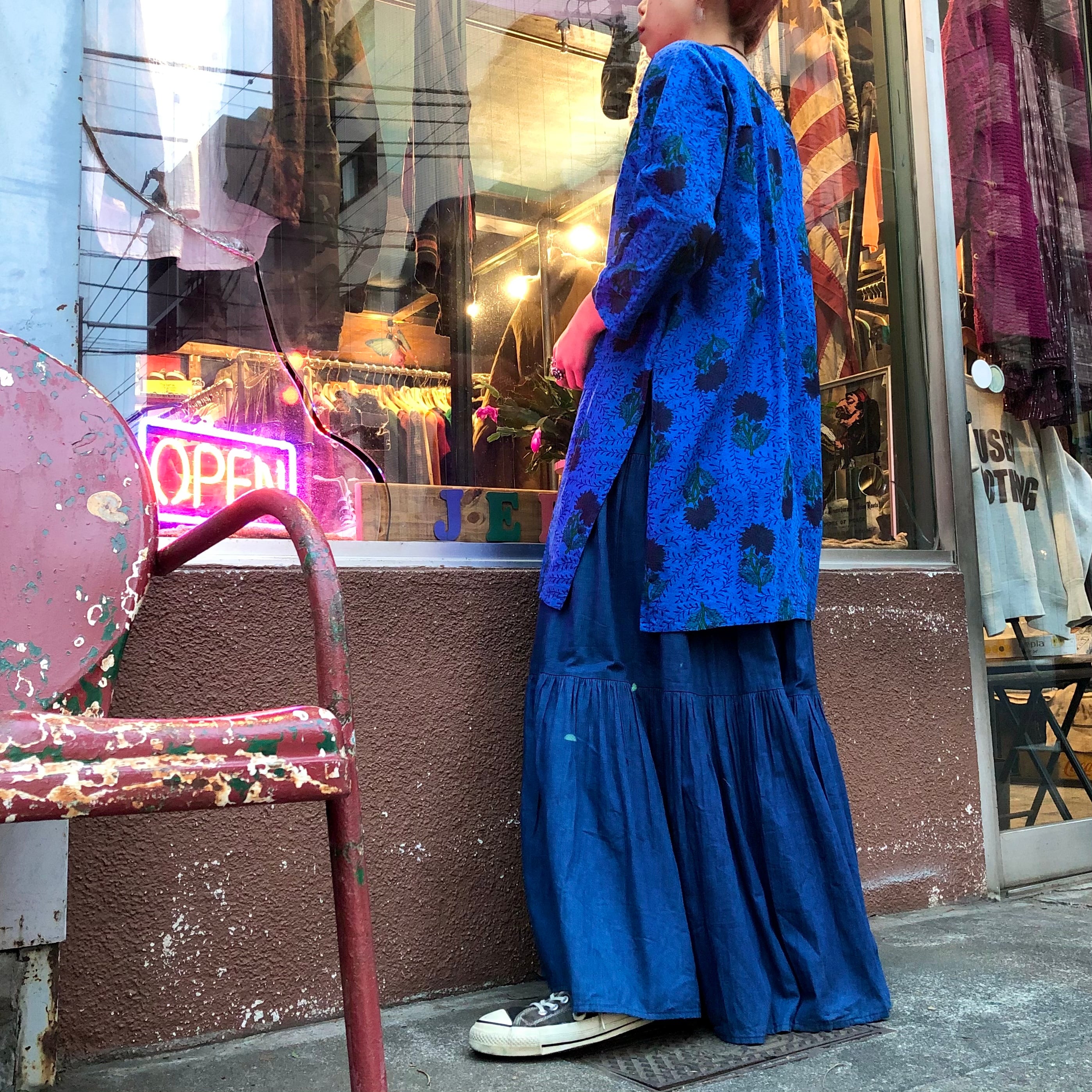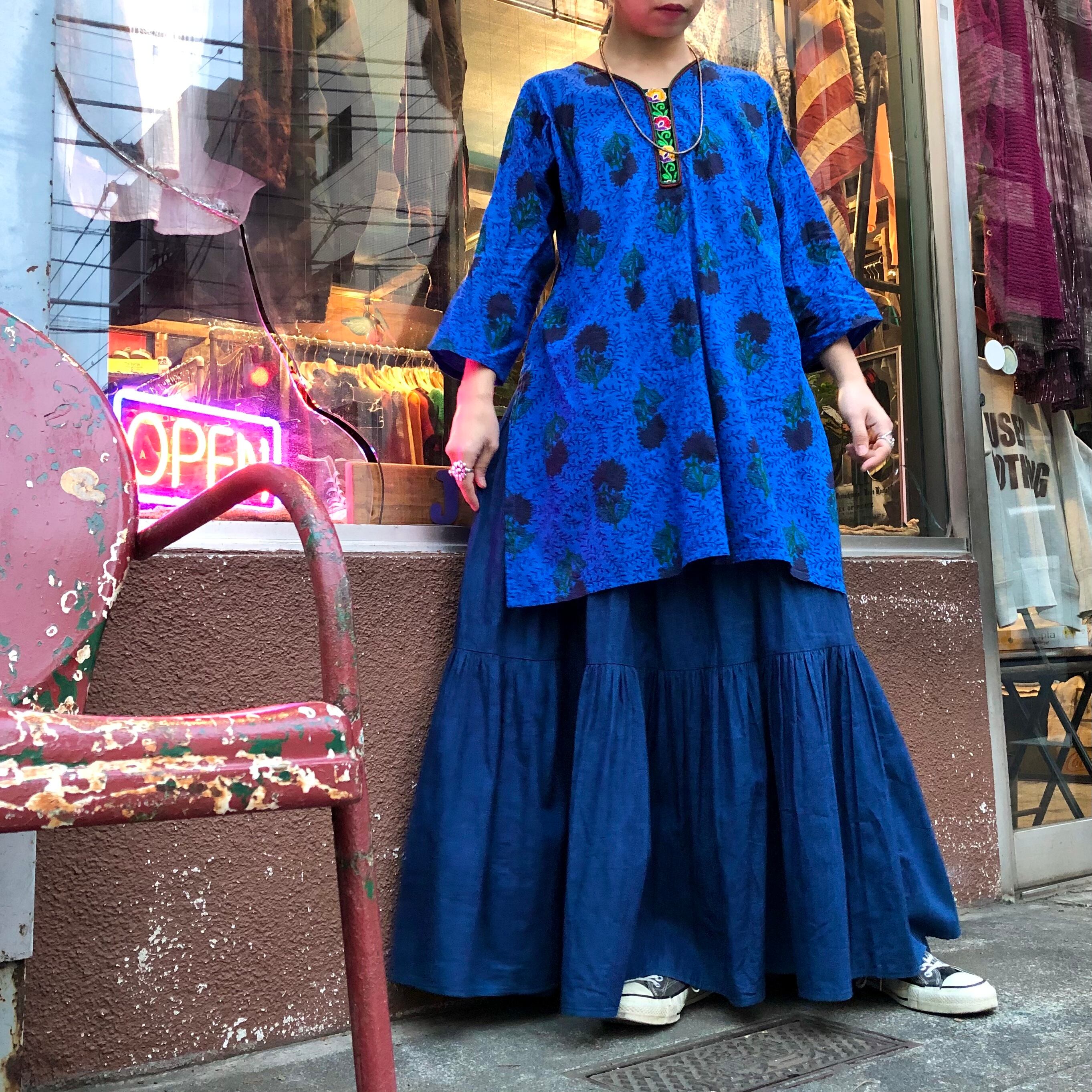 青地にアザミのような花柄が異国な雰囲気漂っていて素敵なチュニックです。