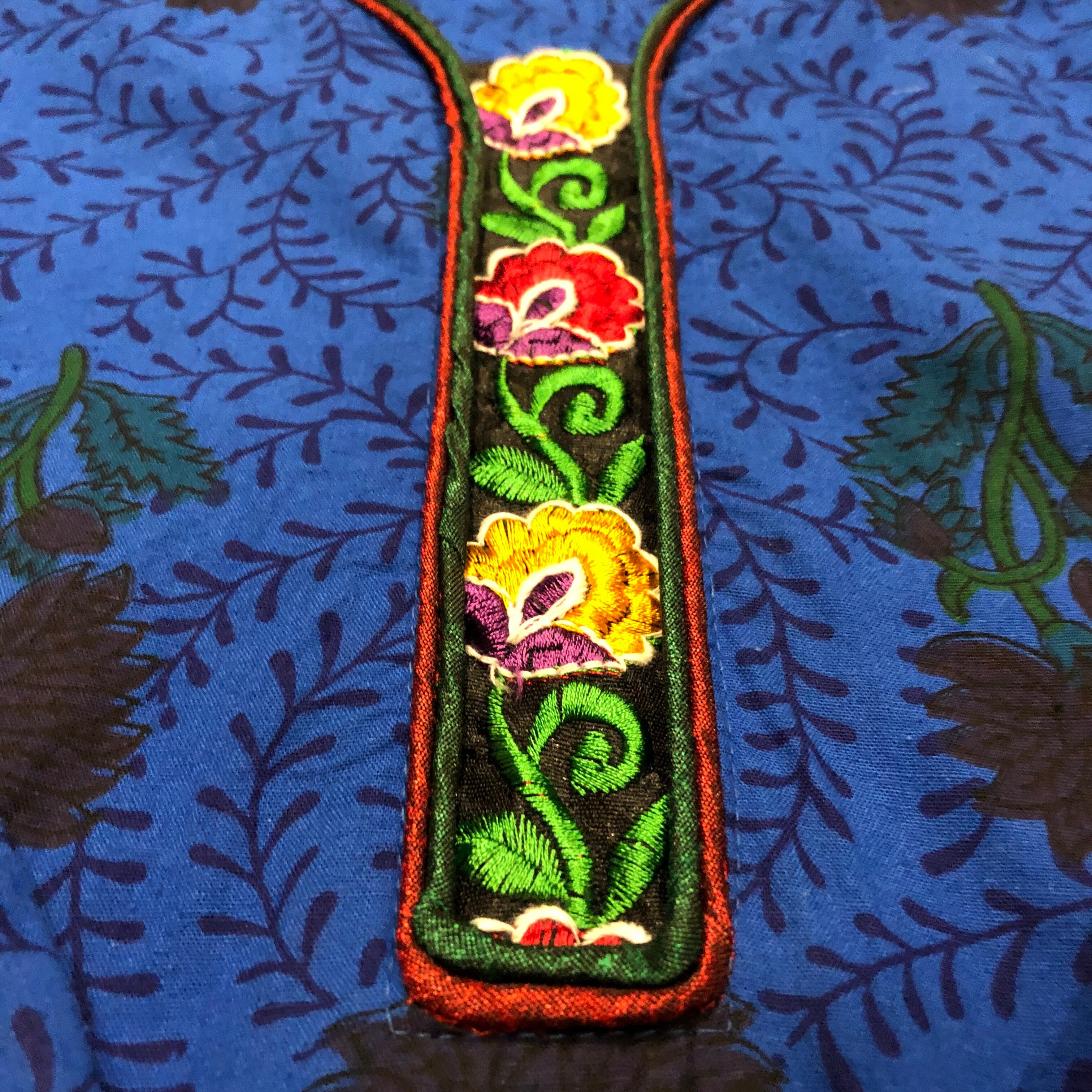 襟ぐりのパイピングや胸元の刺繍、八分丈くらいの袖、深めのスリットなどディテールも絶妙でかわいいです。