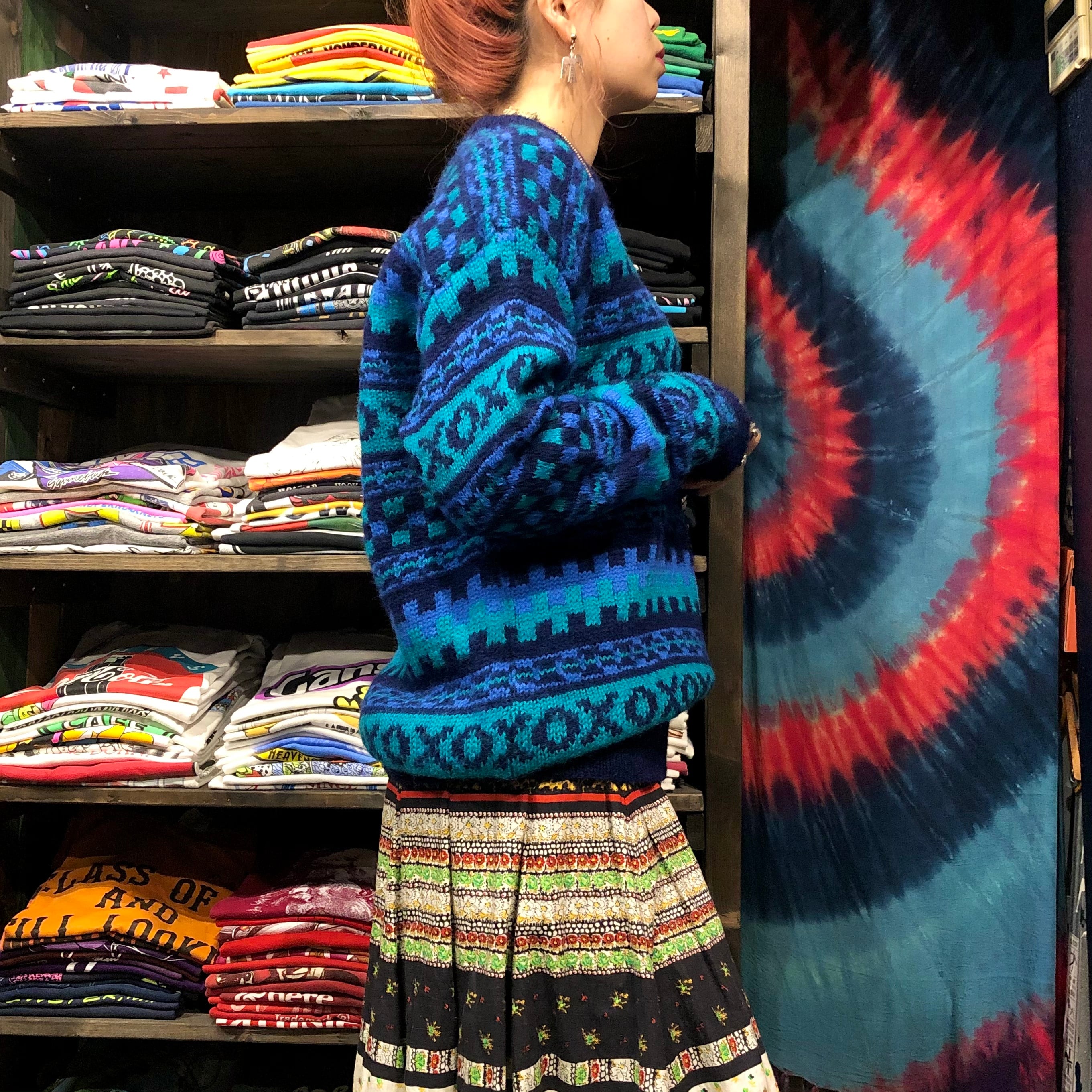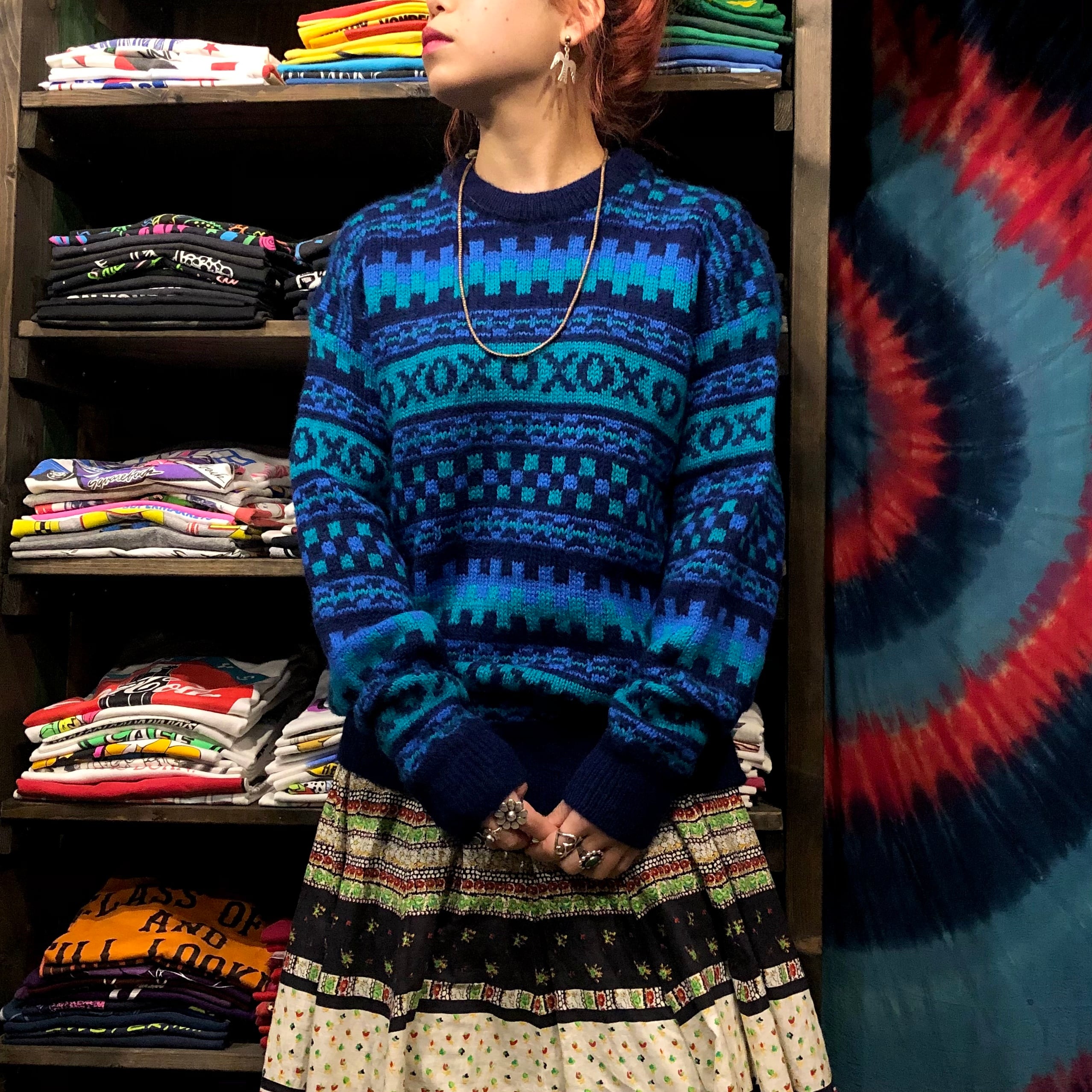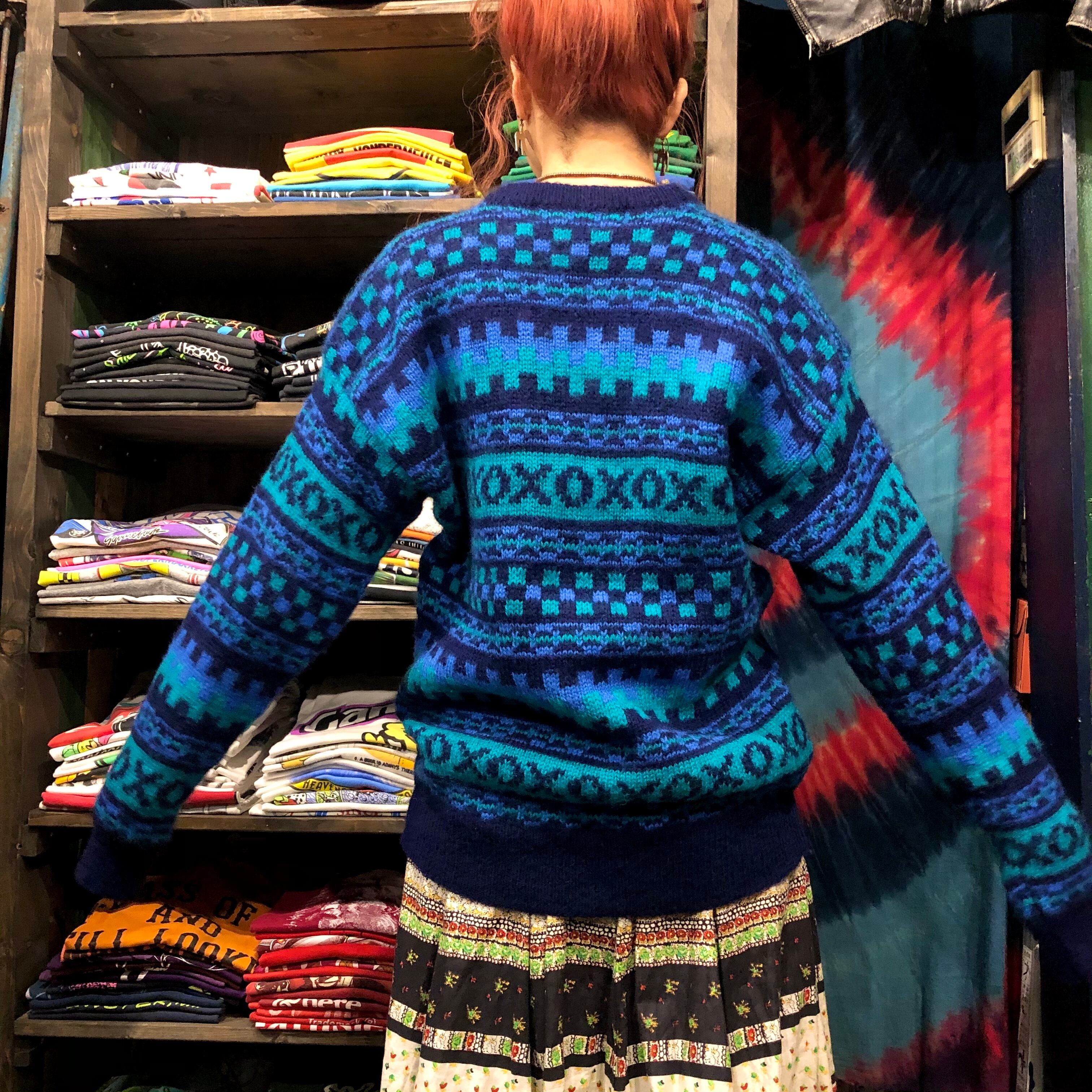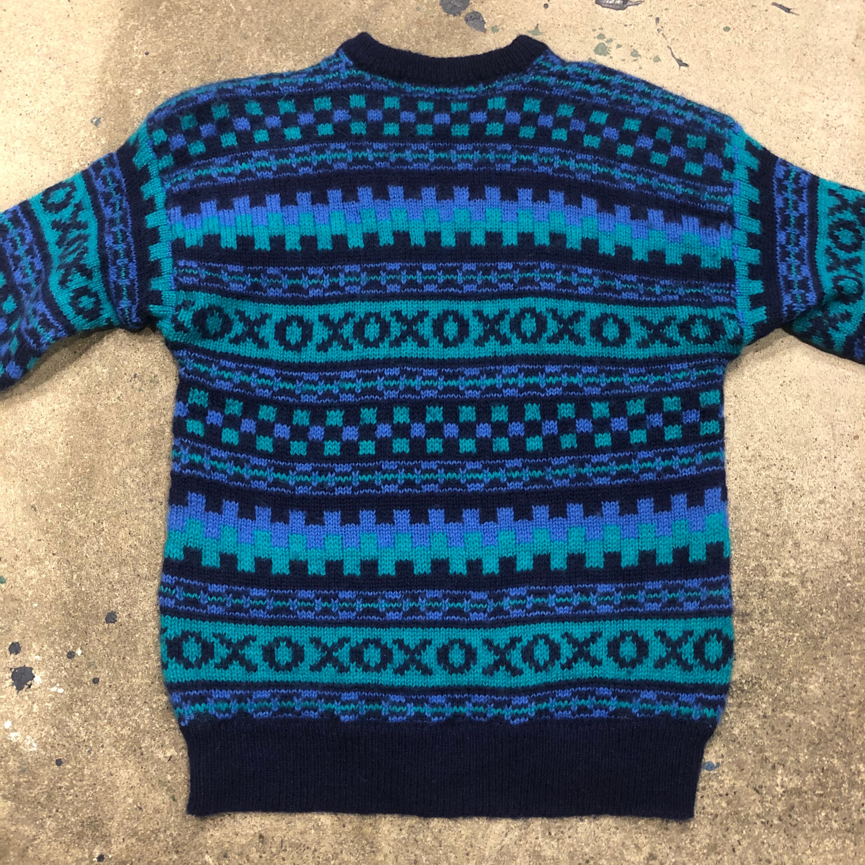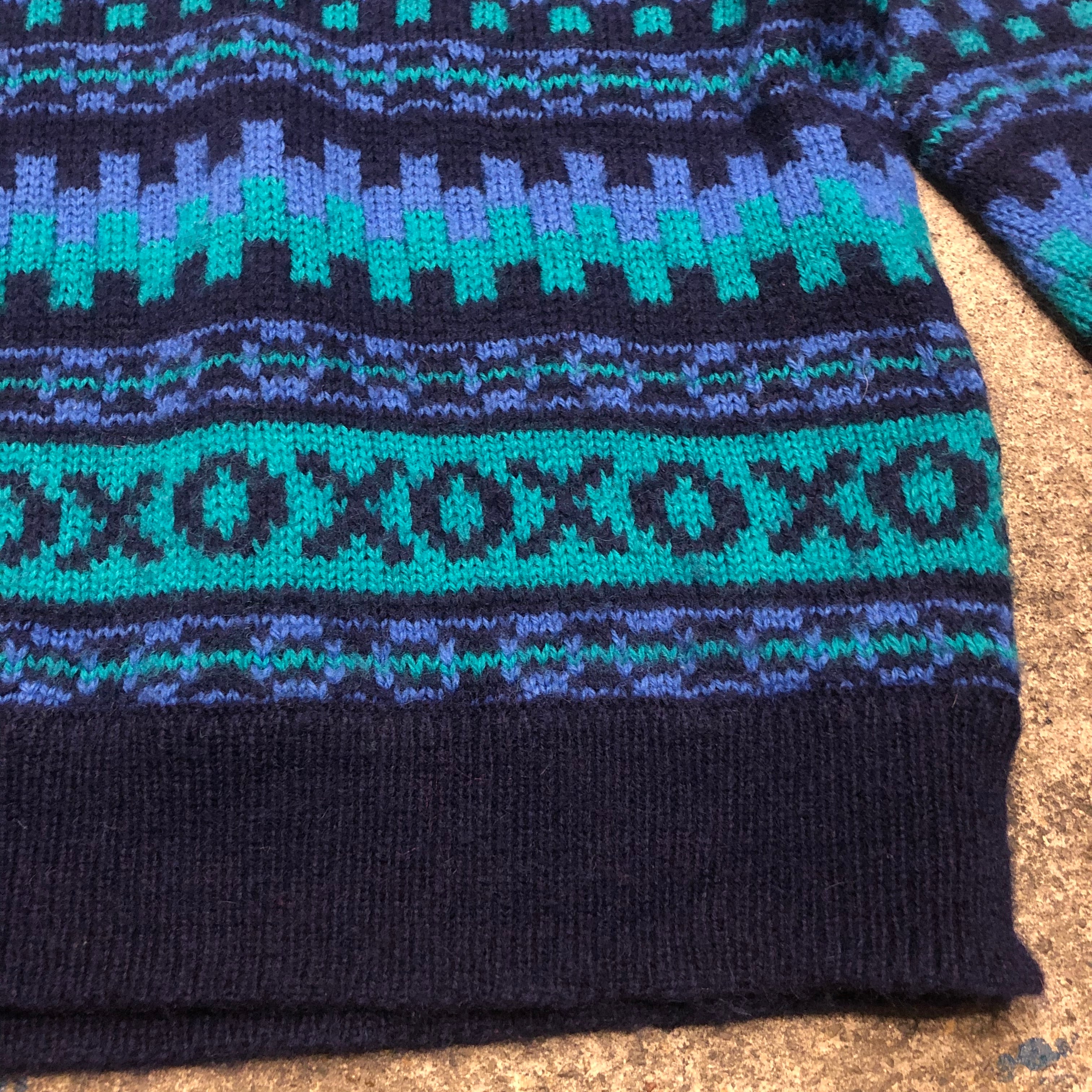 青系の幾何学模様がかわいい手編みのセーターです。アイルランド製で細かい柄、ふんわり柔らかめのウールでしっかり手の込んだ一着だと思います。