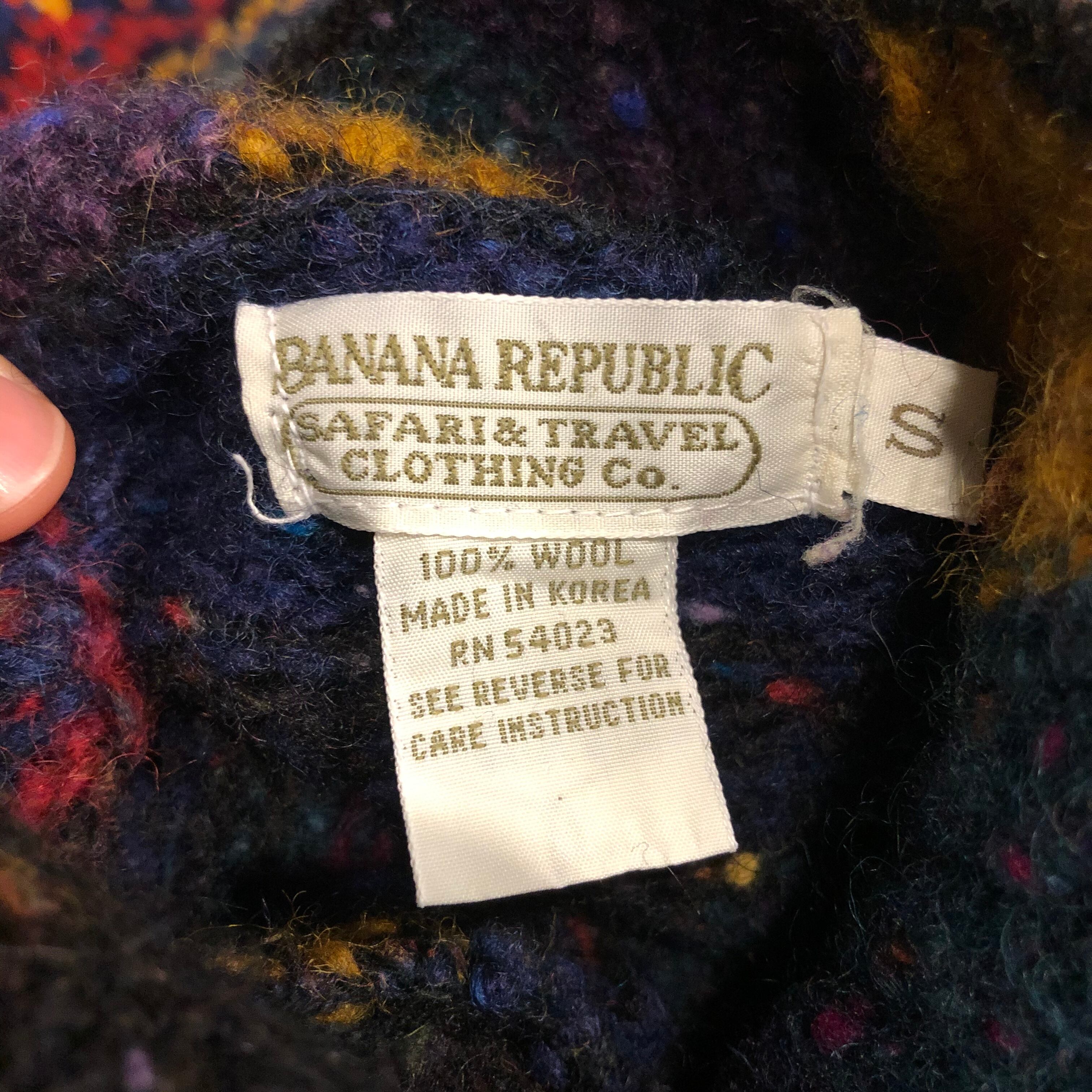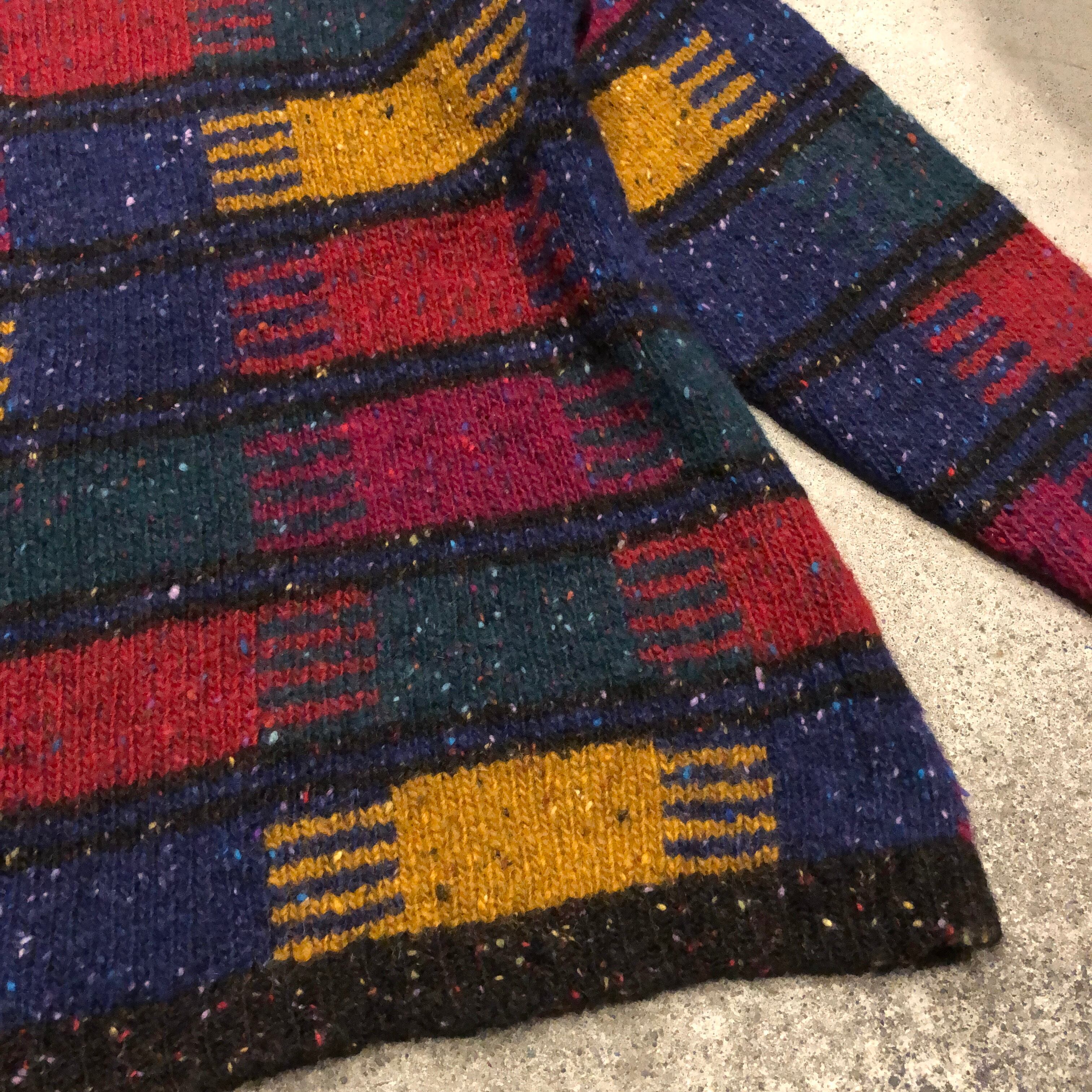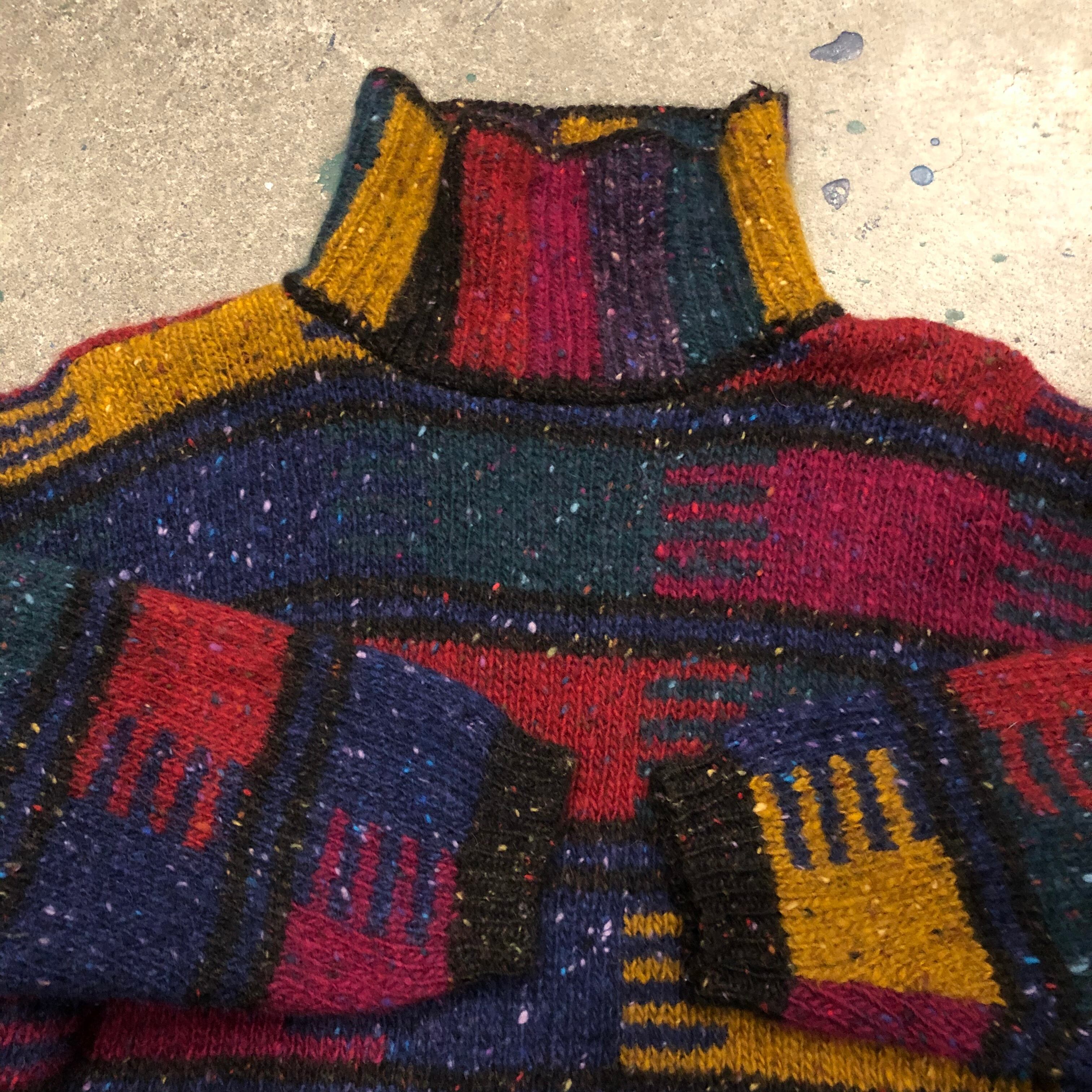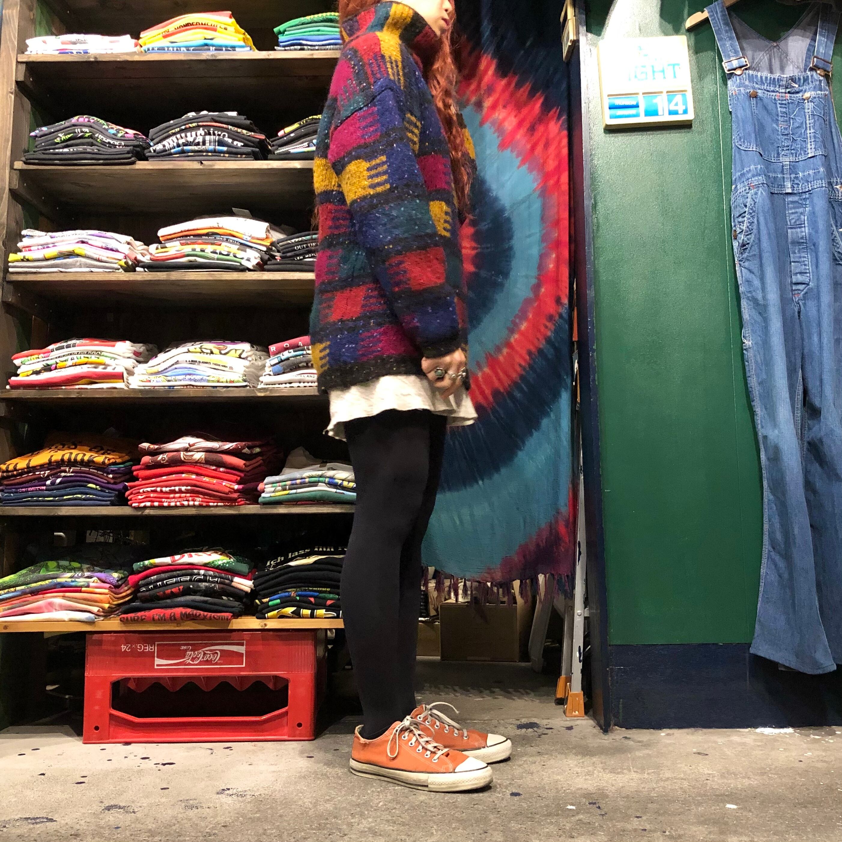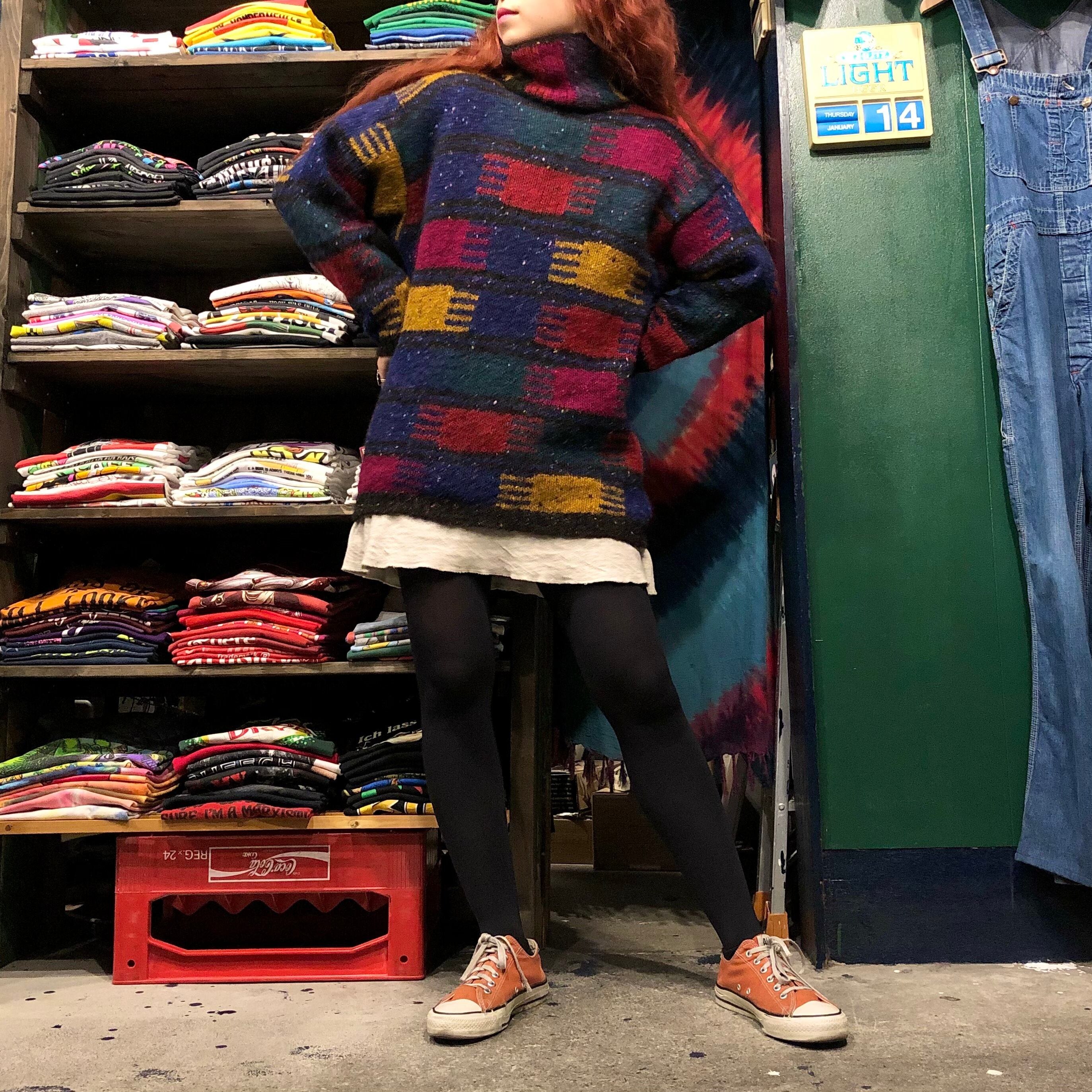 ハイネックで丈の長めな暖かくてザ古着な雰囲気が良い感じの一着です。カニのようにも見える柄が謎でかわいいです。