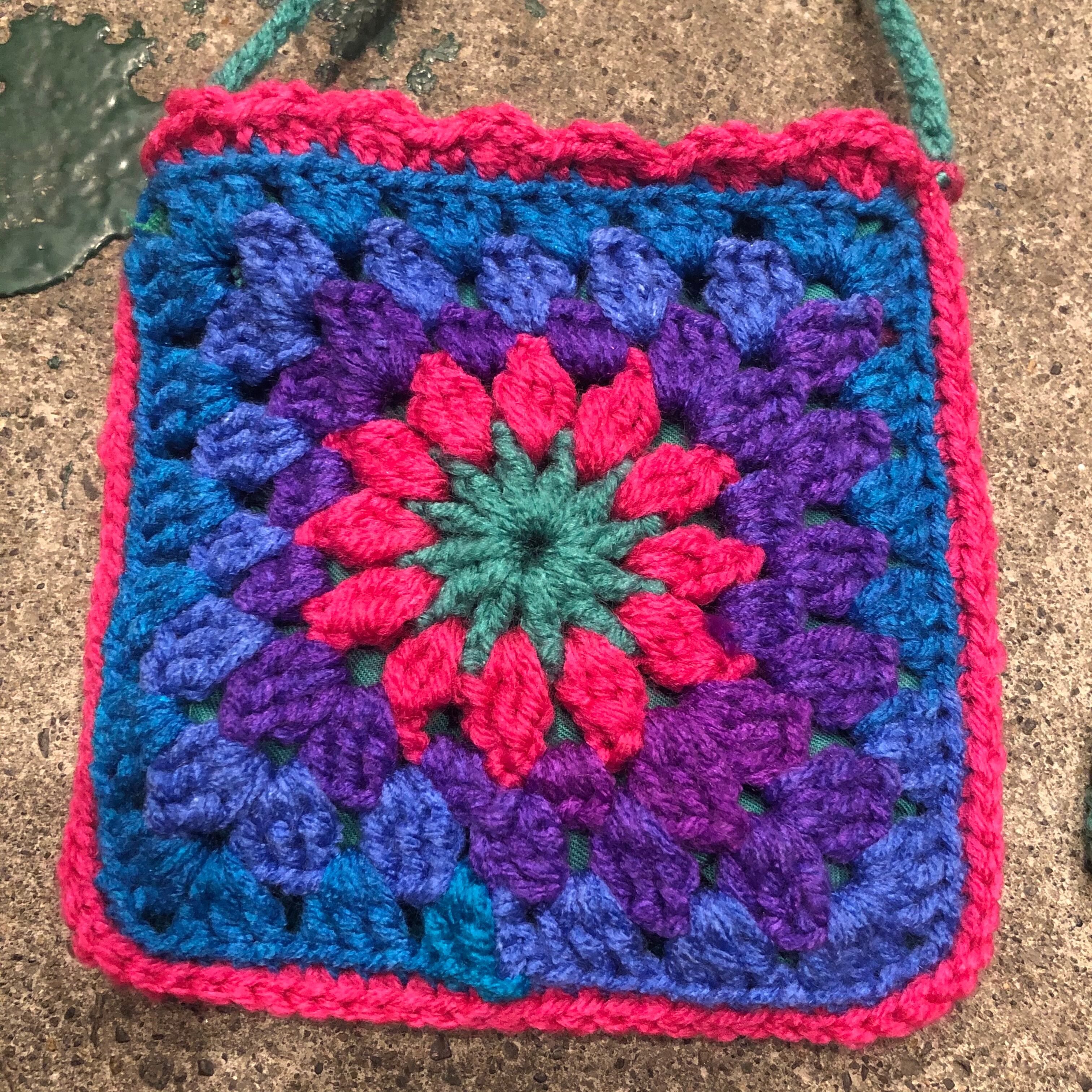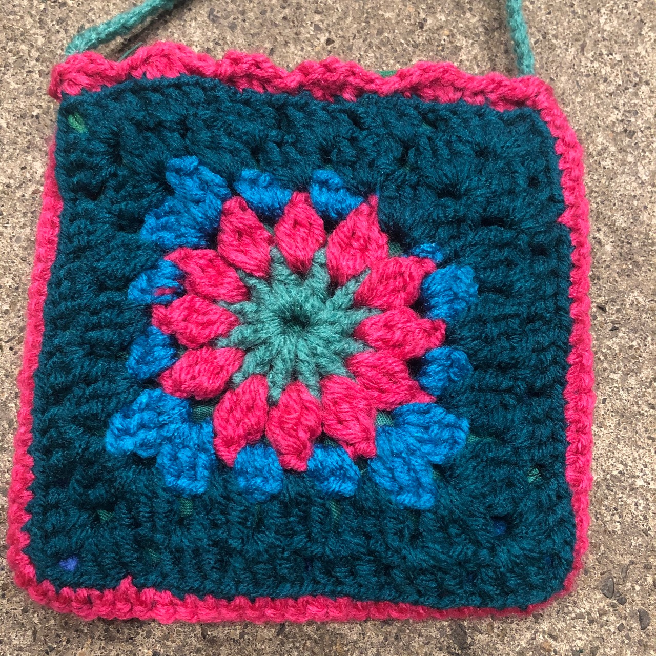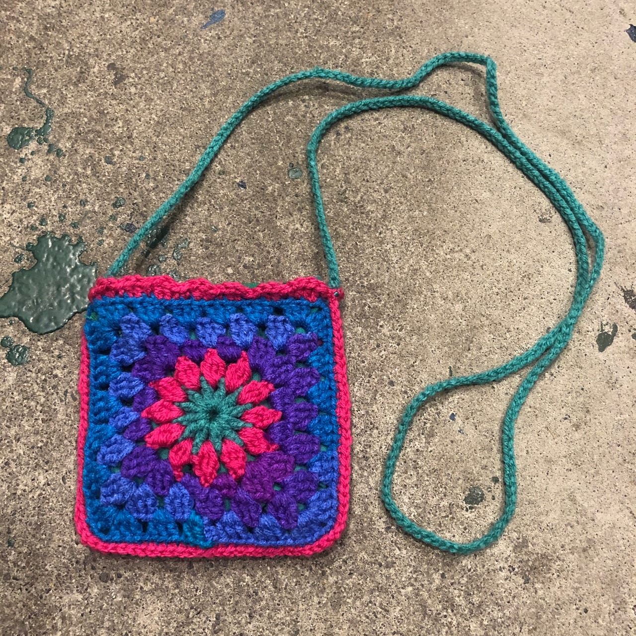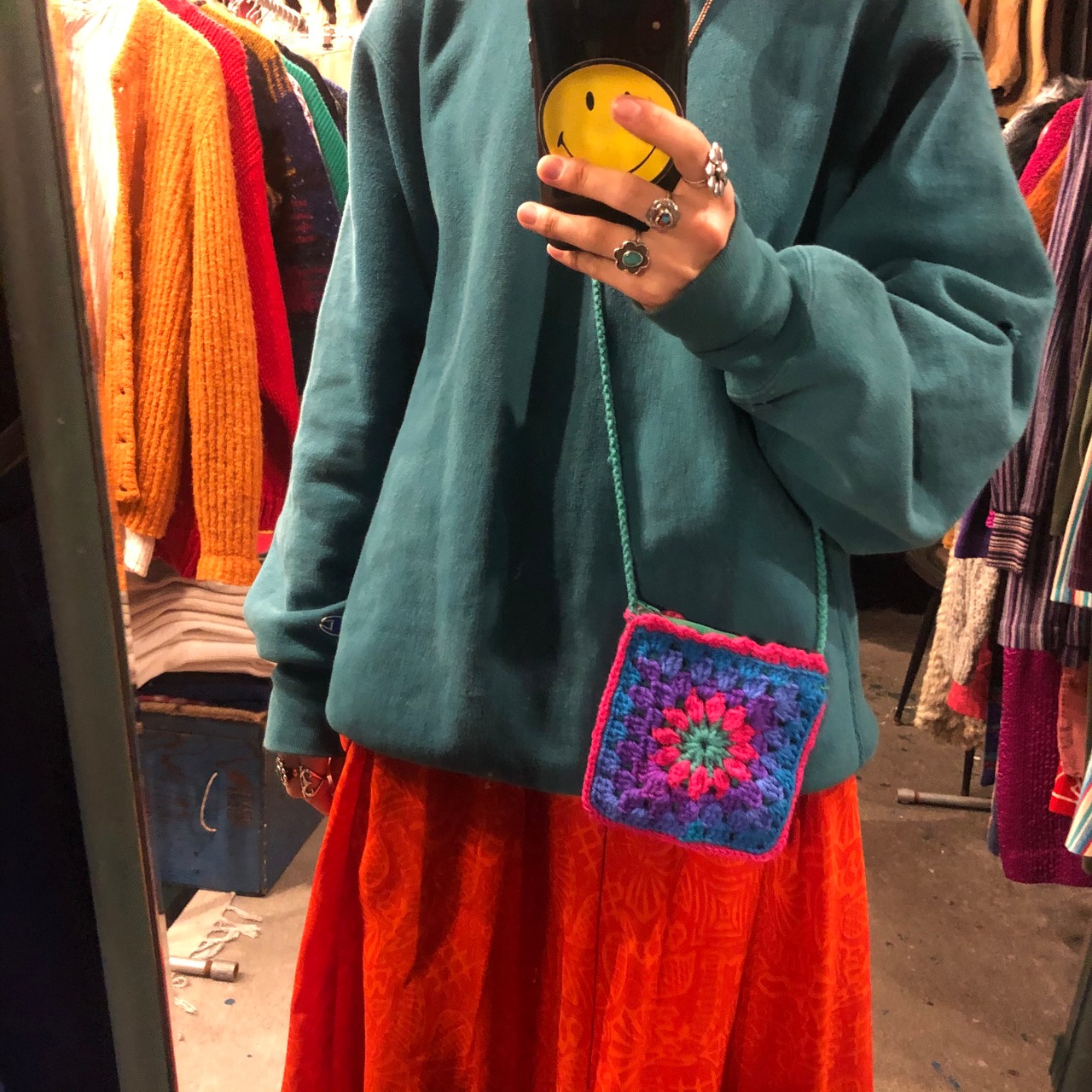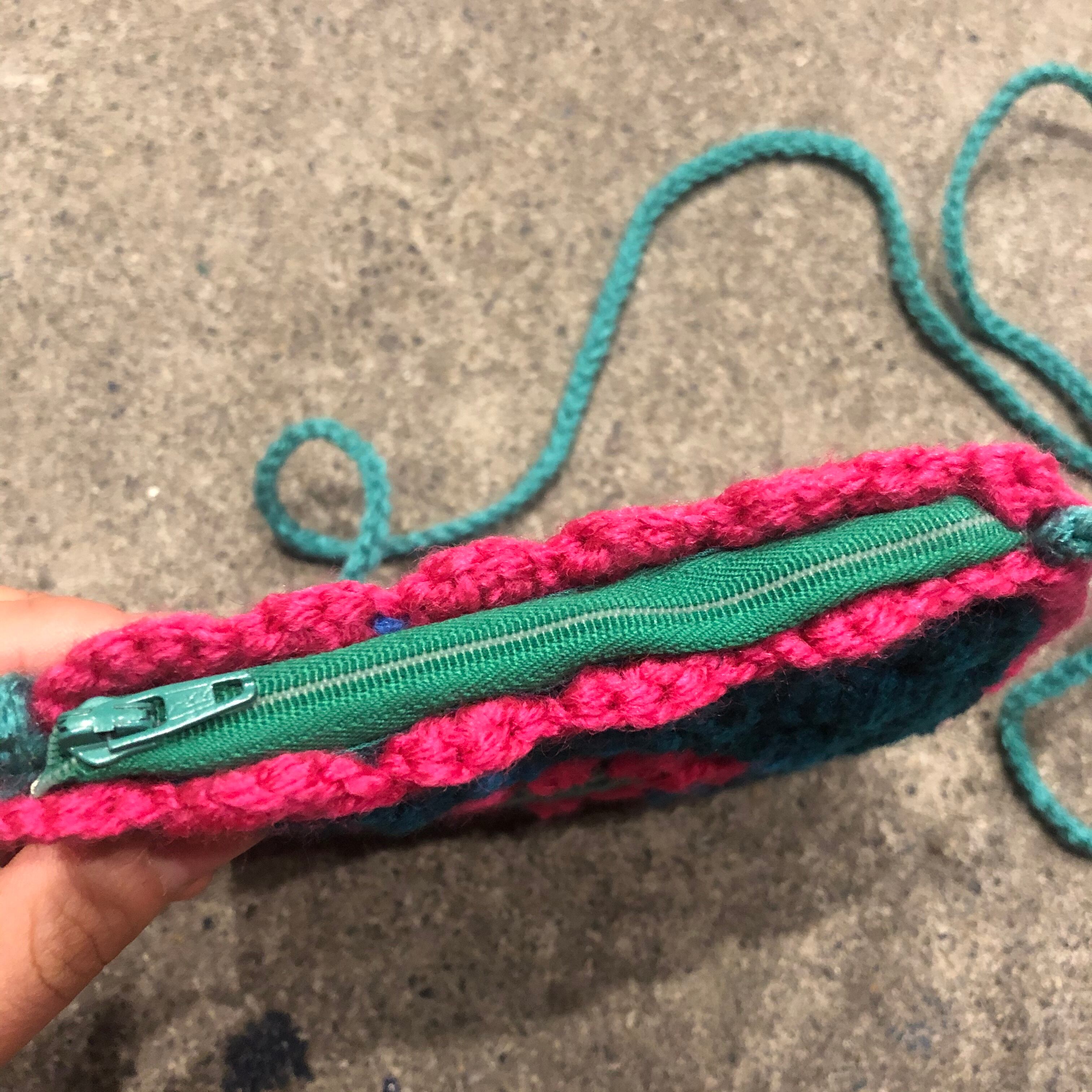 アメリカで購入した毛糸を使って制作しております。裏地とファスナーが付いておりますので、小銭を入れたりしてちょっとそこまで出掛けられます。