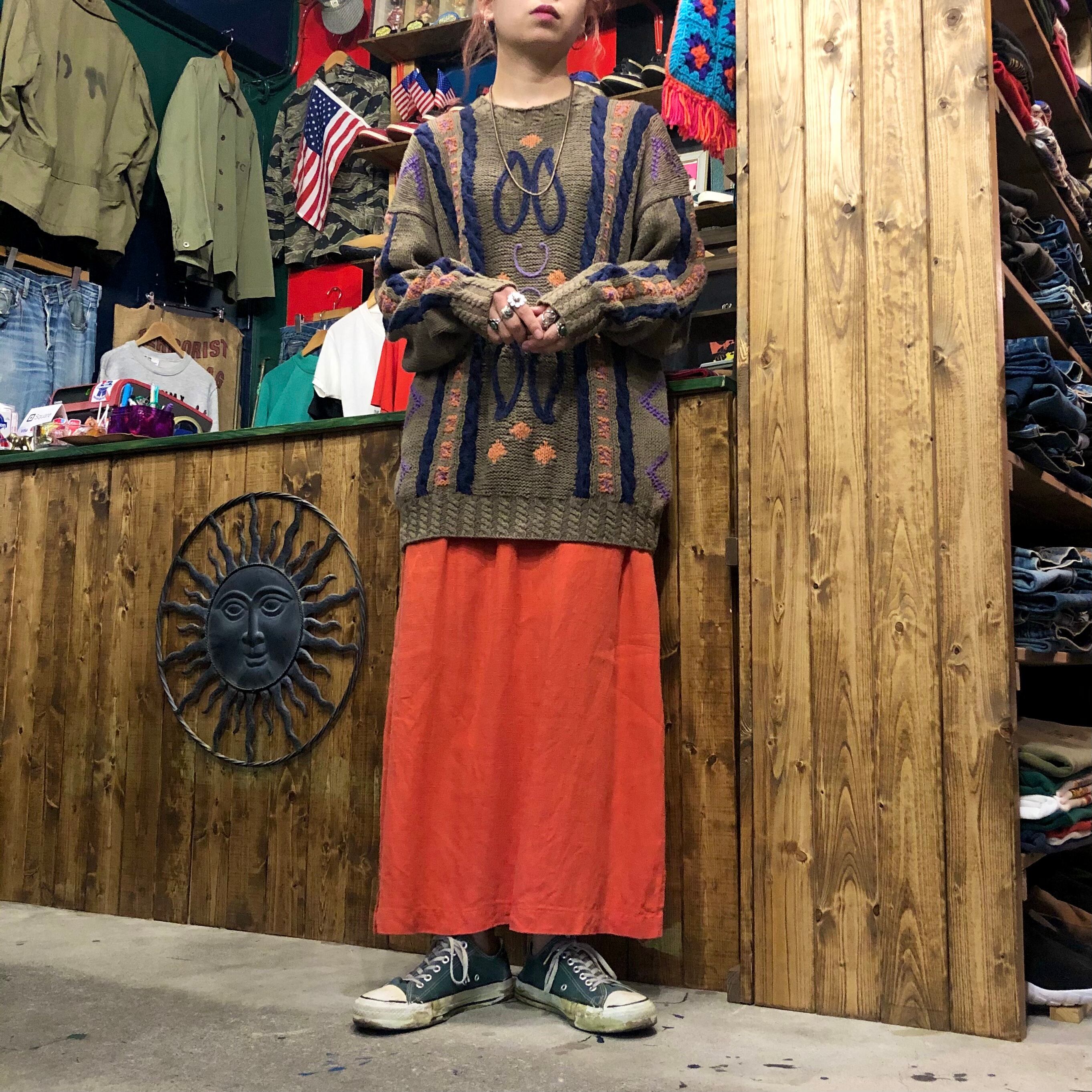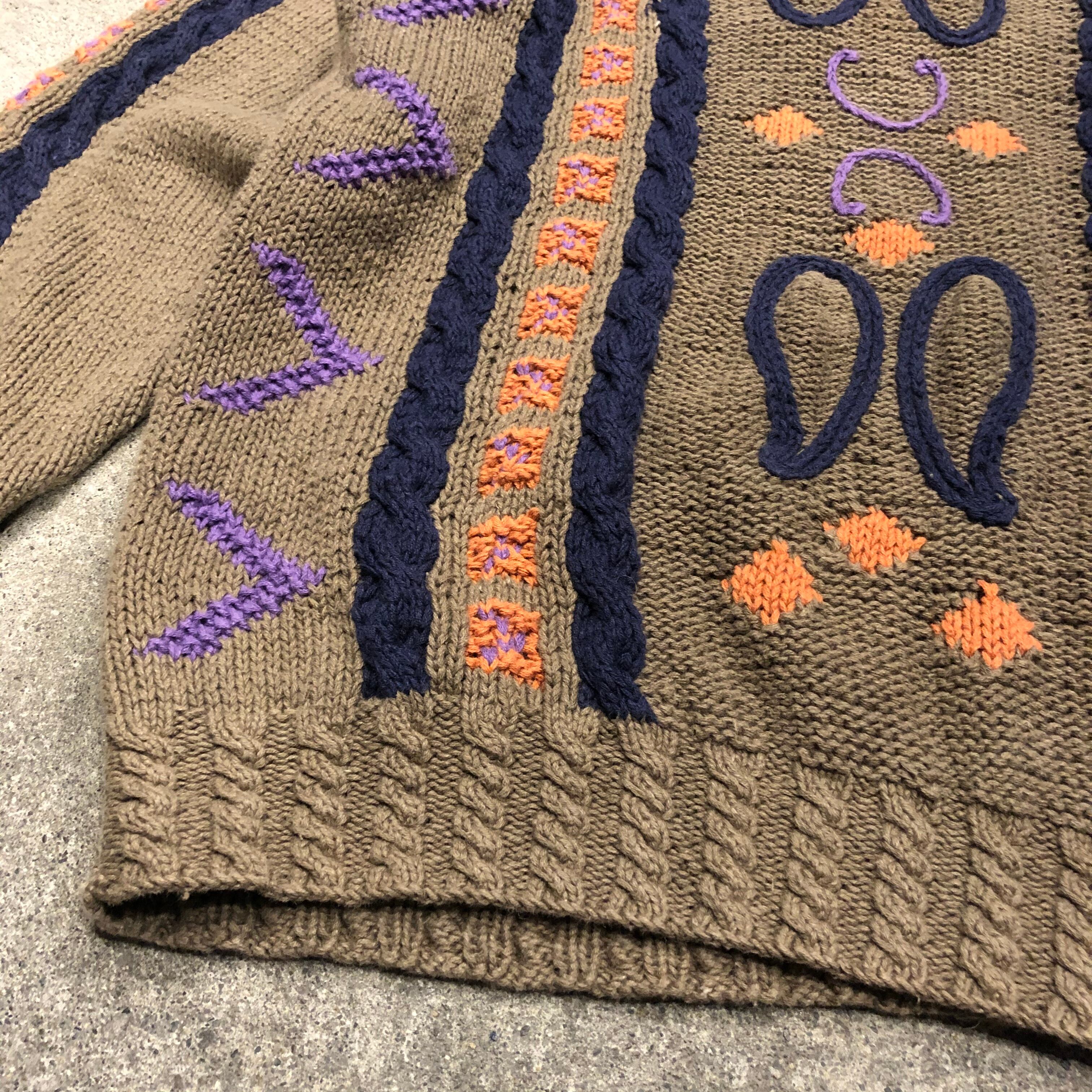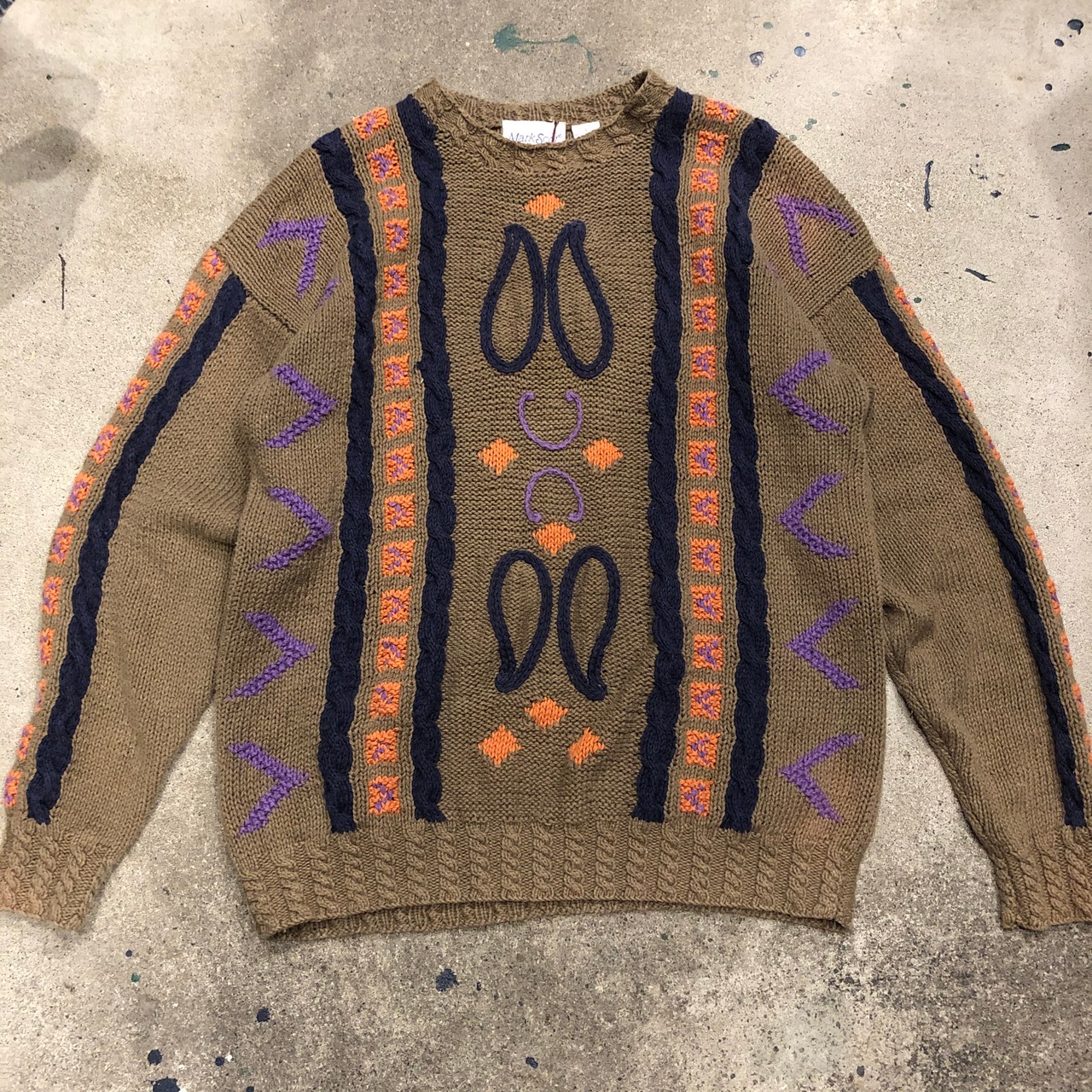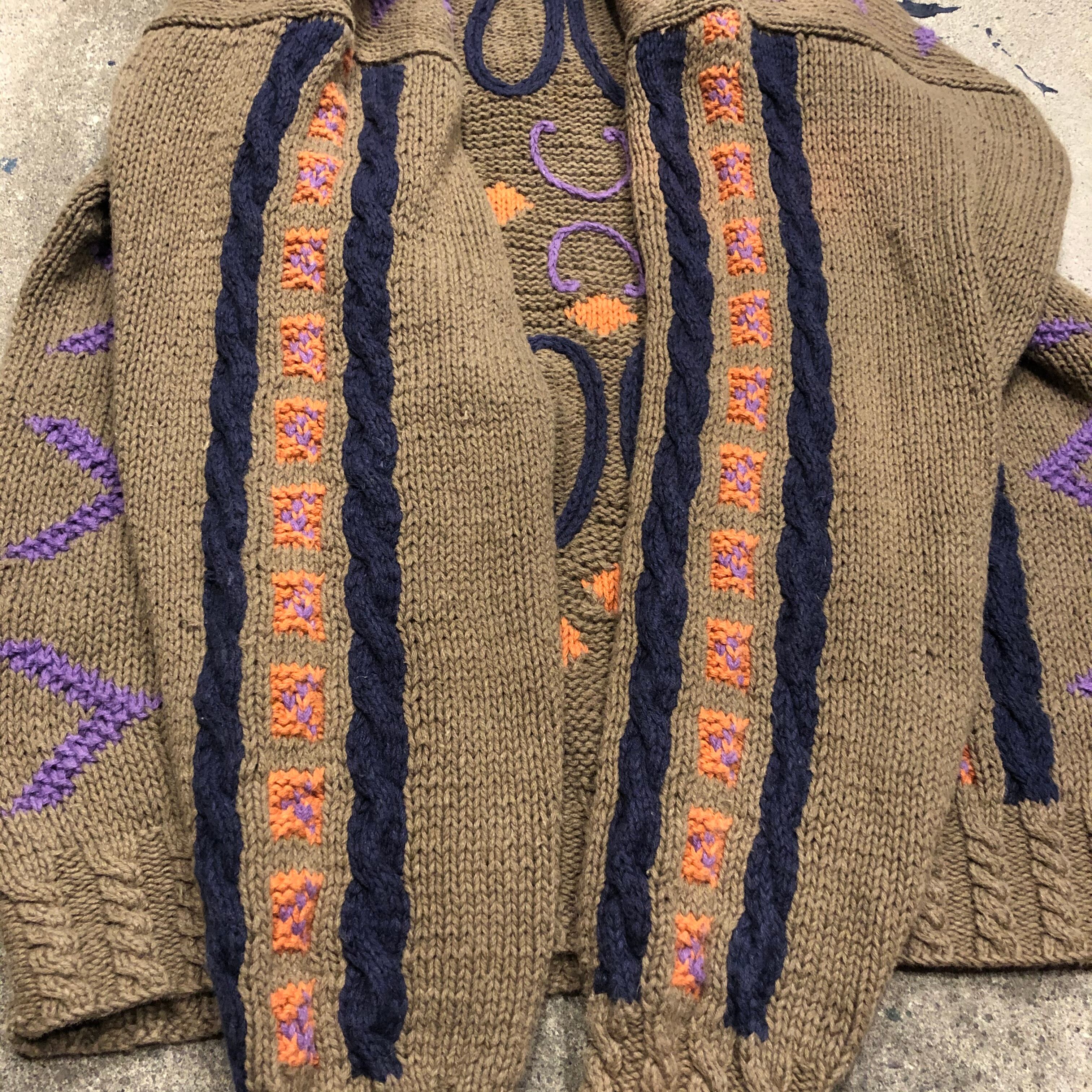 カーキとベージュがまざったような色に紫、オレンジ、ネイビーの不思議な模様にぐっときます。