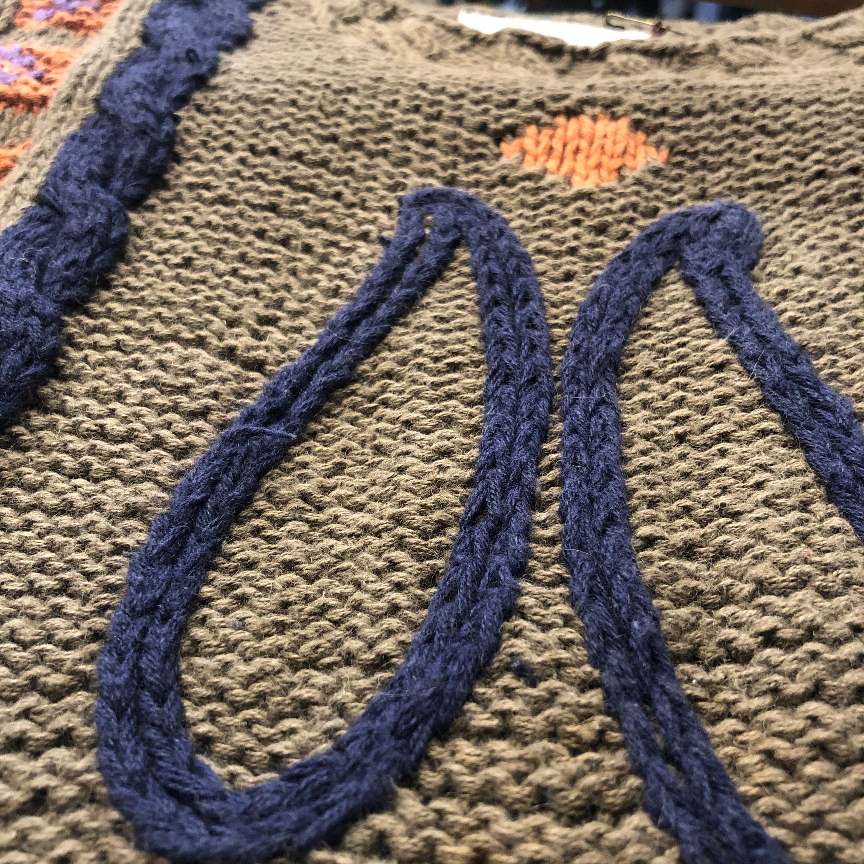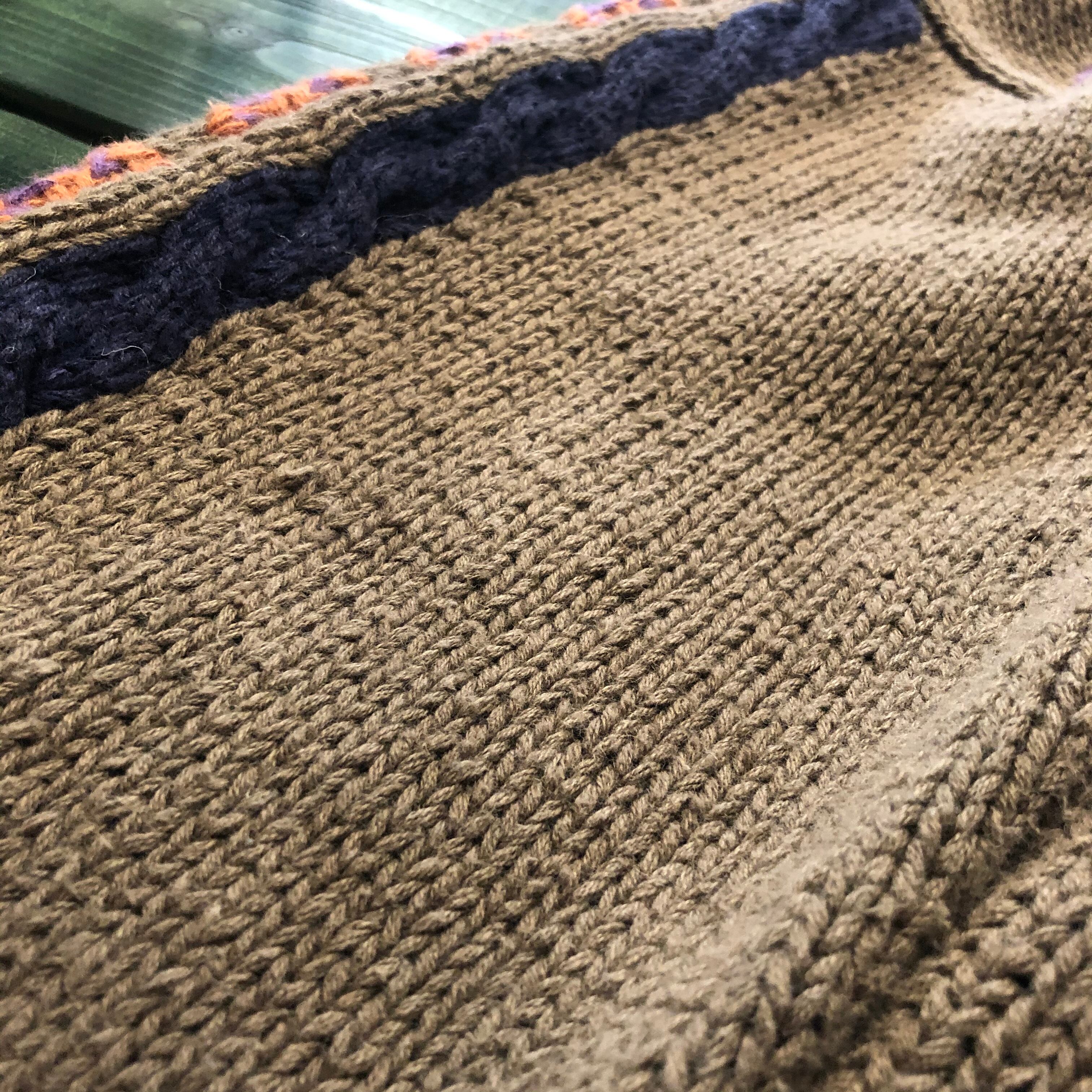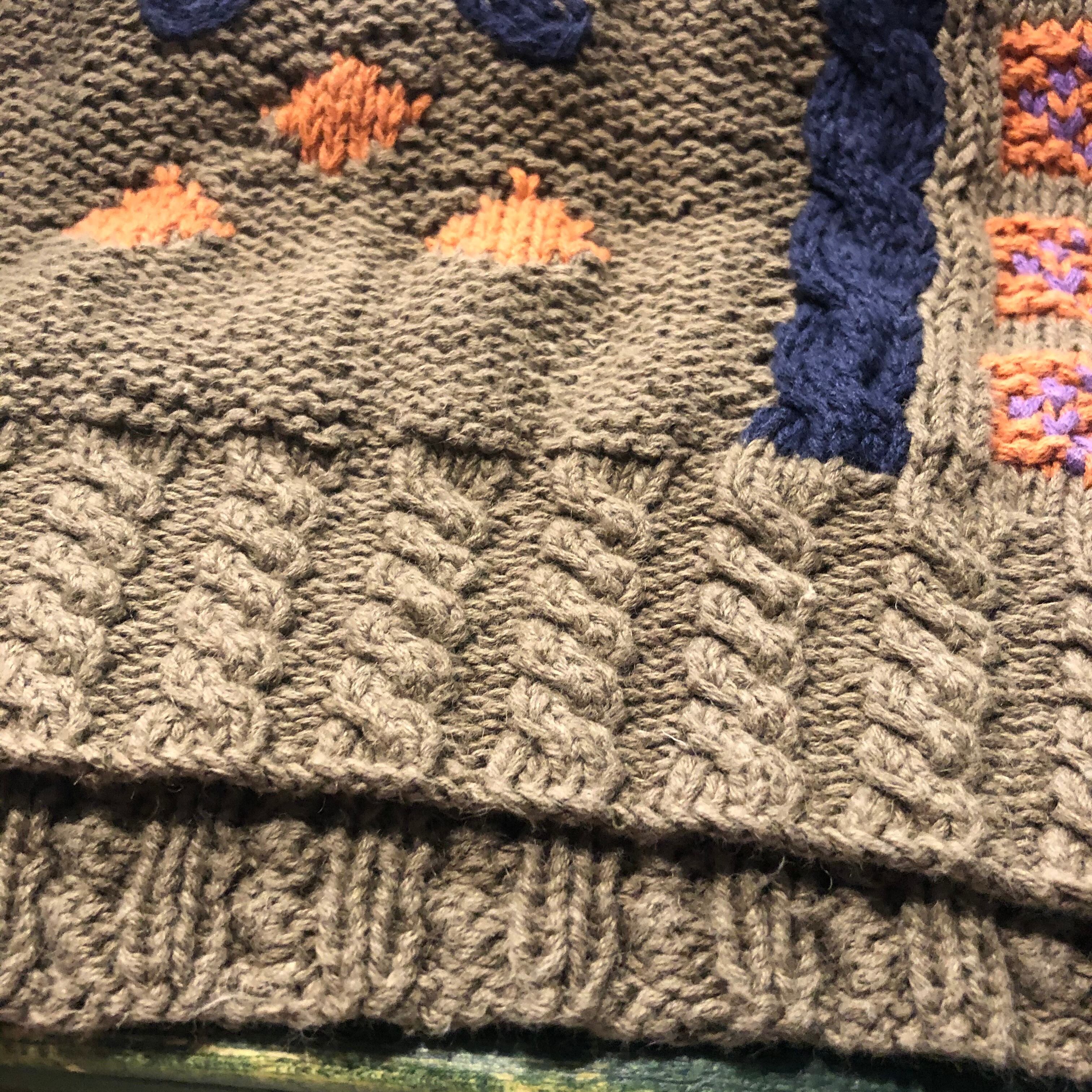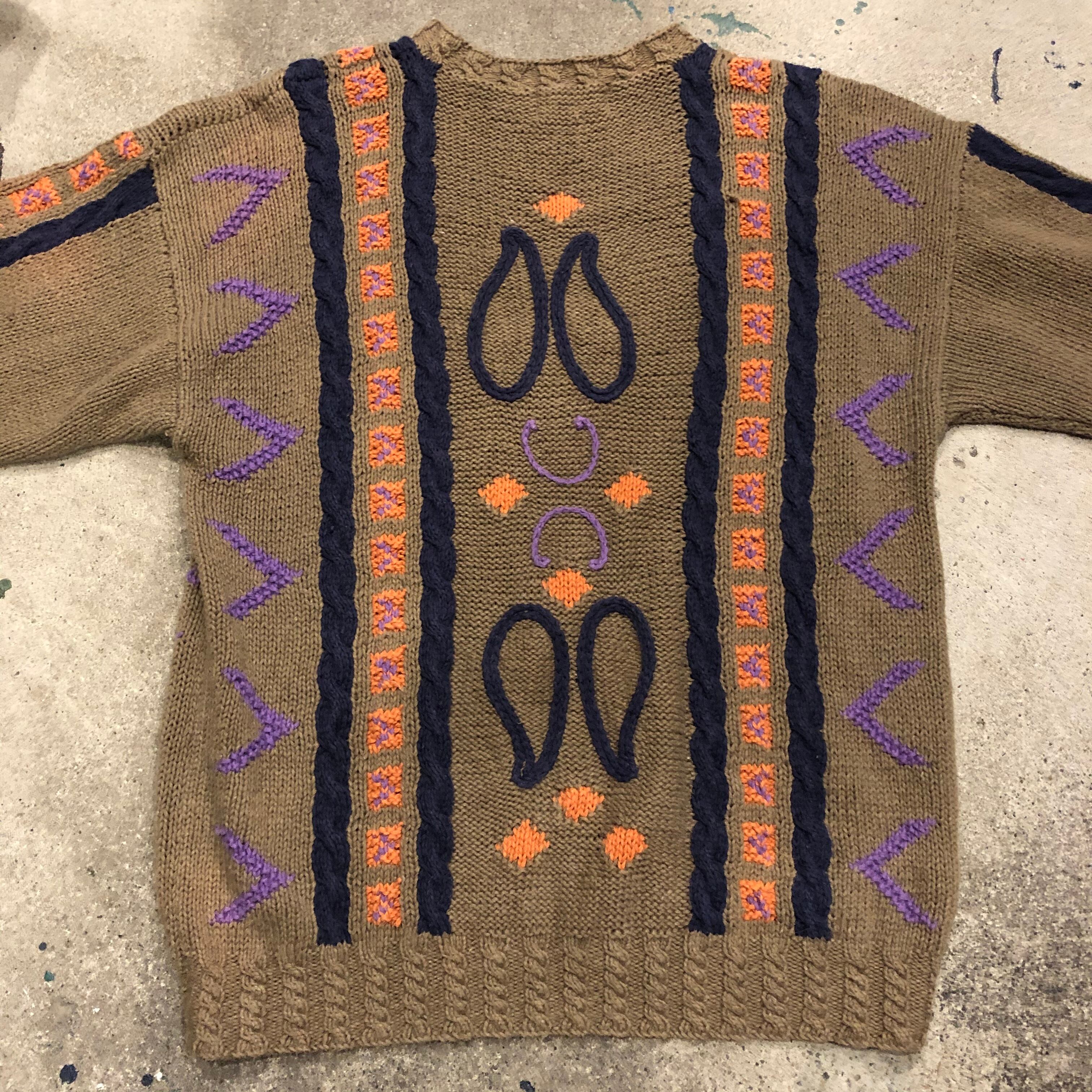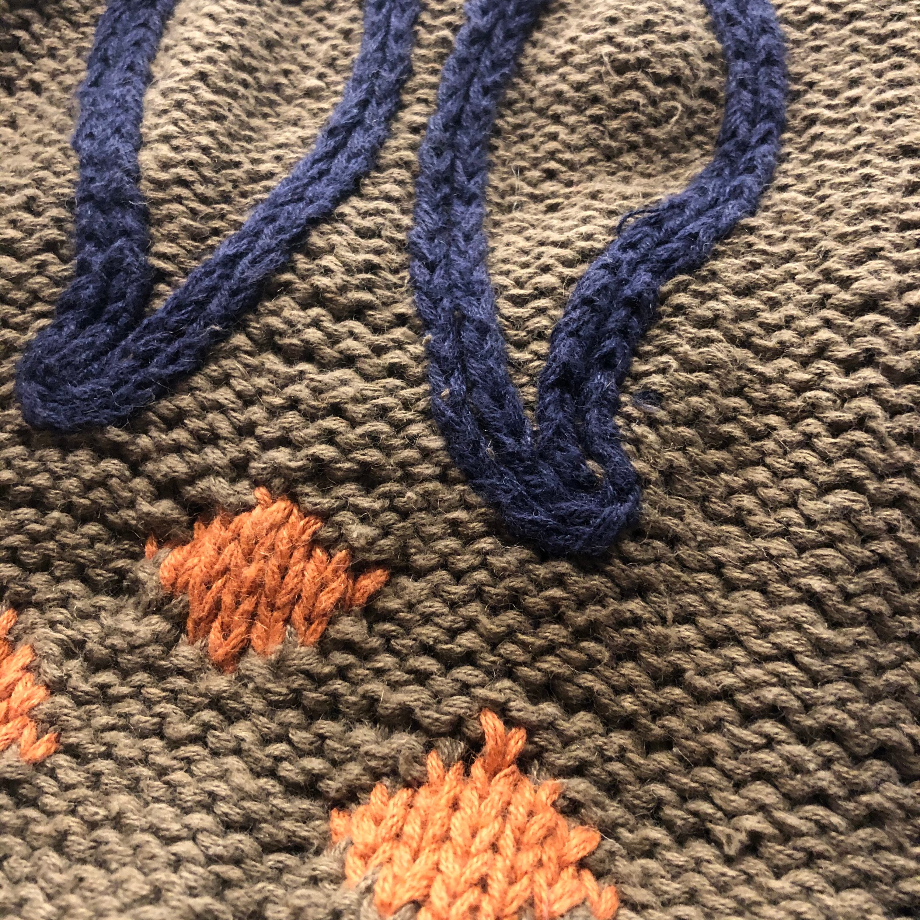 カーキとベージュがまざったような色に紫、オレンジ、ネイビーの不思議な模様にぐっときます。