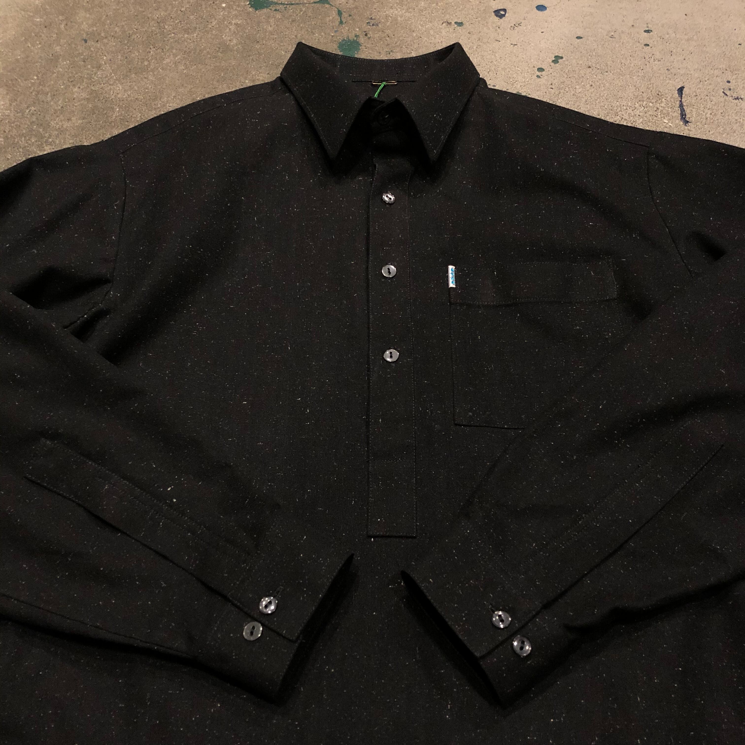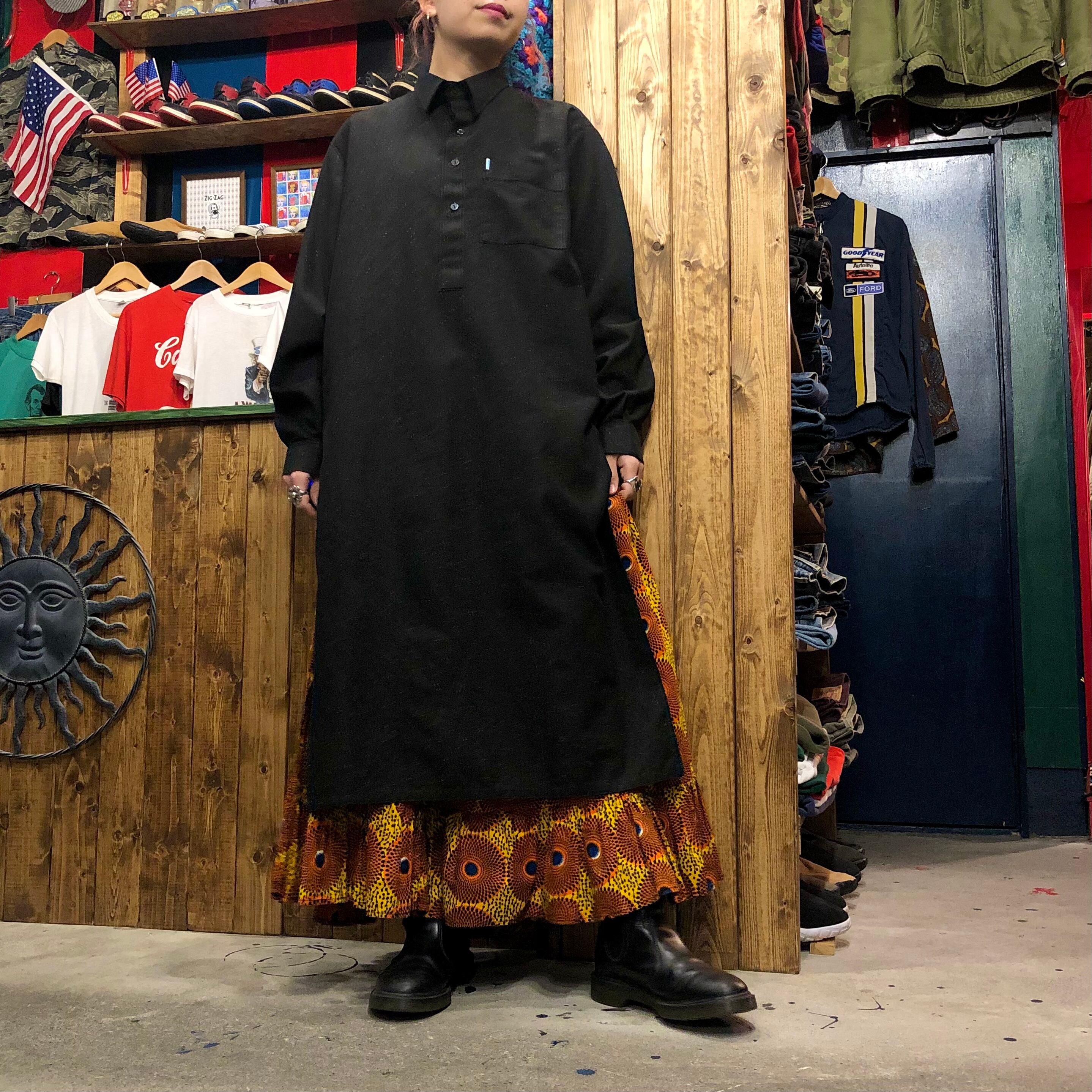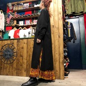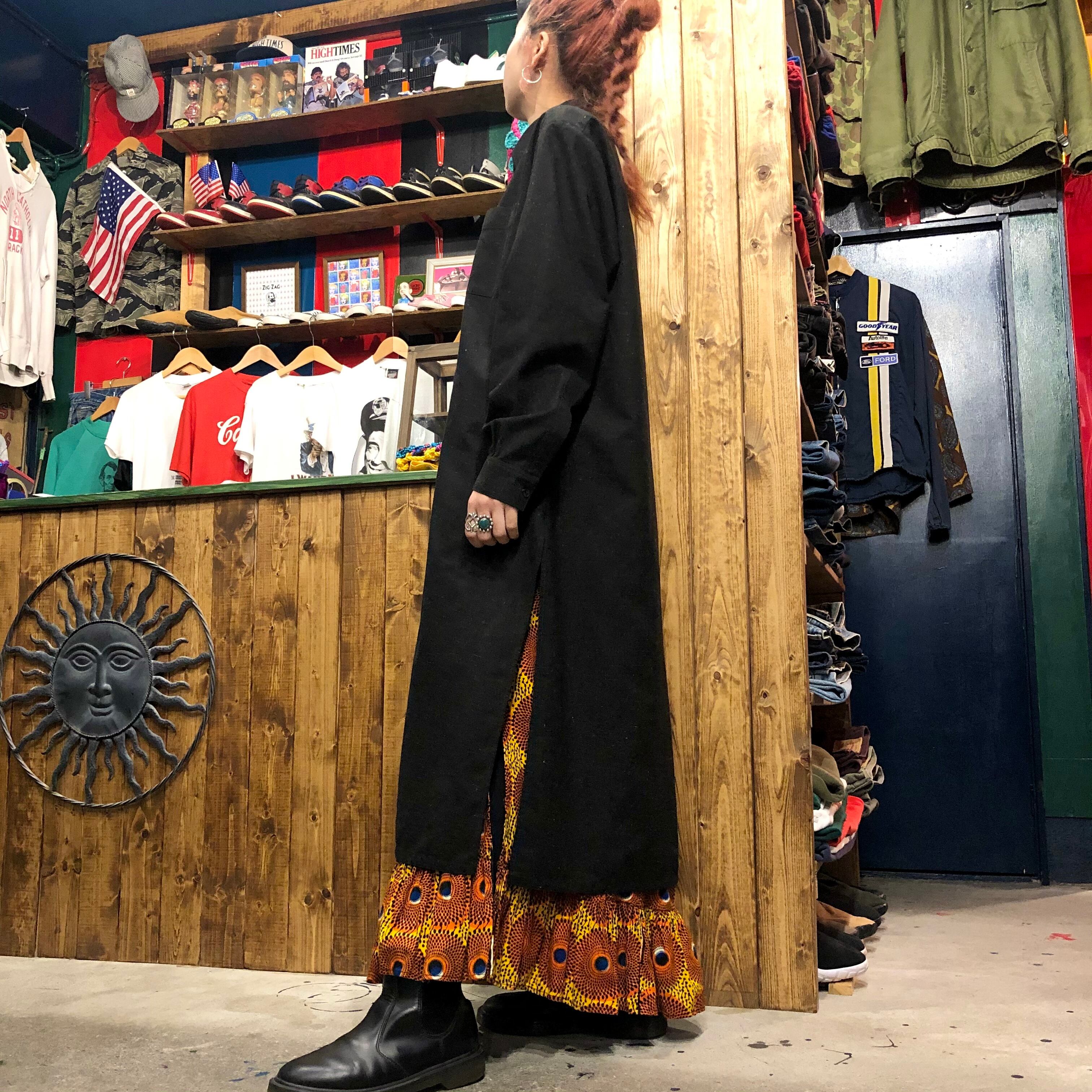 黒地にランダムな白い点々模様のカフタンシャツです。イスラム文化圏の男性が着ているもので丈が長く、スリットが深く入っています。透明のボタンやラメの星のタグがかわいらしいです。
