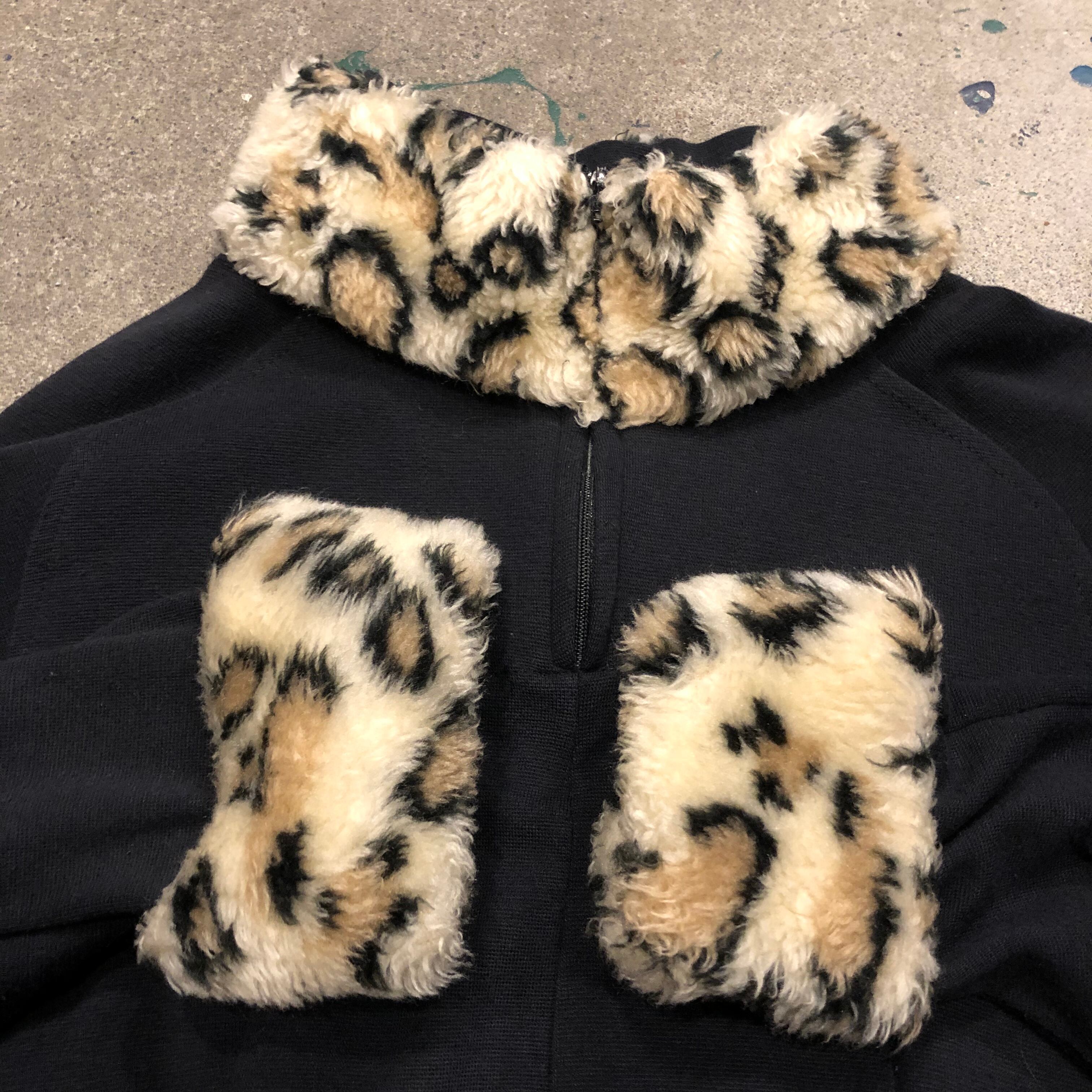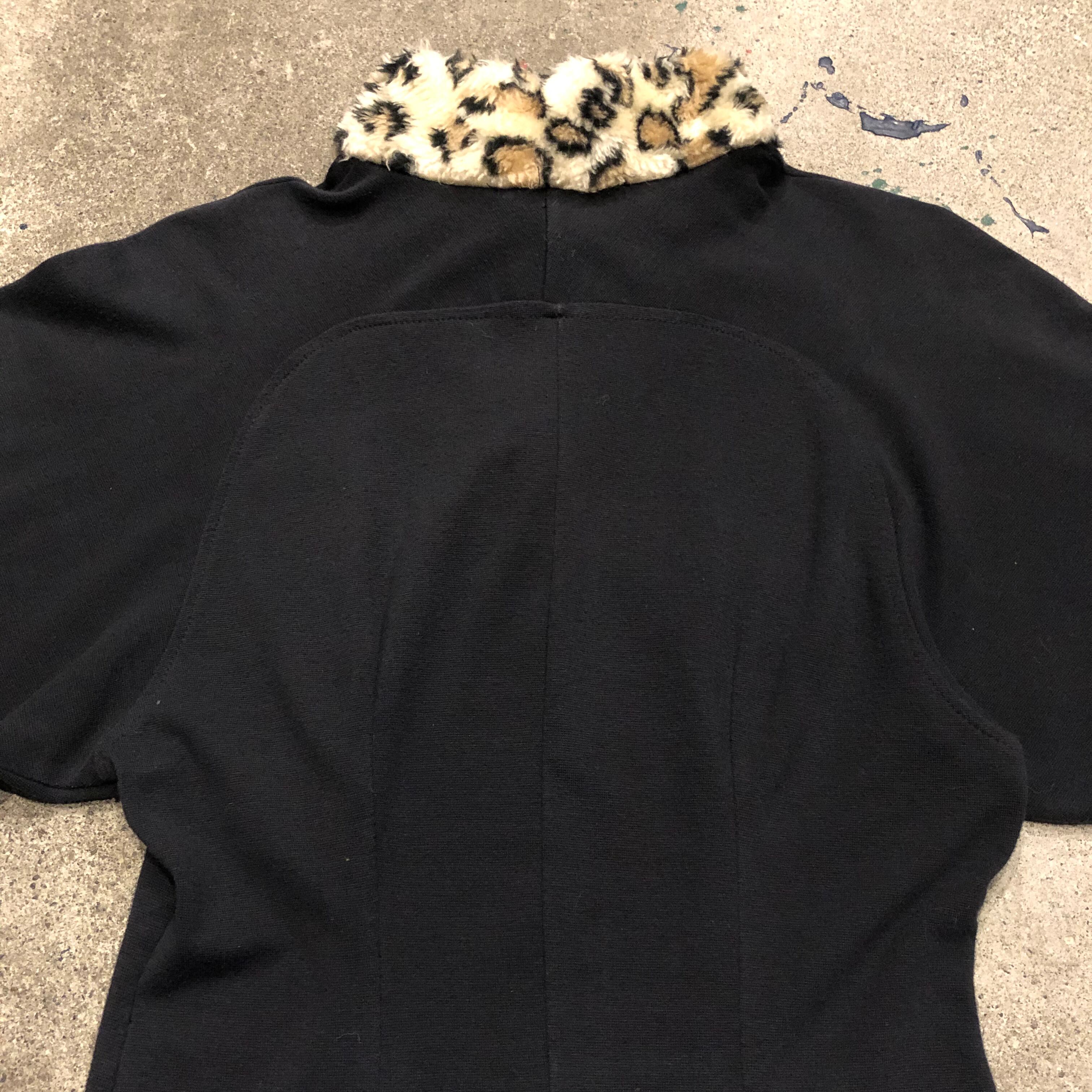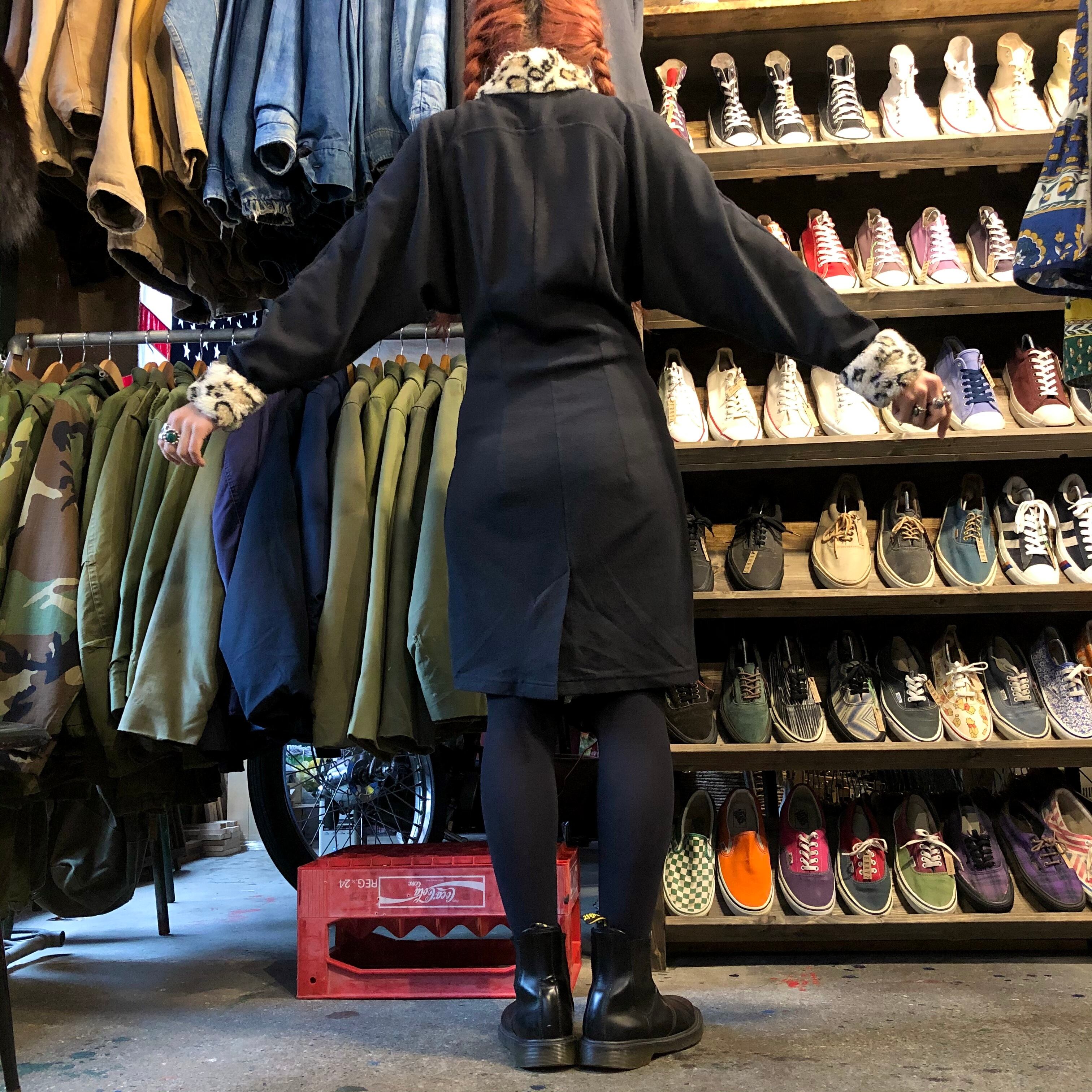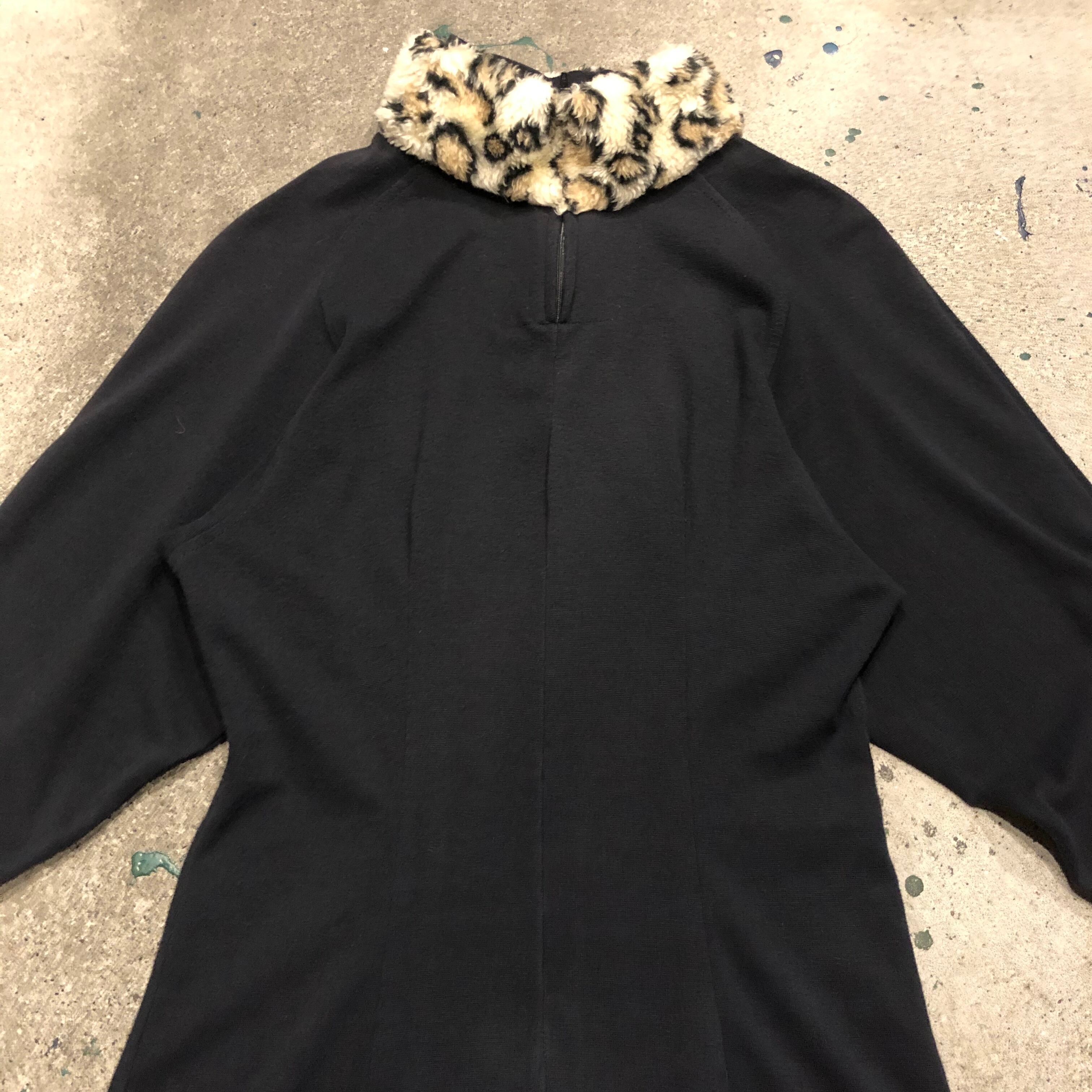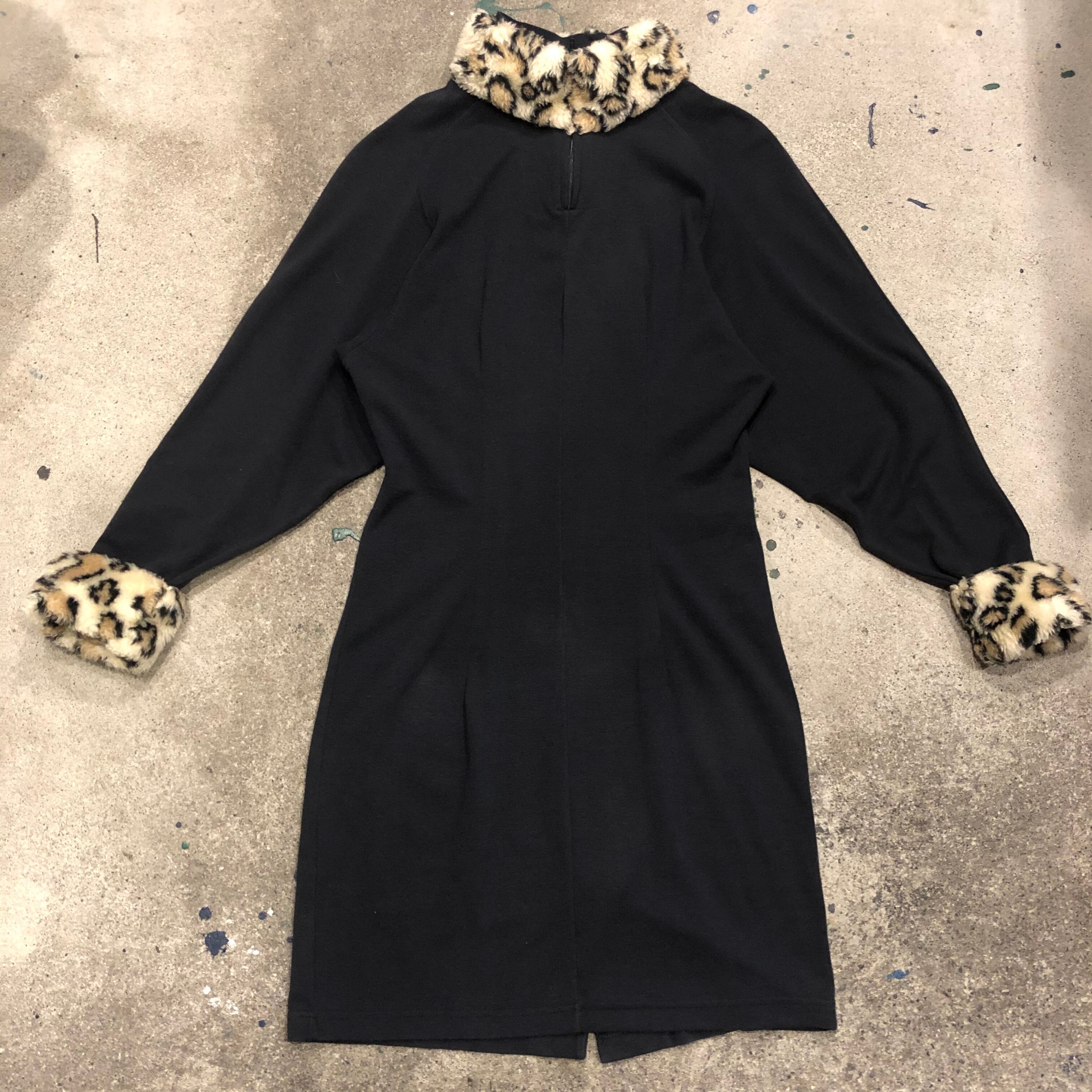 襟ぐりと袖口にヒョウ柄のフェイクファーがかわいいワンピースです。