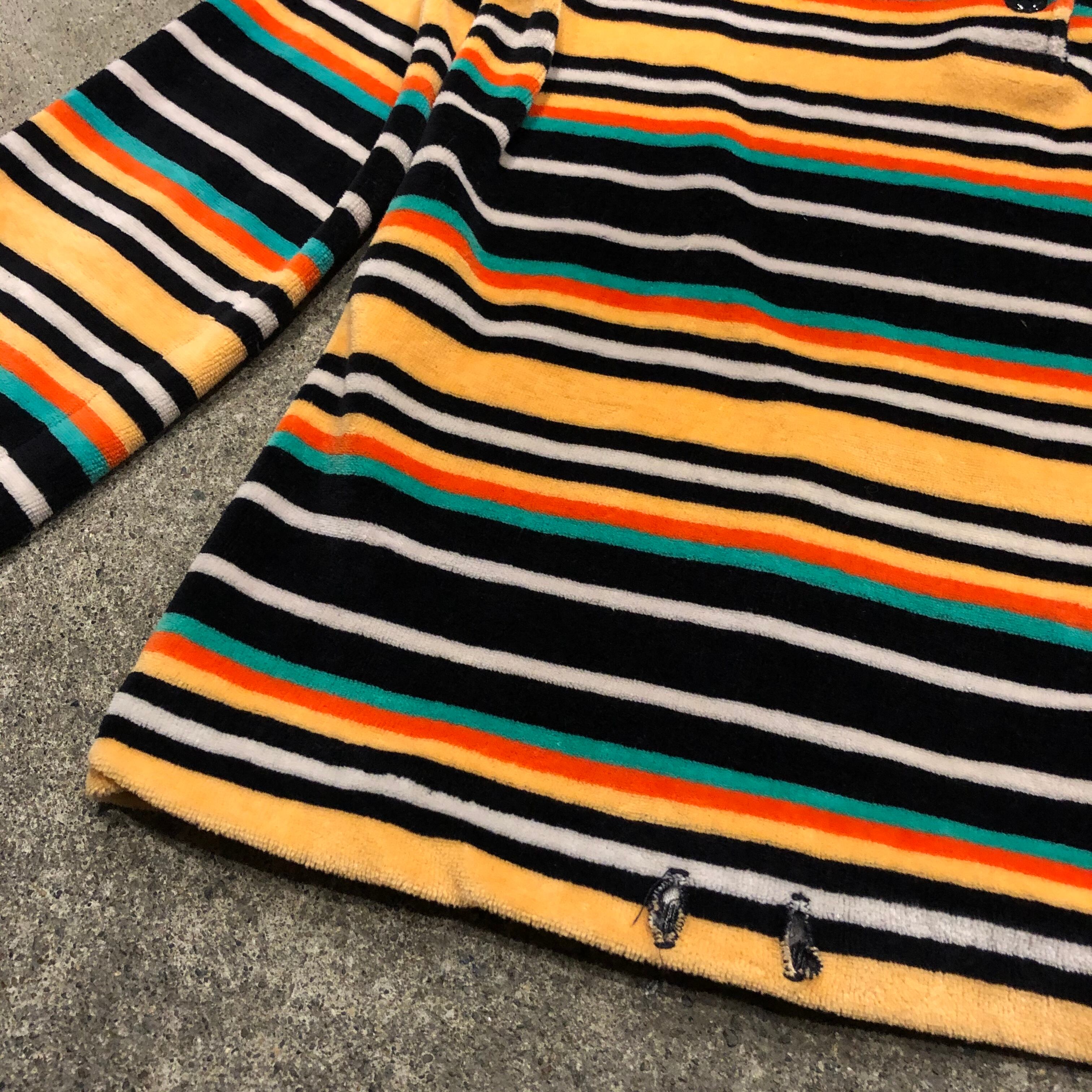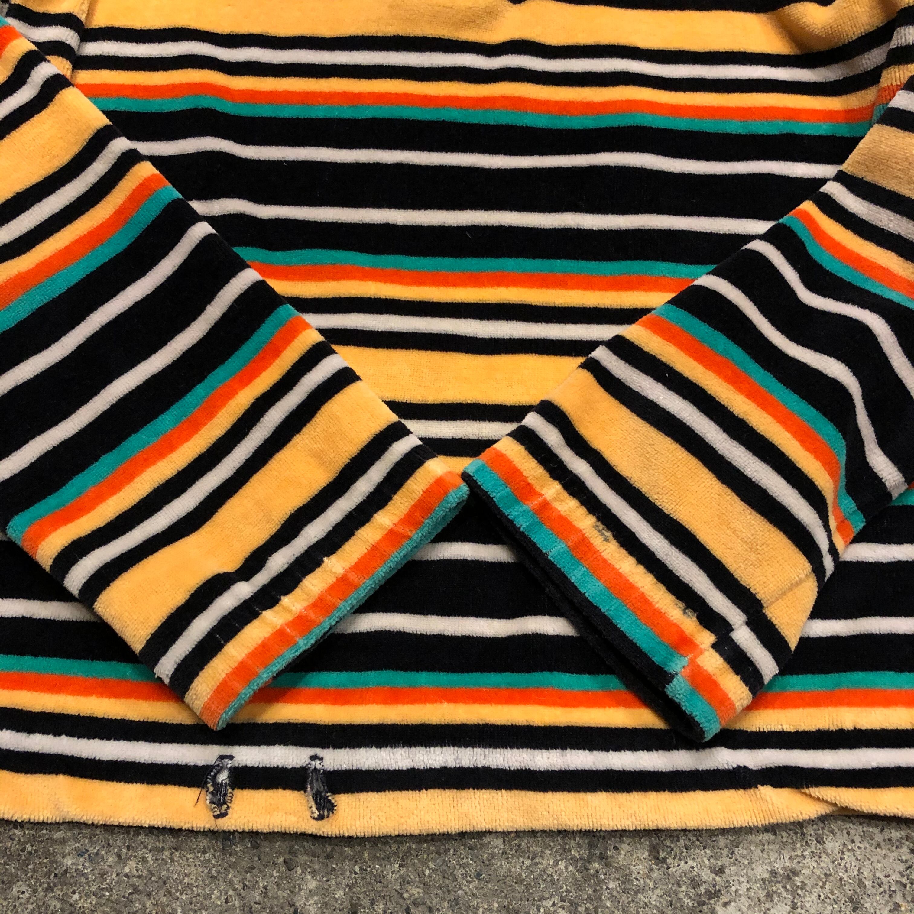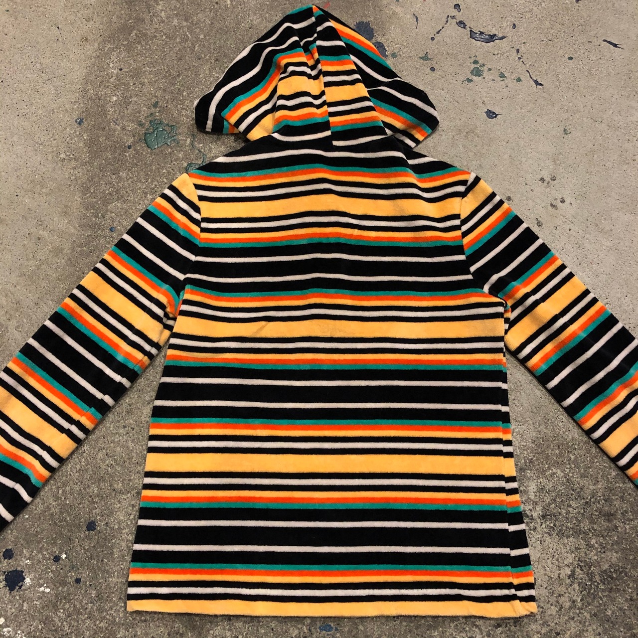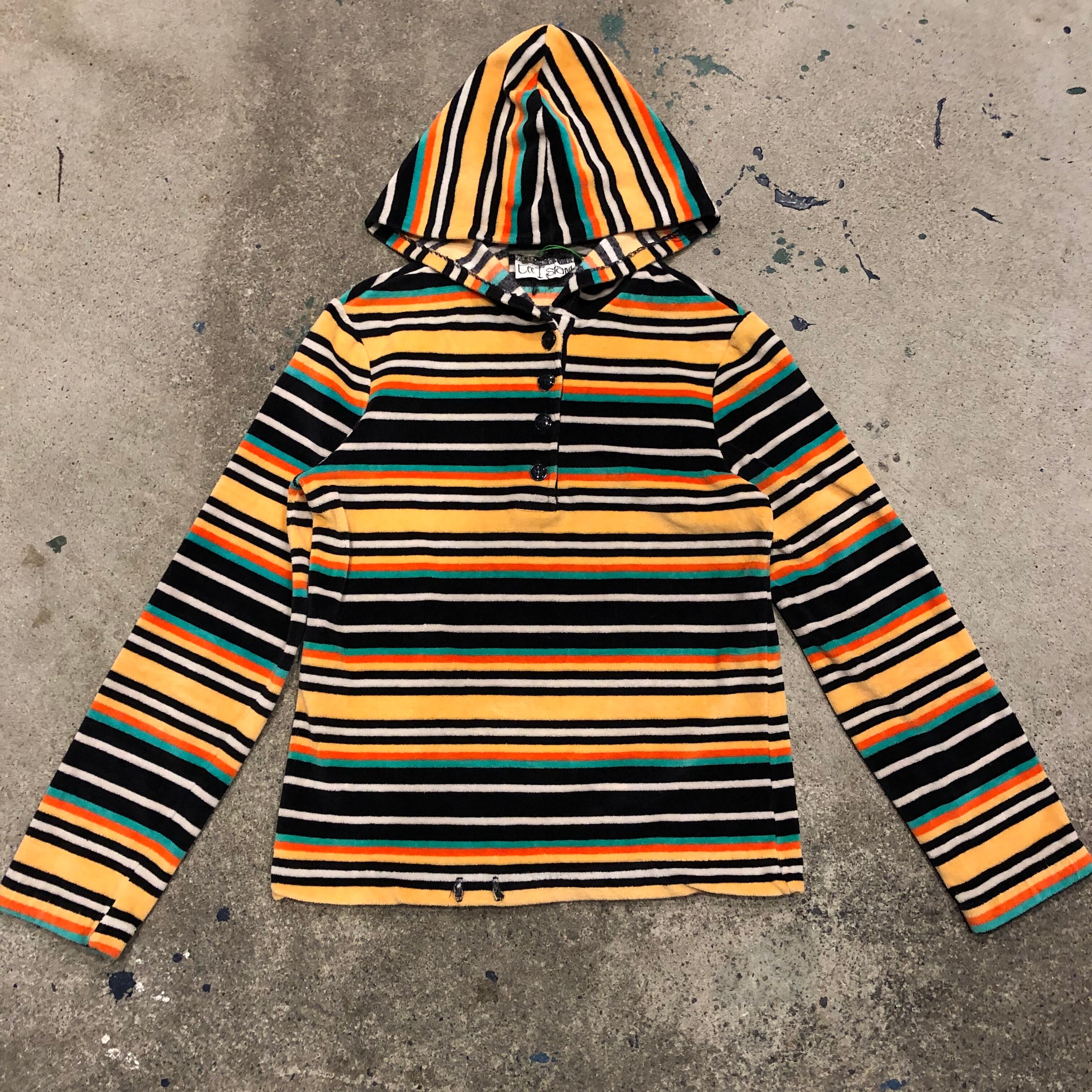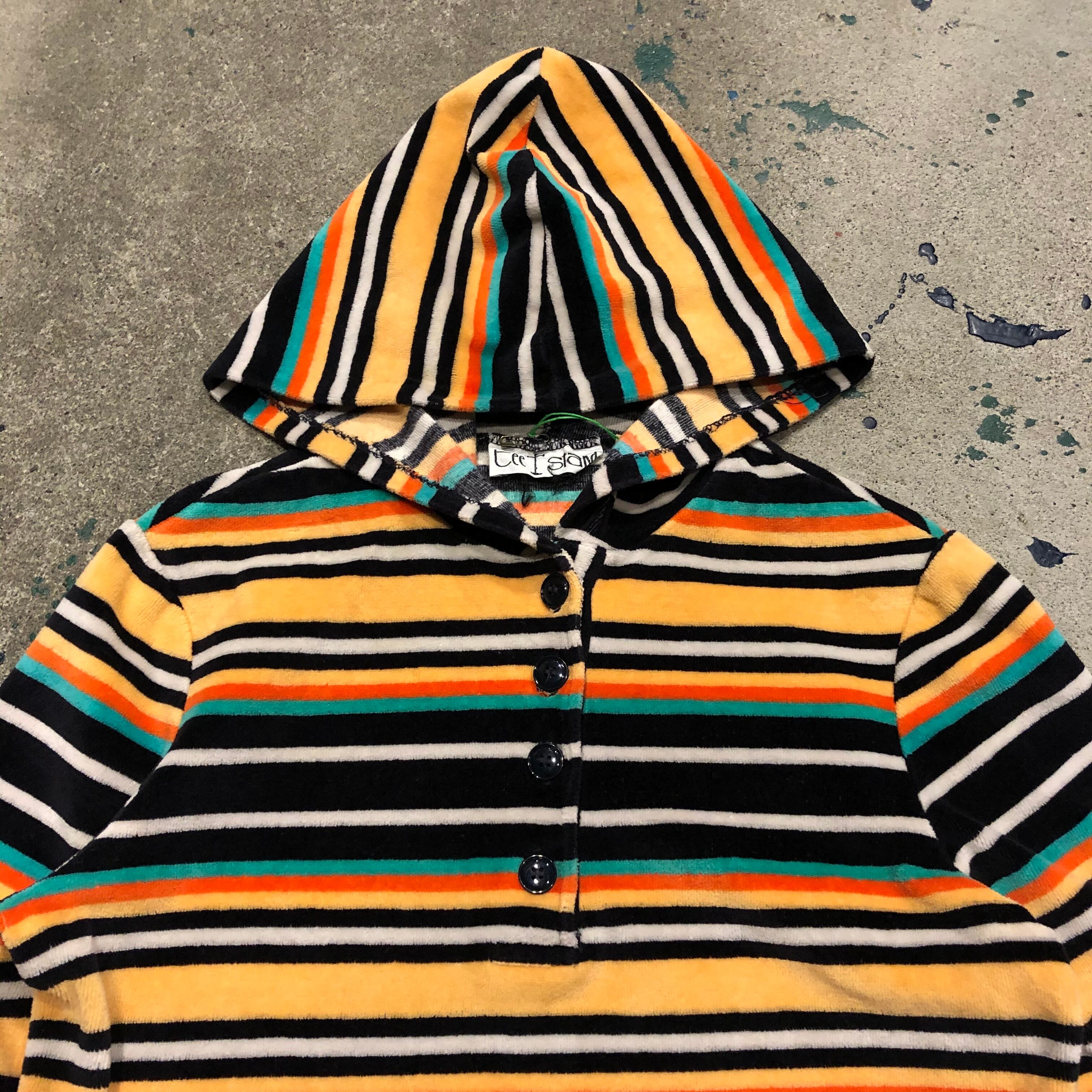 マルチカラーのボーダーがかわいいフード付きのトップスです。