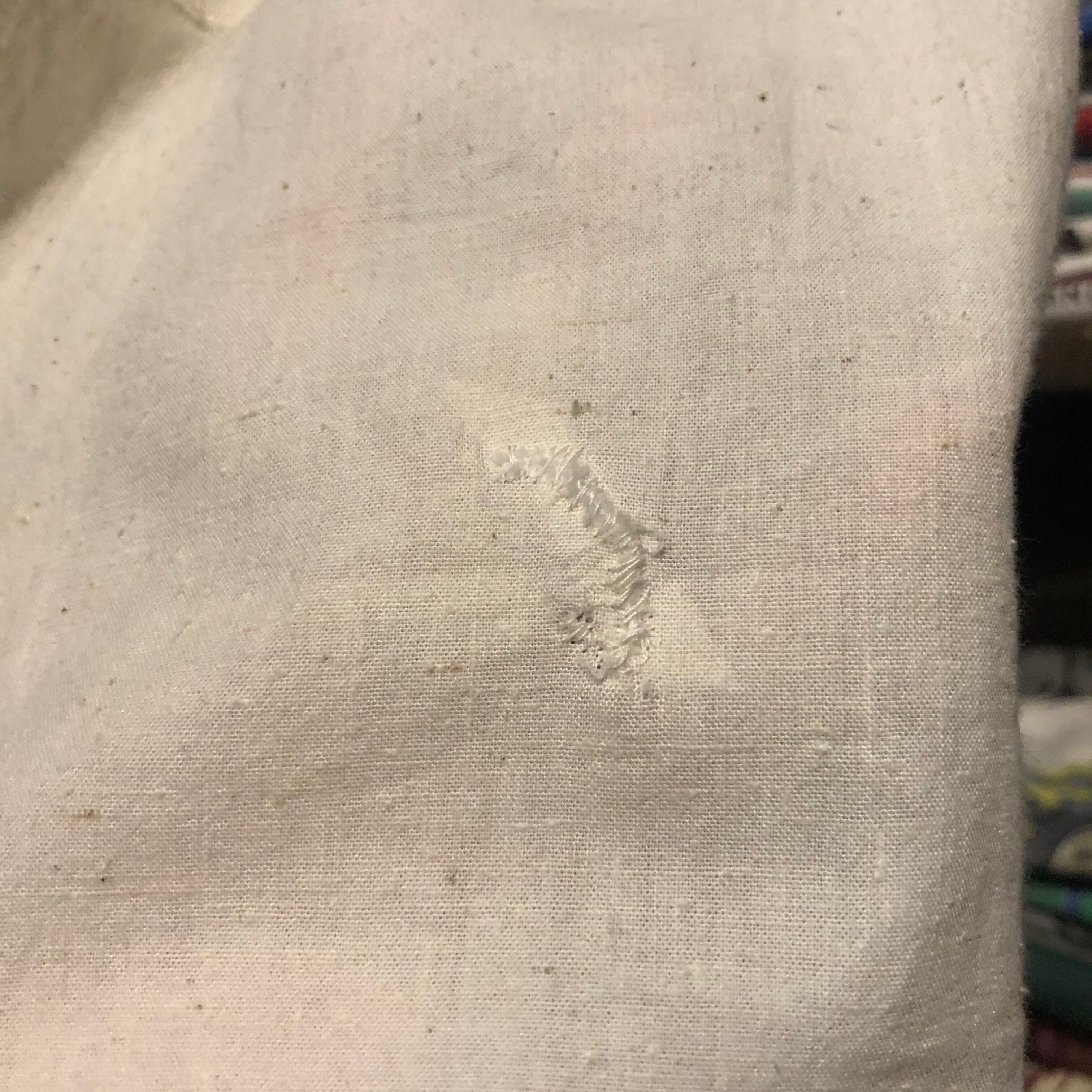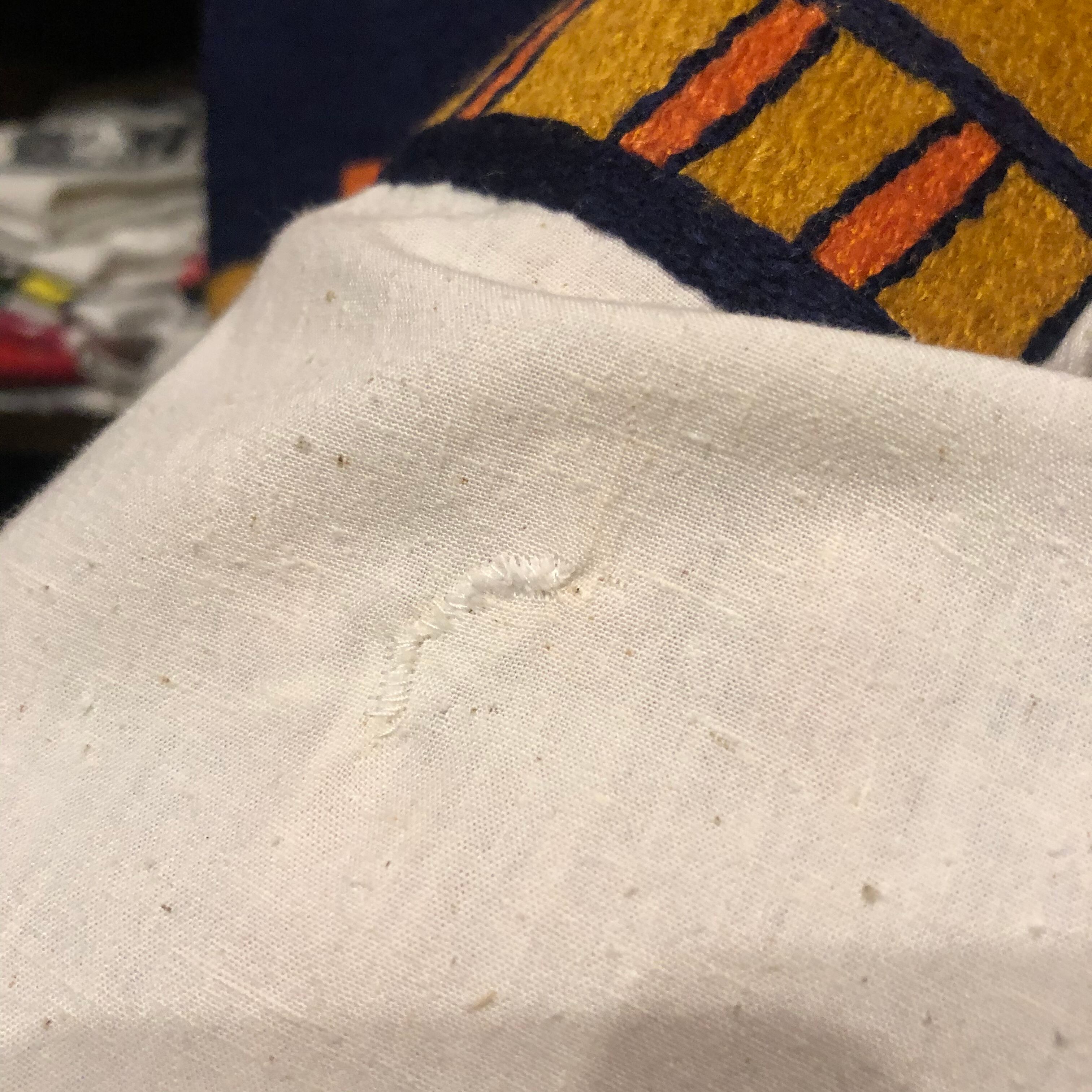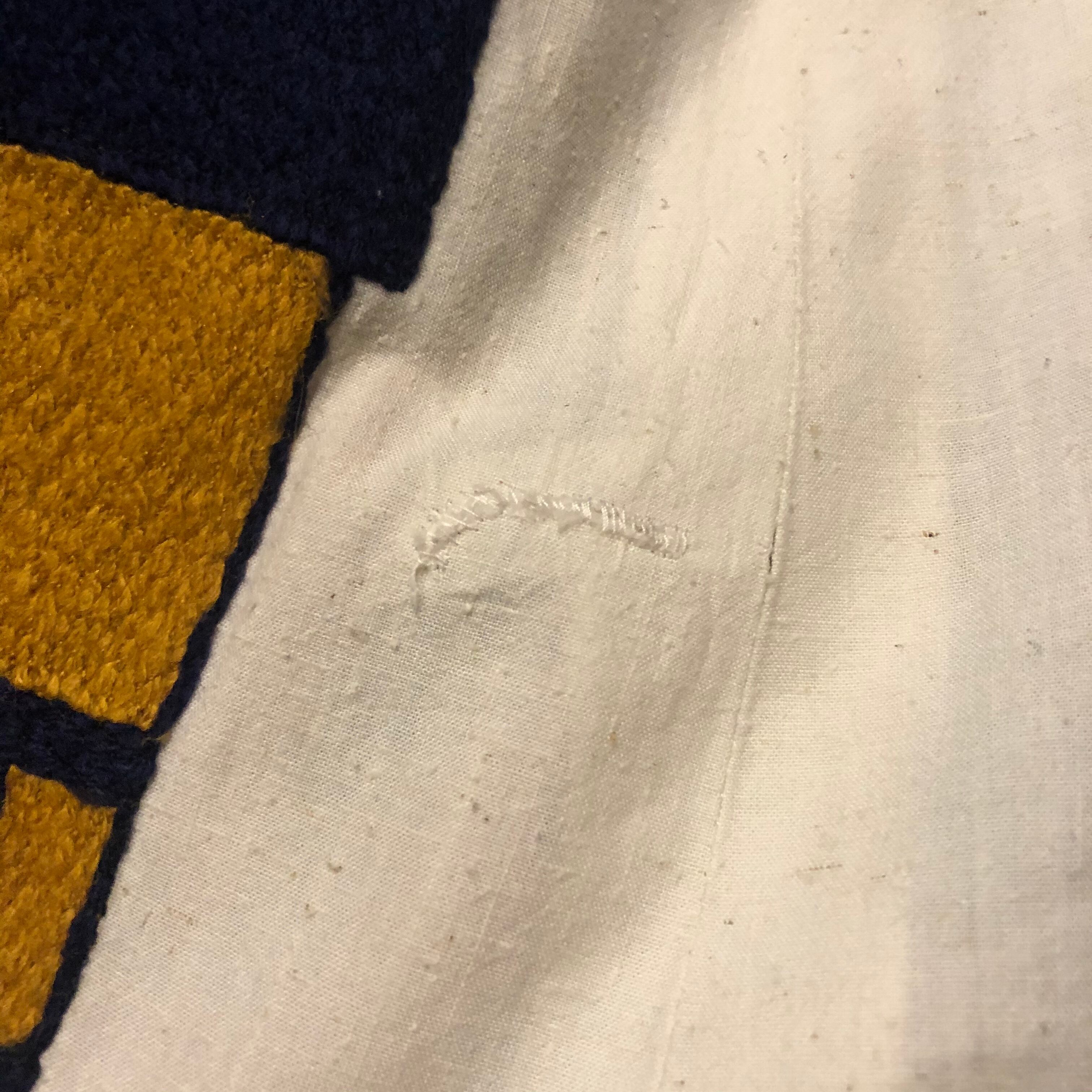 左脇太もも下あたりにかなりダメージがあり、リペアしてあります。左袖口にやや黄ばみがあります。写真をご確認の上、古着にご理解のある方のご購入をお願い致します。