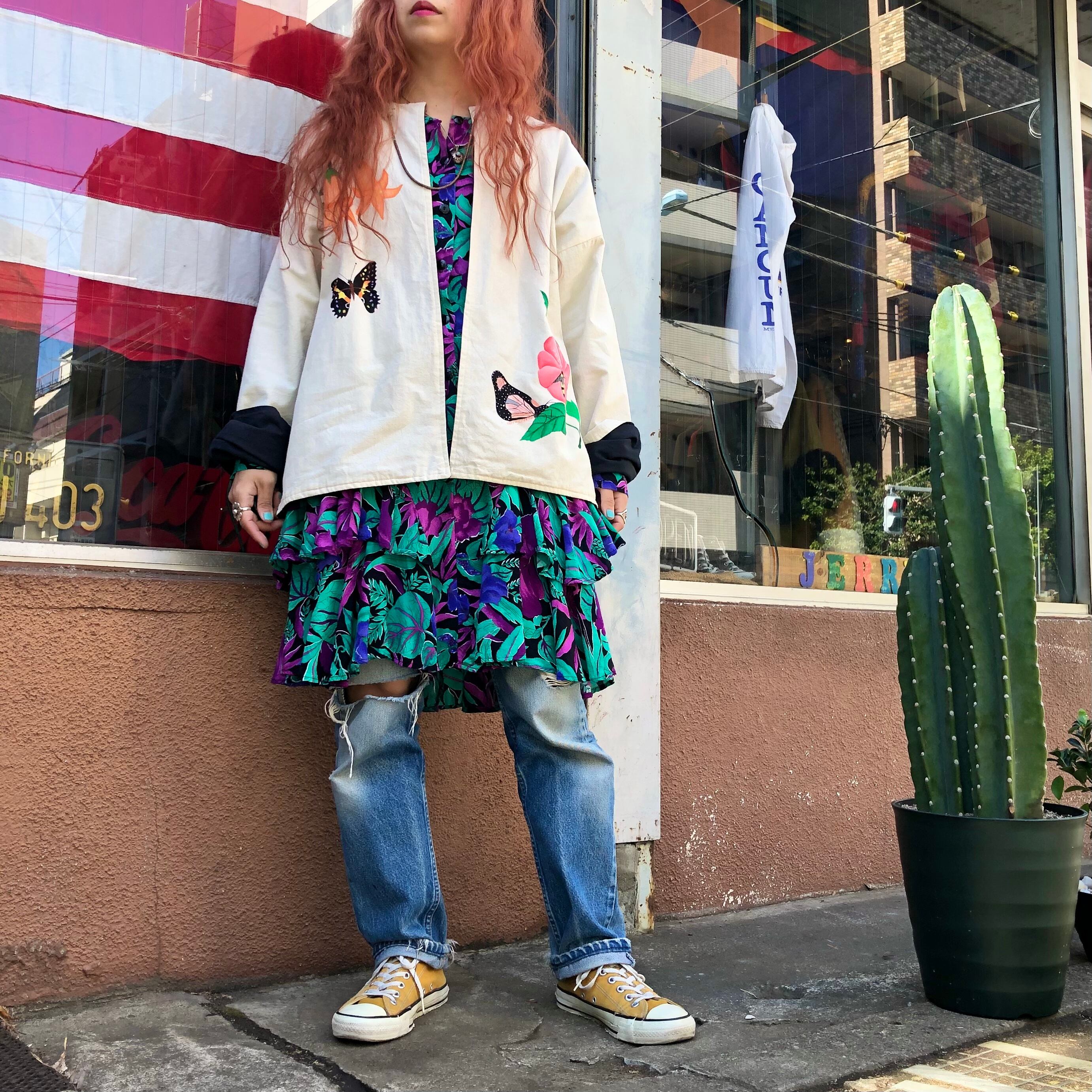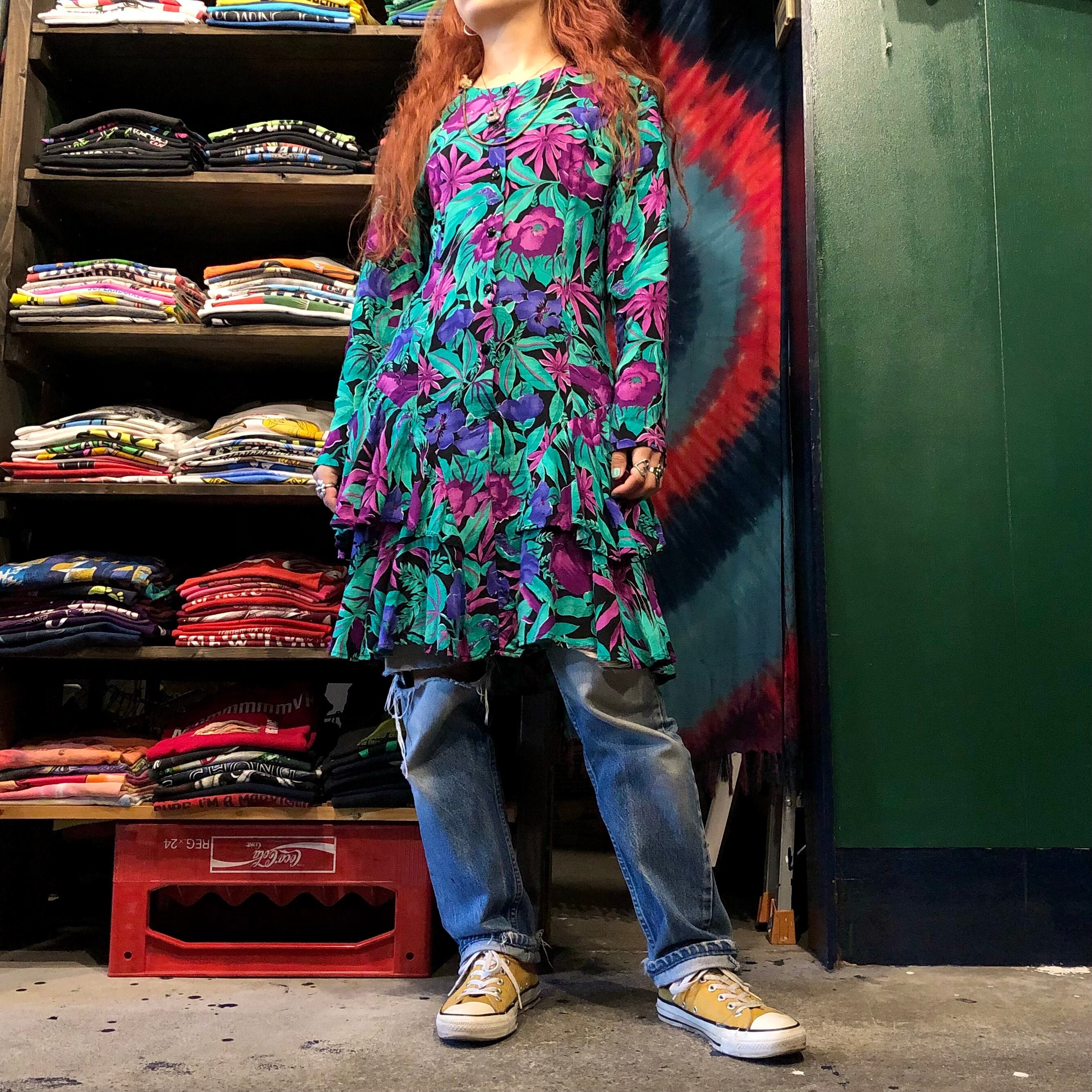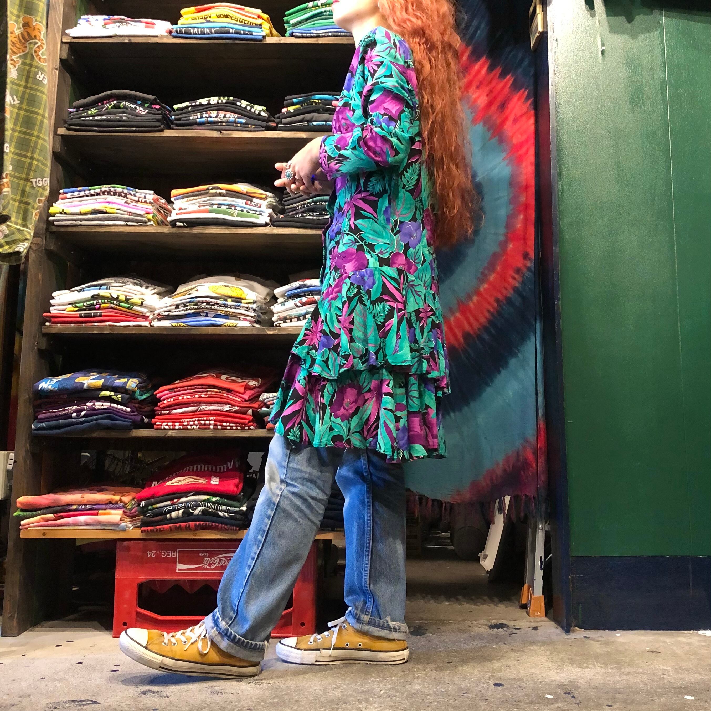 2段のティアードになっており、風でヒラッと揺れて素敵です。薄手の長袖ですので真夏を除いて幅広い季節でお使いいただけるアイテムだと思います。写真ではデニムを合わせていますが、タイツでも素足でも、合わせる靴で雰囲気が変わりそうですね。上からTシャツを重ねたり遊んで着るのもおすすめです!