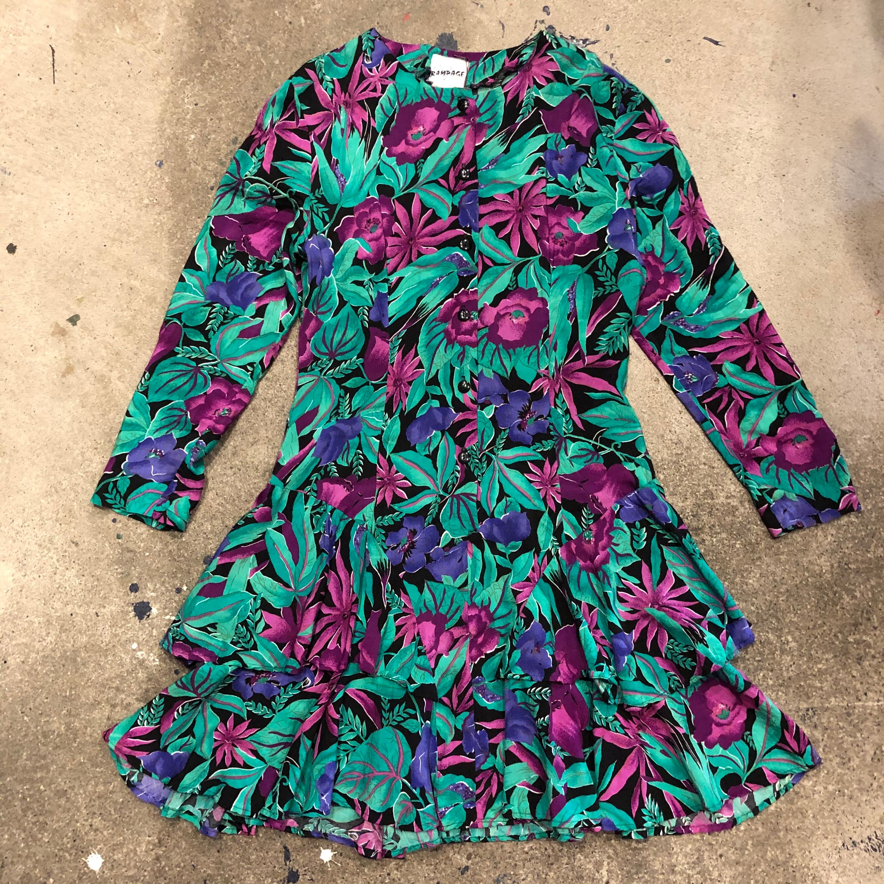 黒地にパープルのお花とグリーンの葉っぱの色合いがとても可愛いワンピースです。