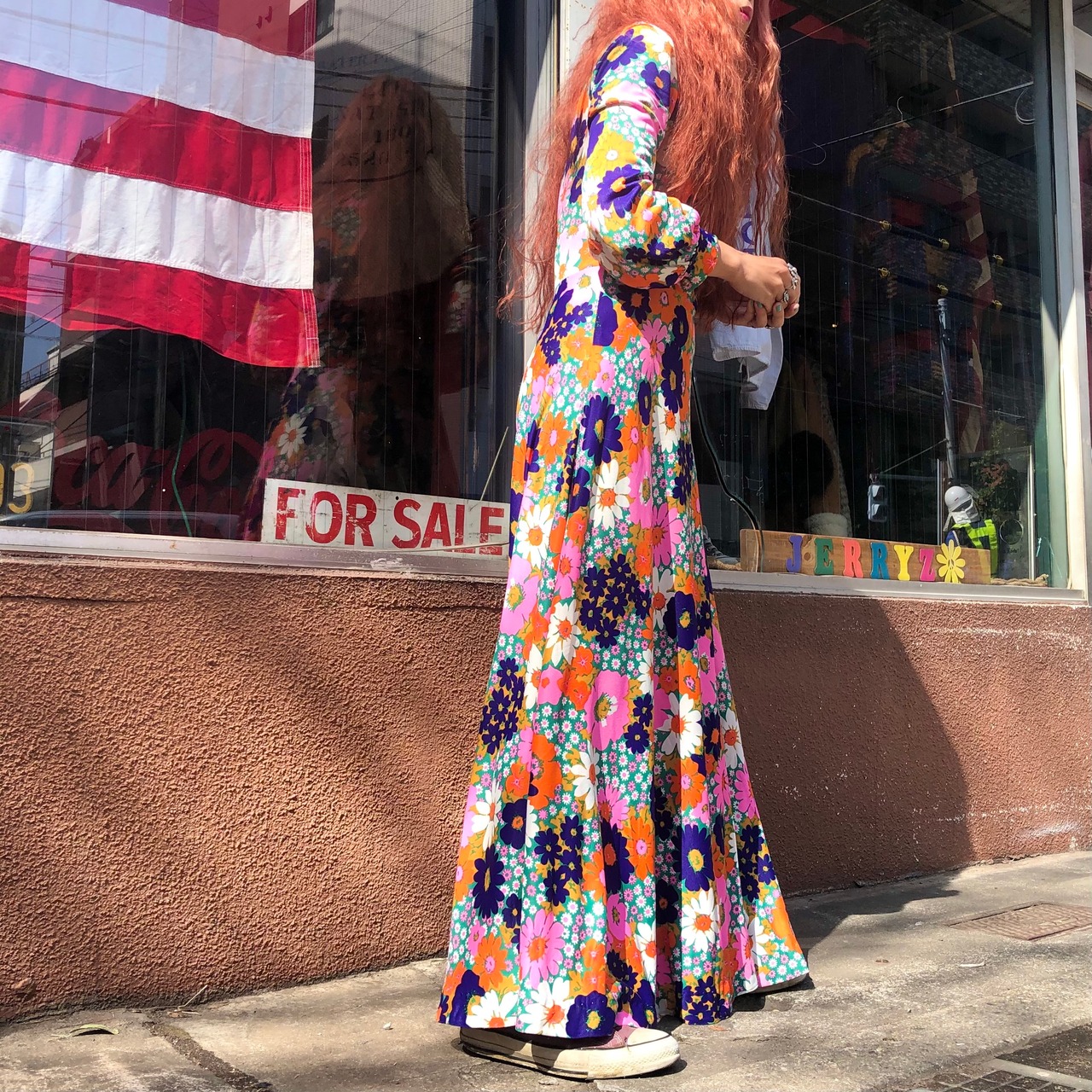 うっとりしてしまうほどに可愛らしい花柄と、その時代らしいシルエットや雰囲気がとても素敵な一着です。ささやかなスタンドカラーに女性らしい袖口、程よくボリュームのあるスカート部分などどこを取っても魅力的ですね。スウェットやTシャツを重ねてカジュアルに着ても、ブーツなどレザーアイテムと合わせてかっこよく着るのも良いですね!
