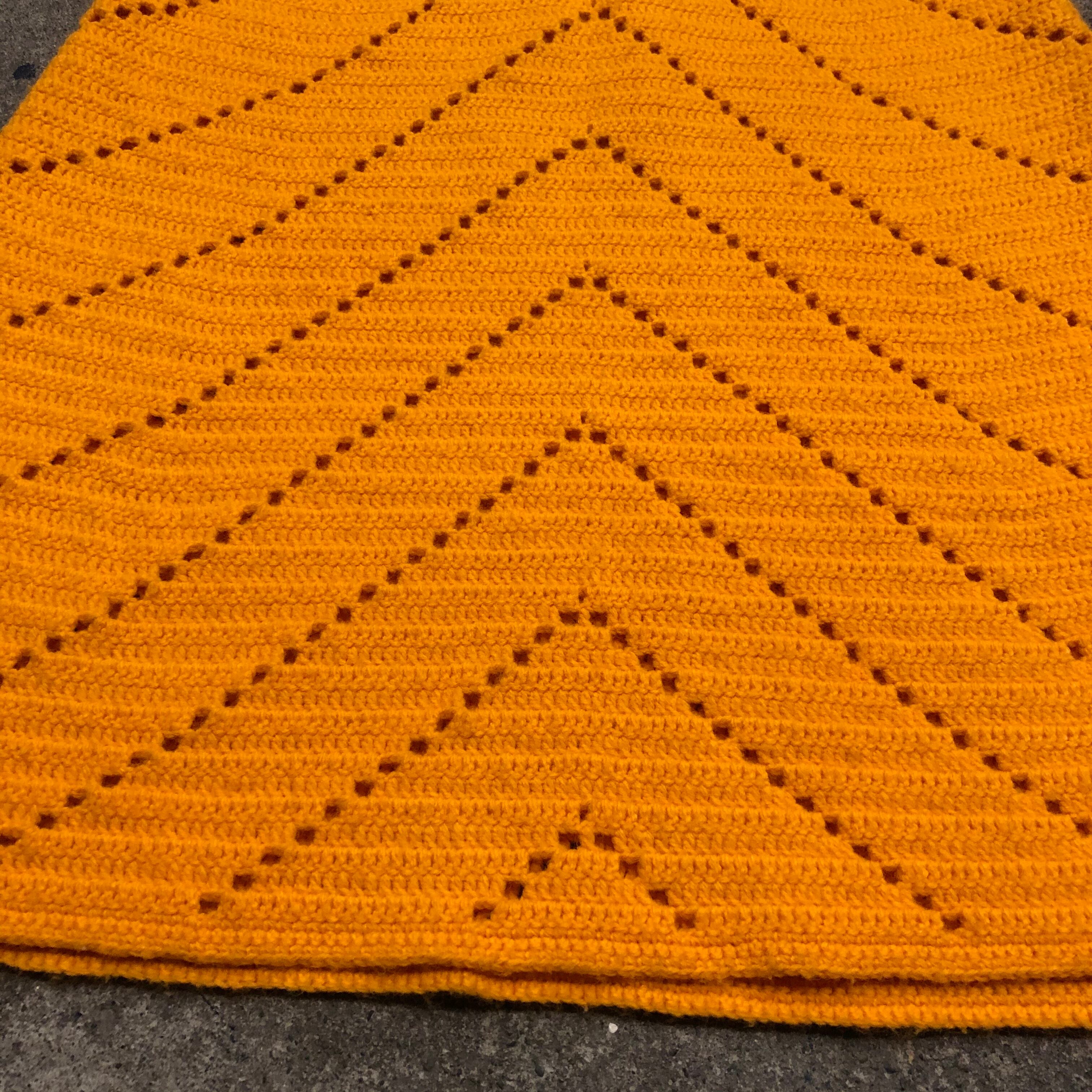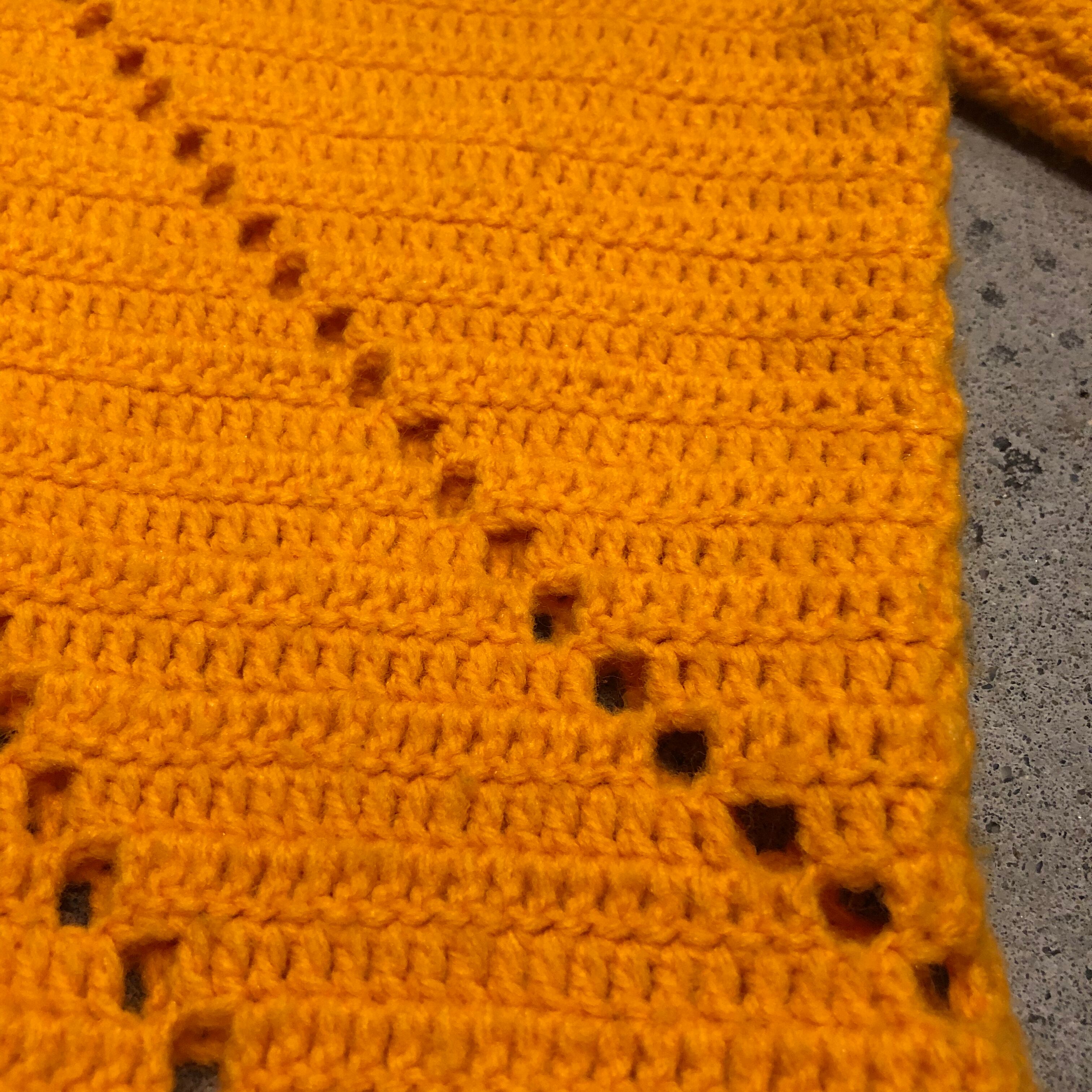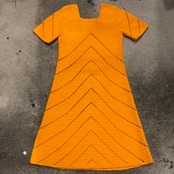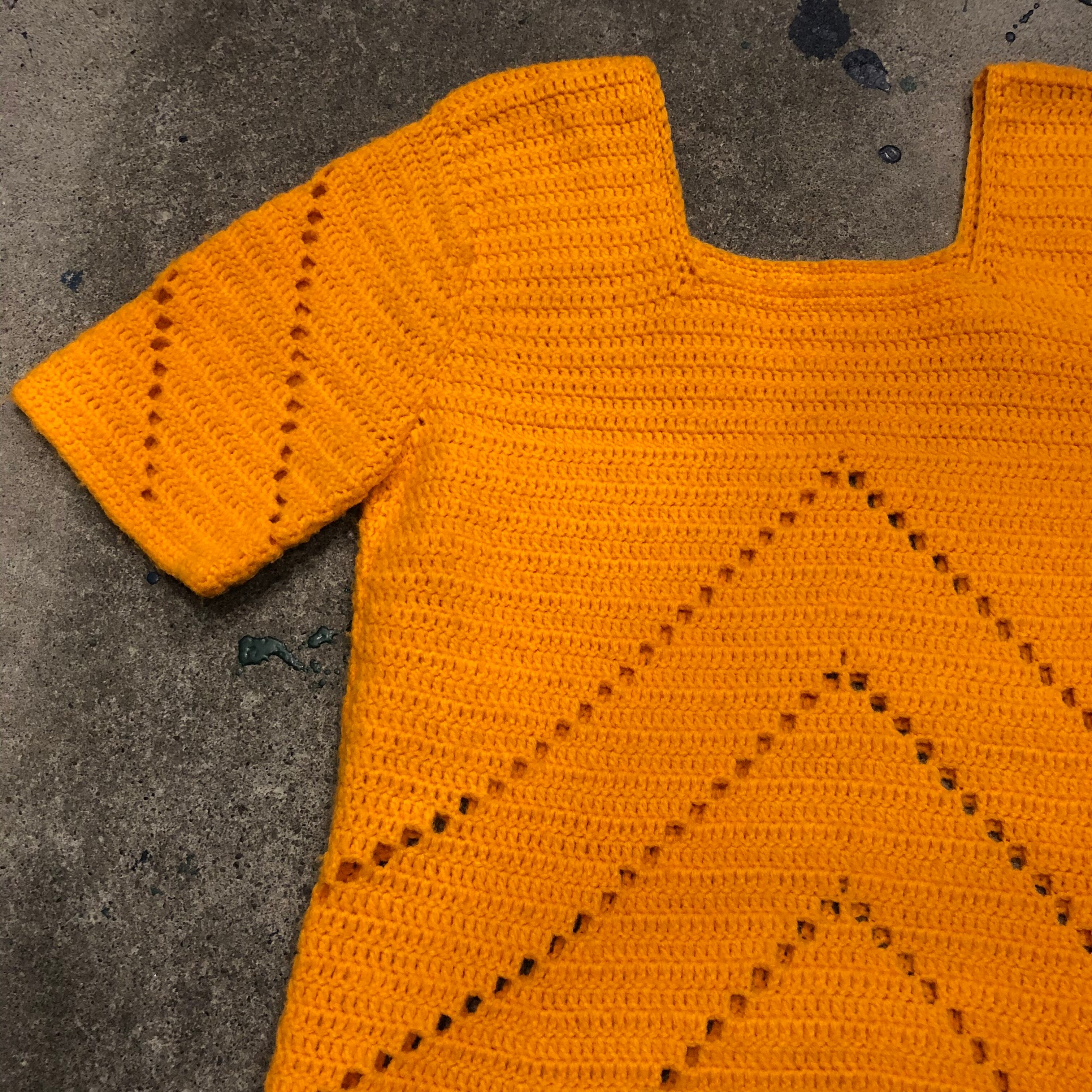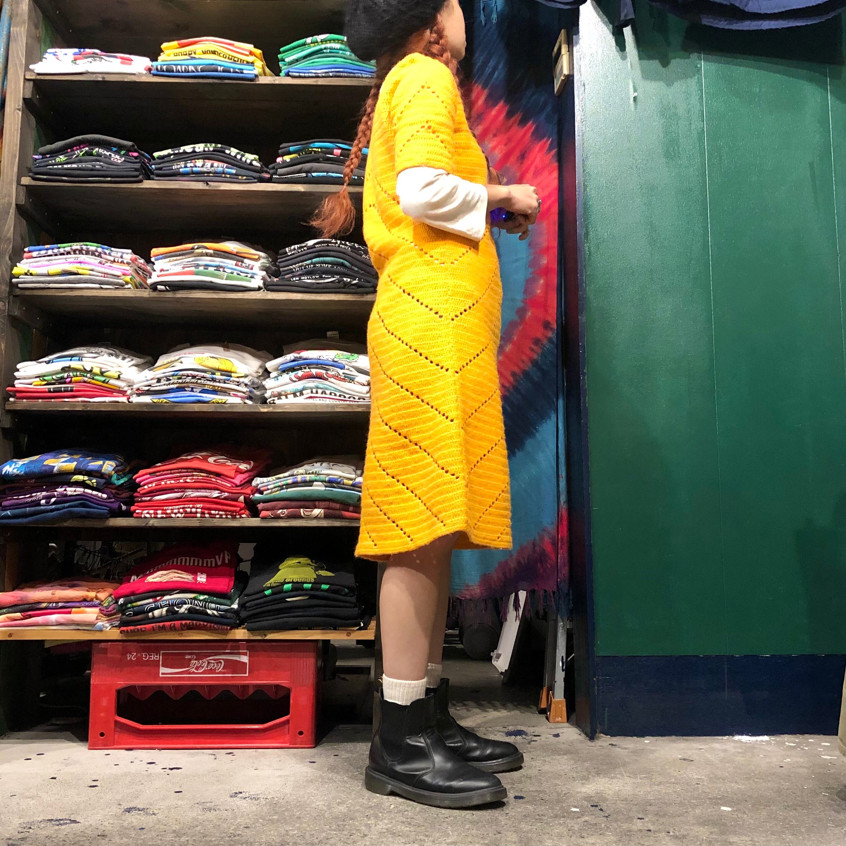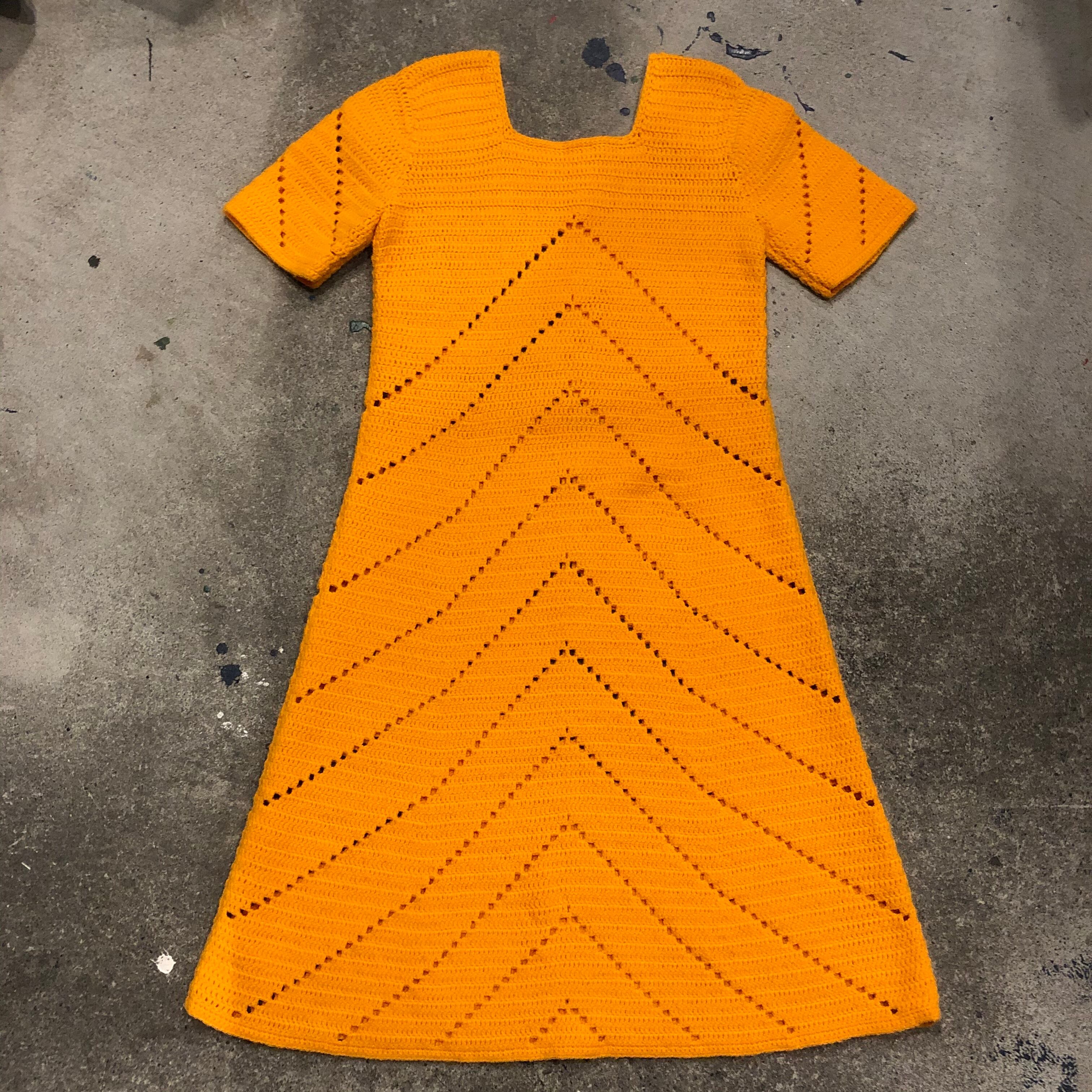 オレンジ味のある黄色のパリッと明るい色がかわいい手編みのニットワンピースです。