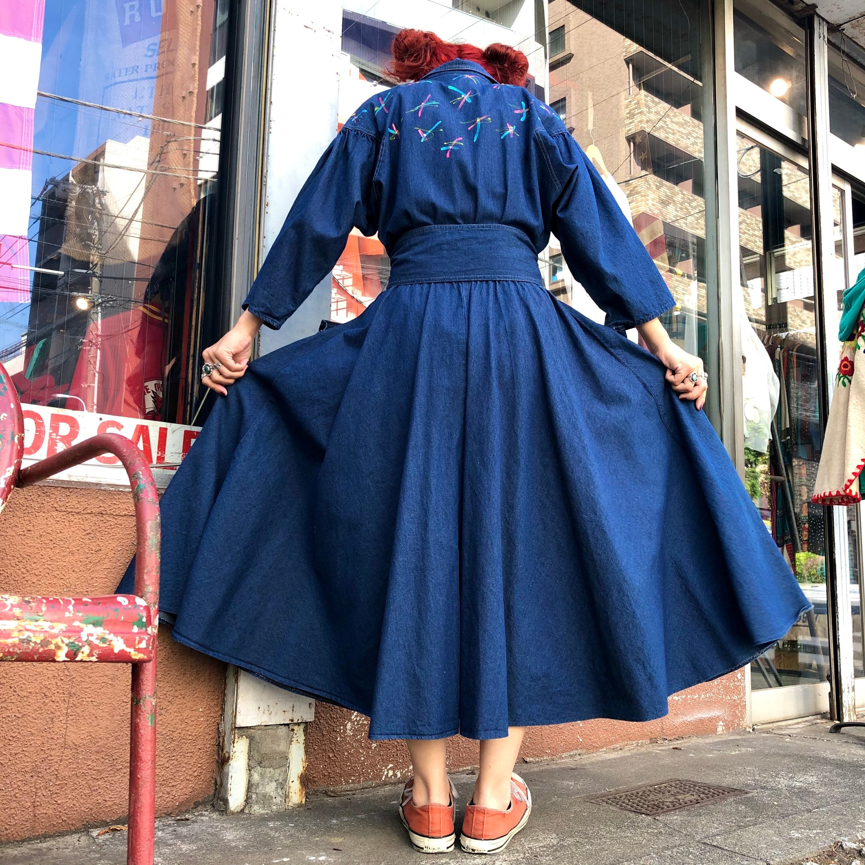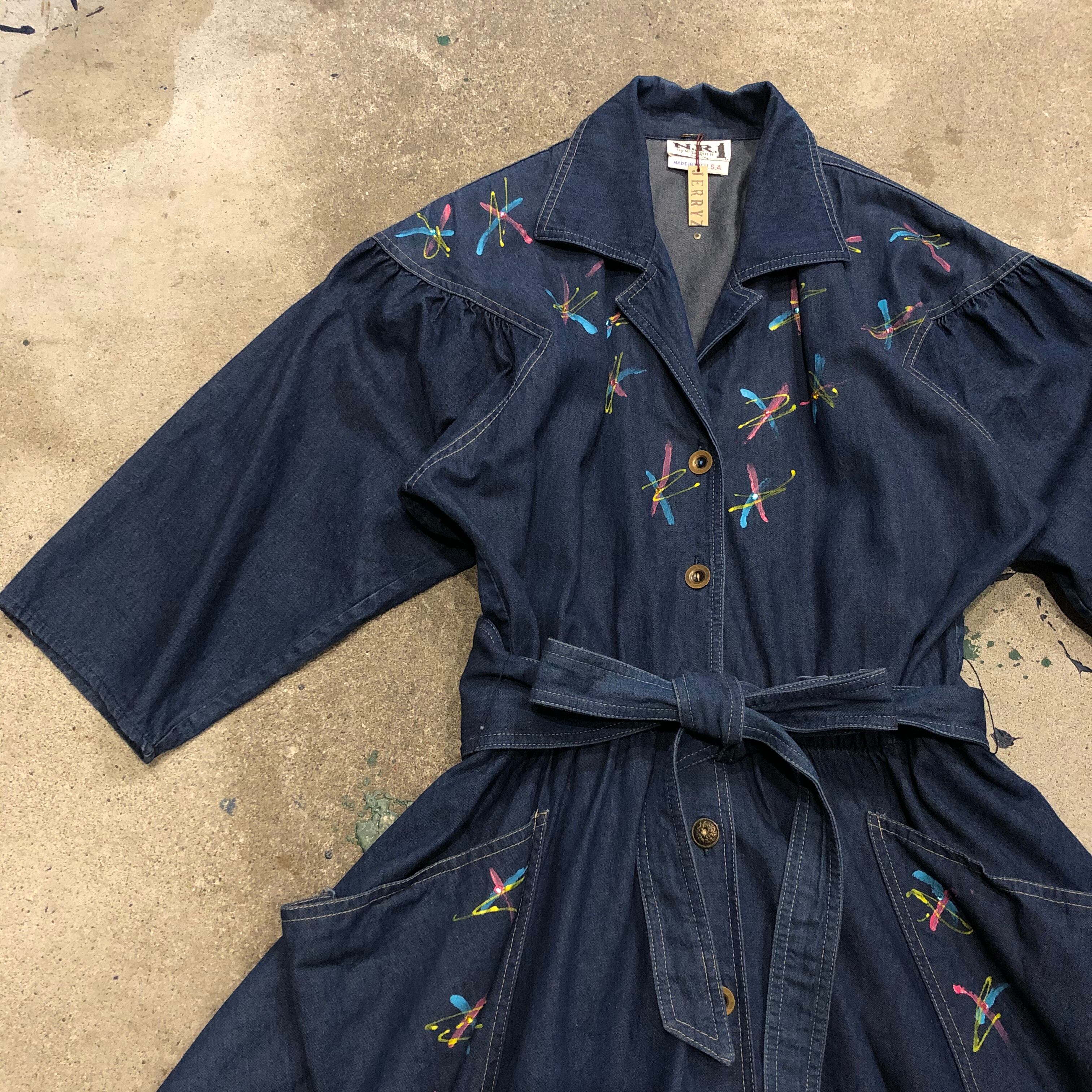 ハンドペイントの模様とキラッとさりげなくラインストーンが付いていてかわいいデニムワンピースです。