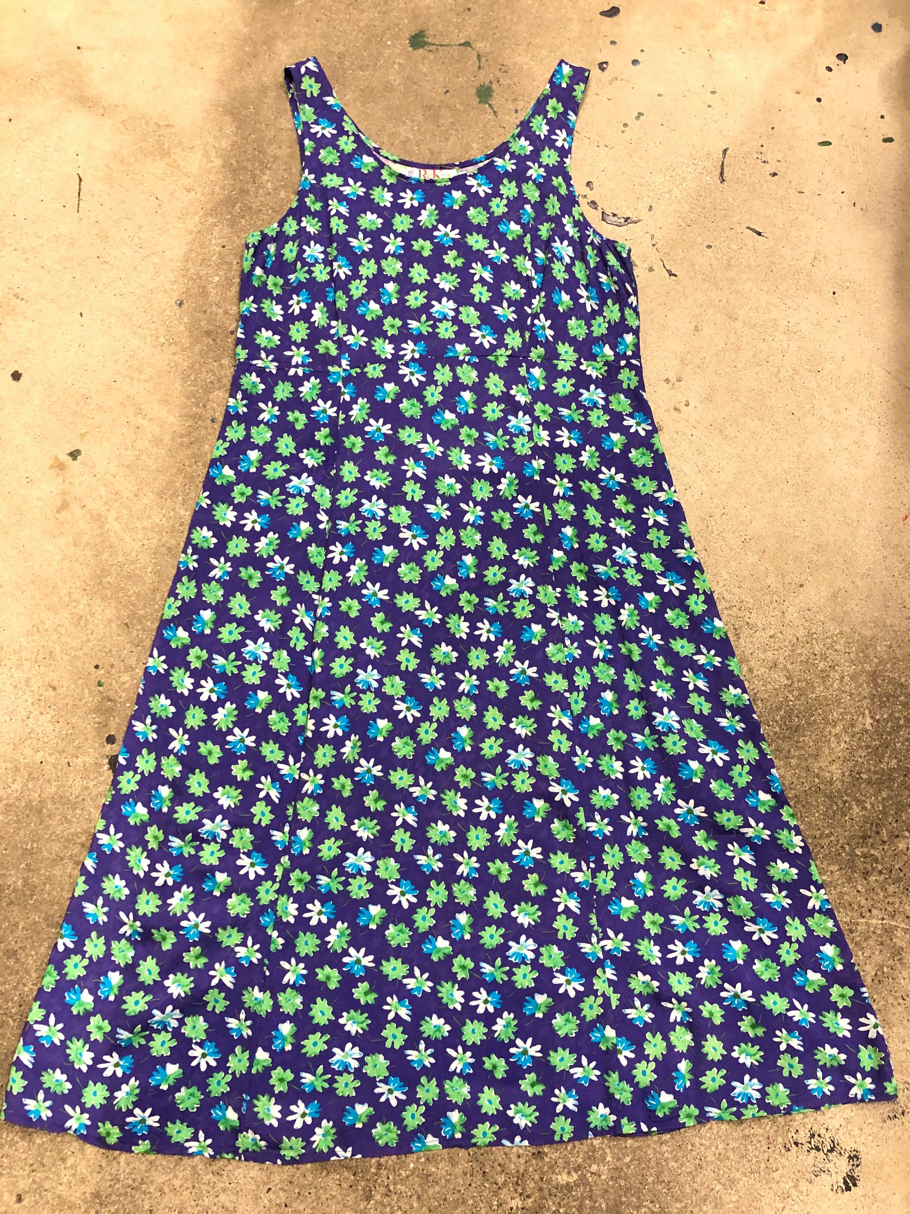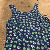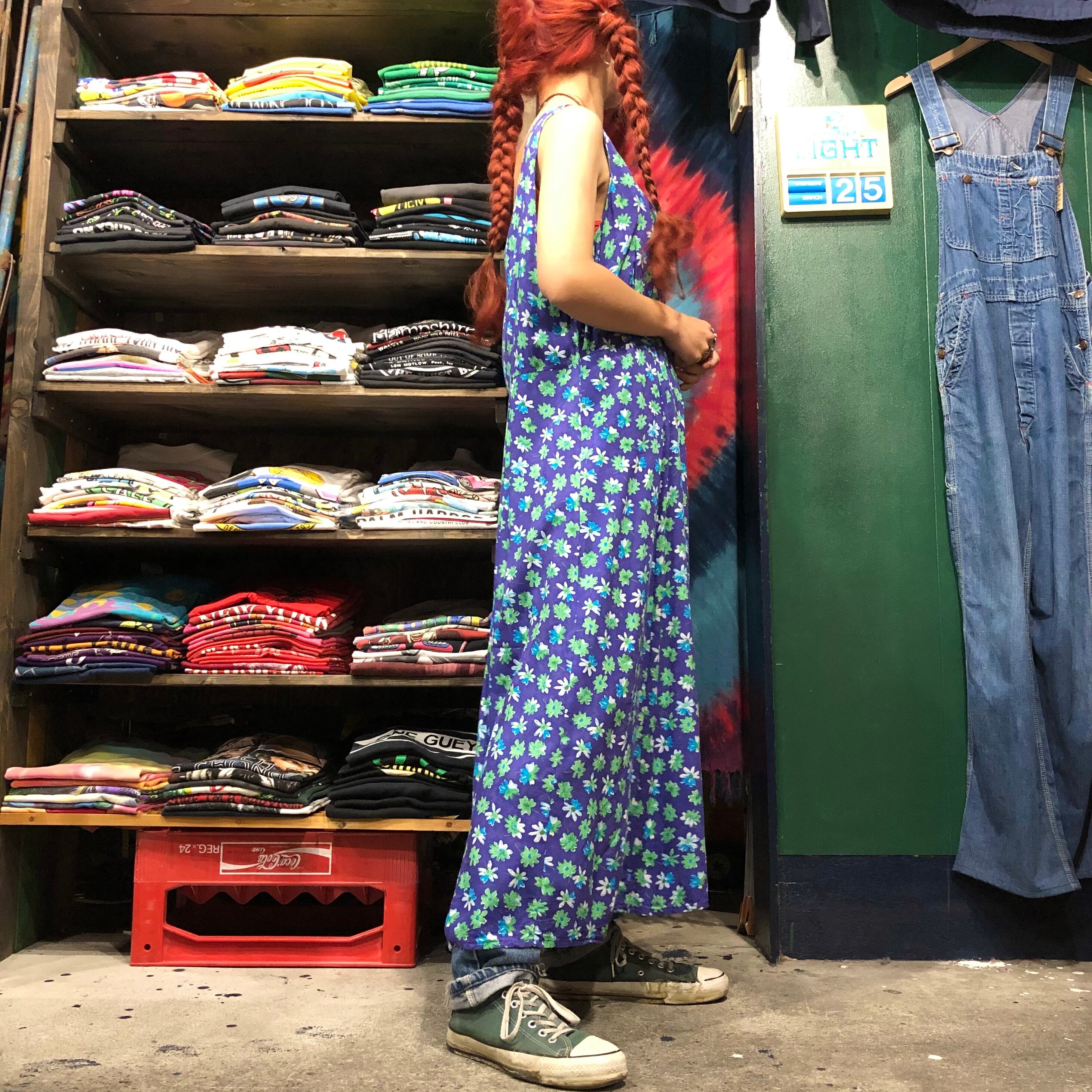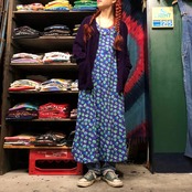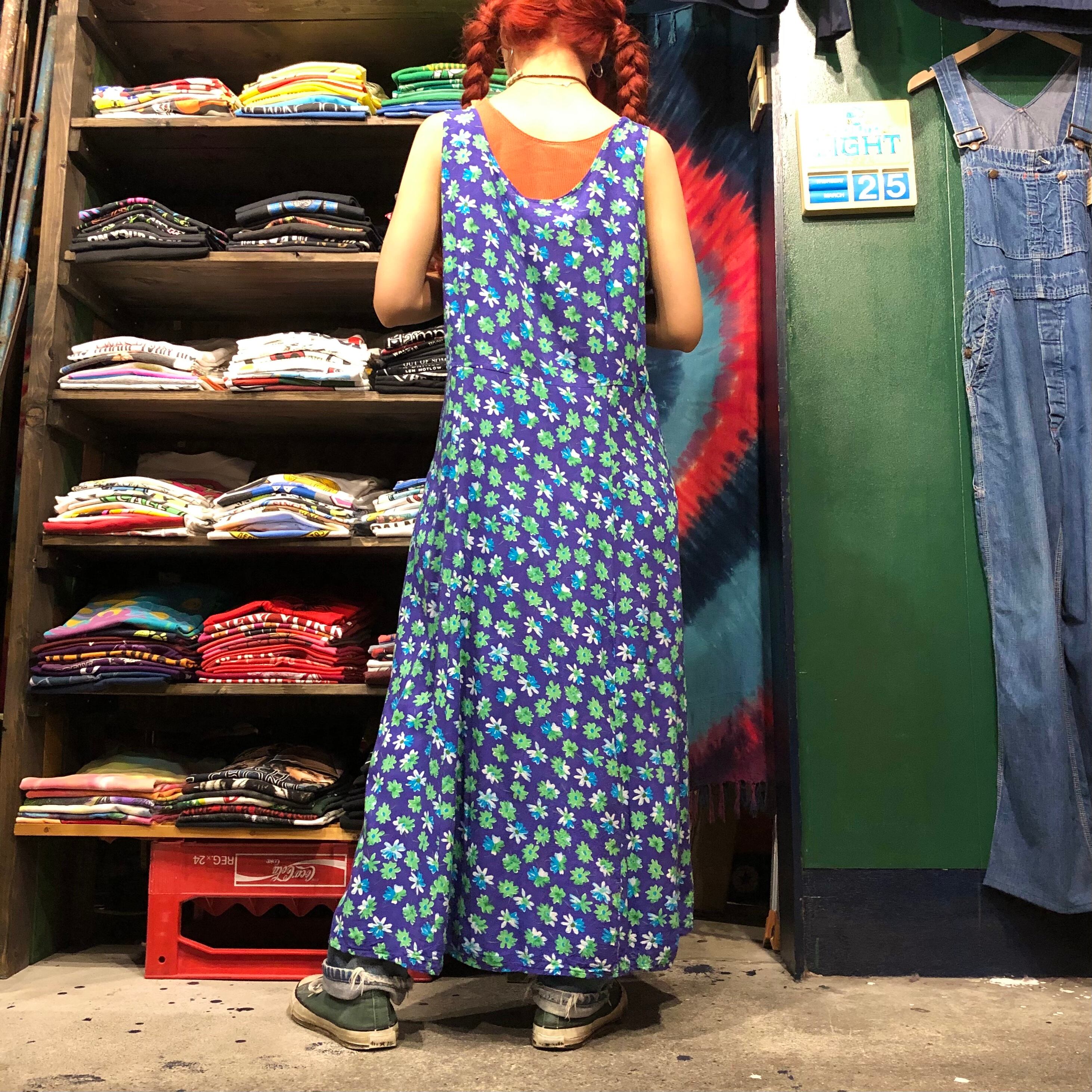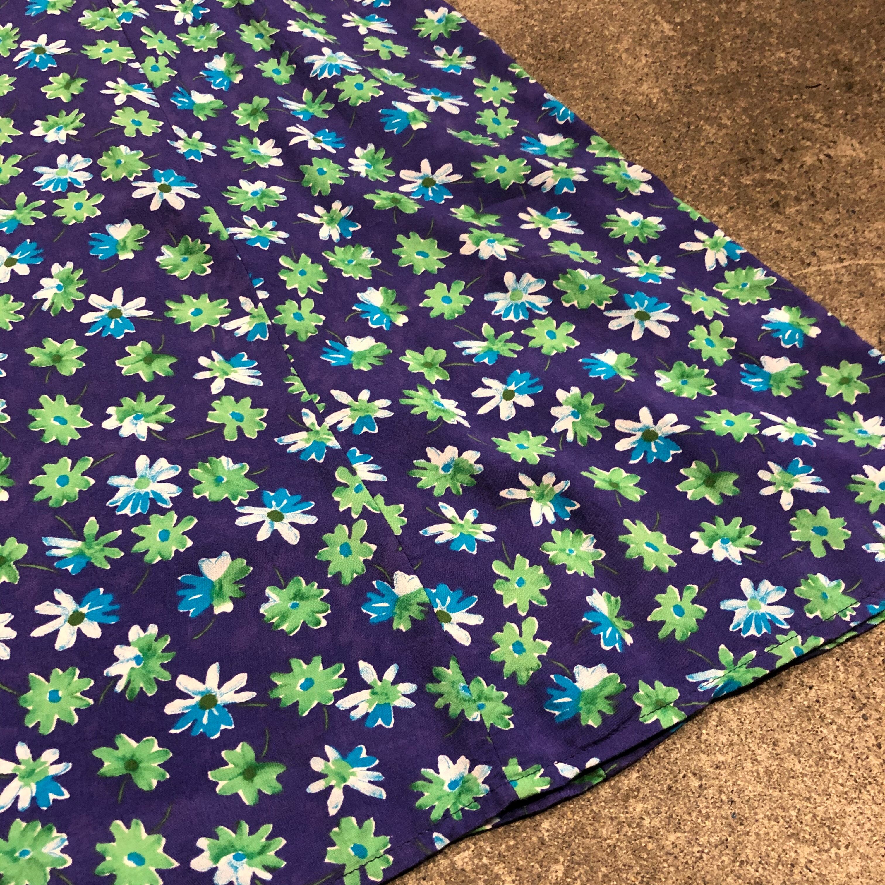 紫地に緑や水色の花柄がかわいいワンピースです。水彩絵具で適当に書いたようなラフな感じが良いですね。