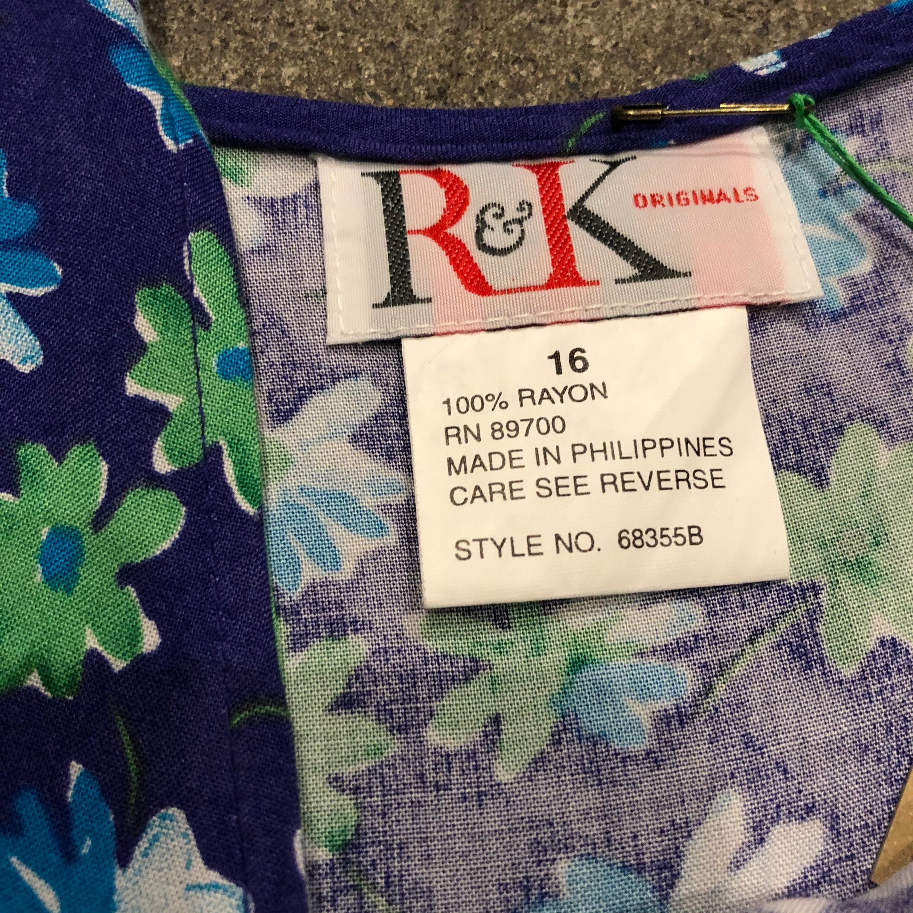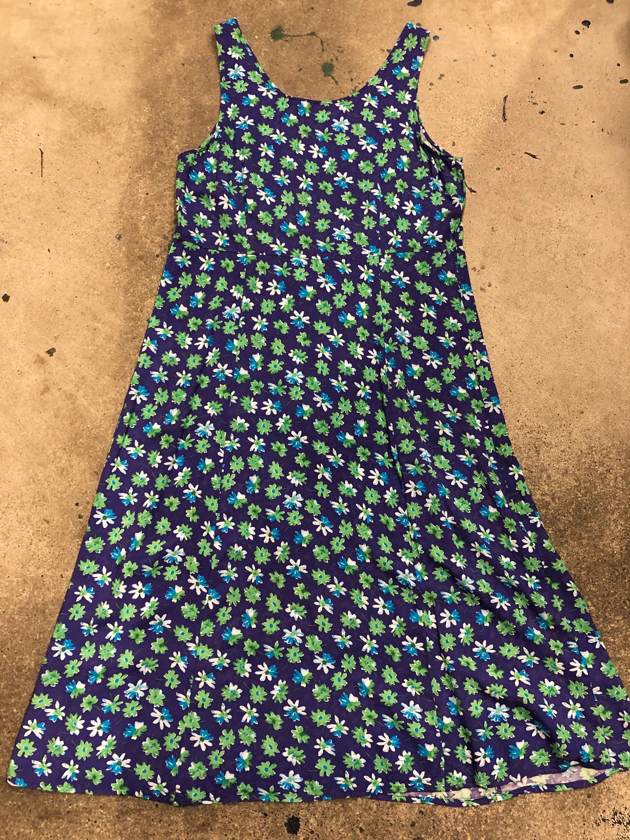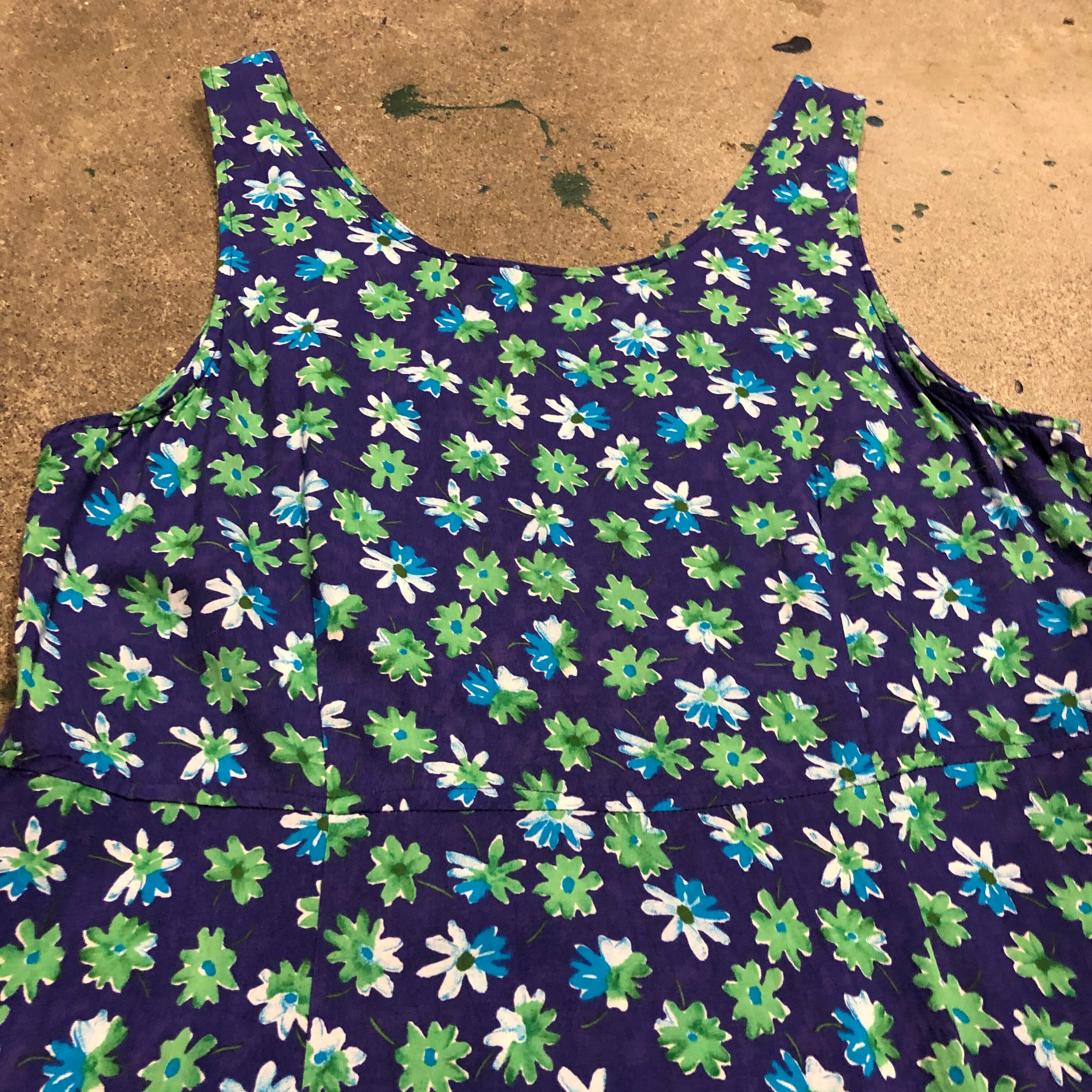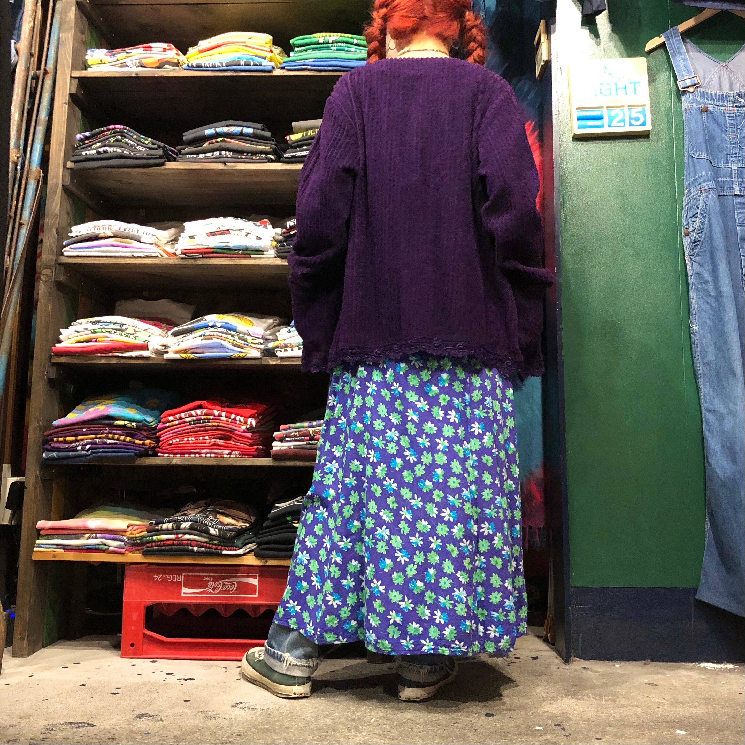 紫地に緑や水色の花柄がかわいいワンピースです。水彩絵具で適当に書いたようなラフな感じが良いですね。