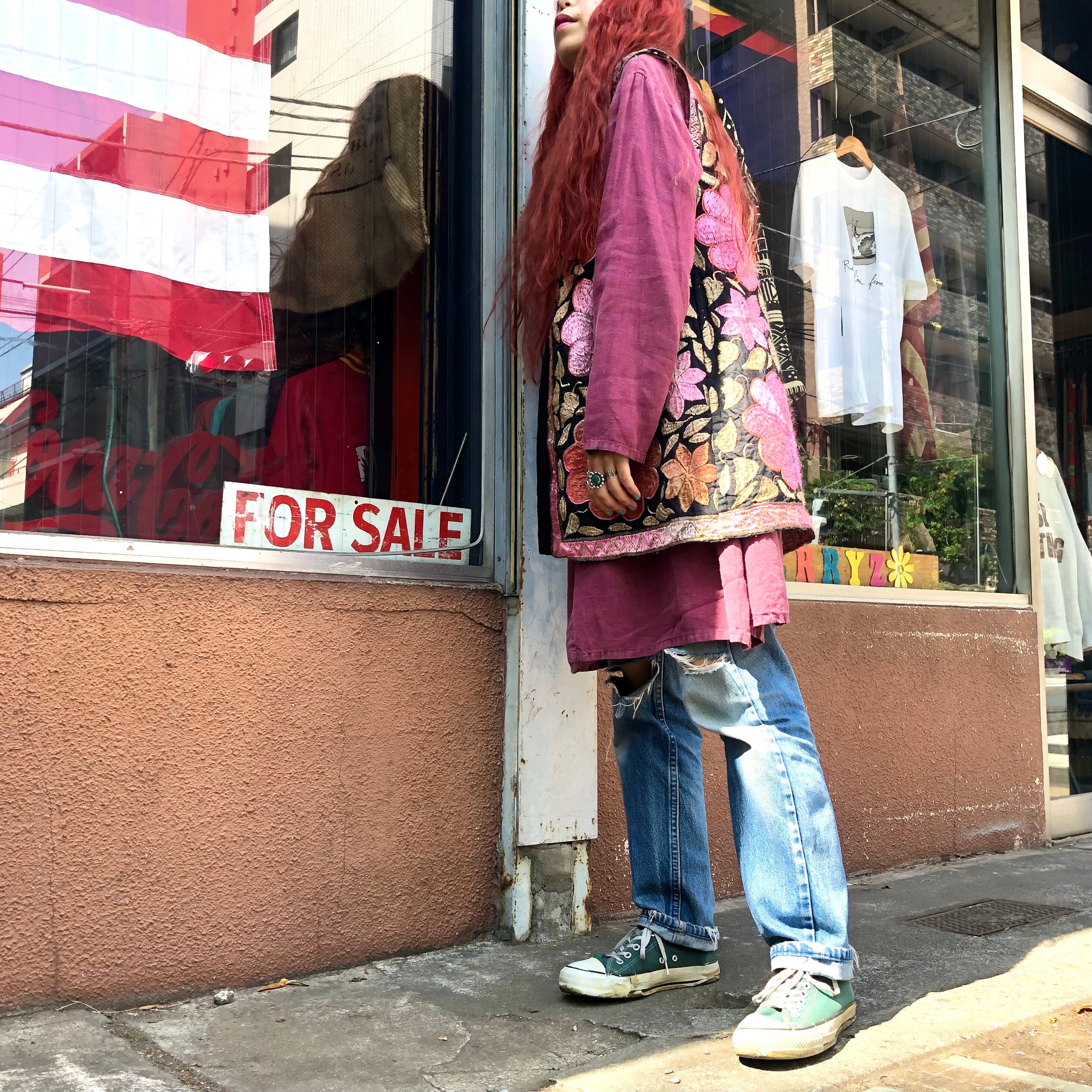 前左側全体的な日焼けや、刺繍の糸の毛羽立ちやほつれなどダメージのある商品ですので古着にご理解のある方のご購入をお願い致します。