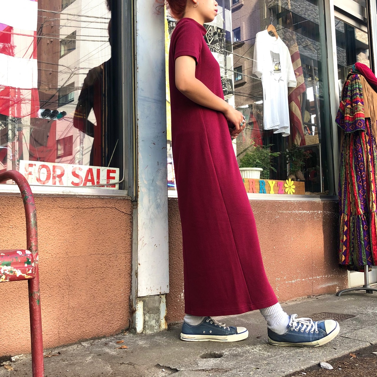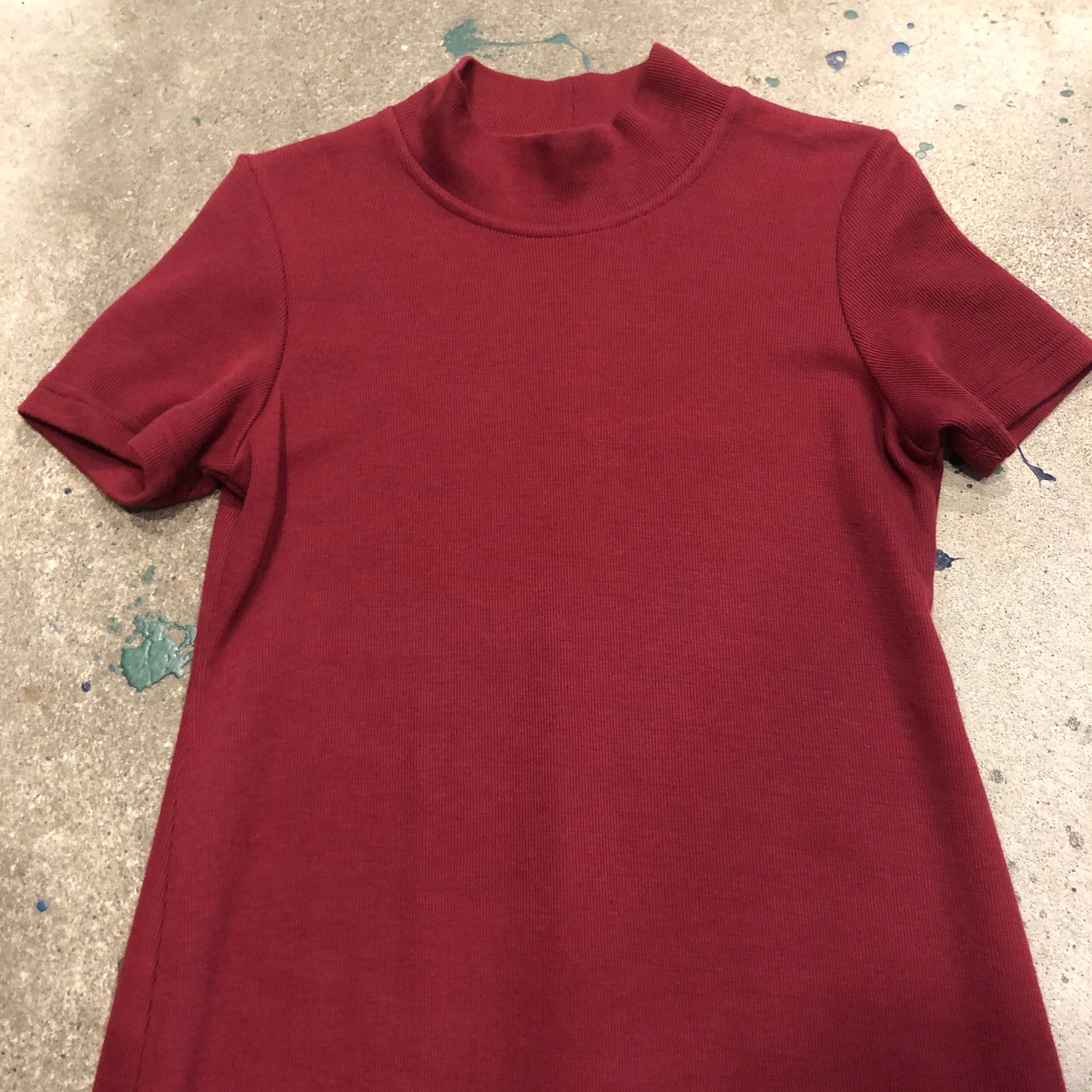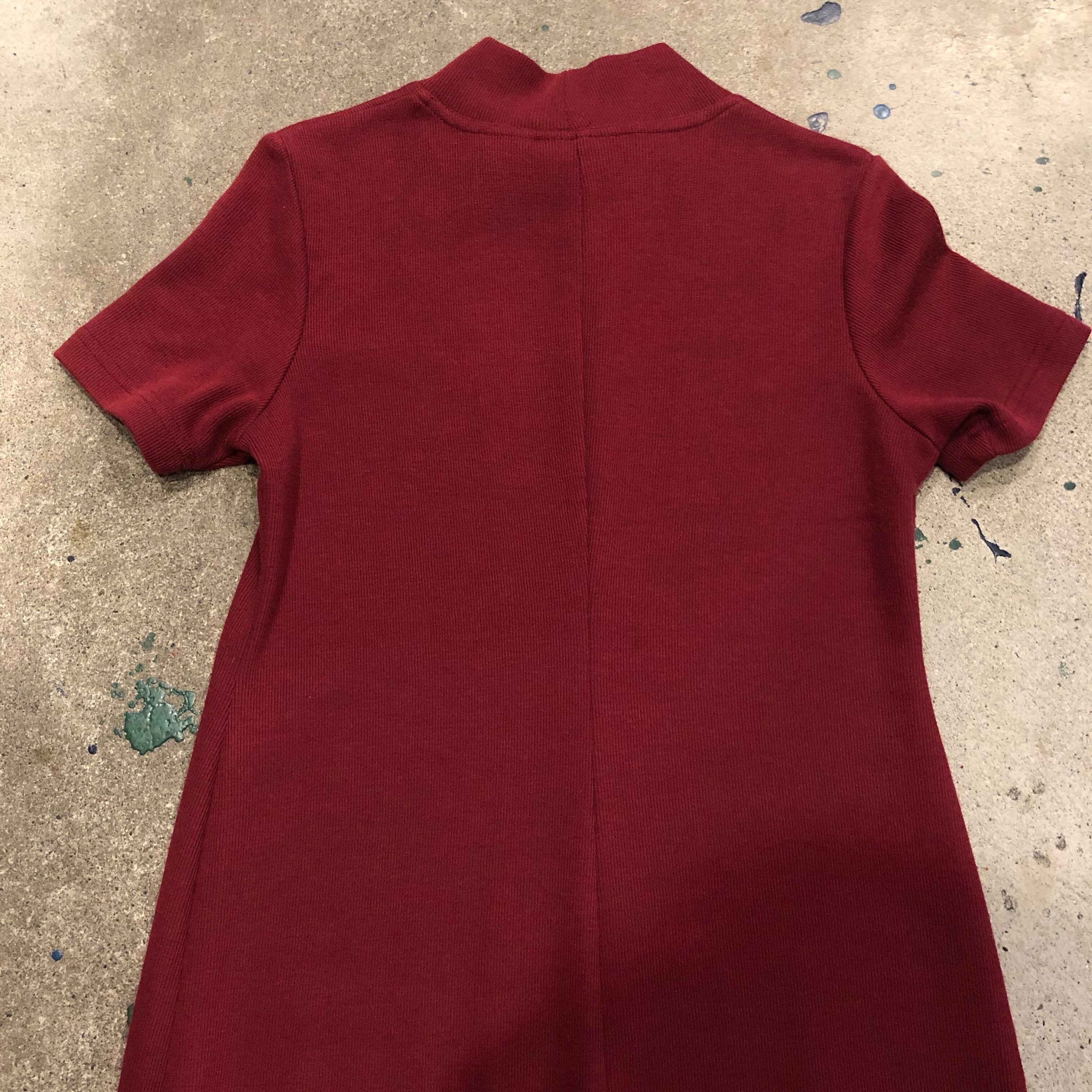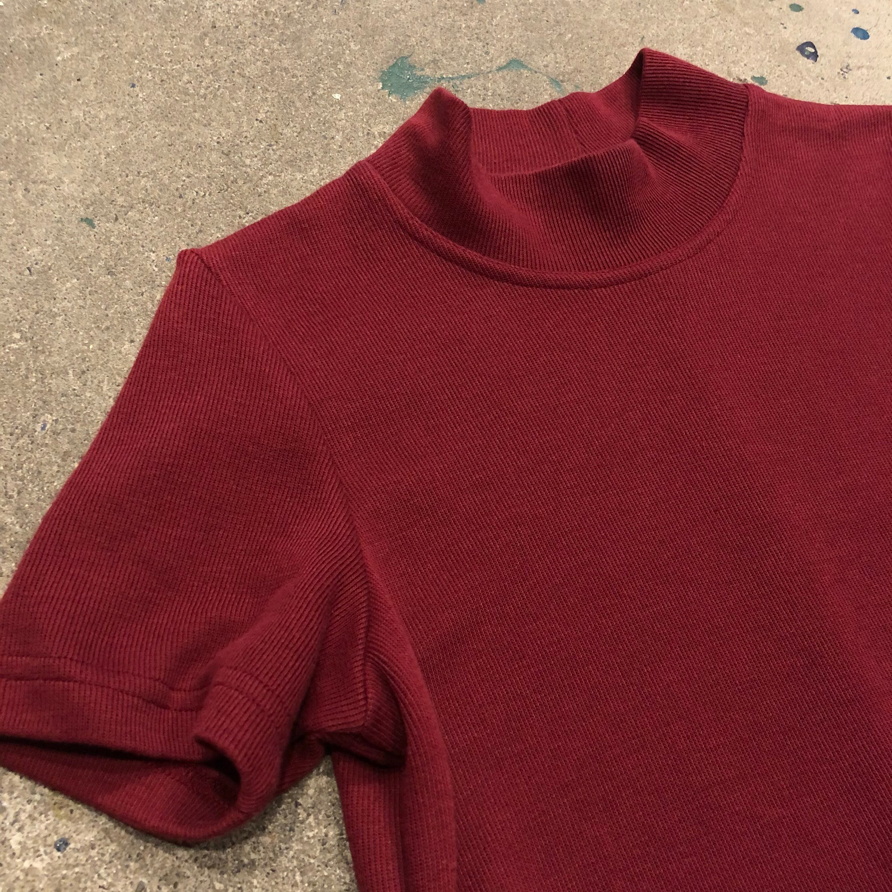全体がリブ編みのようになっていて伸縮性があります。コンパクトな袖とややハイネックな襟がポイントになっていて全体的にすっきり大人っぽいシルエットです。ゆったりめなシャツを羽織ったり、パンツを重ねてもかわいいと思います。
