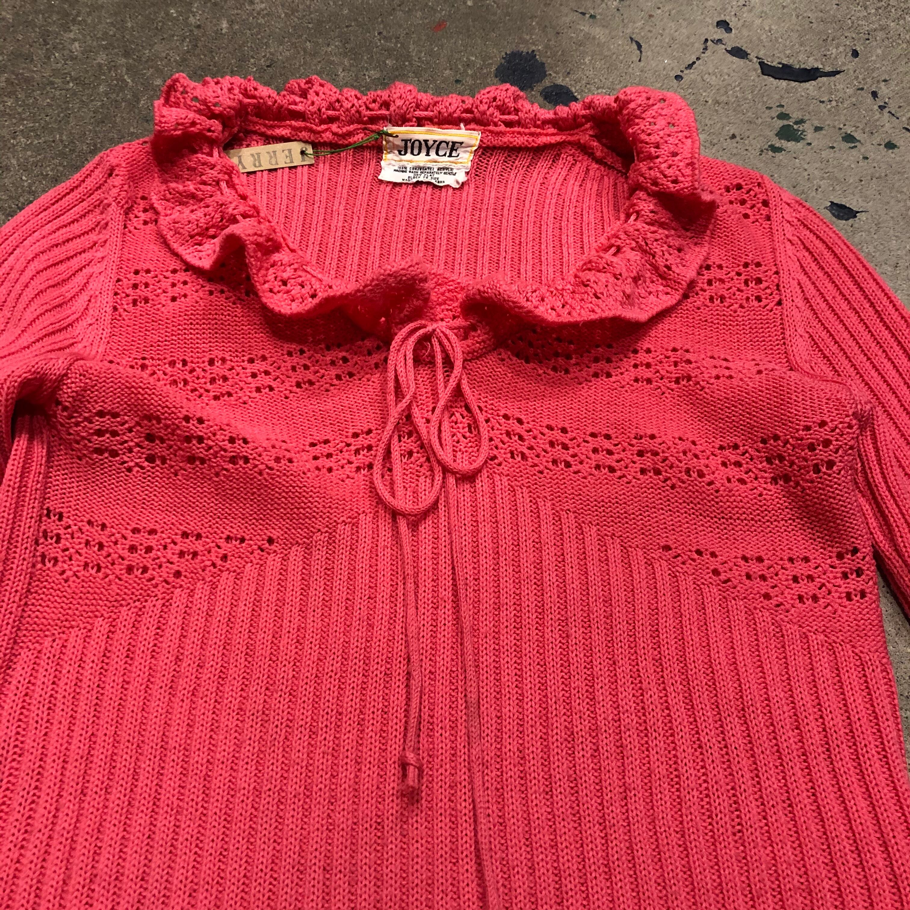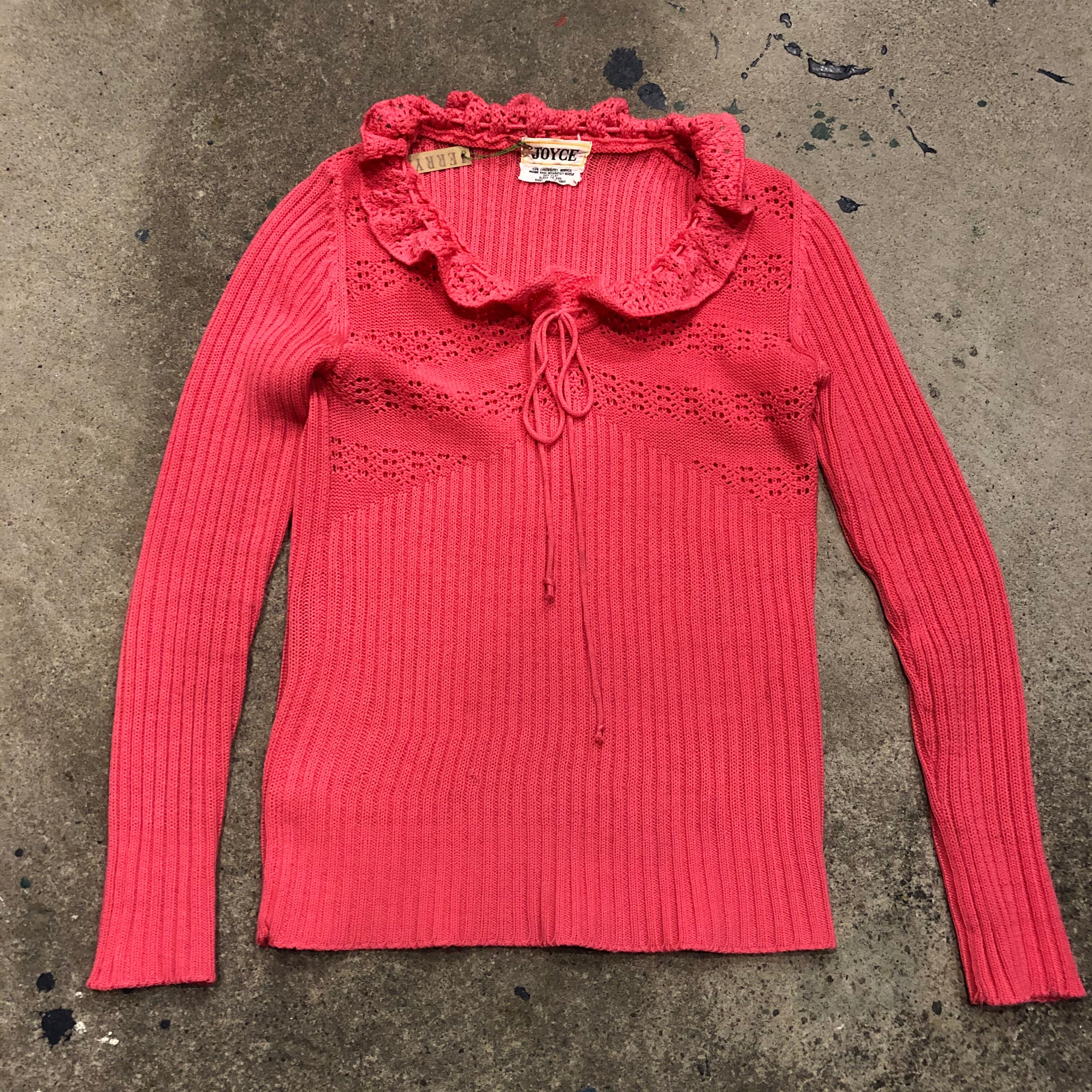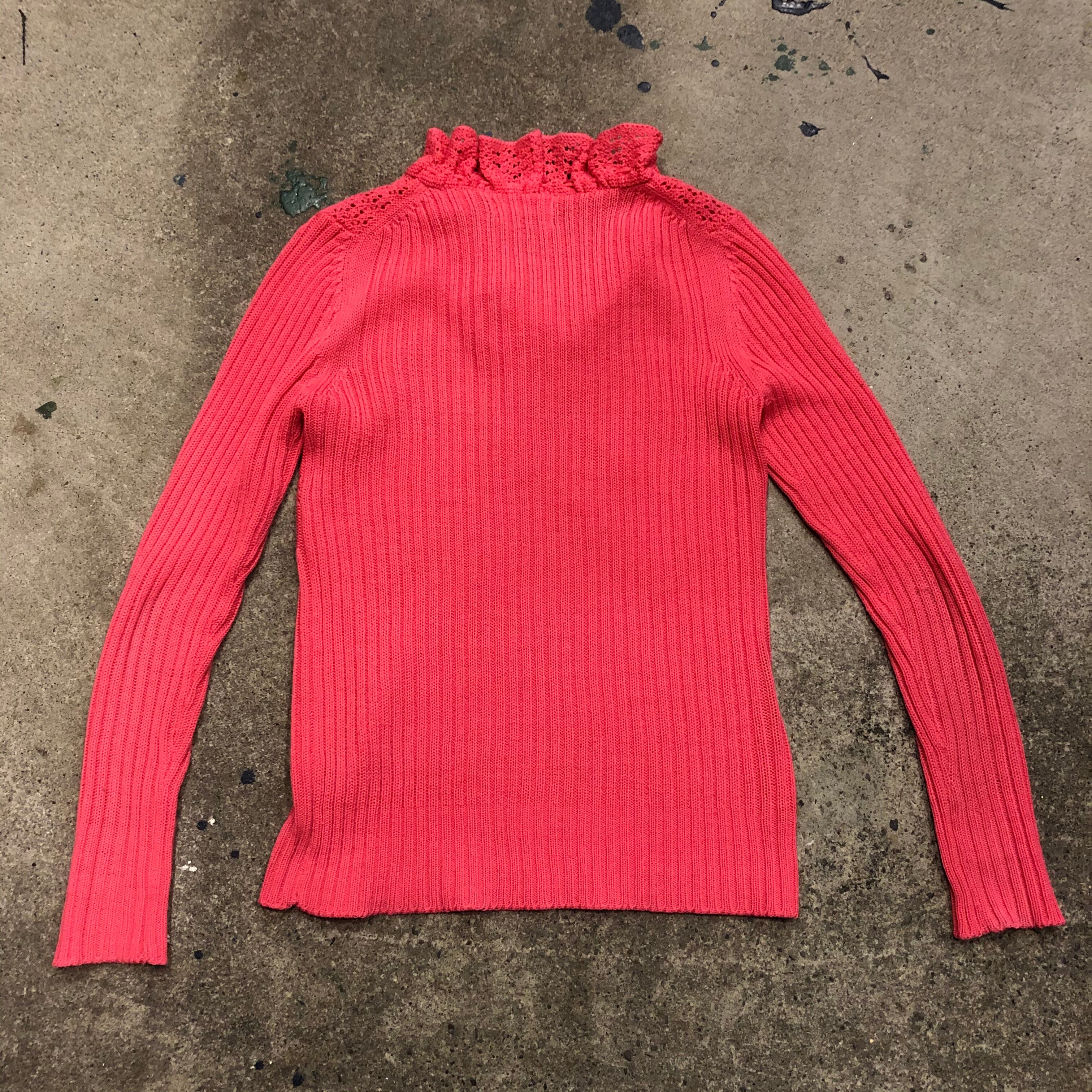 首元のフリルがかわいいアクリル素材の薄手のニットです。