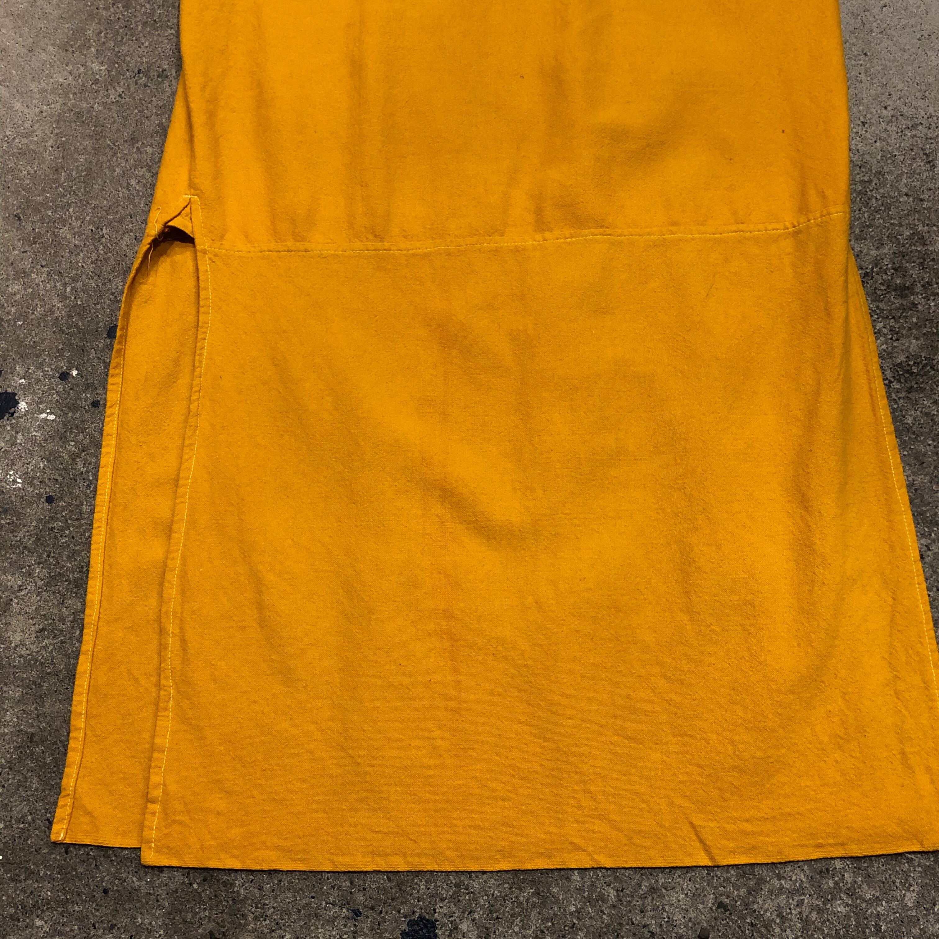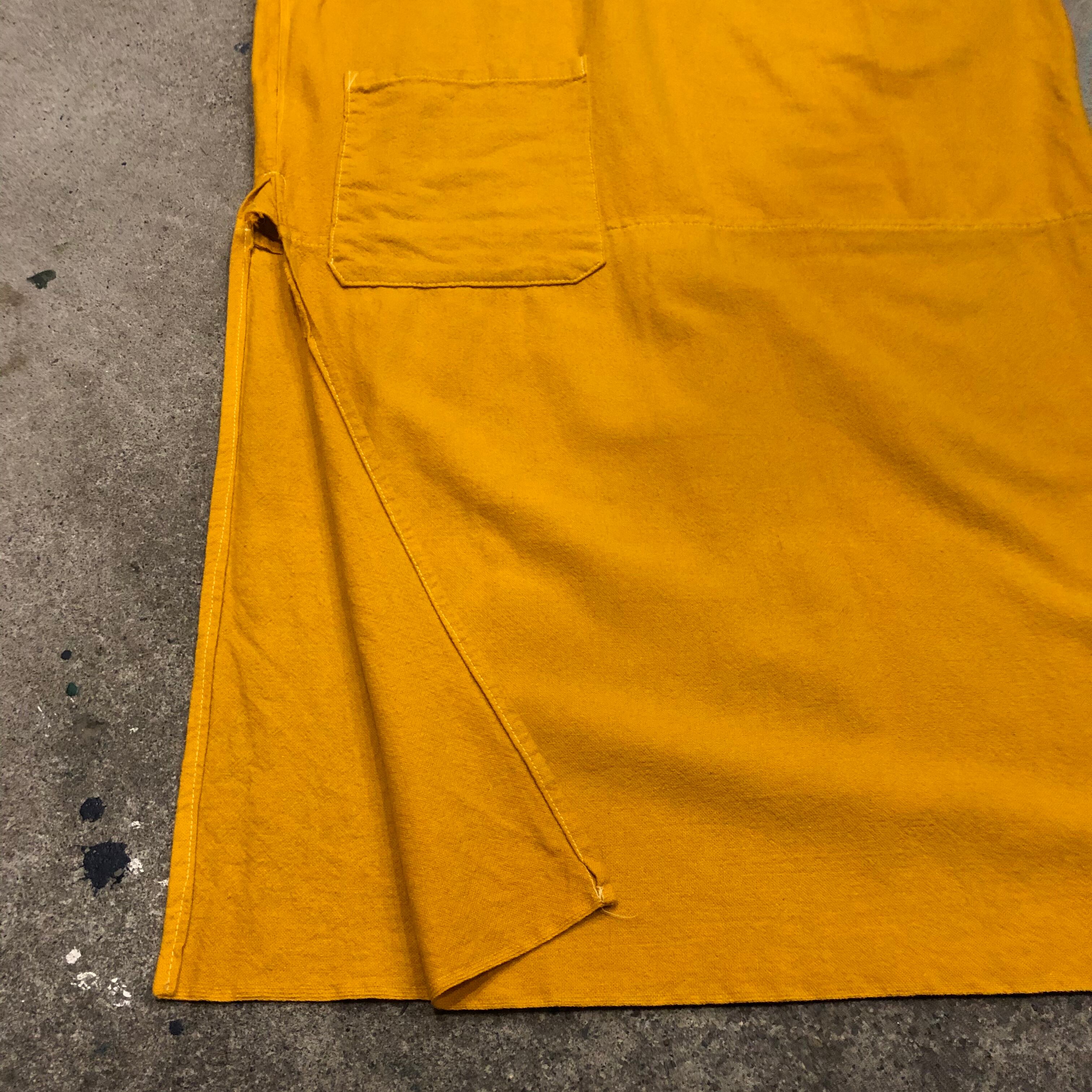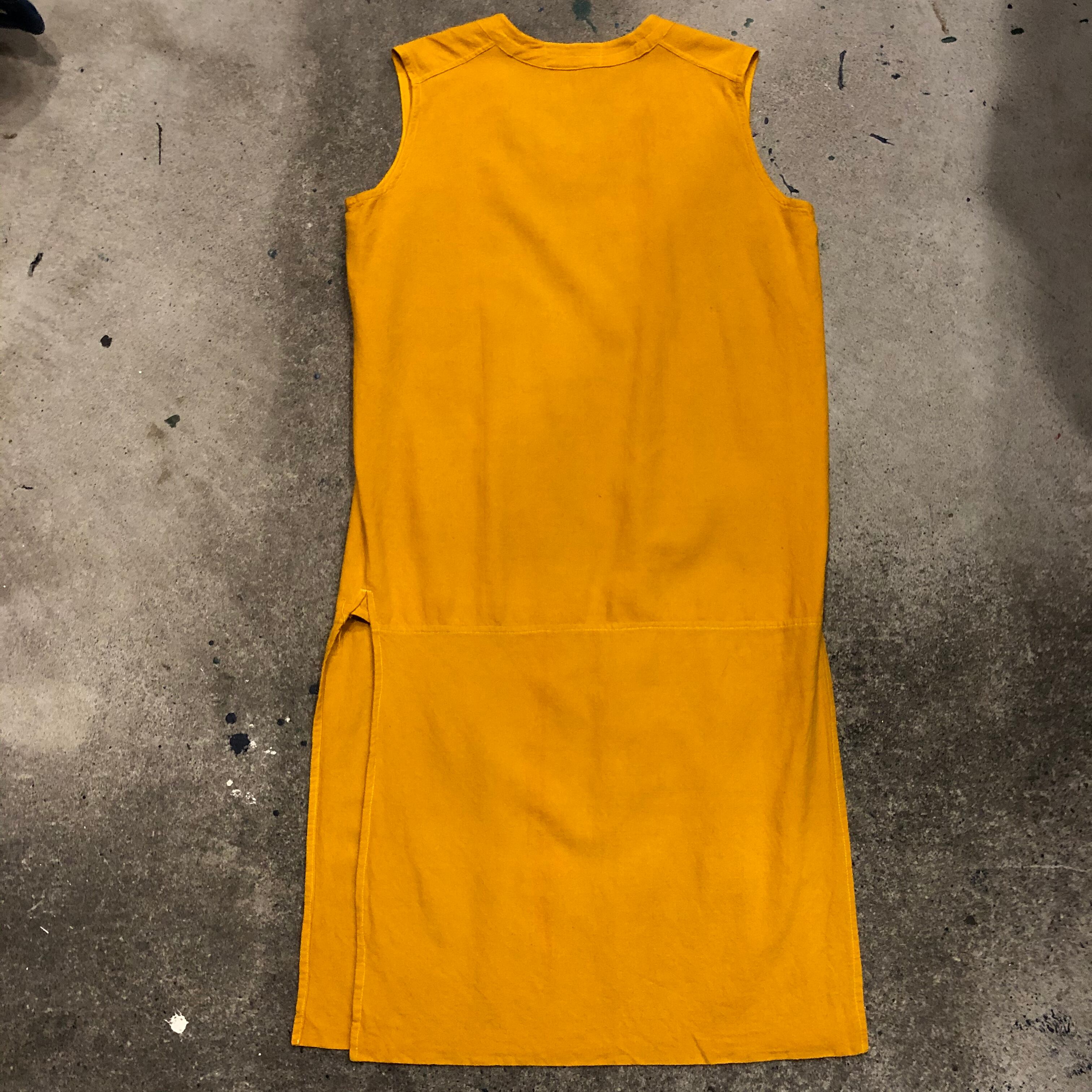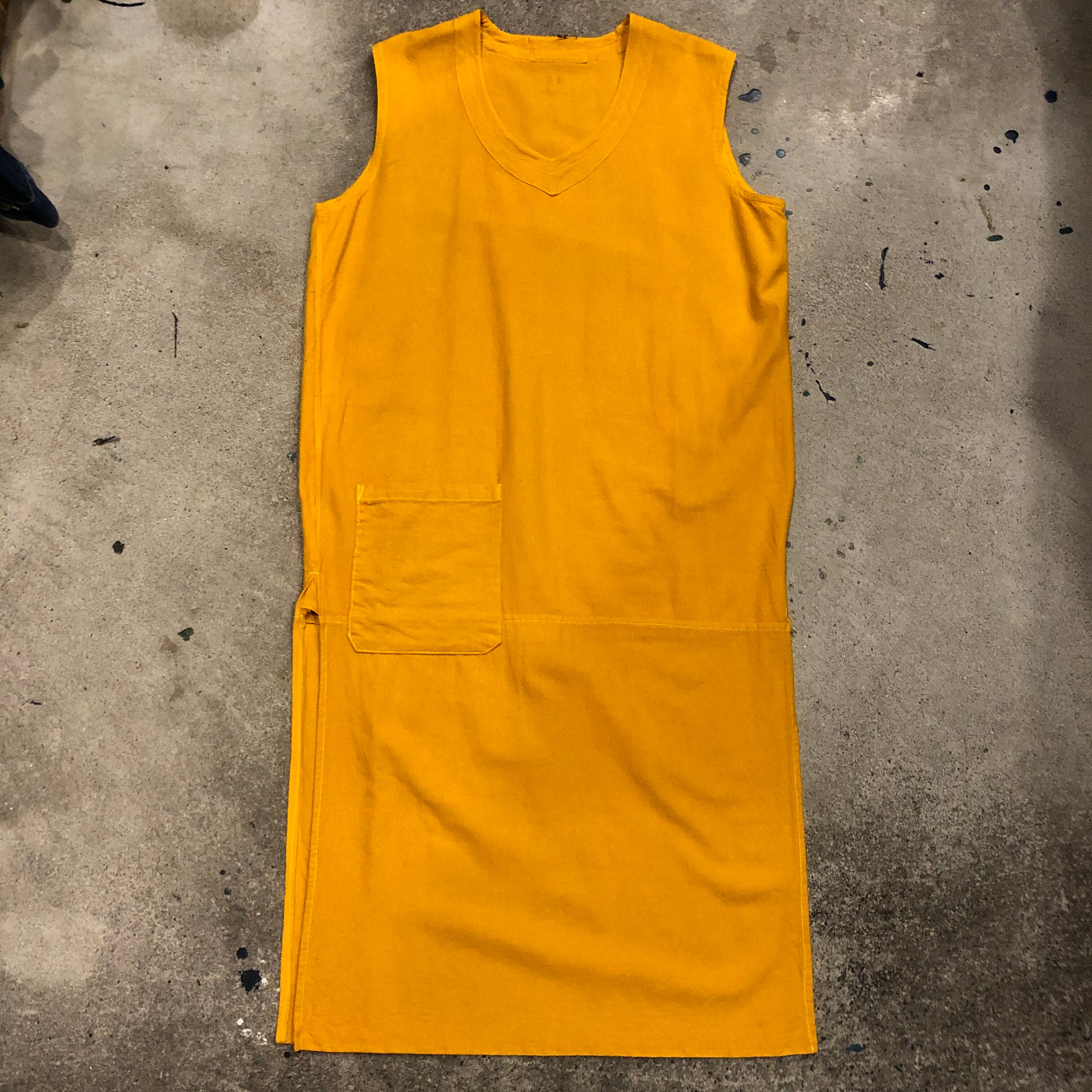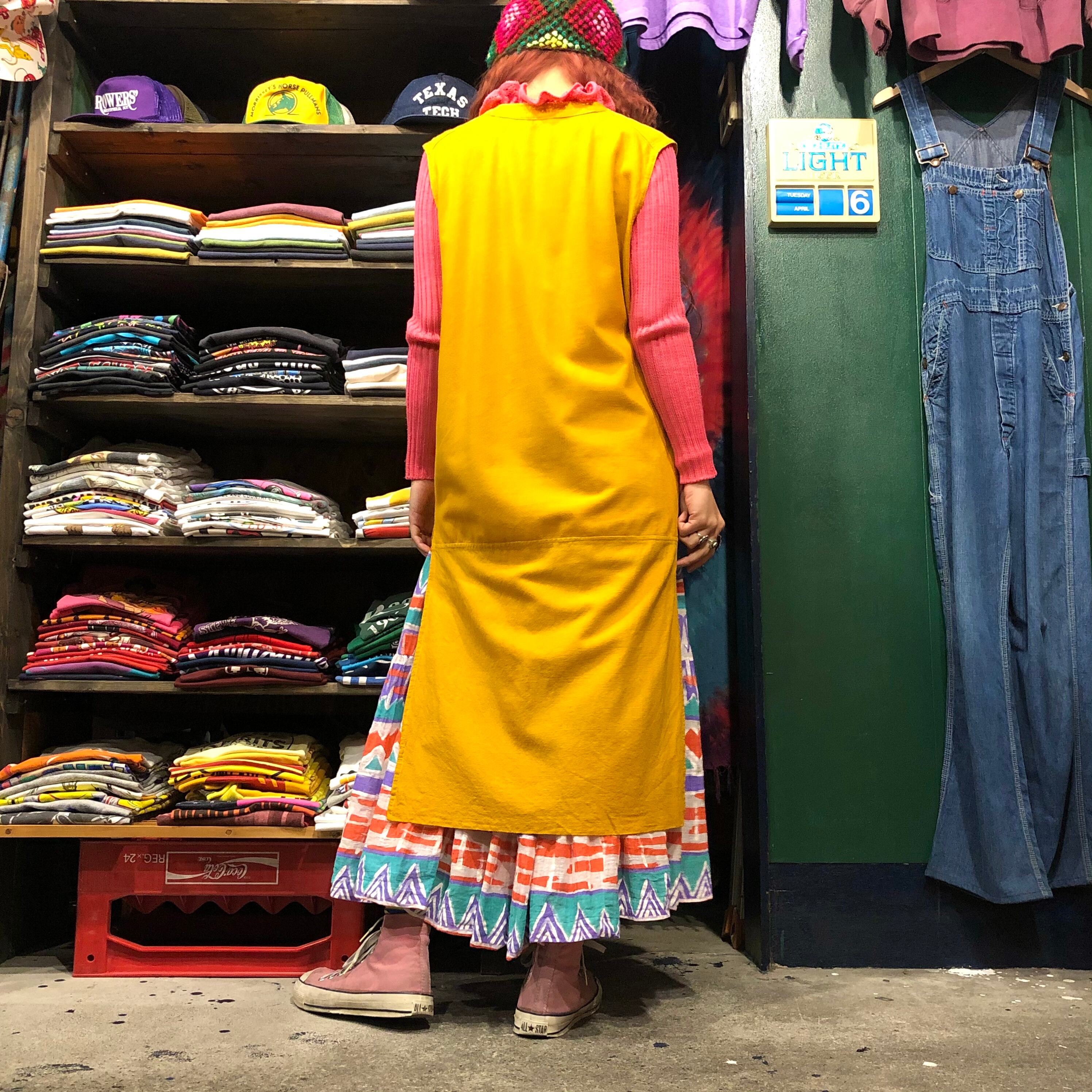 エプロンのような雰囲気がかわいい。落ち着いたカラシ色のノースリーブワンピースです。