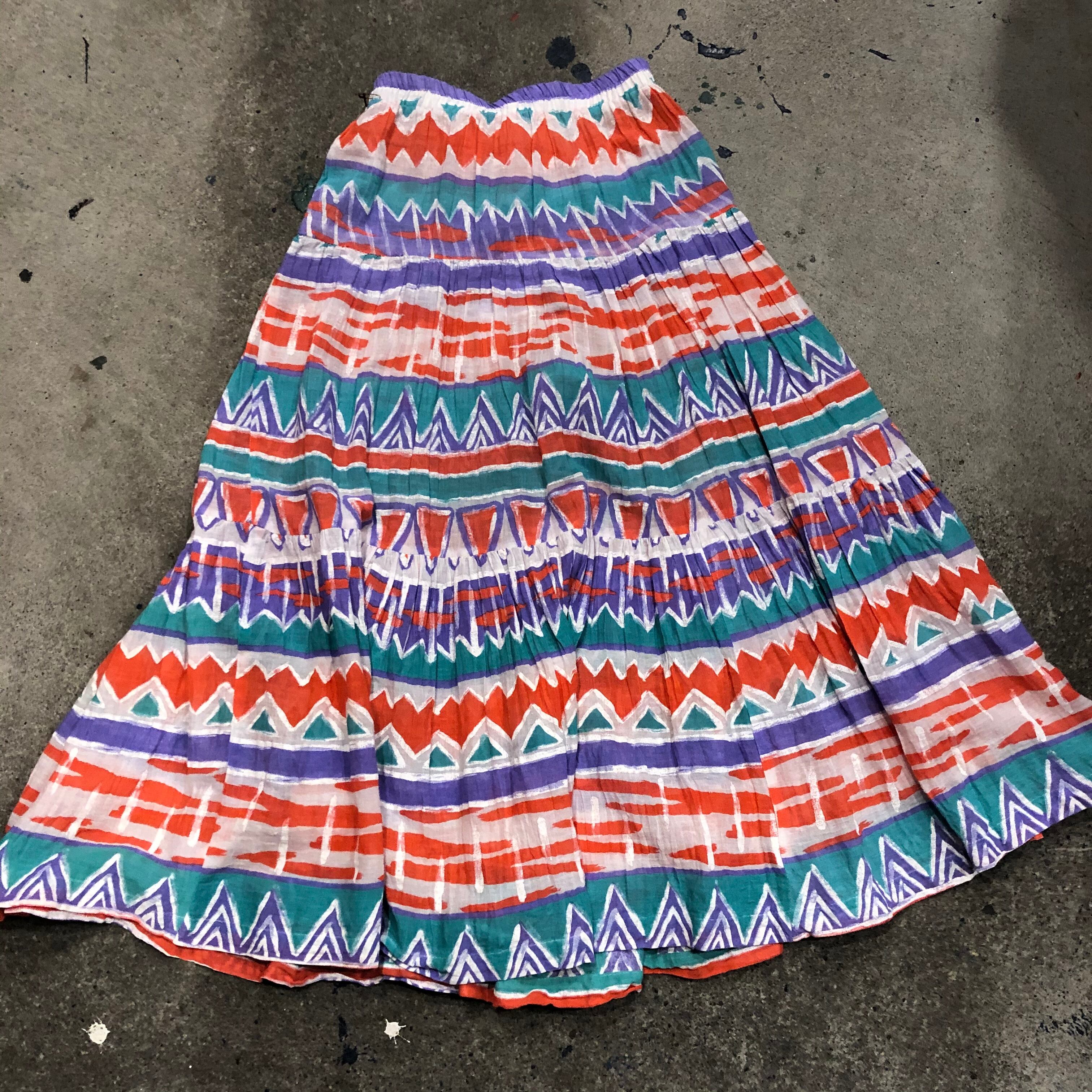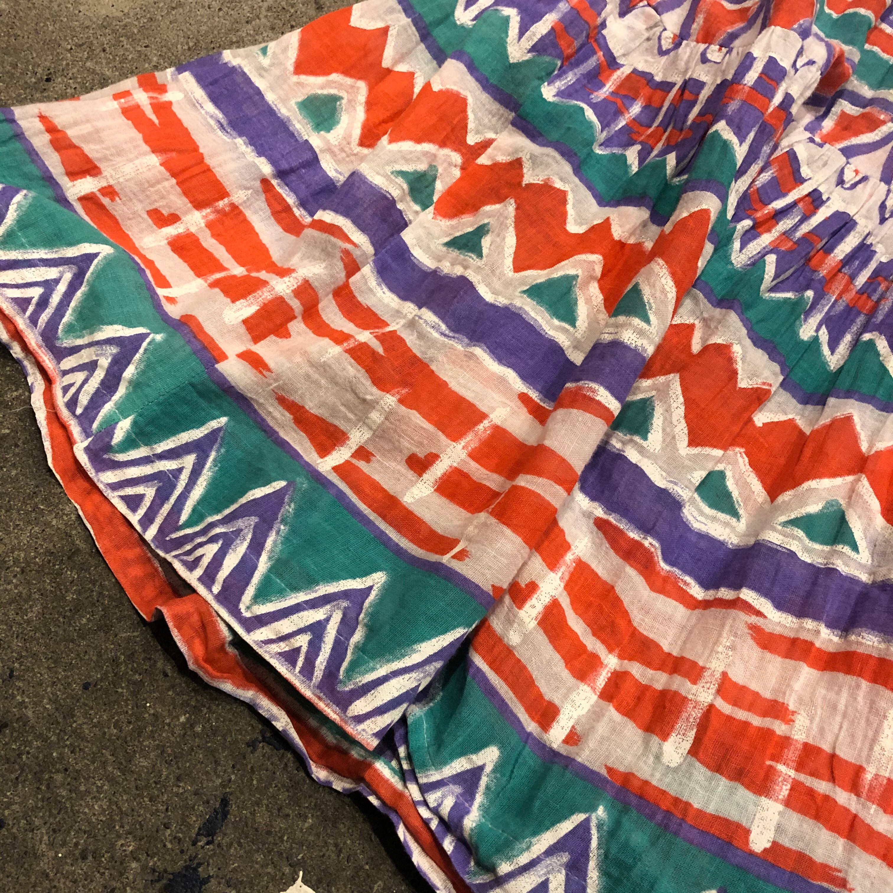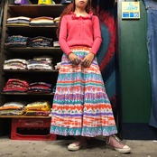 薄手のコットンガーゼのような素材にペイントしてある雰囲気です。透けますので重ね着をお楽しみ頂けると思います。ウエストゴムですので、胸上まで上げてワンピースのように着るのもかわいいですね!