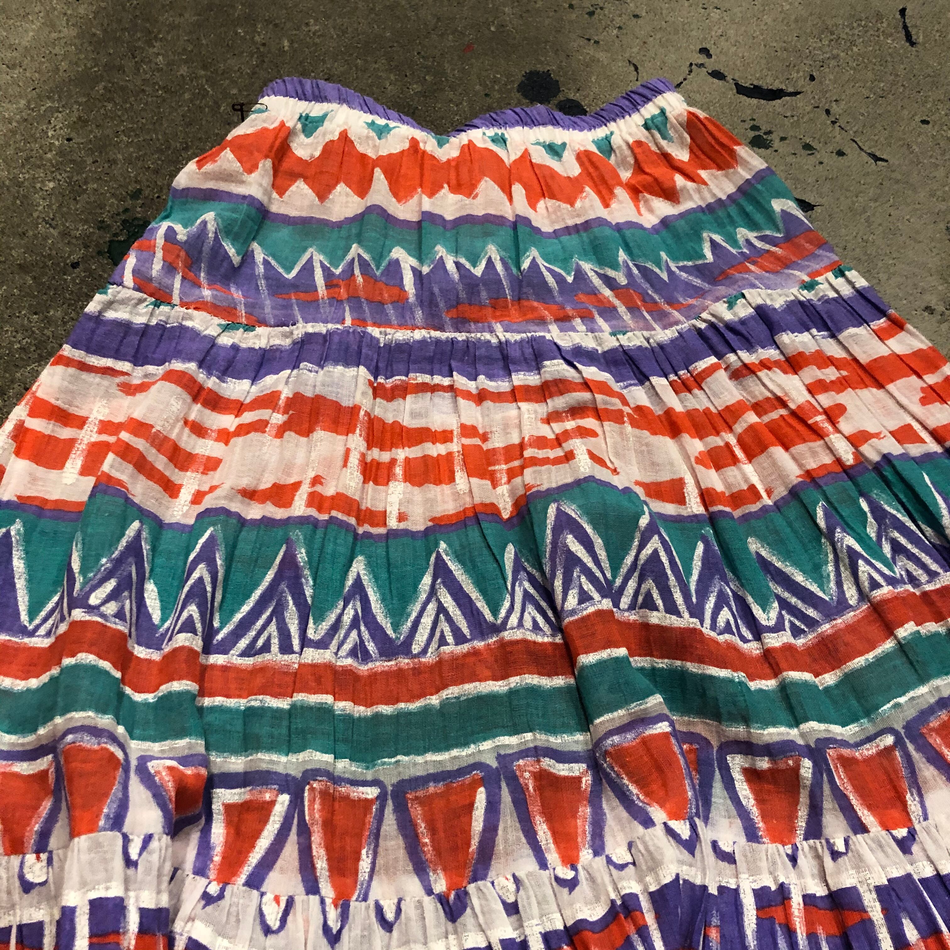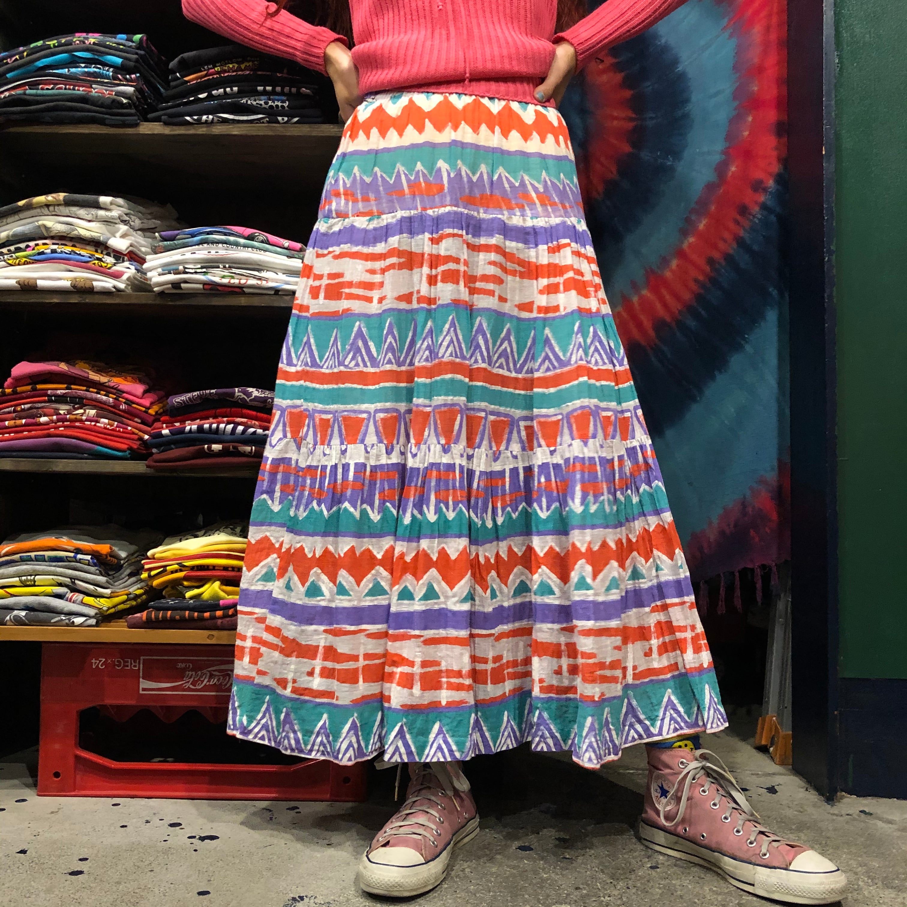 爽やかな色味の模様がかわいいフレアギャザースカートです。