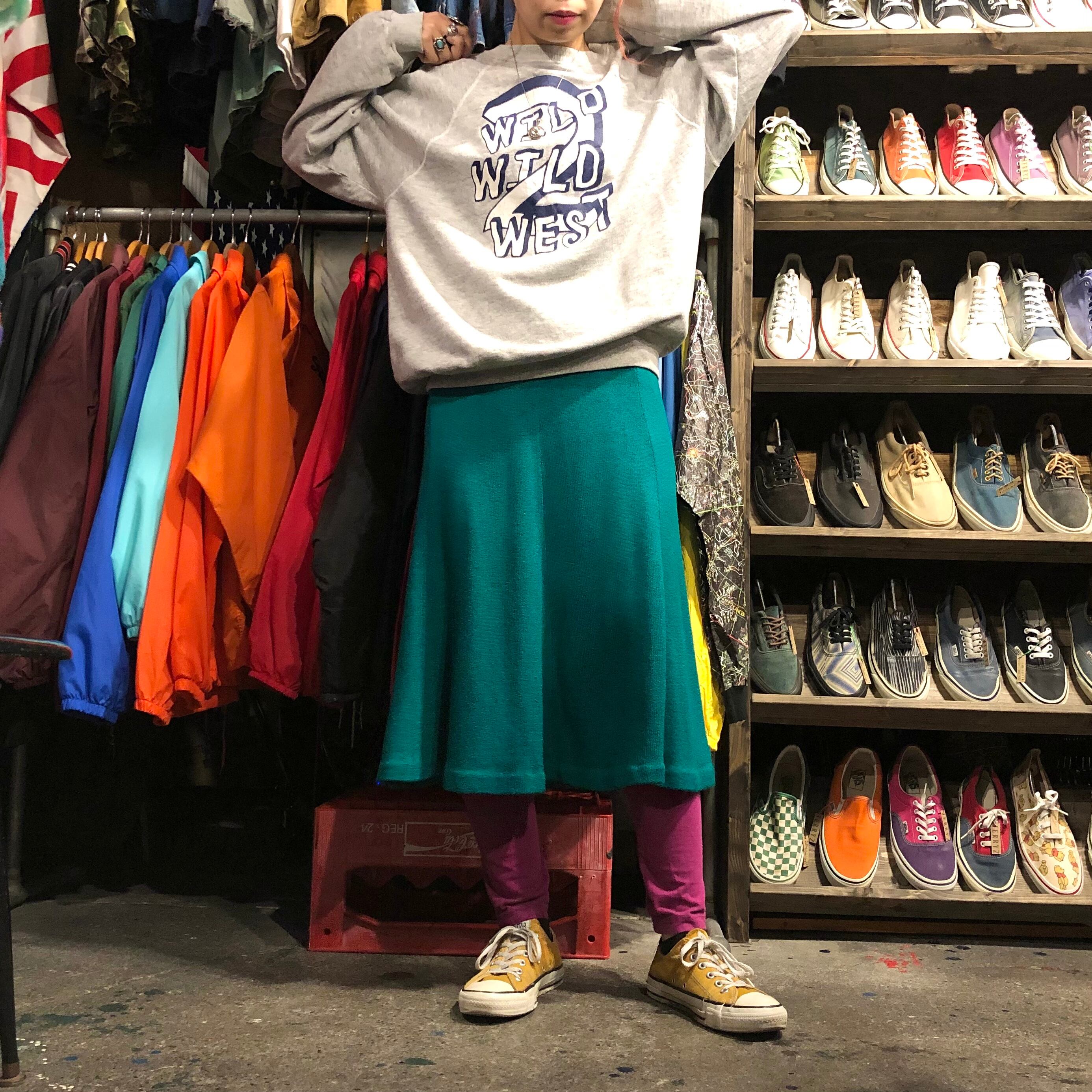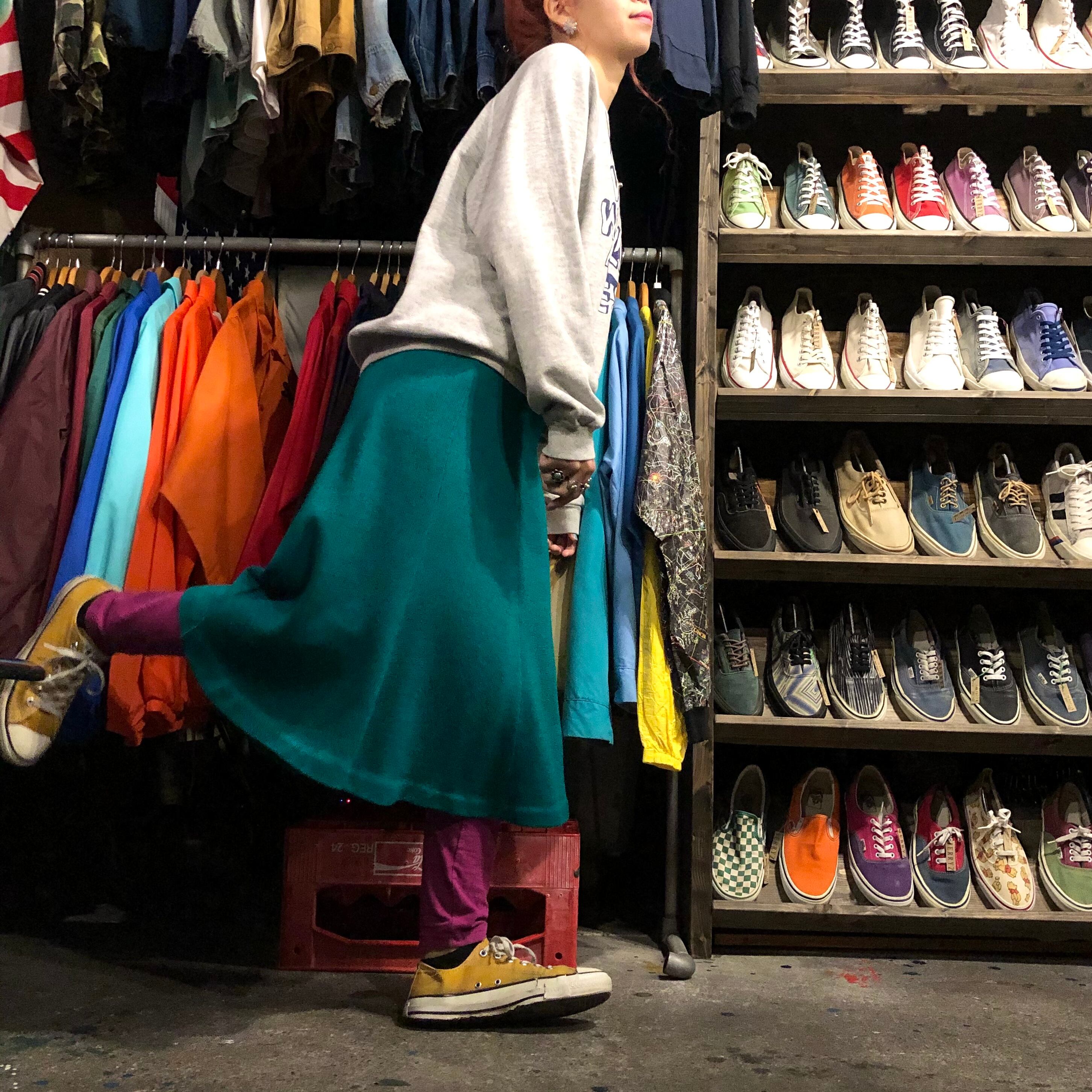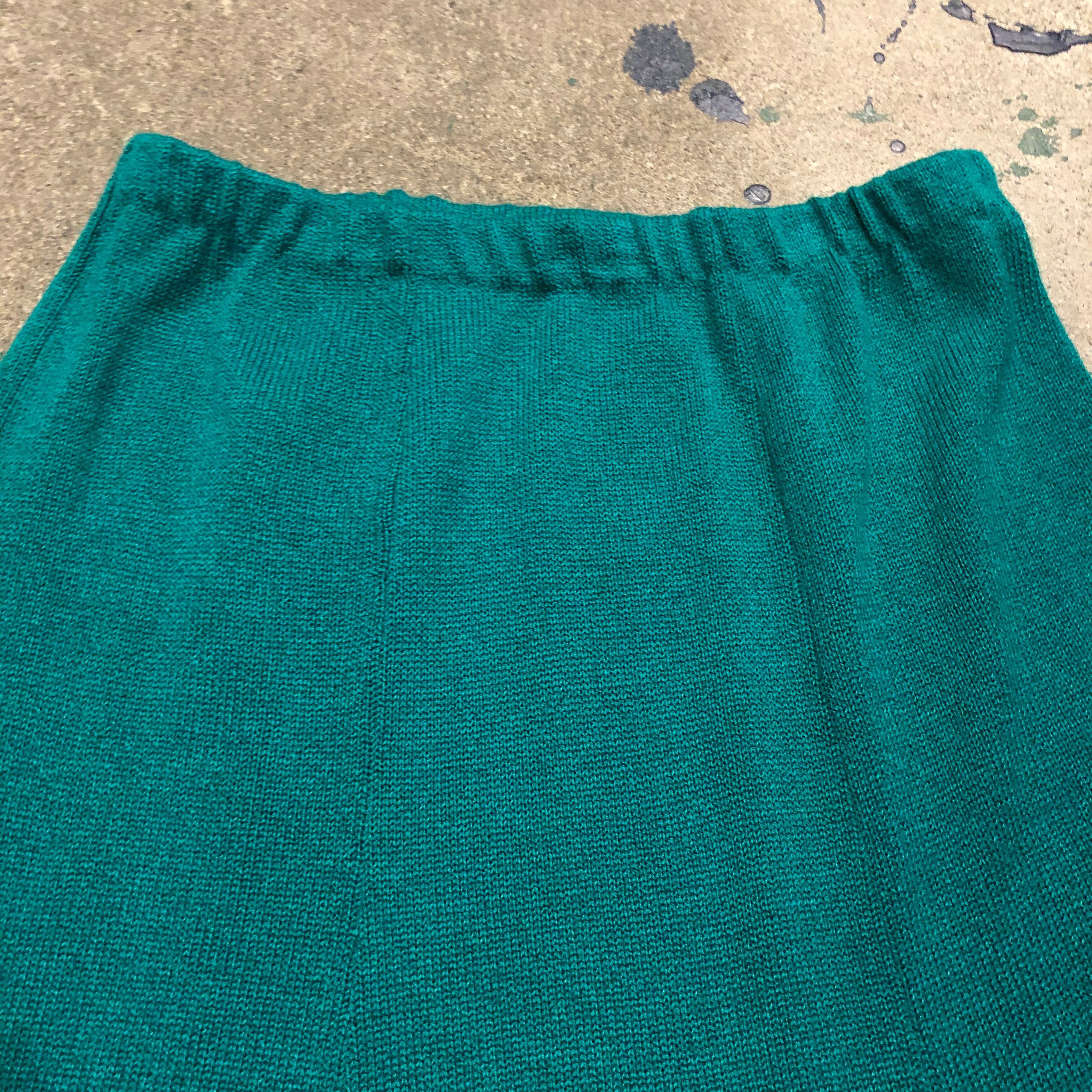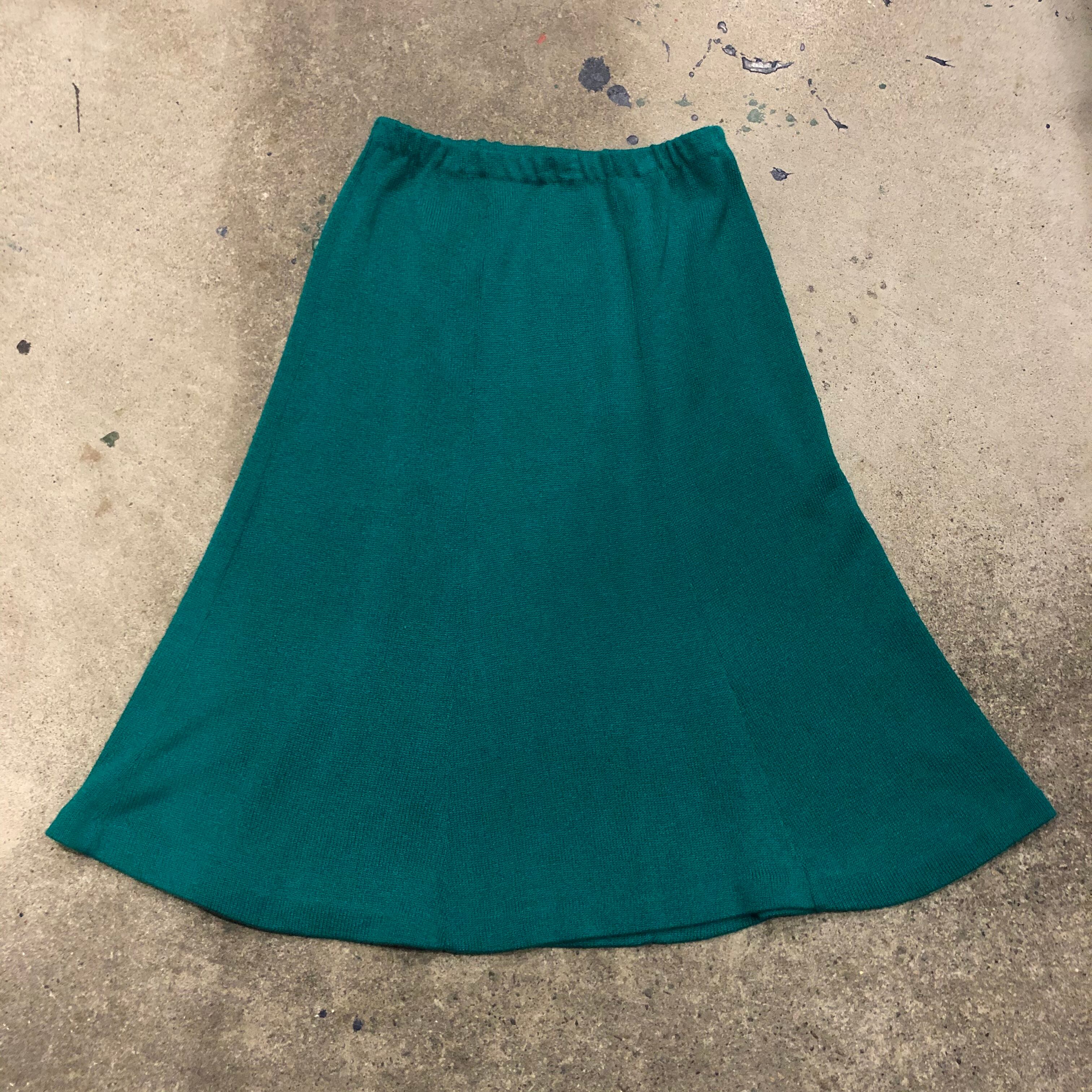 鮮やかな濃い緑色がかわいいニットスカートです。おそらくアクリルですが、さらっとしており着やすい素材感です。
