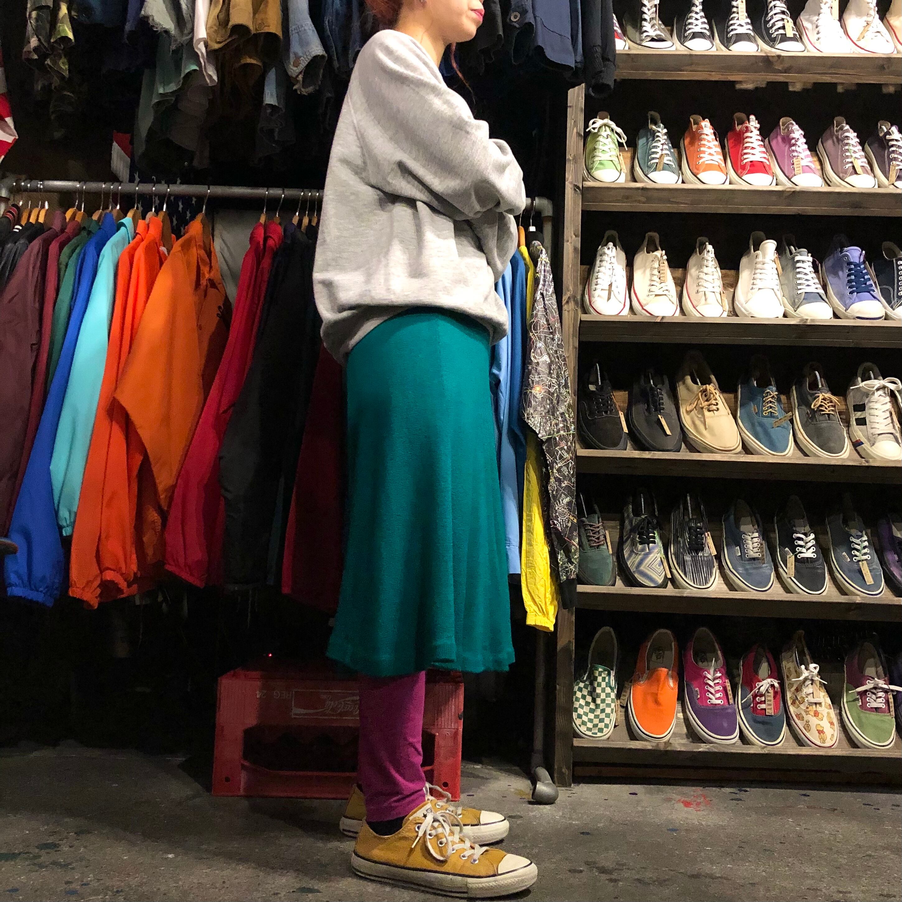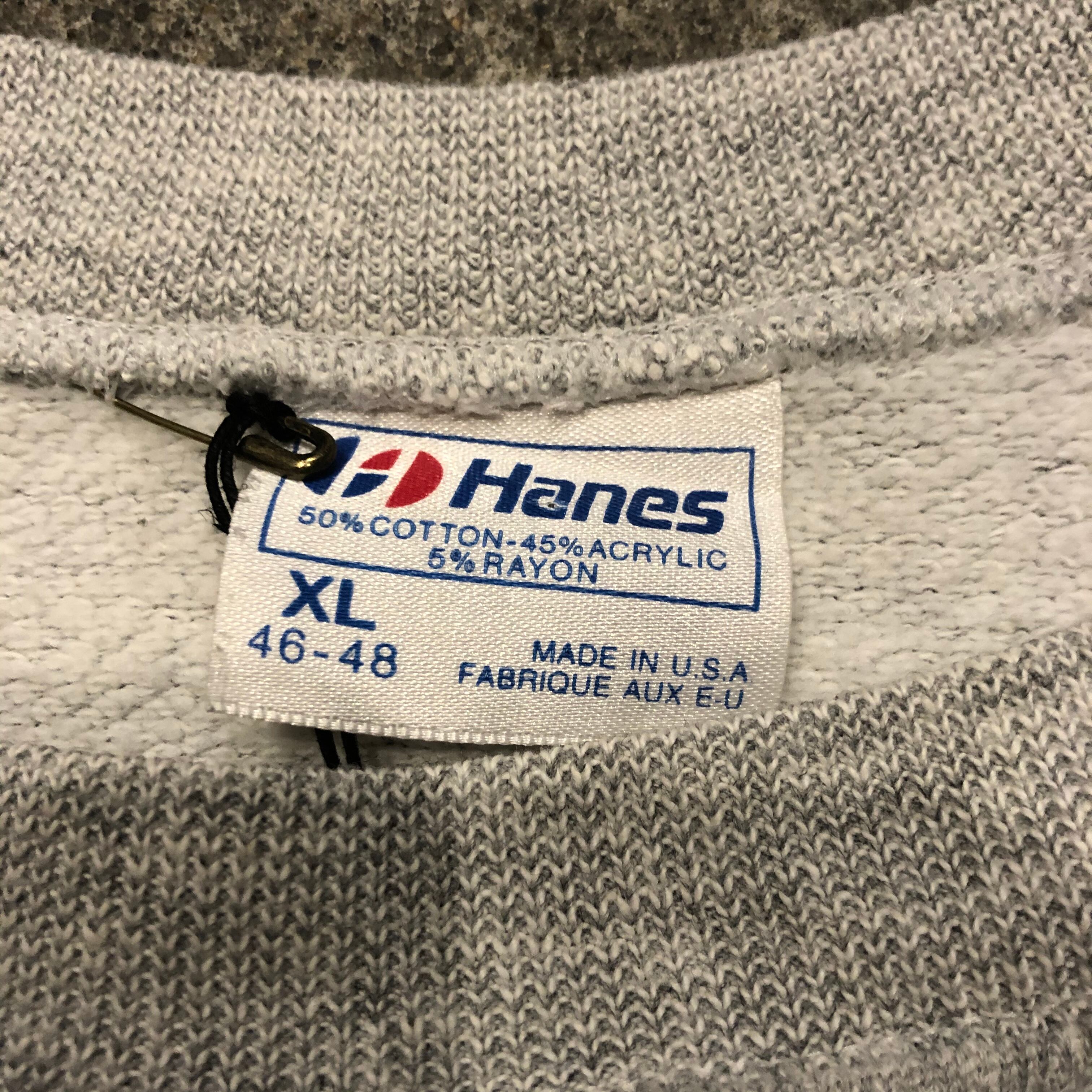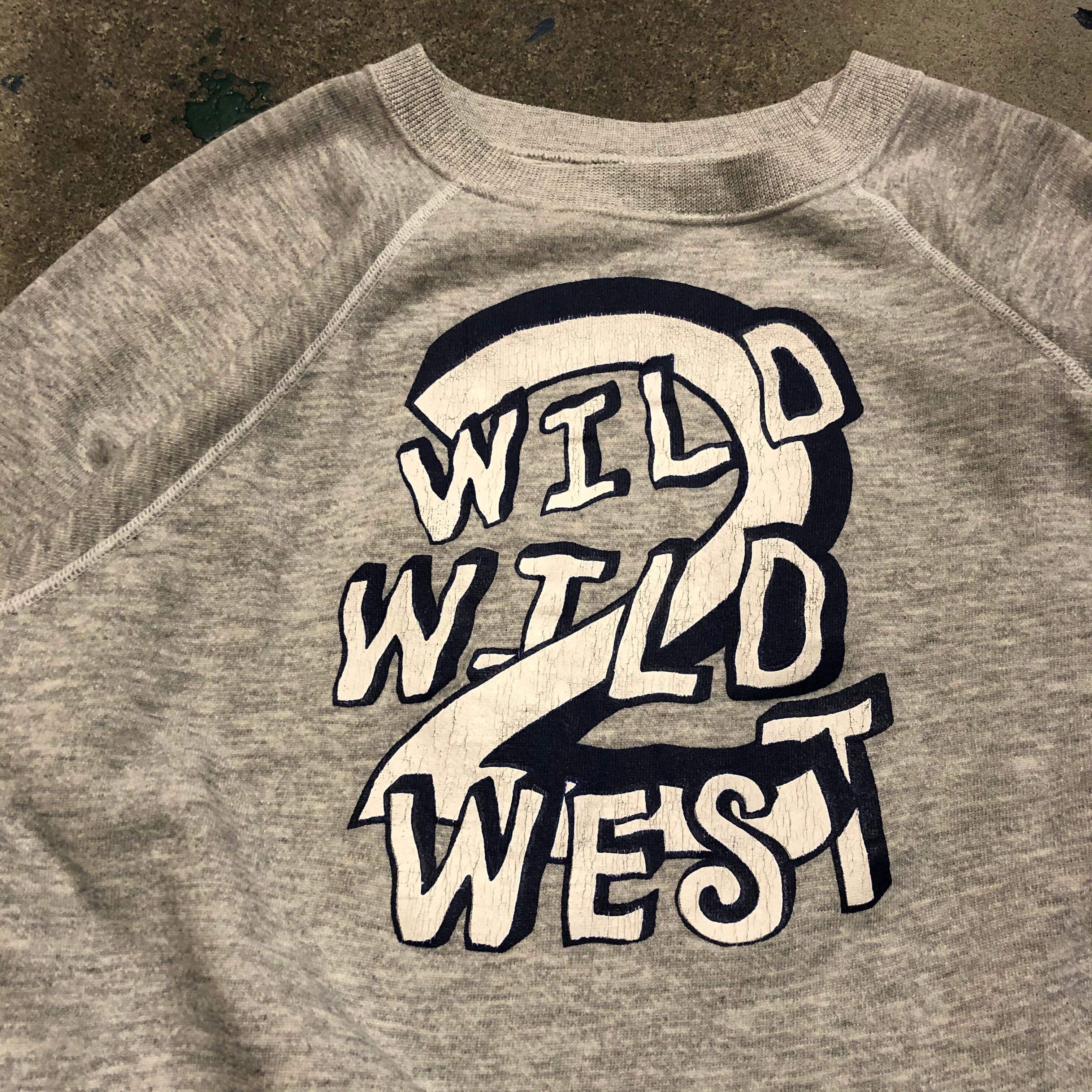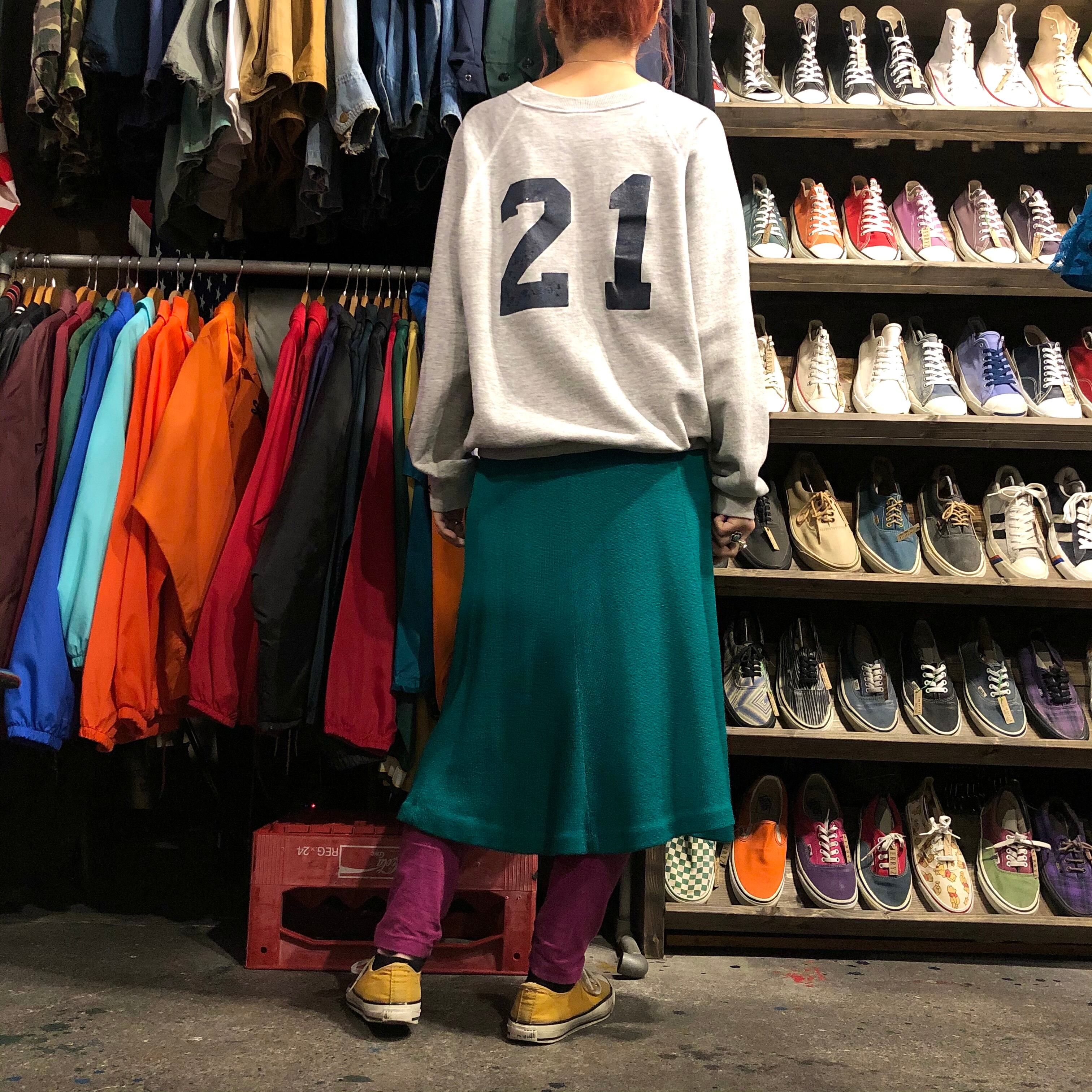 グレー地に両面プリントが良い感じのスウェットです。ラグランスリーブで襟ぐりが気持ち広く、緩く着て頂ける雰囲気です。