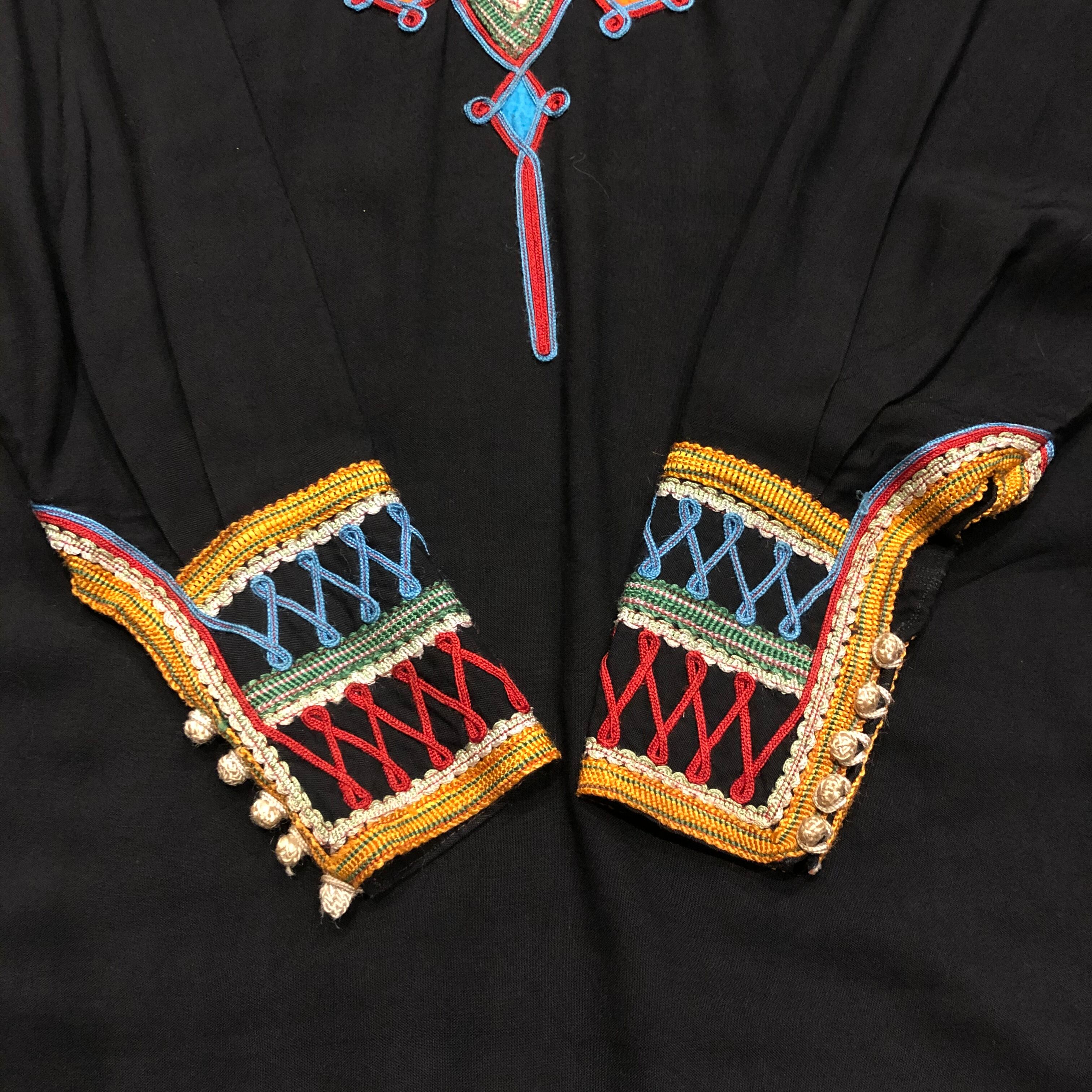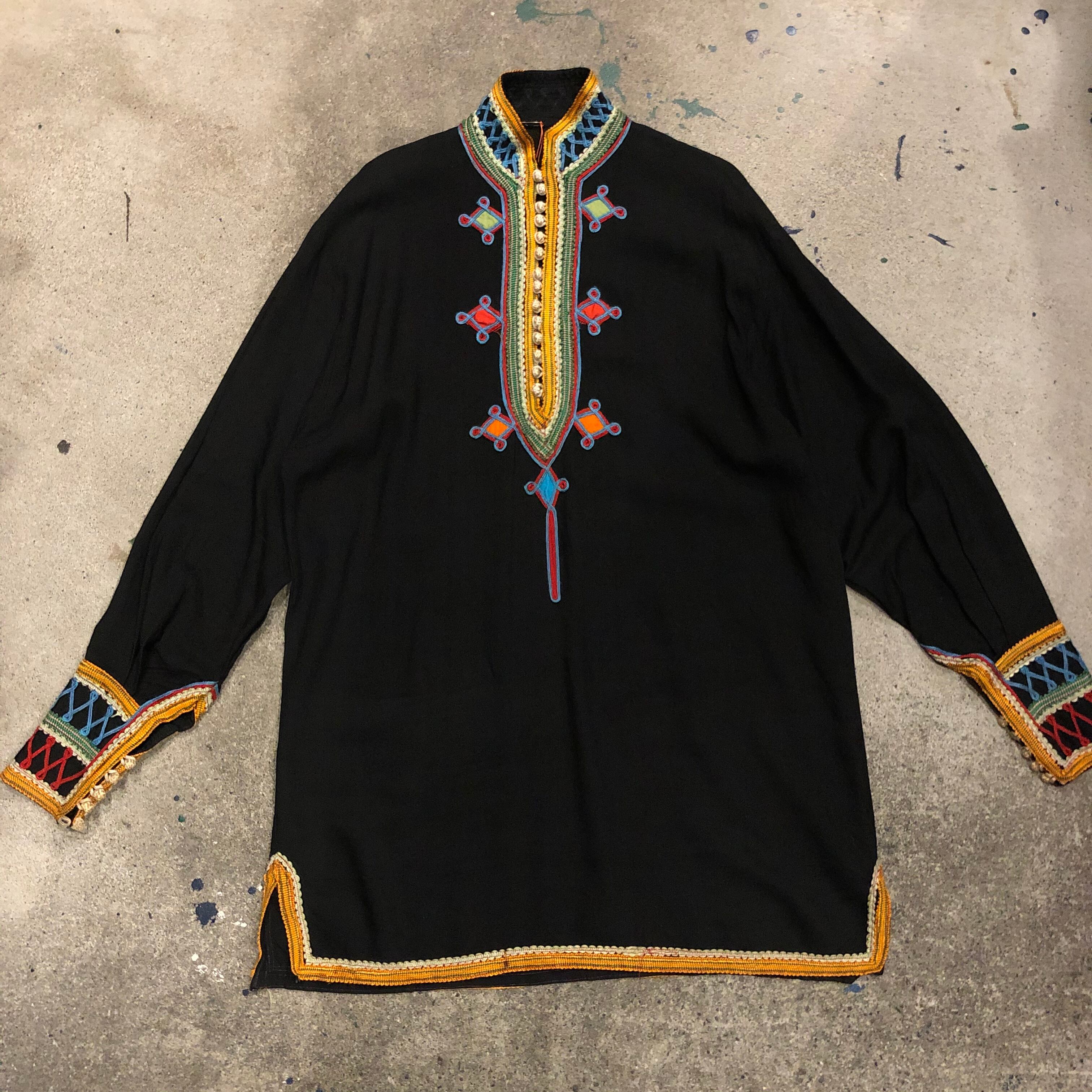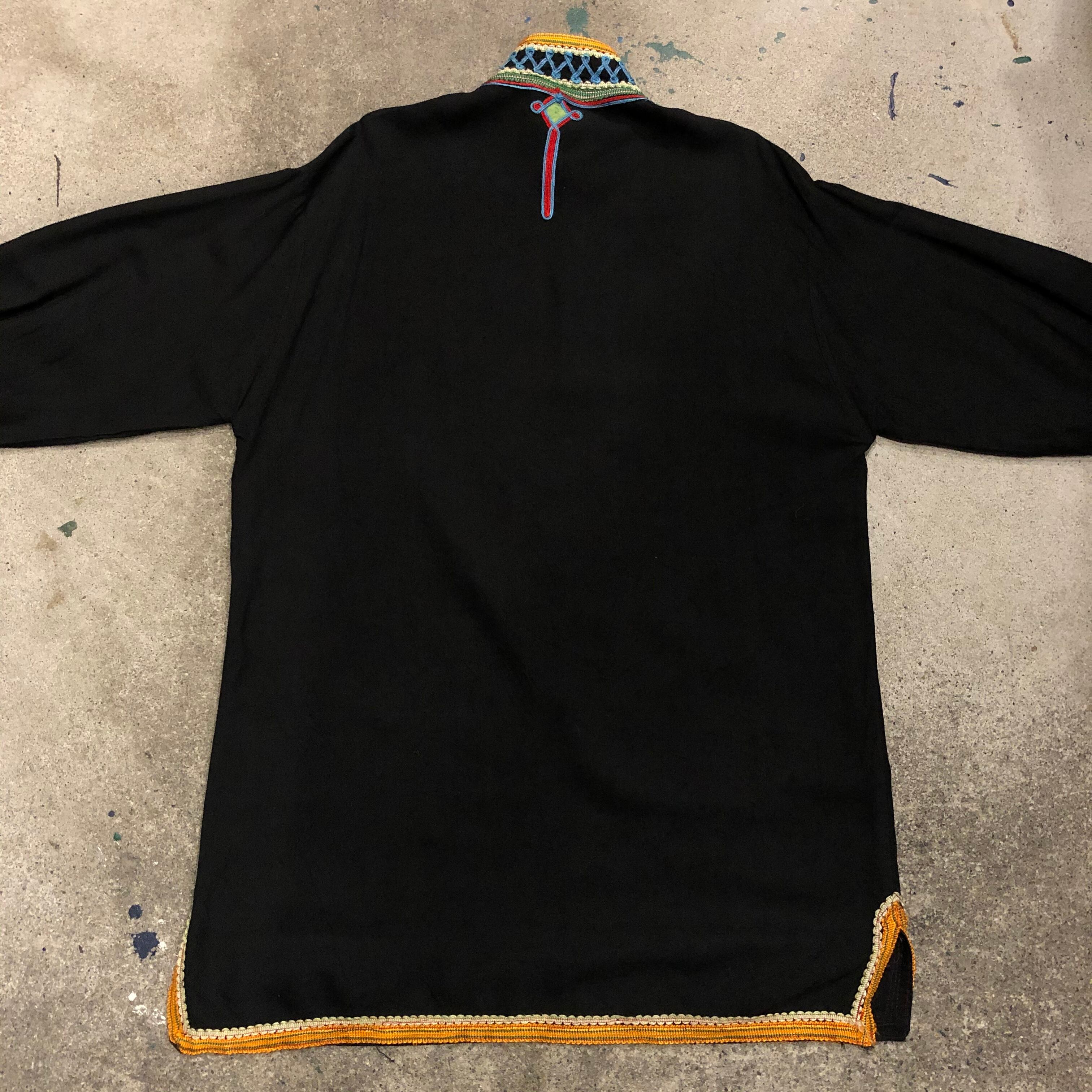 黒地にコード刺繍が映えてかっこいいシャツです。襟やカフス、裾のデザインが抜かりなく存在感があります。