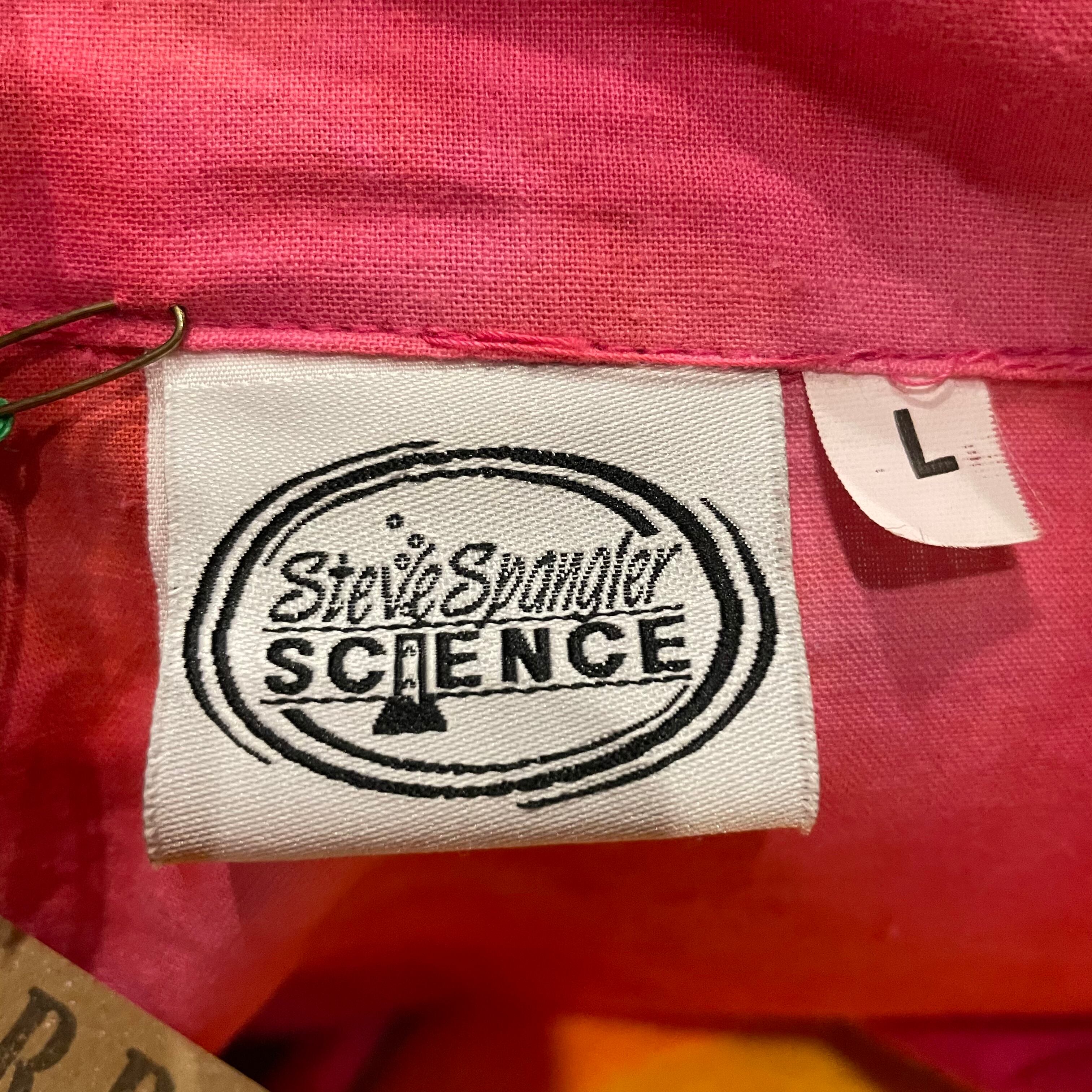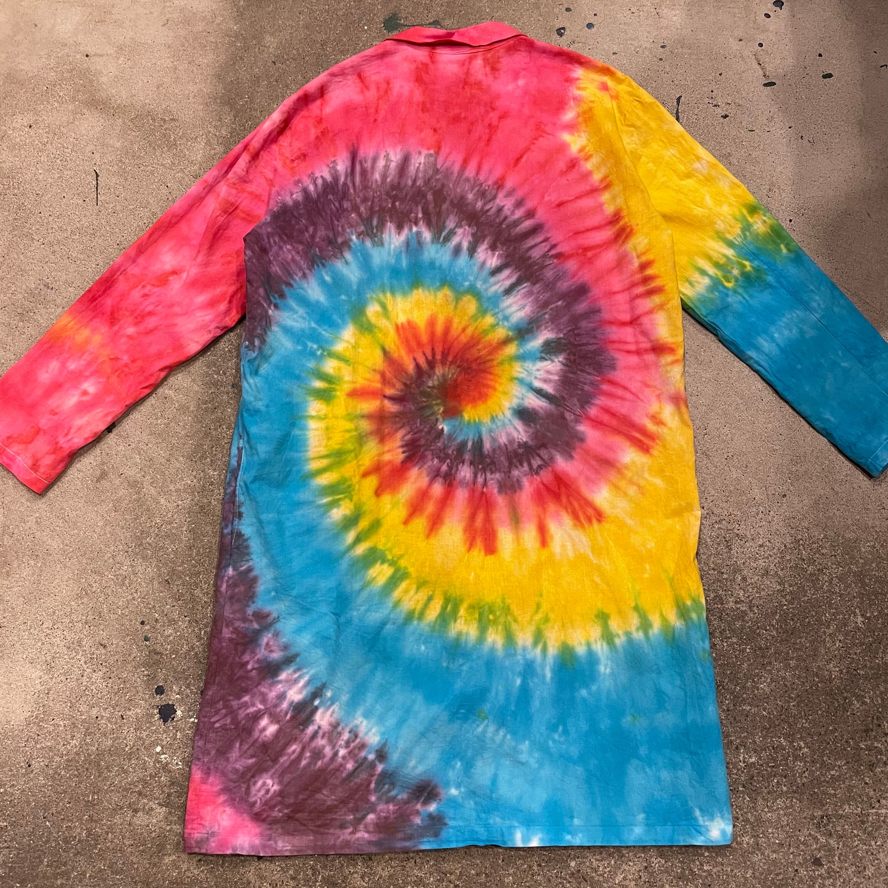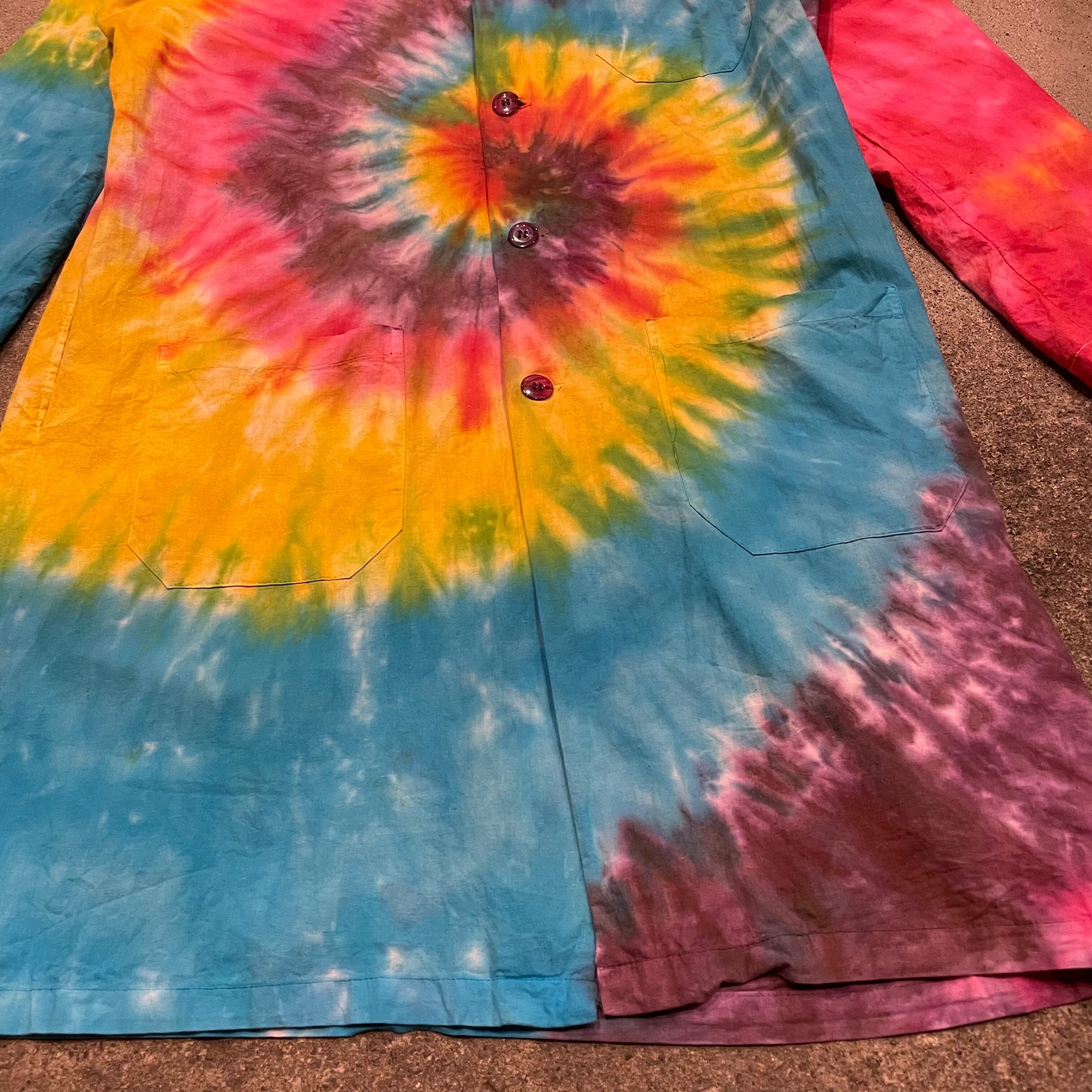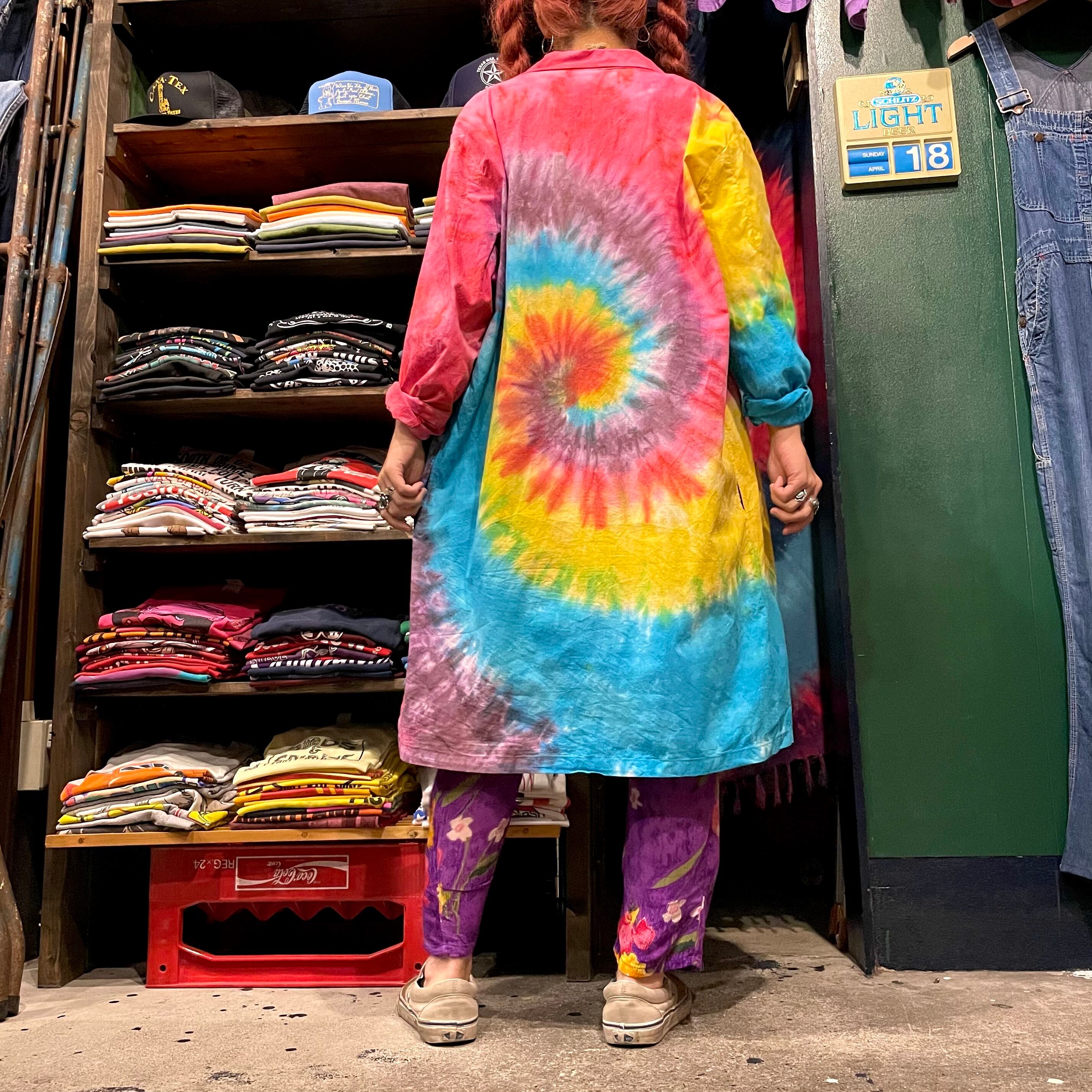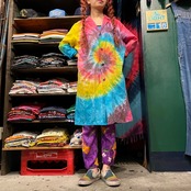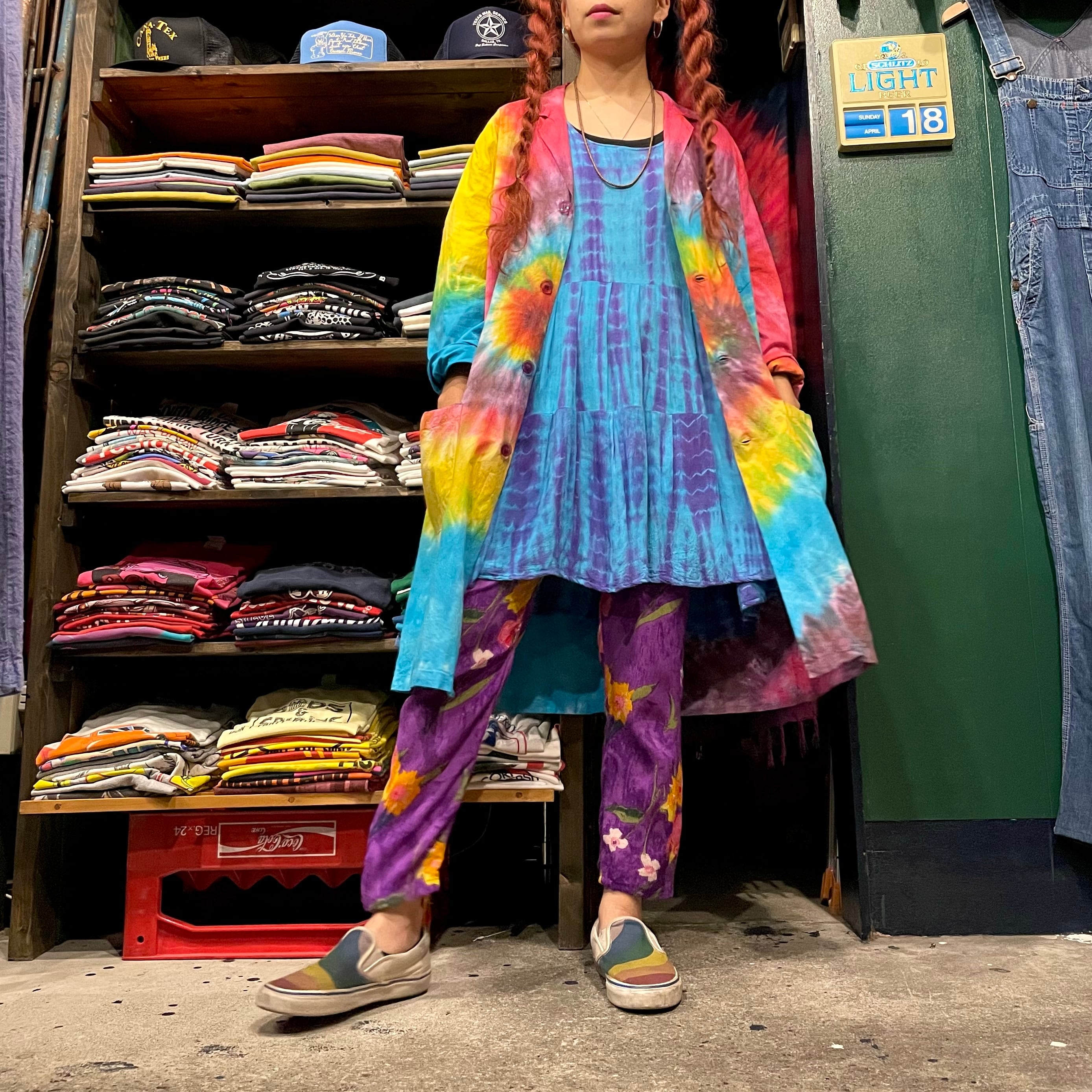 薄手のコットンで軽く羽織れる感じが良いですね。写真では派手なアイテムと合わせていますが、Tシャツにジーパンにビーサンのようなラフなスタイルに重ねたり、無地のワンピースに羽織っても可愛いと思います。