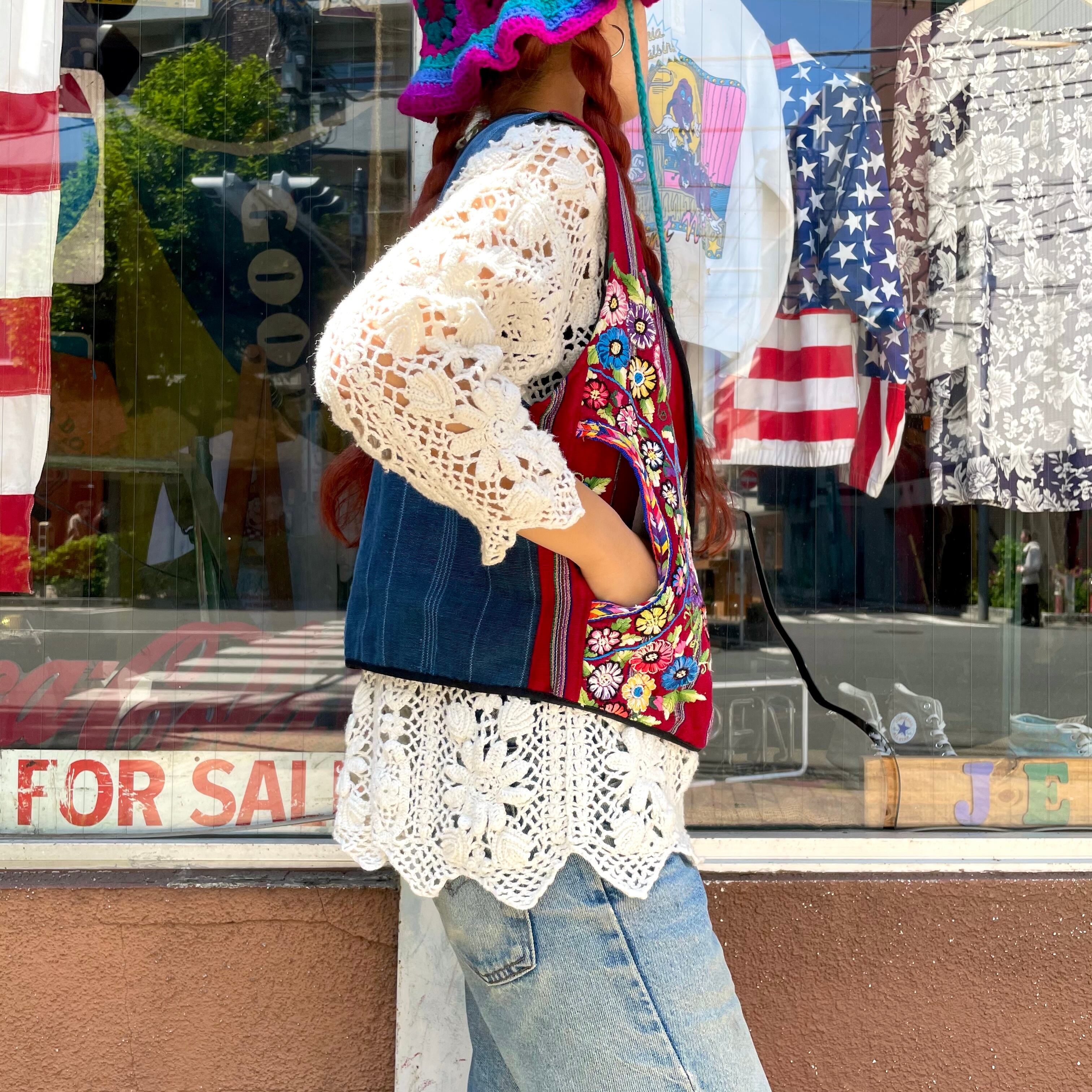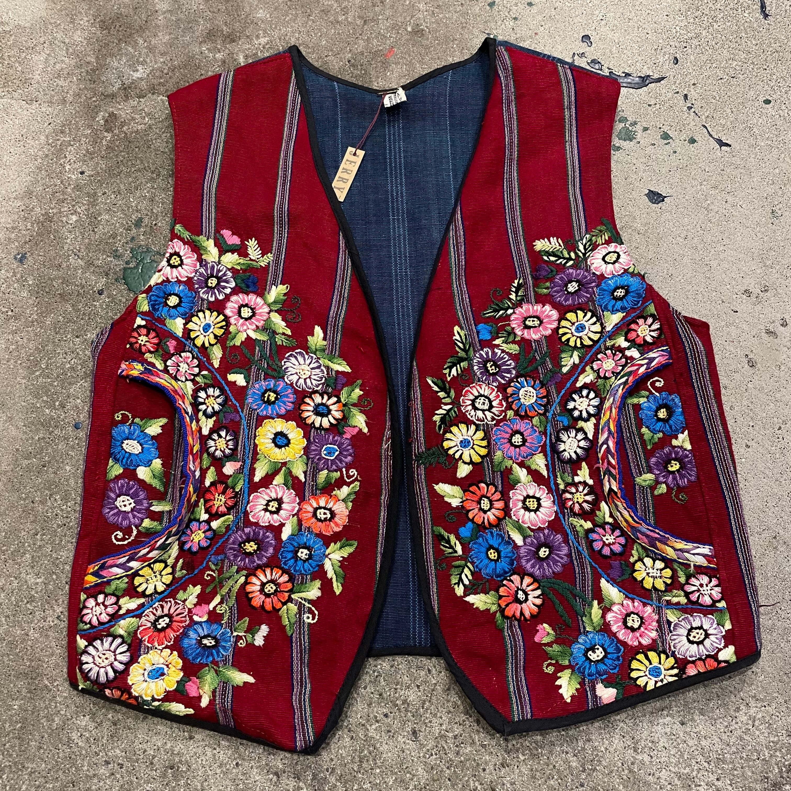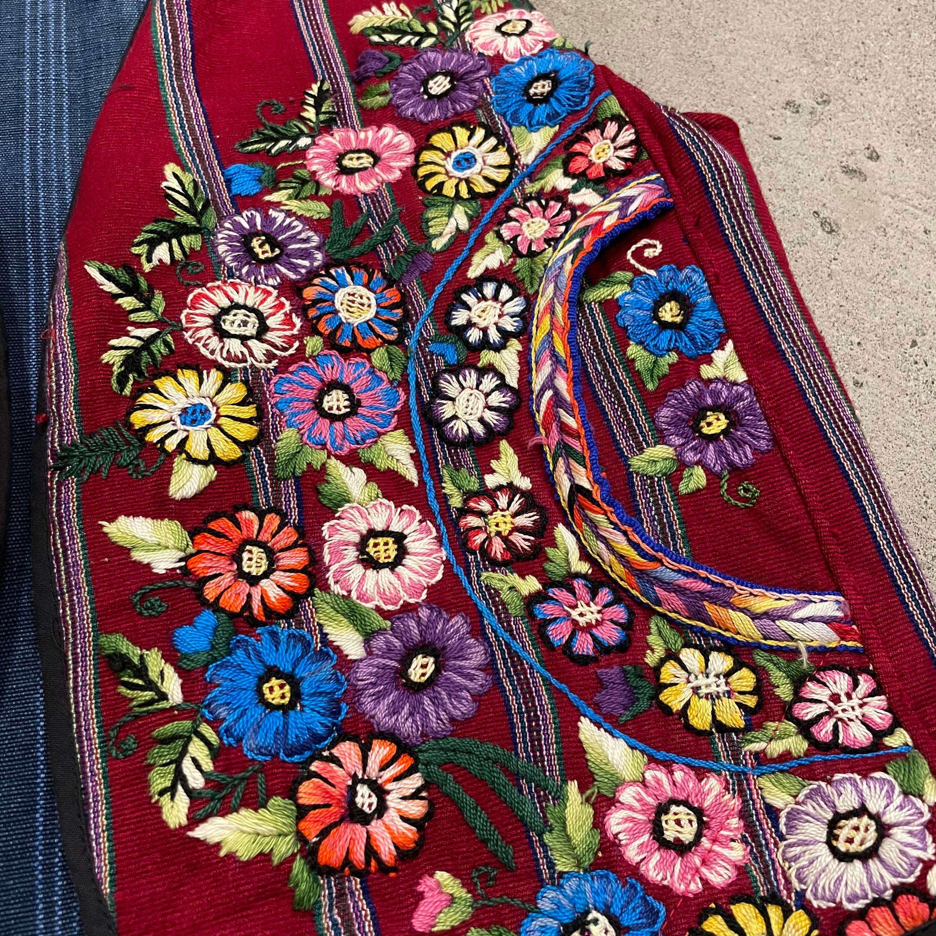 いろんな色のお花がストライプの上に刺繍されており、独特な雰囲気のある一着です。