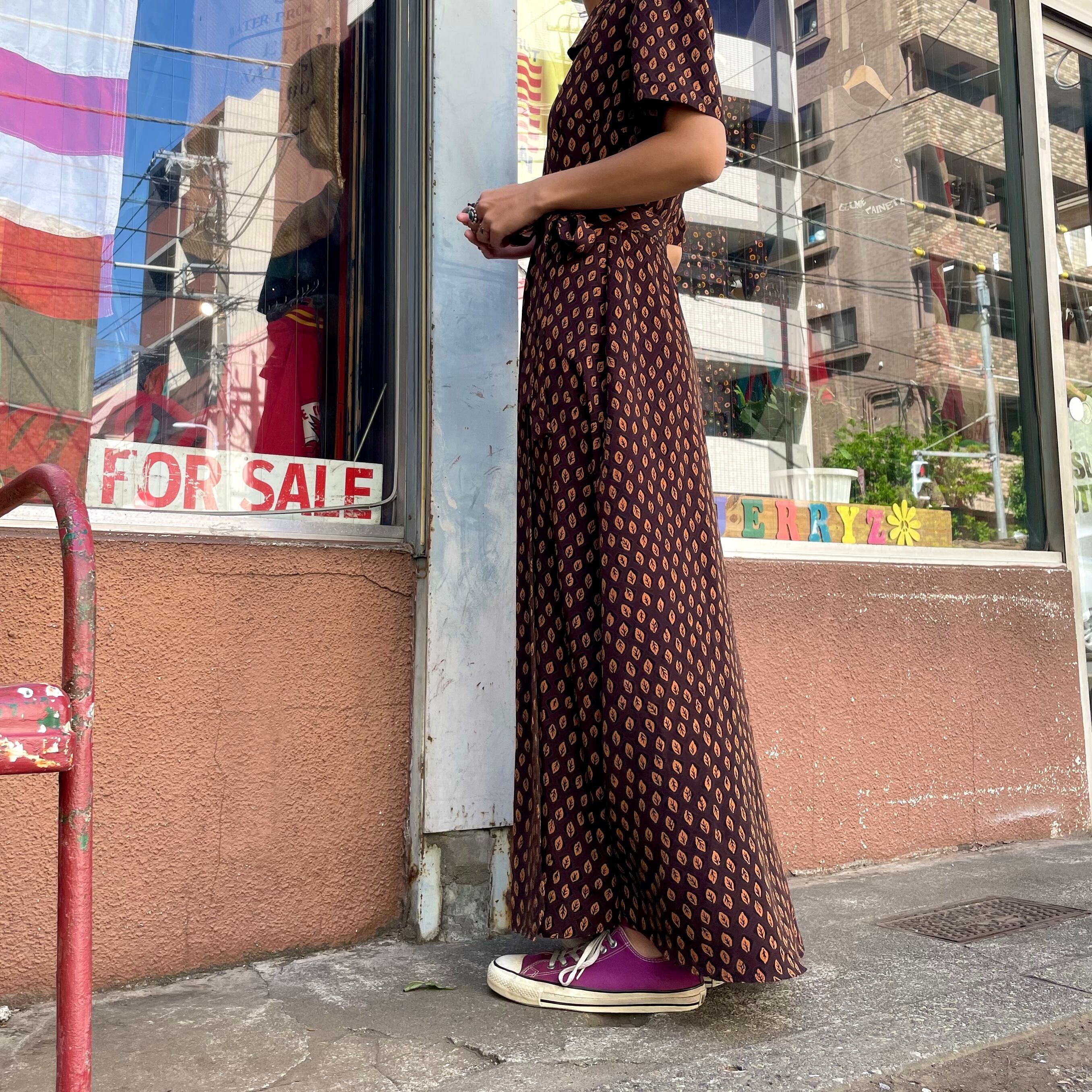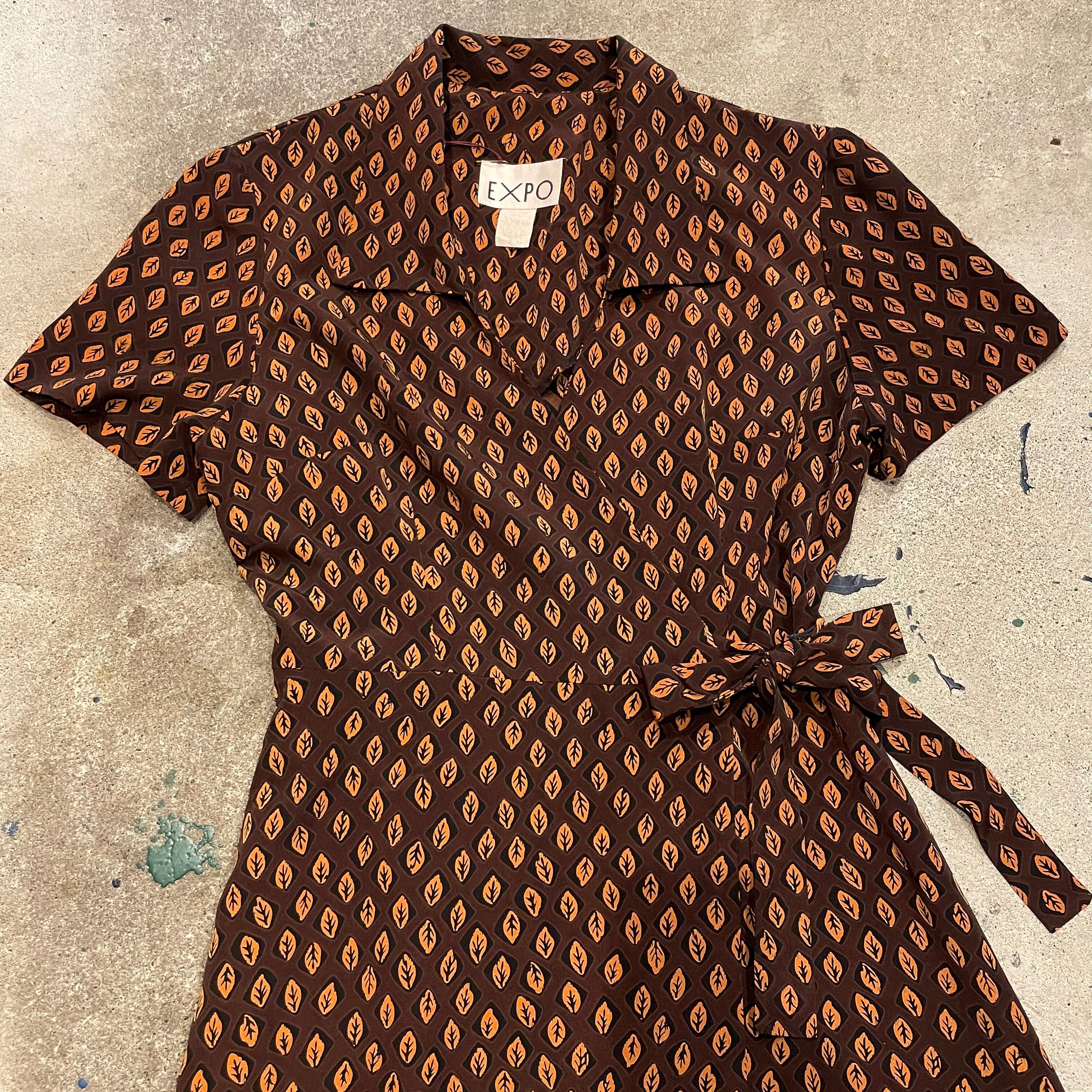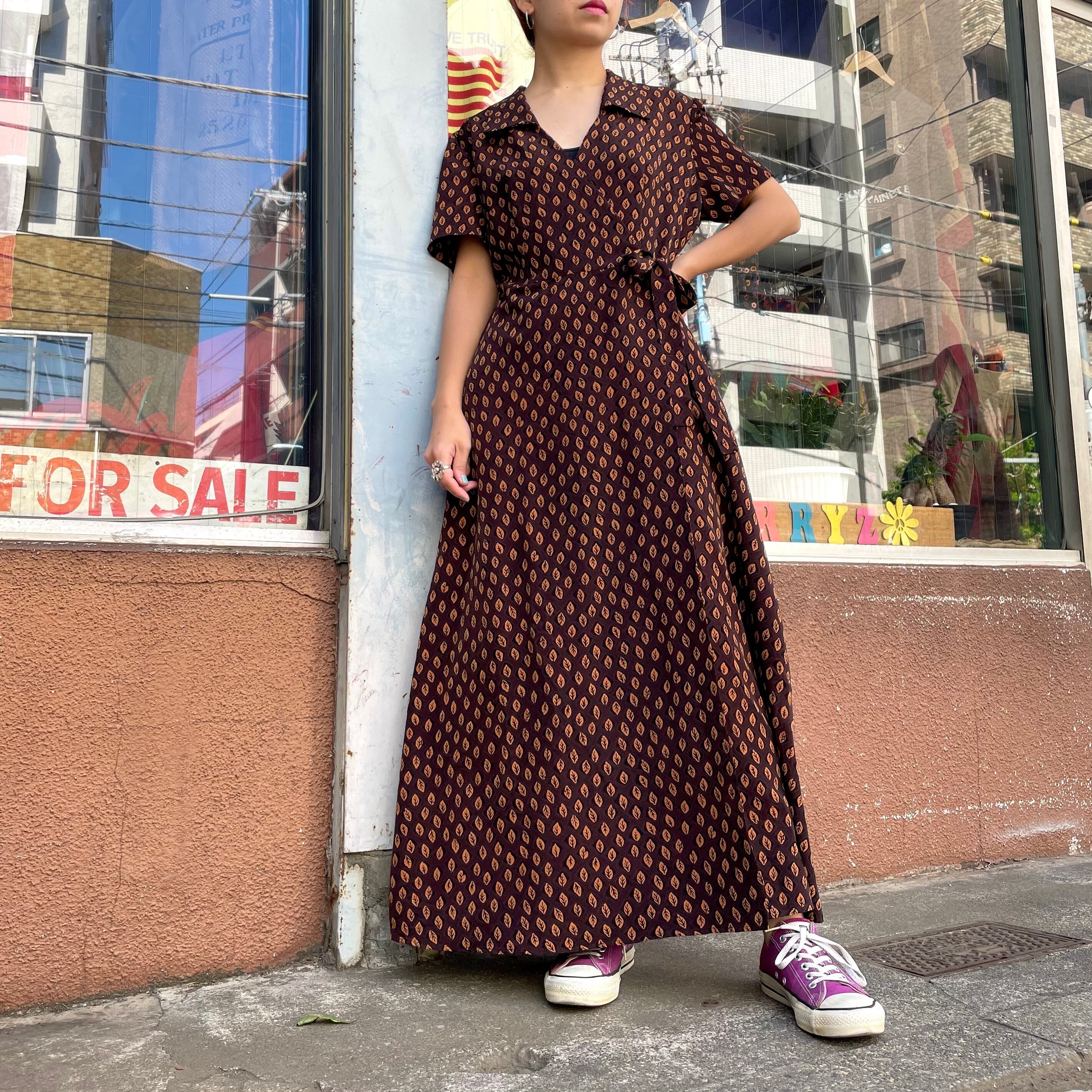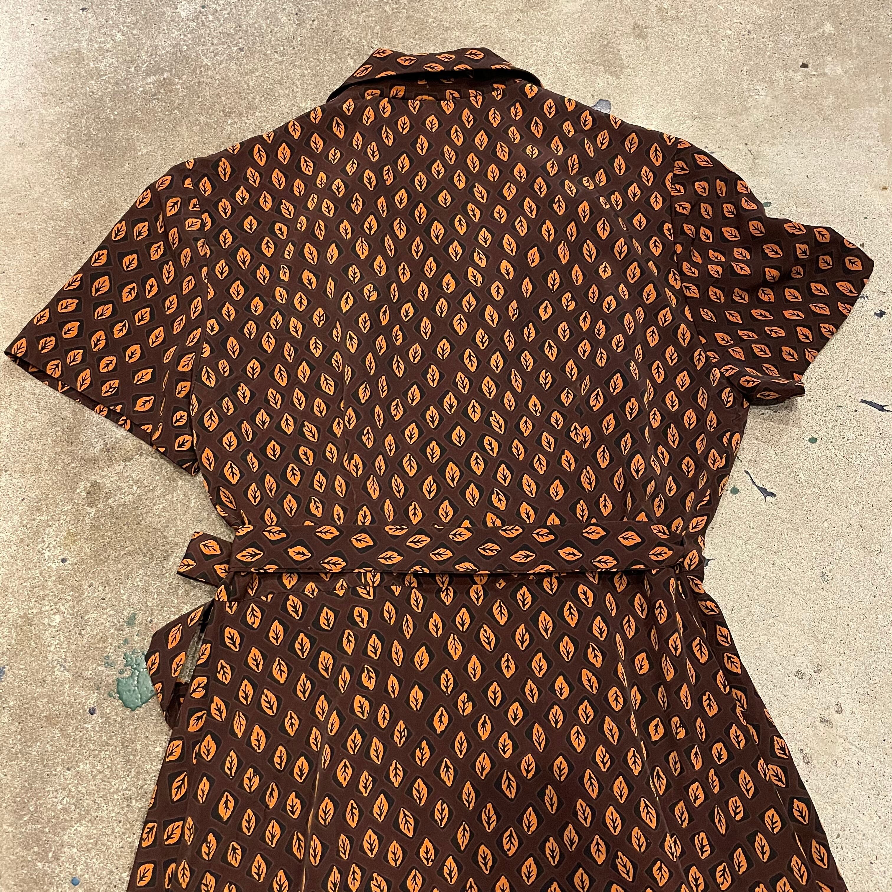 茶色に葉っぱ柄のカシュクールタイプのワンピースです。