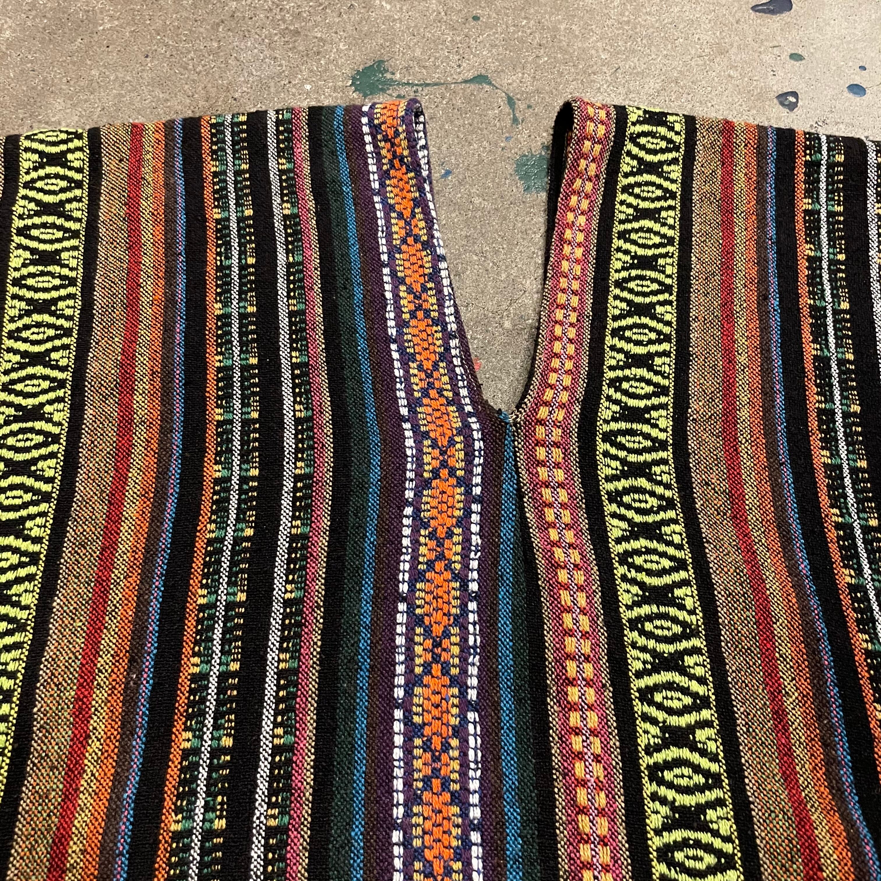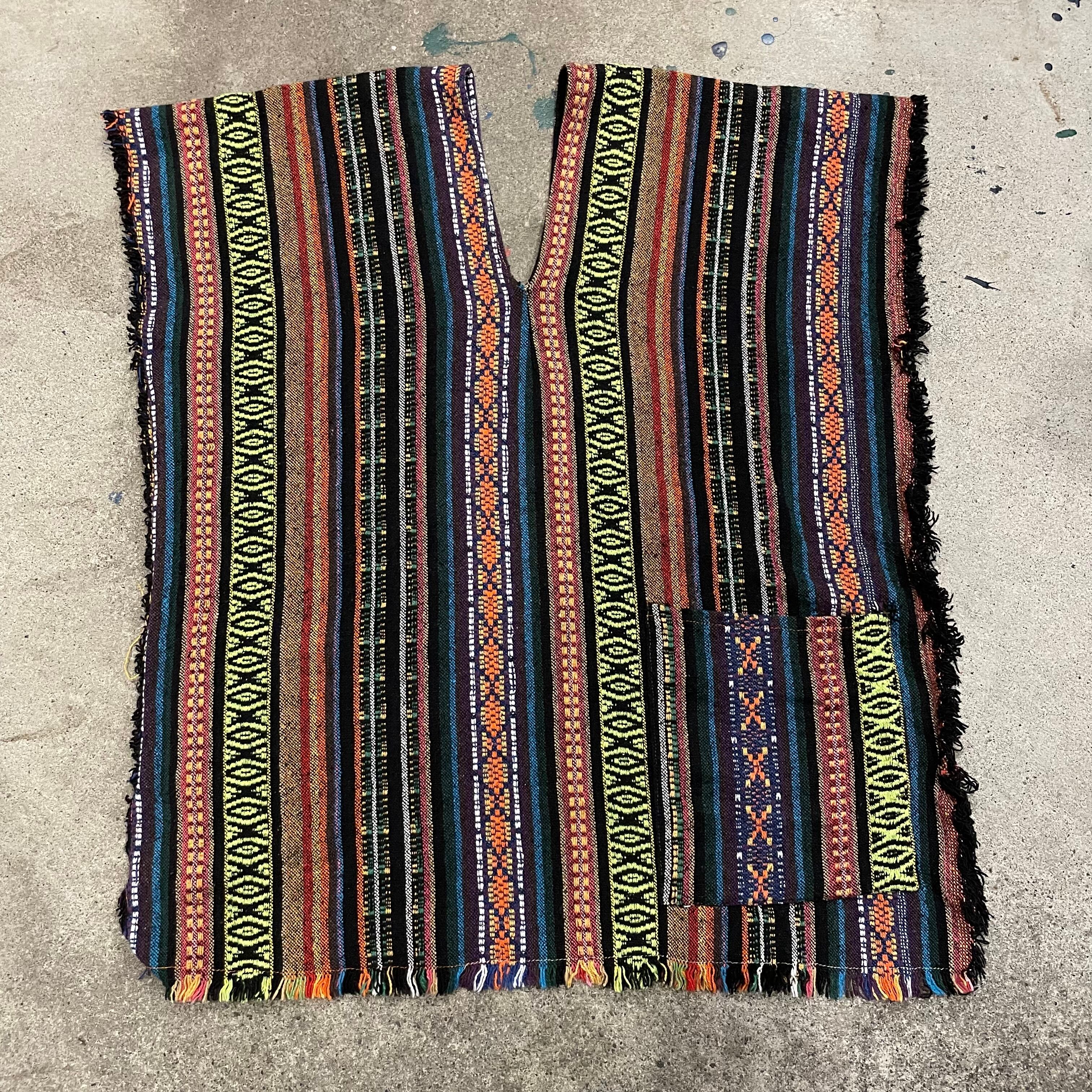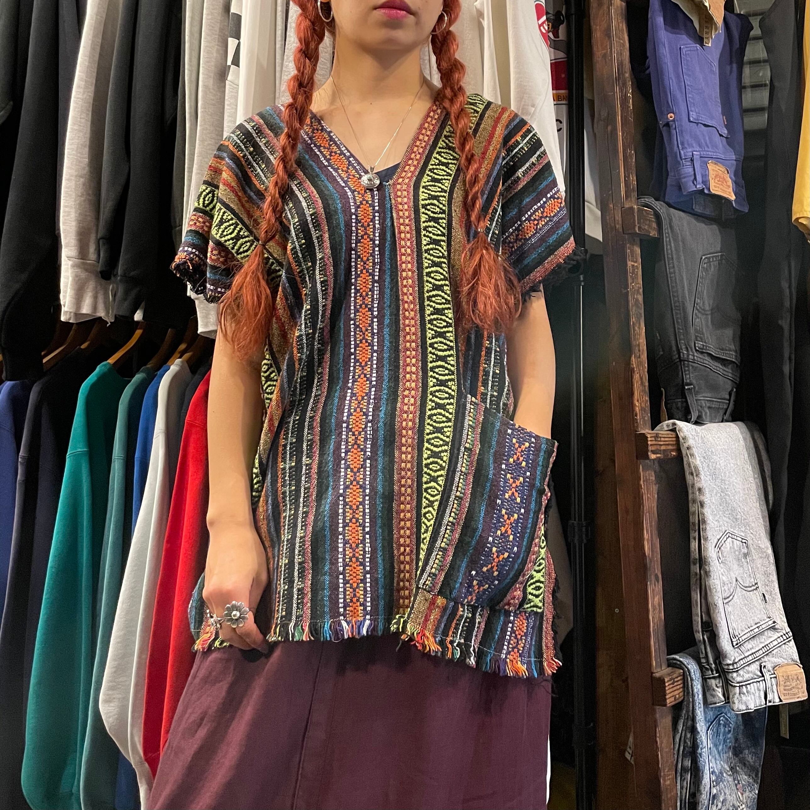 ガテマラっぽい雰囲気の織りがかわいいポンチョ風のトップスです。脇は縫われていますので普通のトップス感覚で着ていただけます。