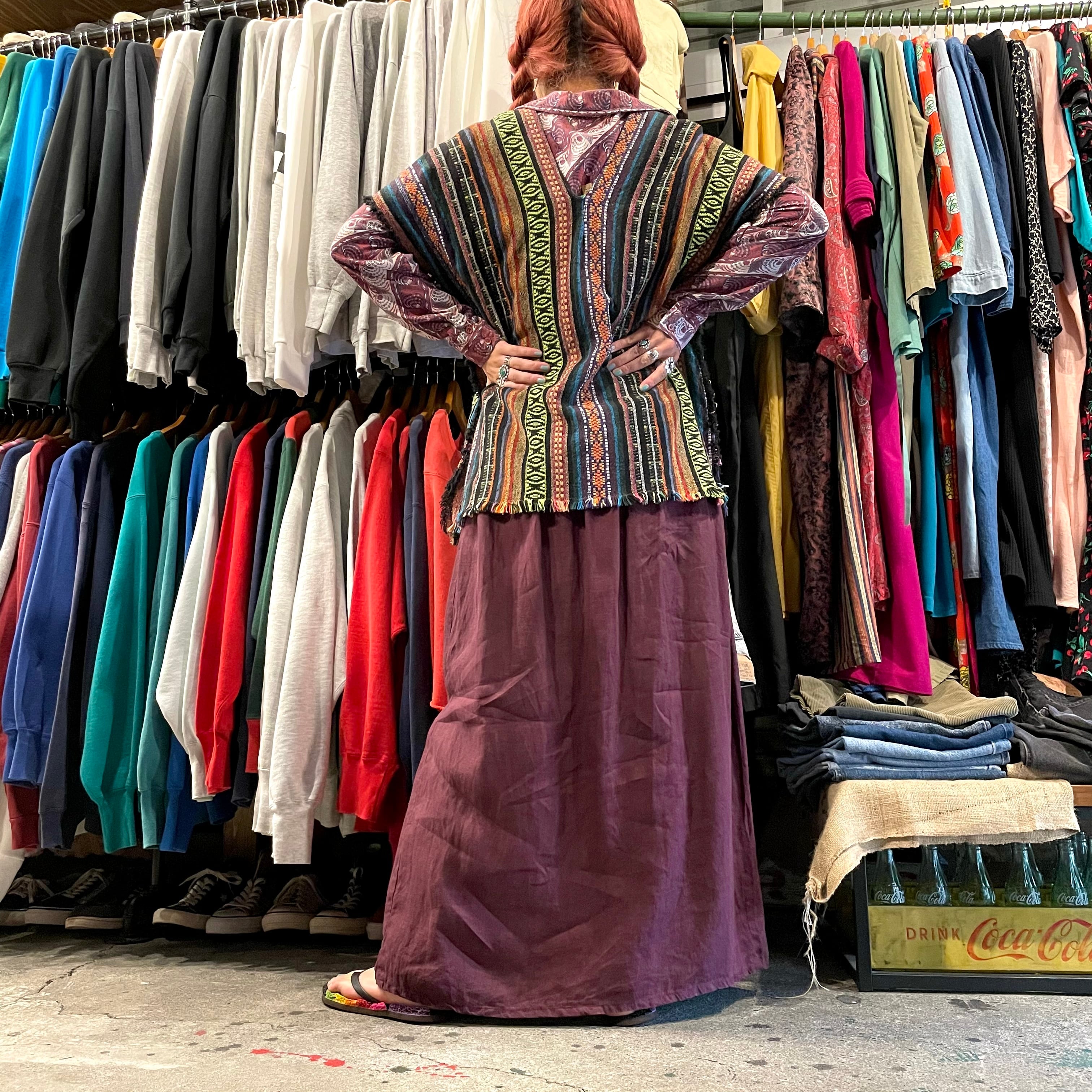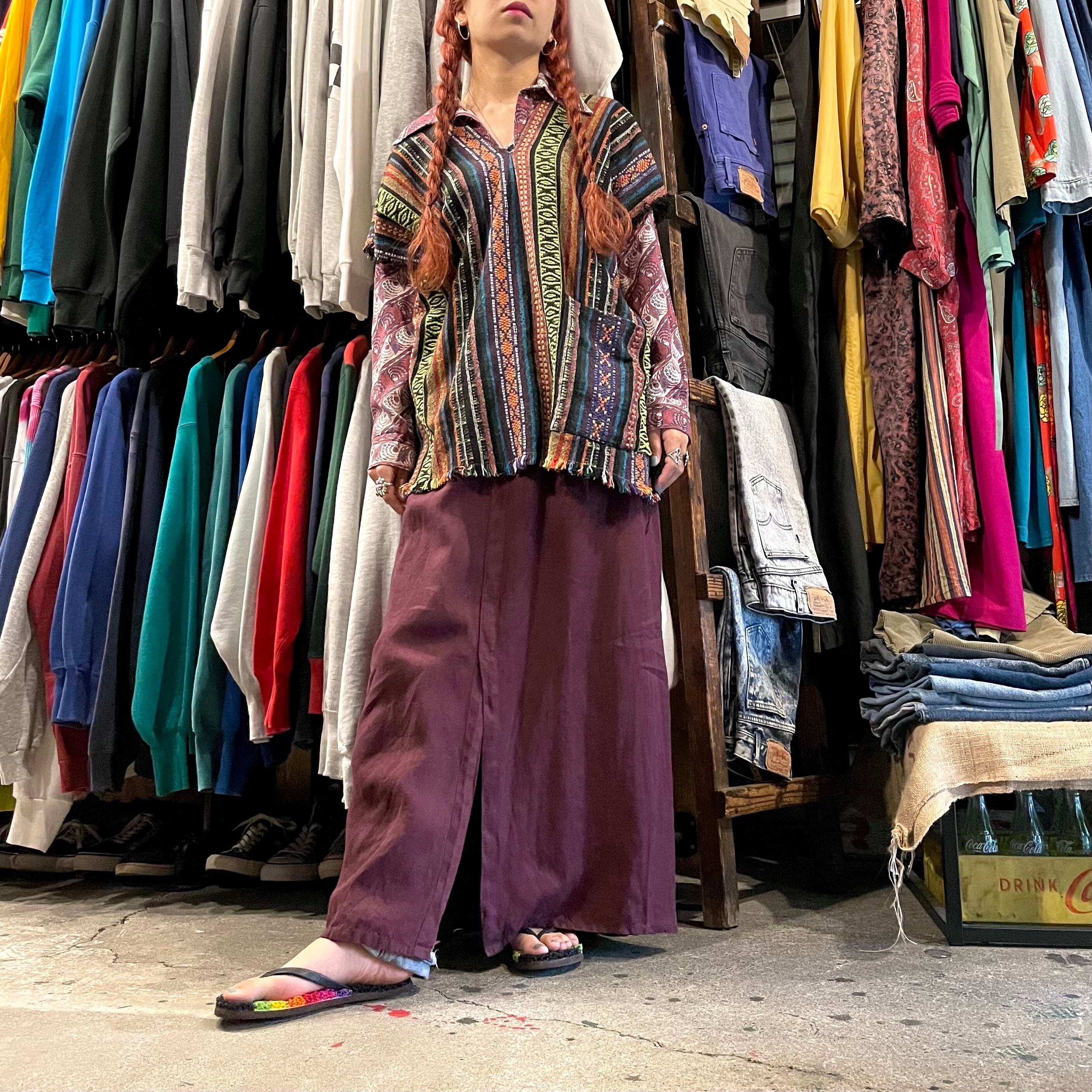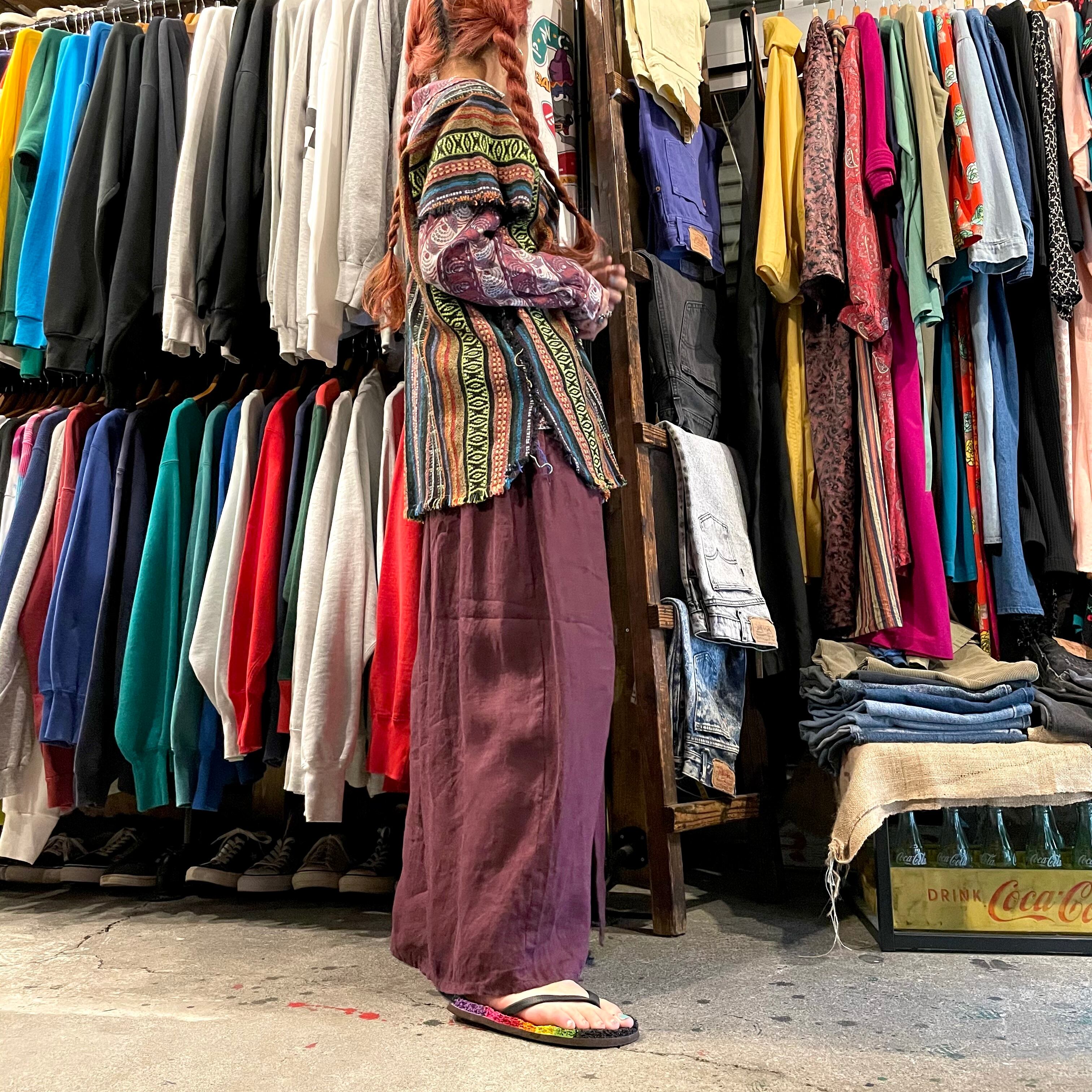 かなり民族感漂うアイテムですが、デニムやロングスカートと合わせたり、中にパーカーやブラウスなどあわせたりいろいろお楽しみいただけると思います。ベルトでウエストマークして形を変えるのも良いですね!大きめのポケットがついているのも嬉しいポイントです。