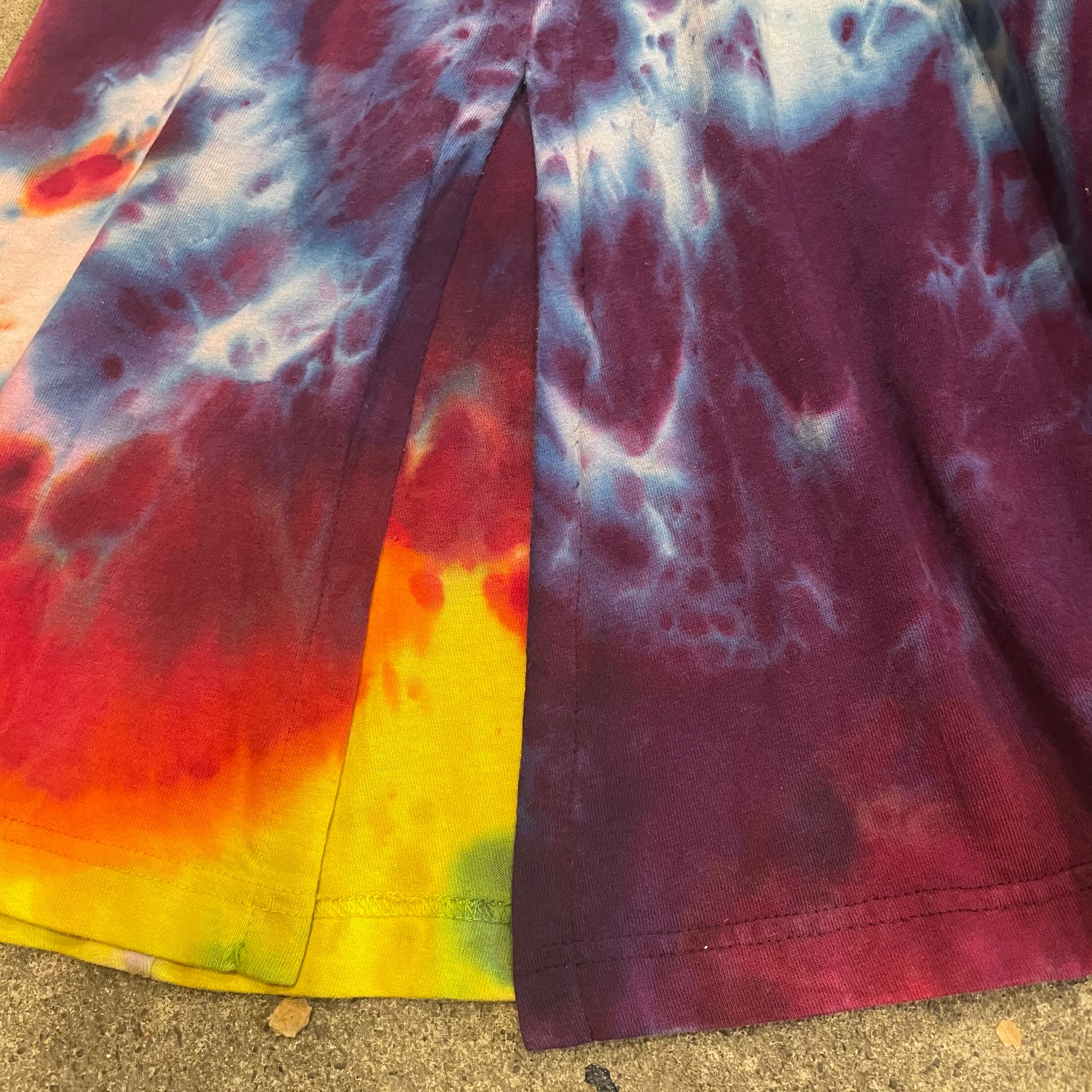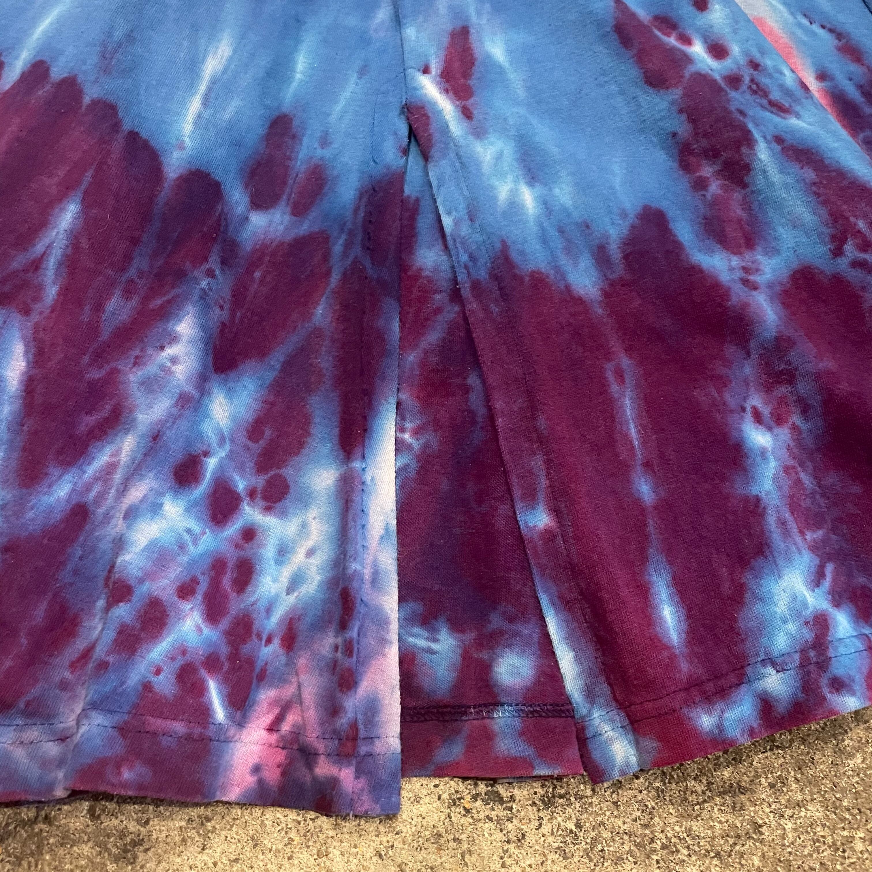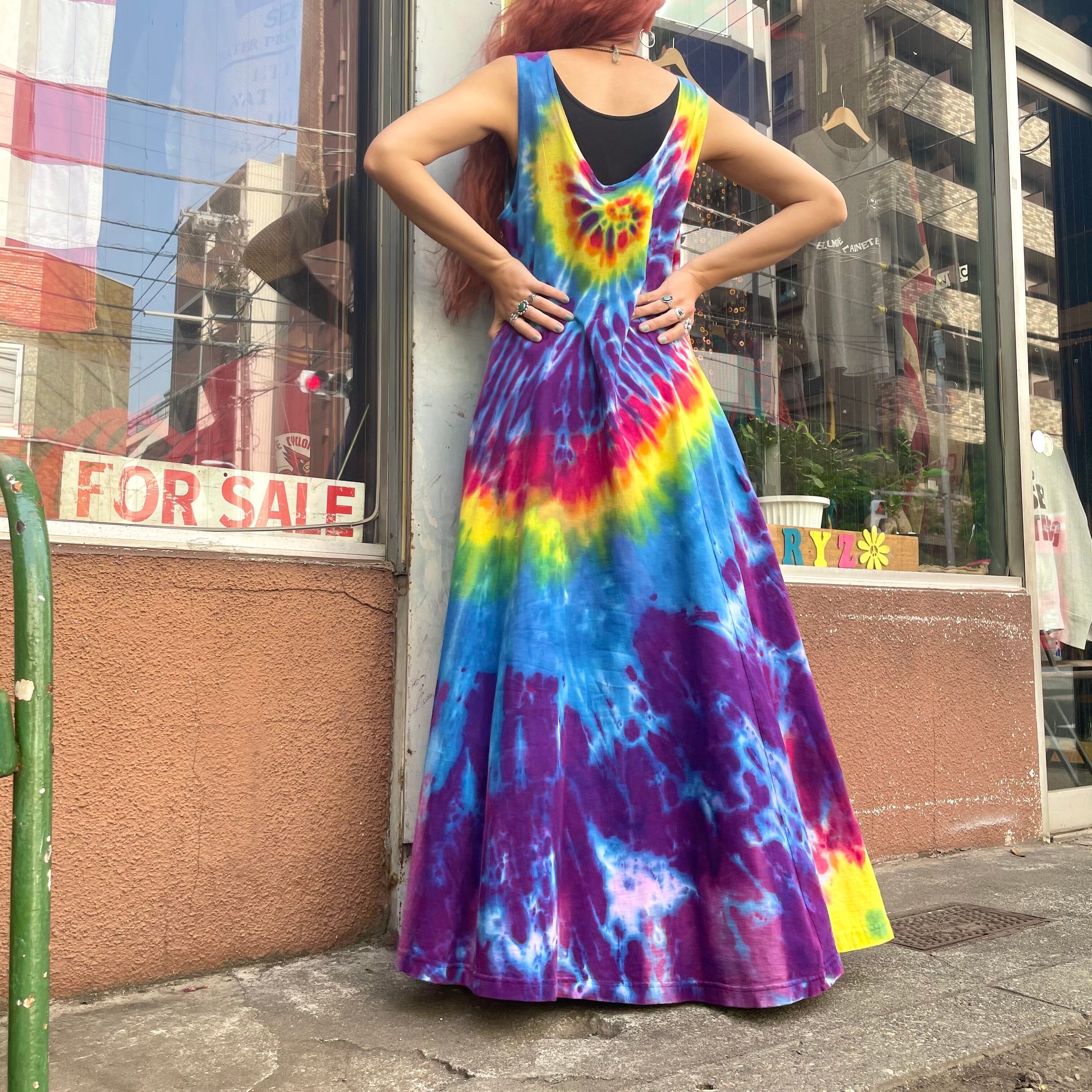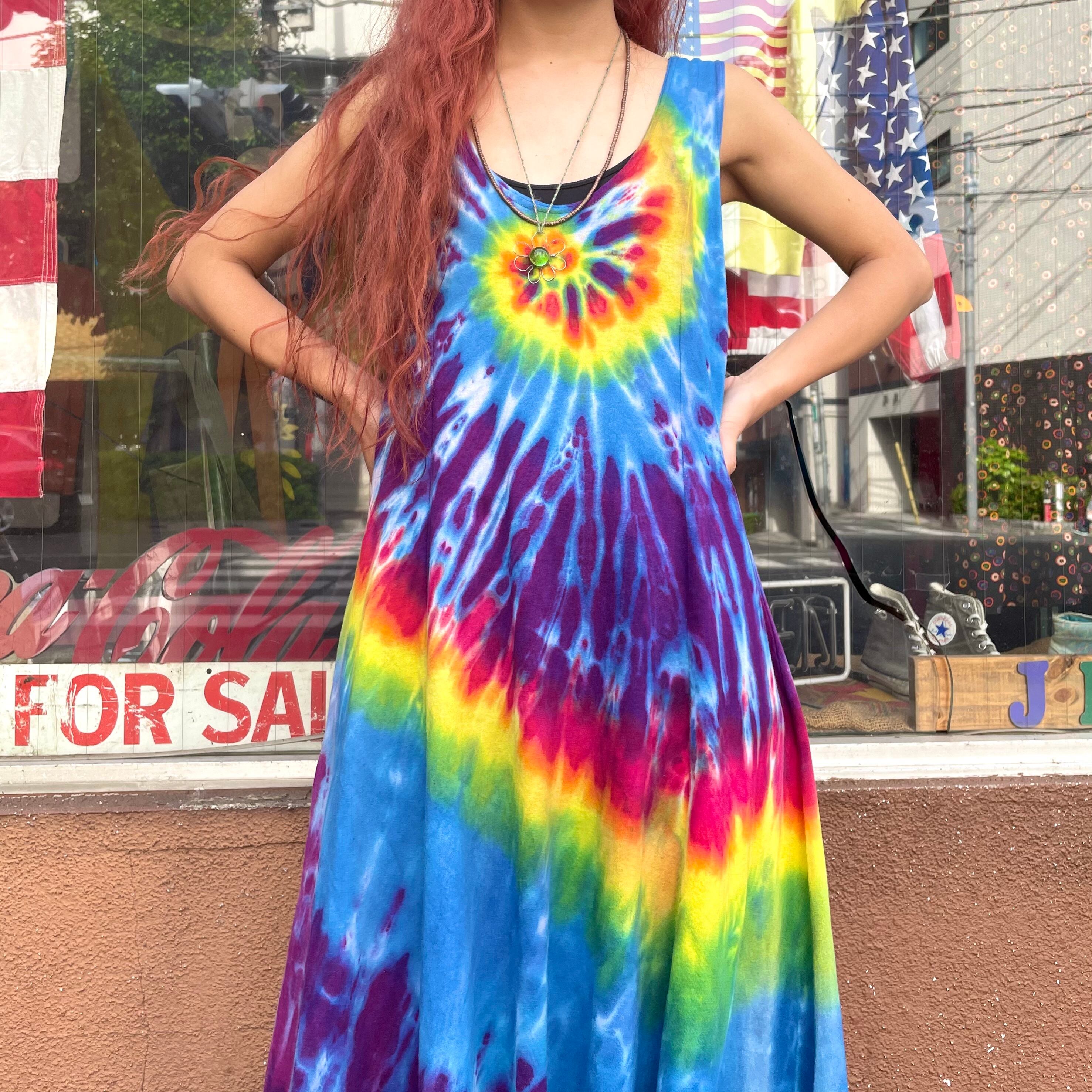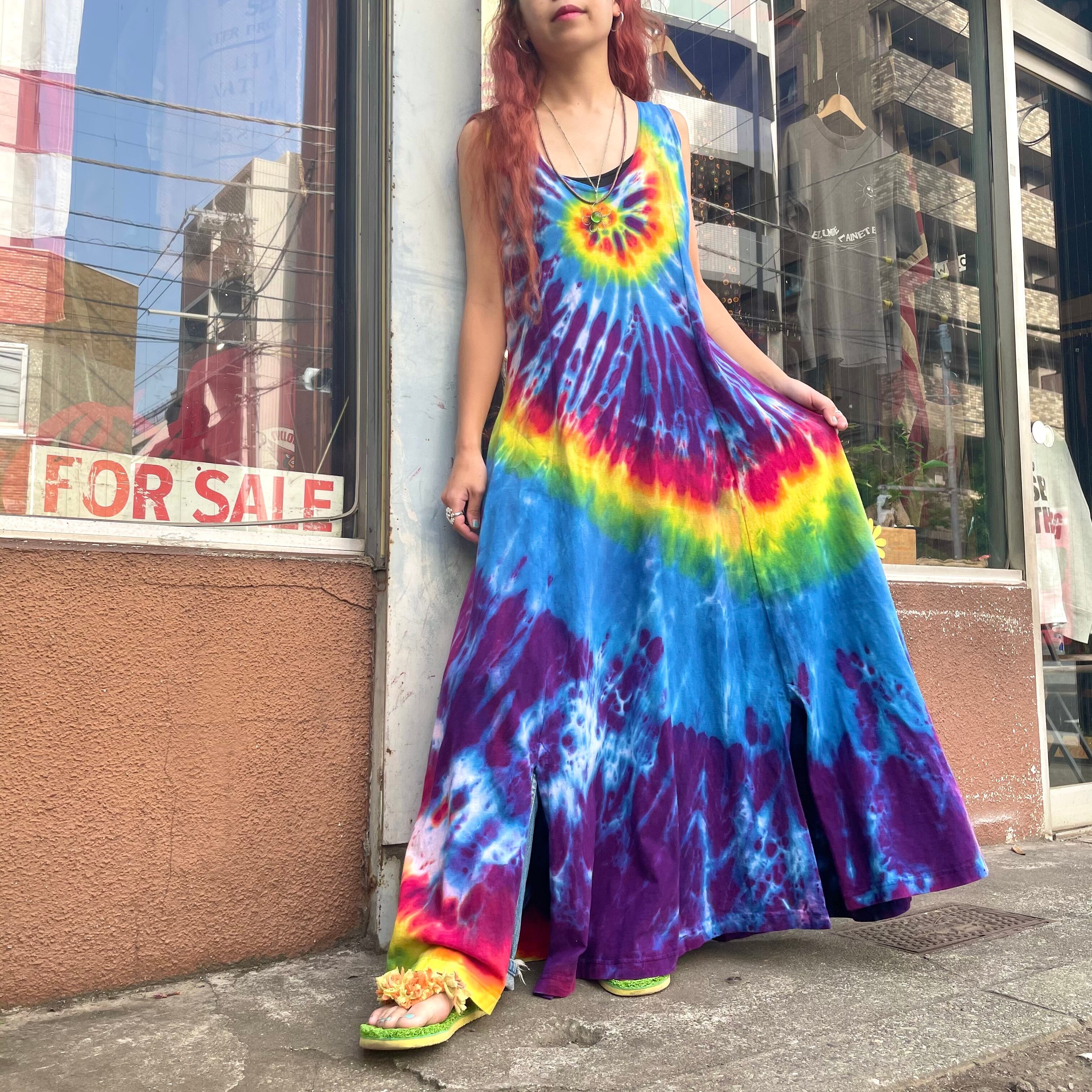 ザ・夏!なタイダイがかわいいワンピースです。パッキリ系のタイダイですので、かなりインパクトがあります。厚手のTシャツのような素材感でとても楽ですし、ボリュームやシルエットがとてもかわいいです。前に二箇所スリットが入っているのもポイントですね。