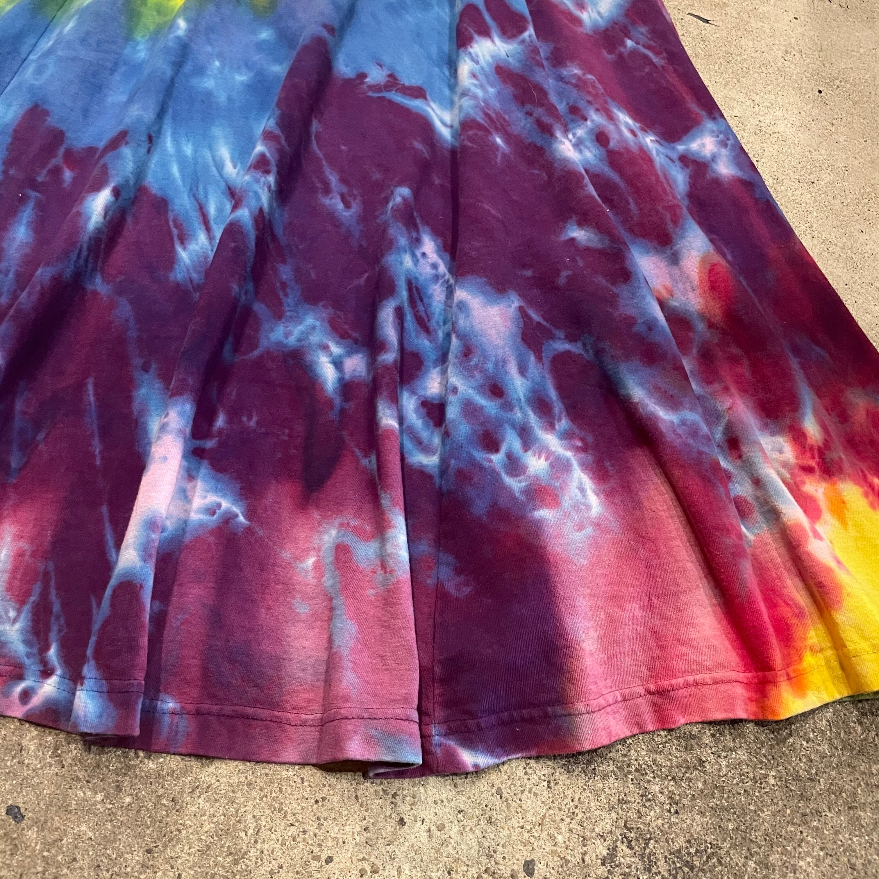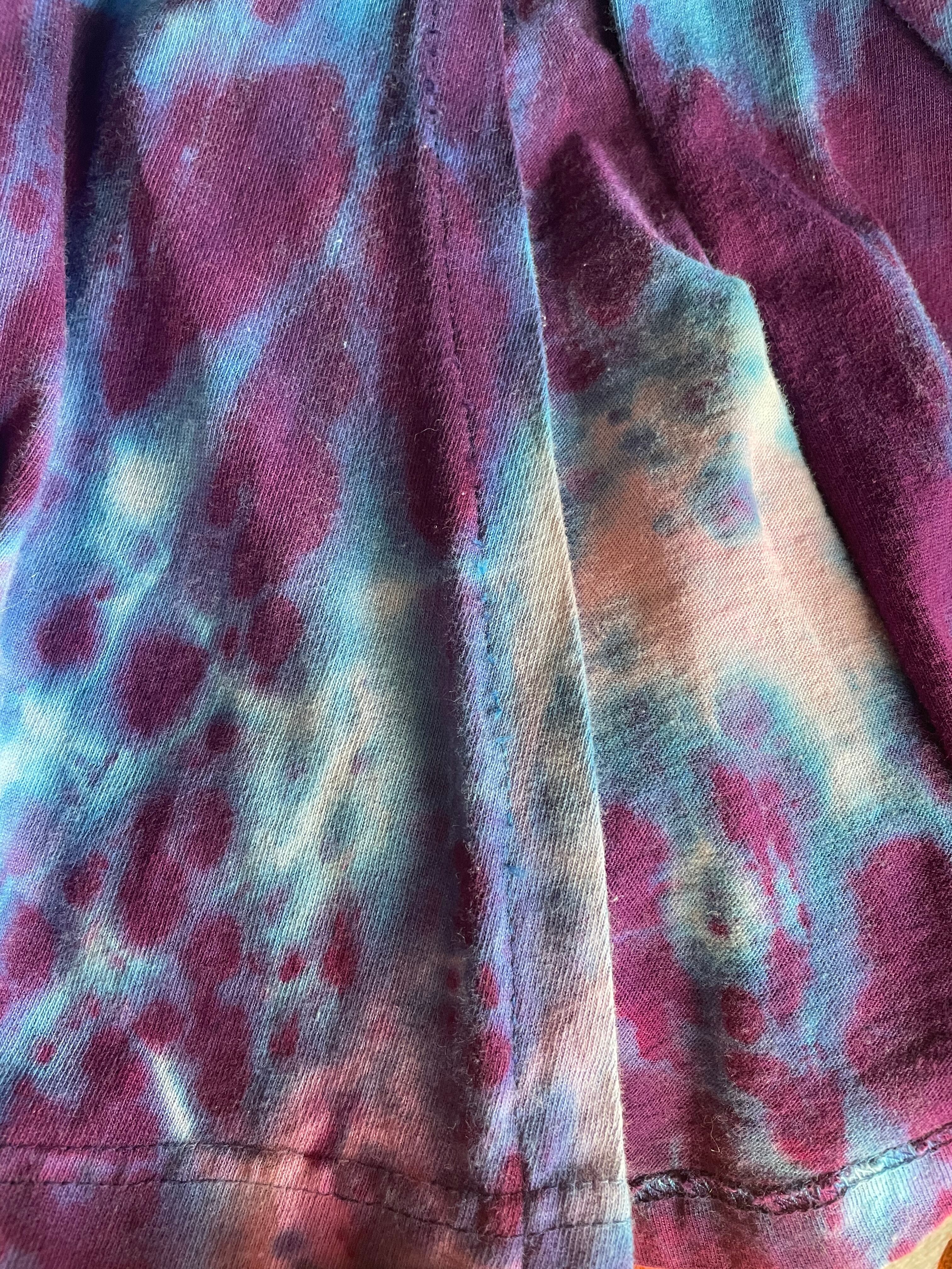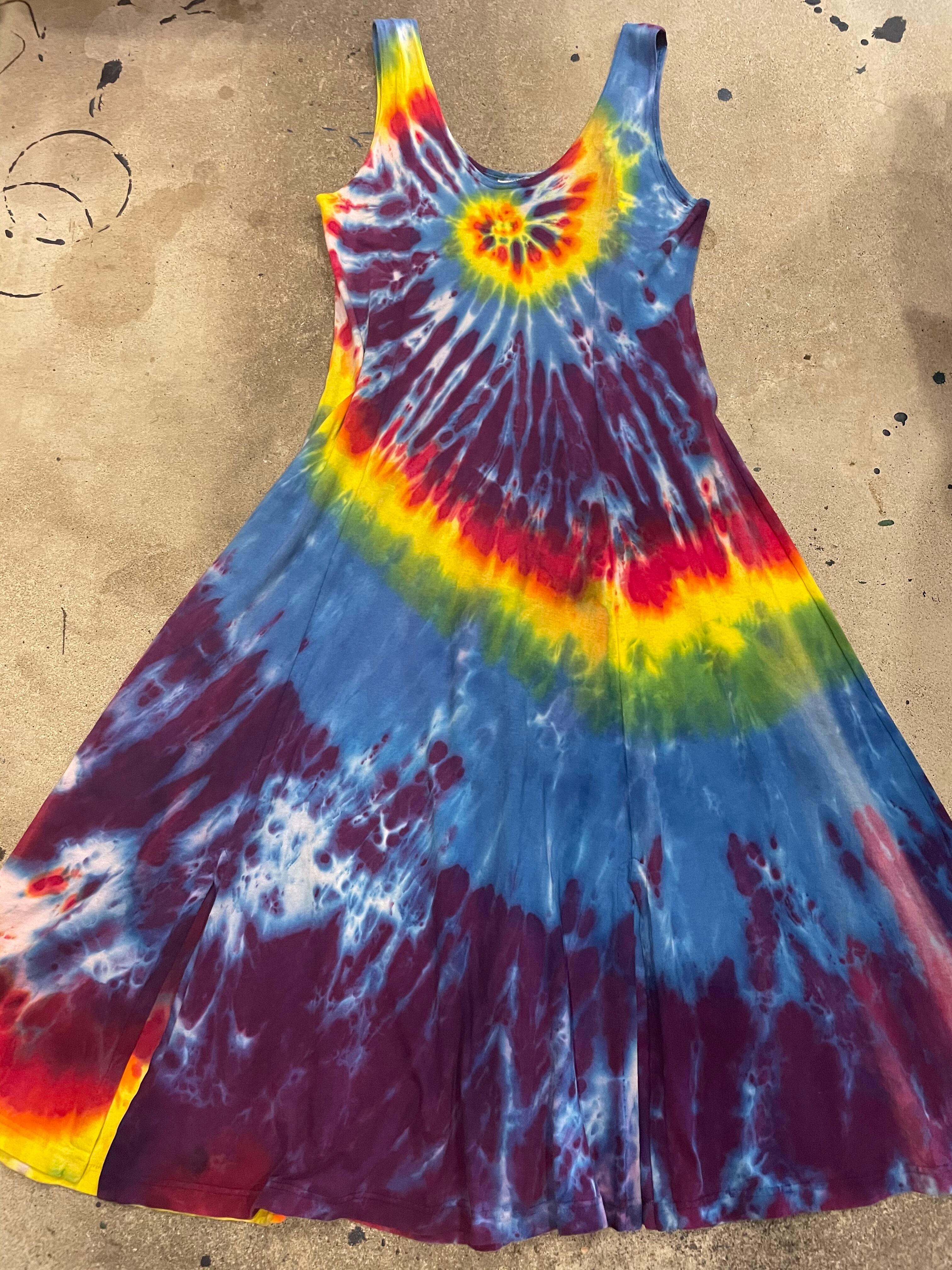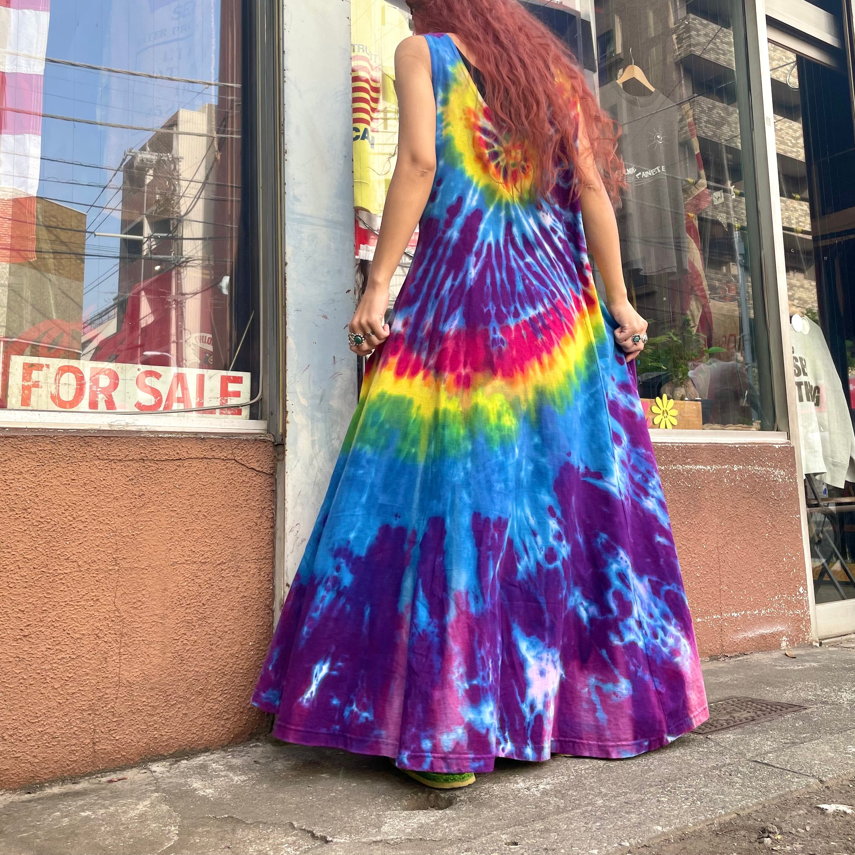 ザ・夏!なタイダイがかわいいワンピースです。パッキリ系のタイダイですので、かなりインパクトがあります。厚手のTシャツのような素材感でとても楽ですし、ボリュームやシルエットがとてもかわいいです。前に二箇所スリットが入っているのもポイントですね。