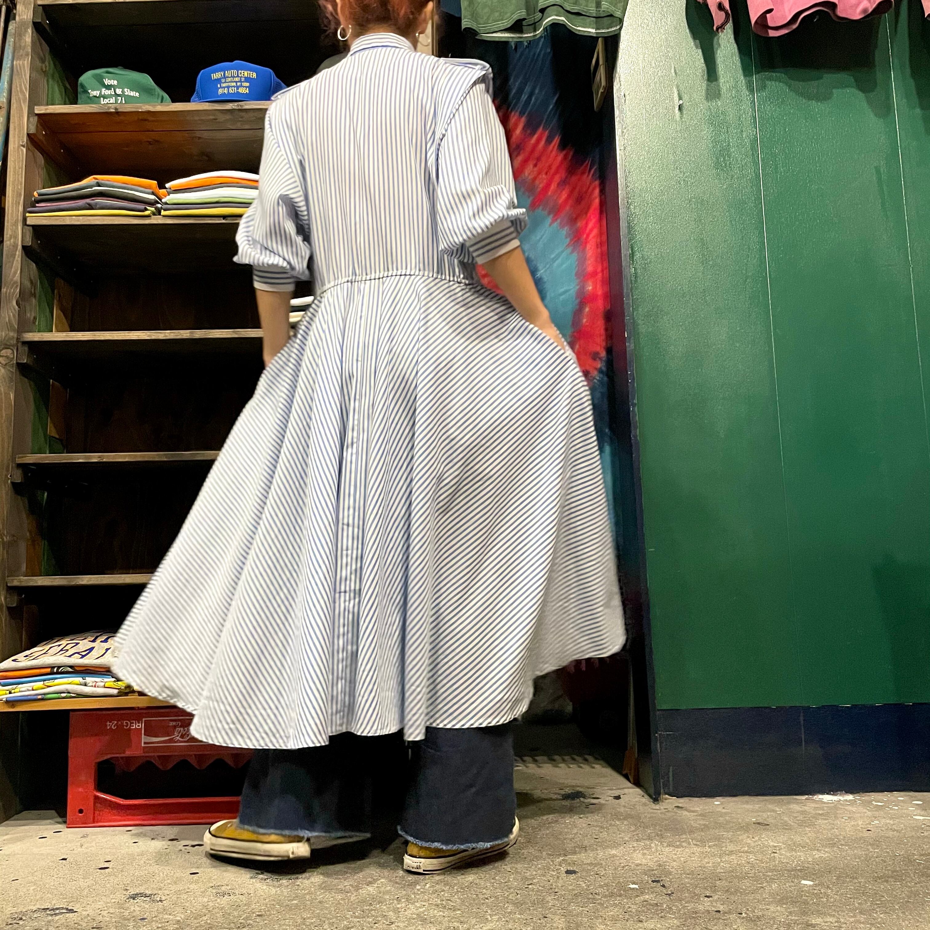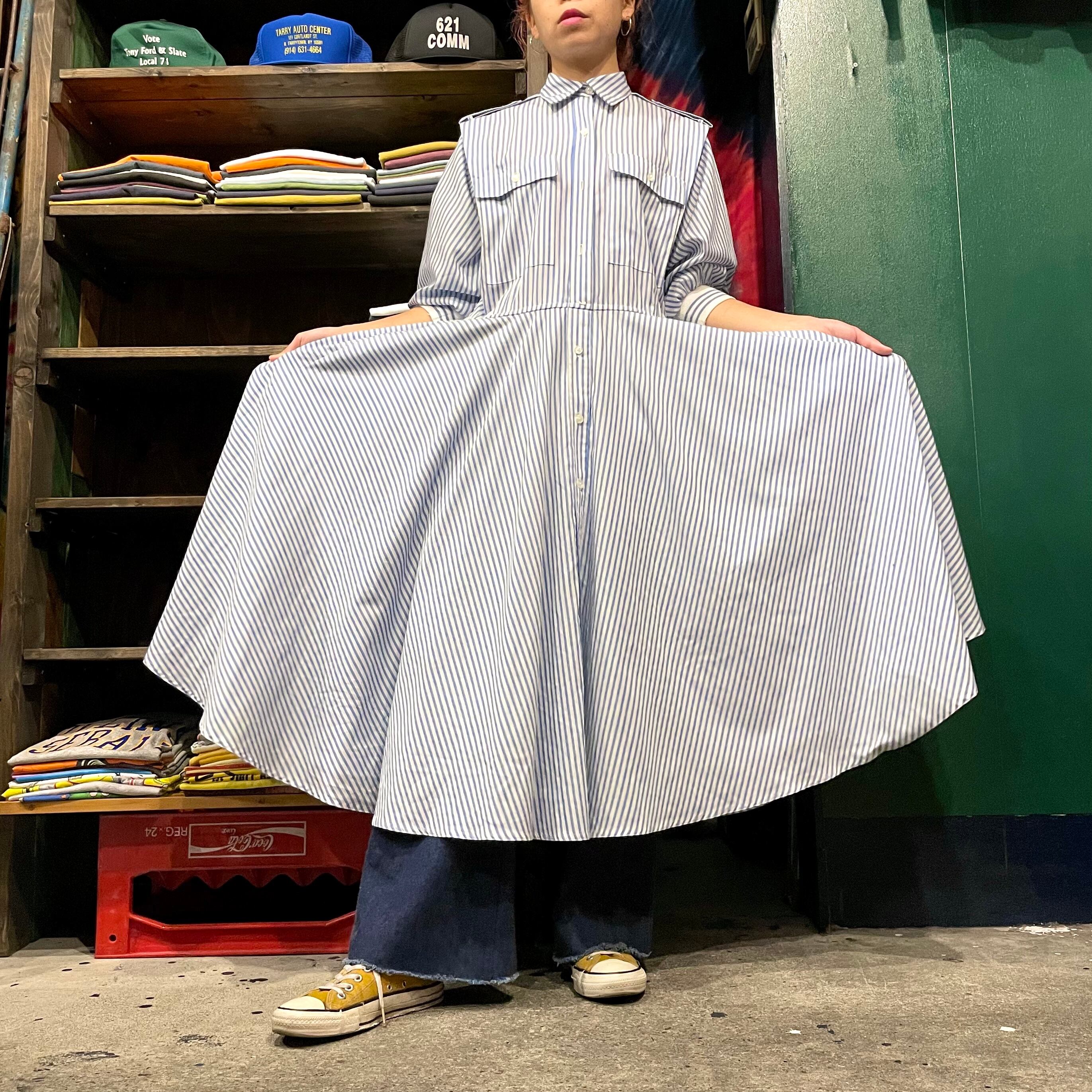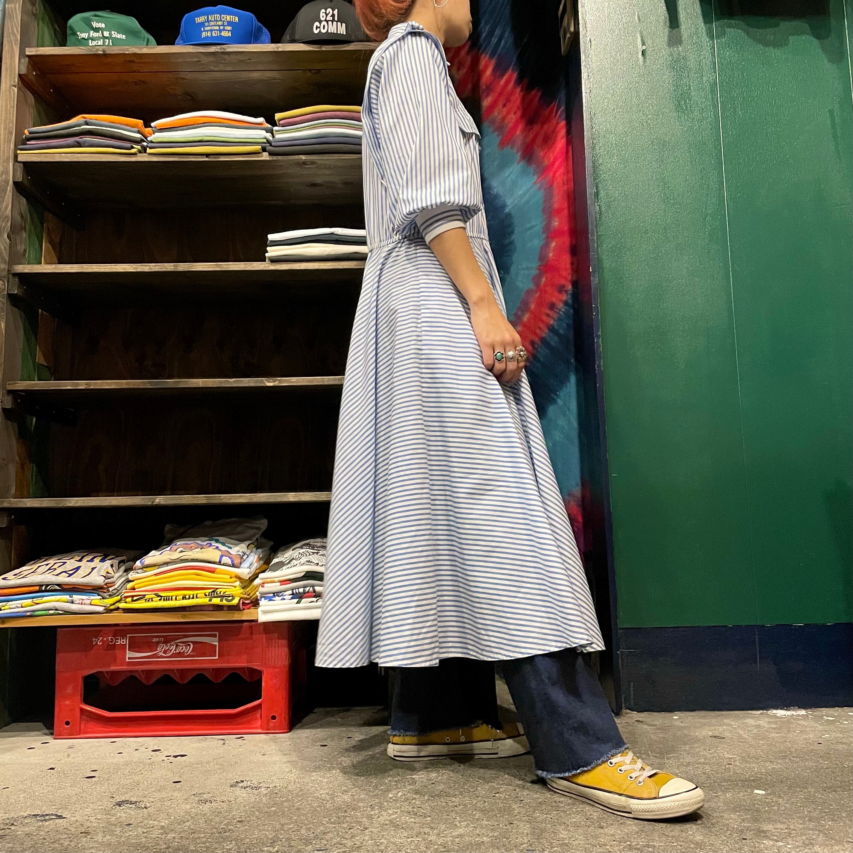 白と水色の爽やかなストライプがかわいいシャツワンピースです。