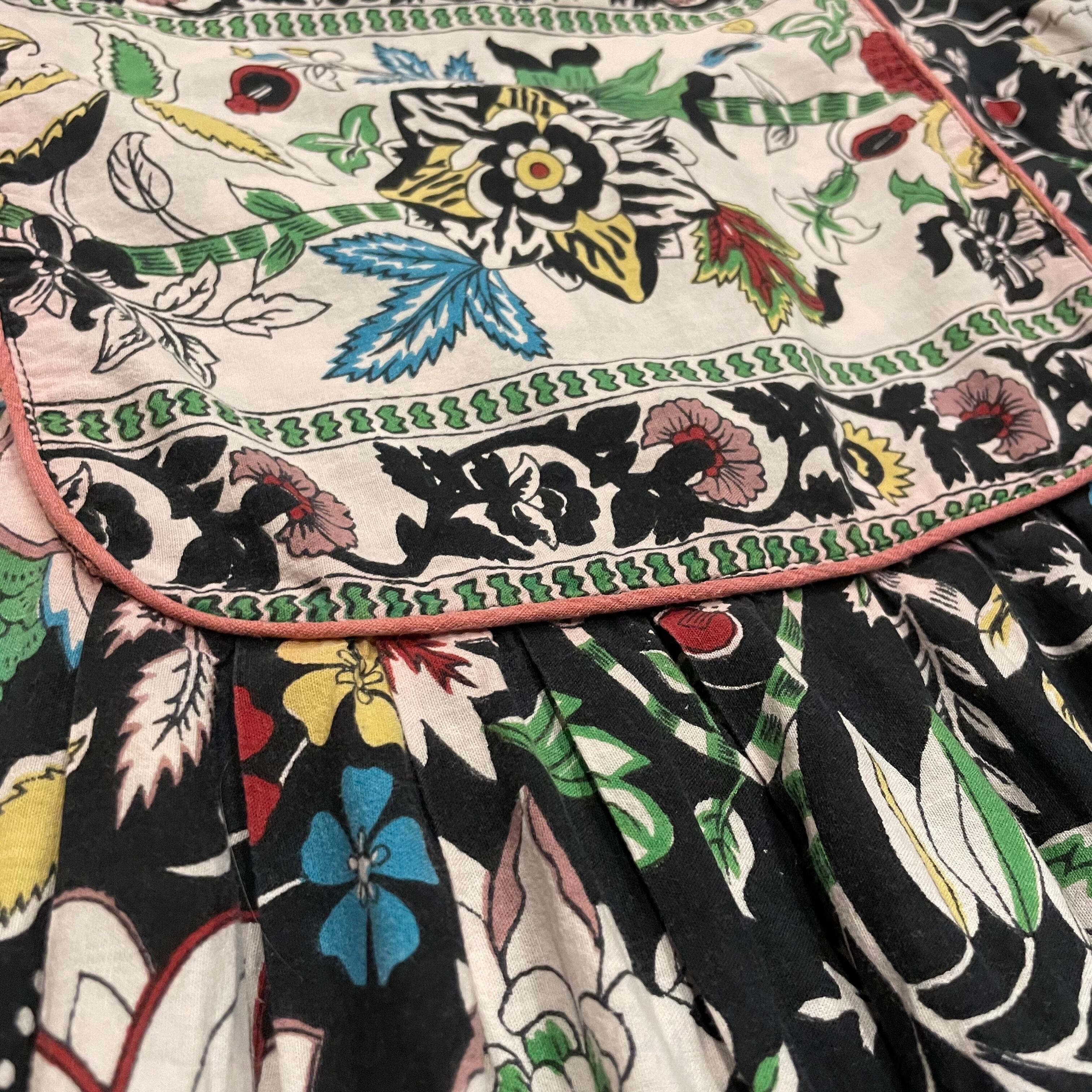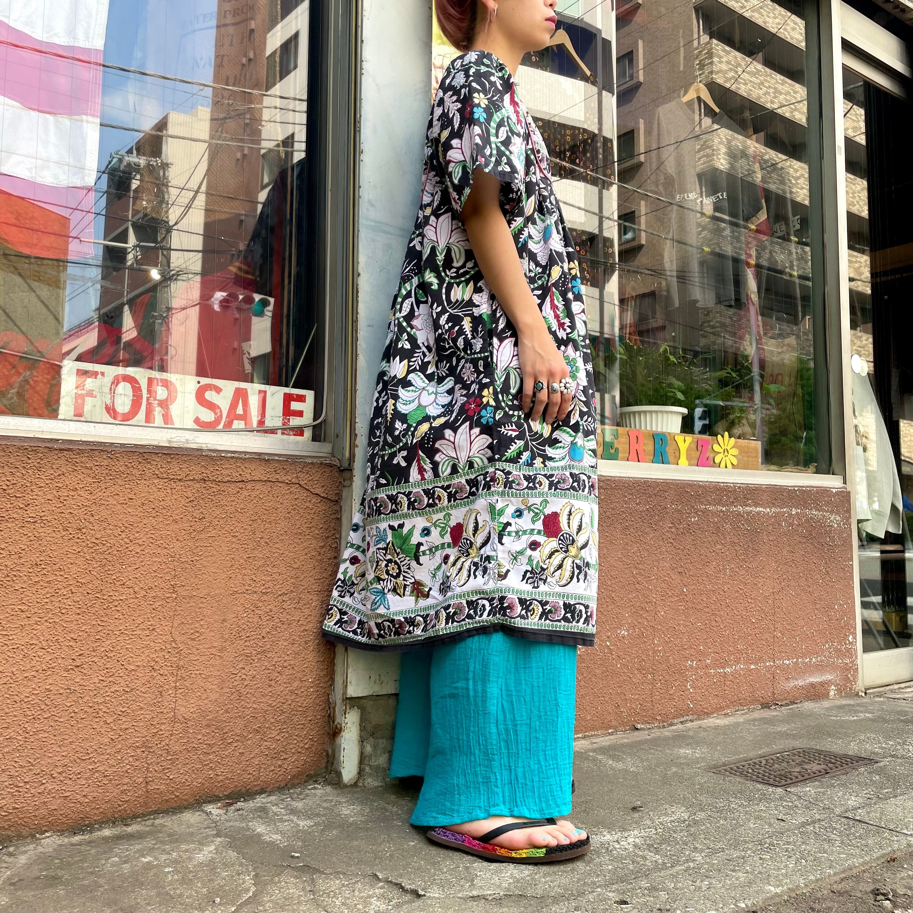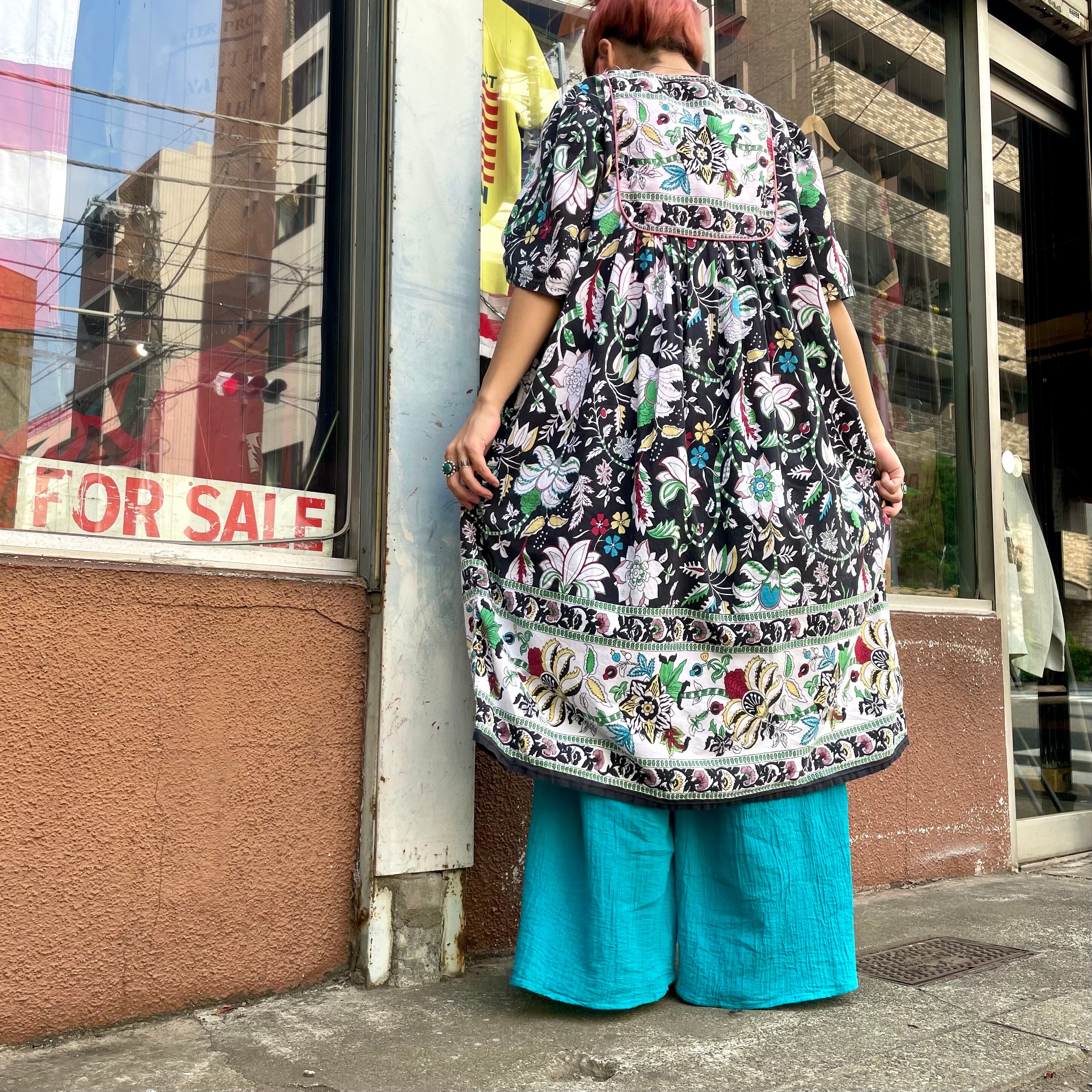 毒のありそうなお花達が良い感じです。膝下くらいの丈感ですので下にスカートやパンツを重ねても、一枚で靴下やサンダルで遊んでもかわいいですね!