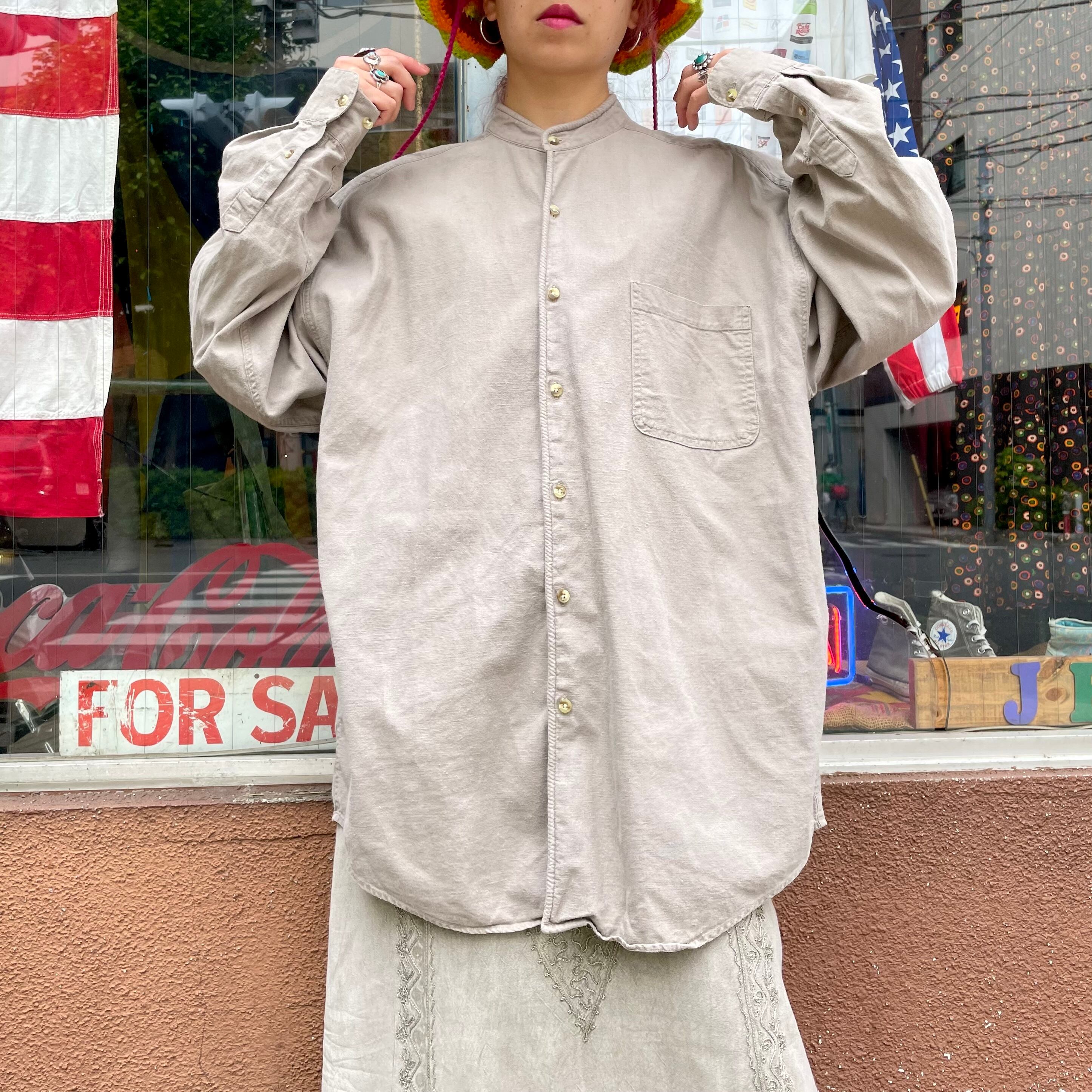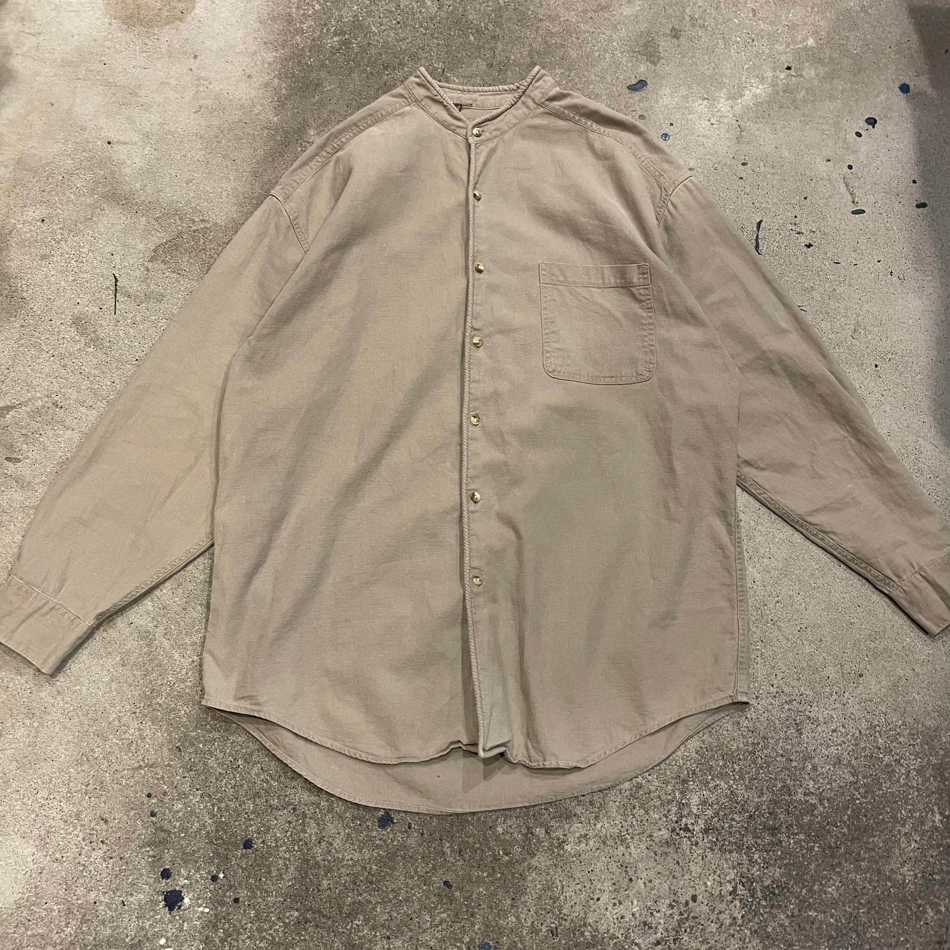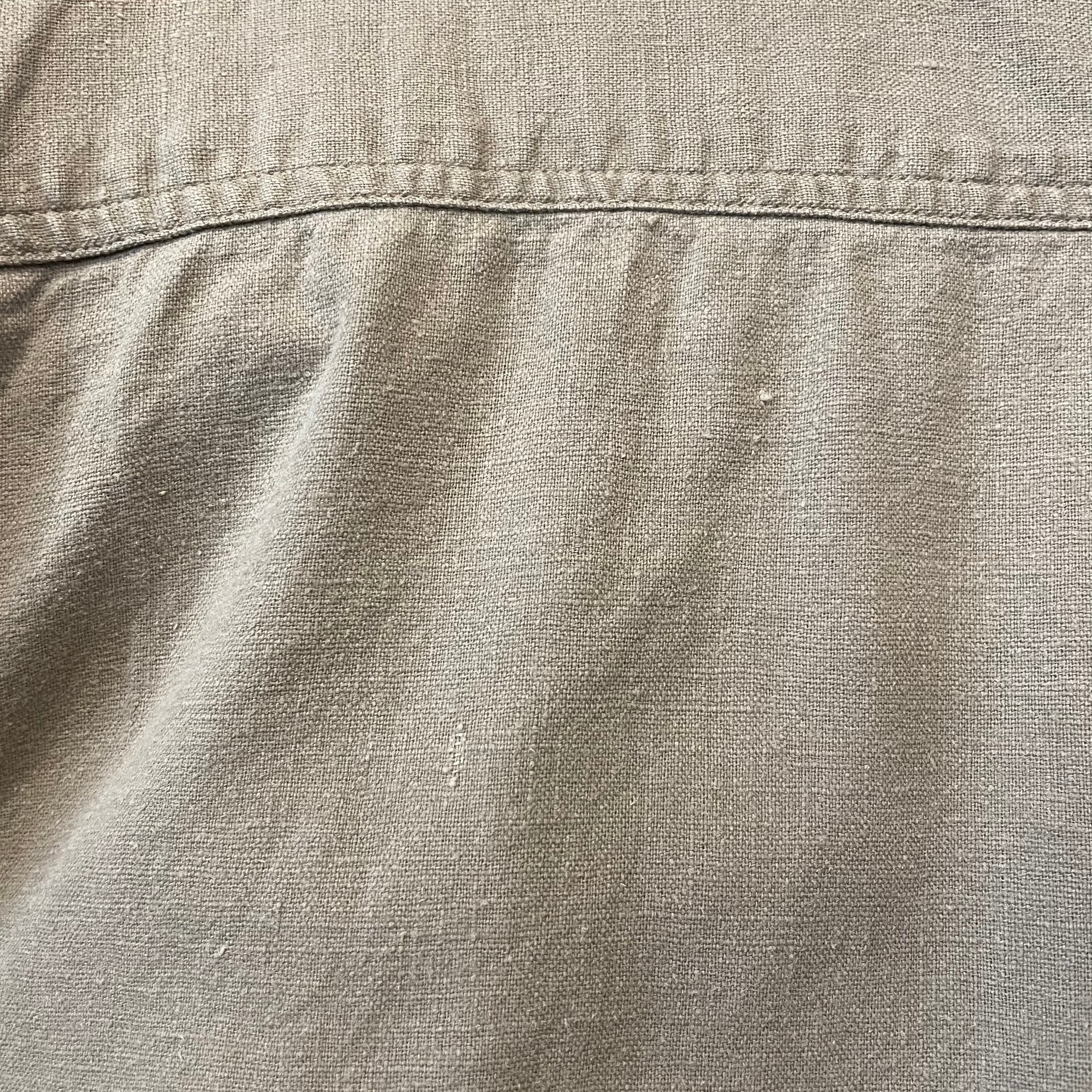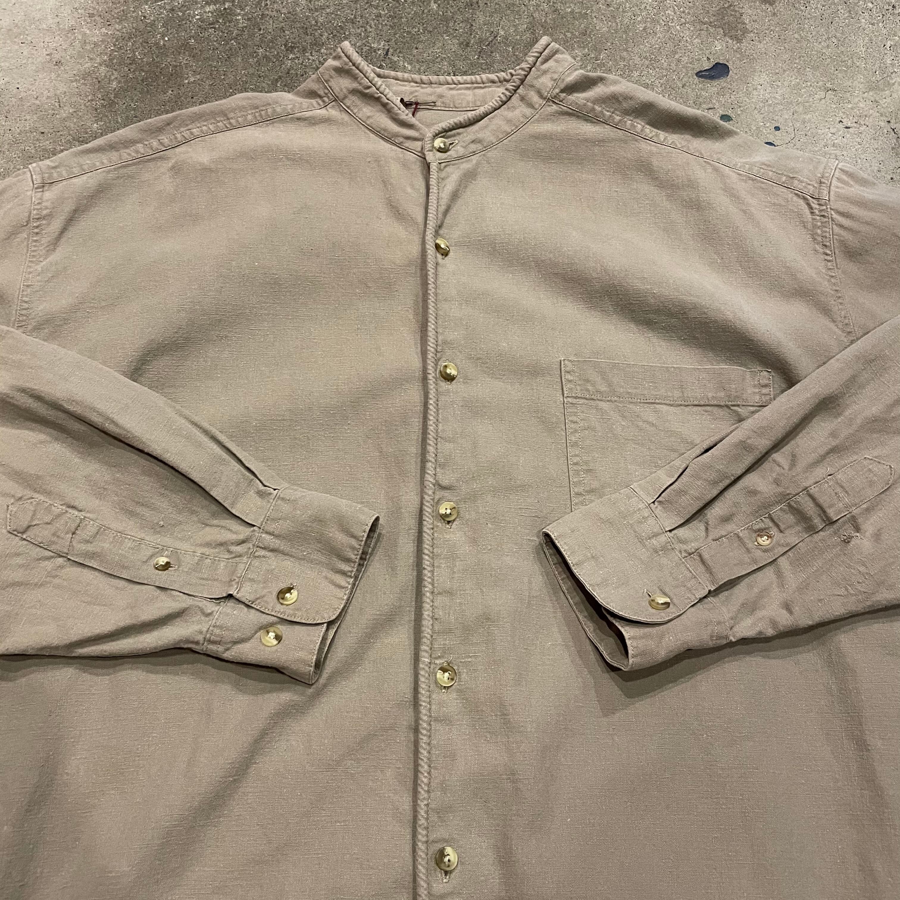 絶妙な色味が良い雰囲気のスタンドカラーシャツです。素材がリネンコットンで、その柔らかすぎずゴワゴワしすぎない肌触りが気持ち良いです。