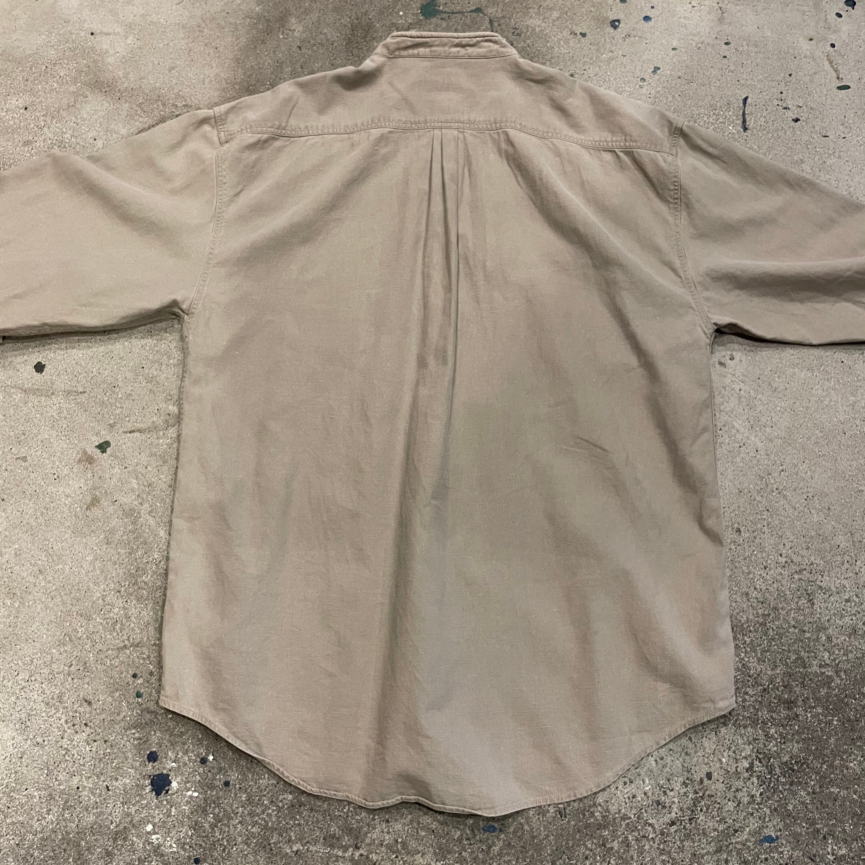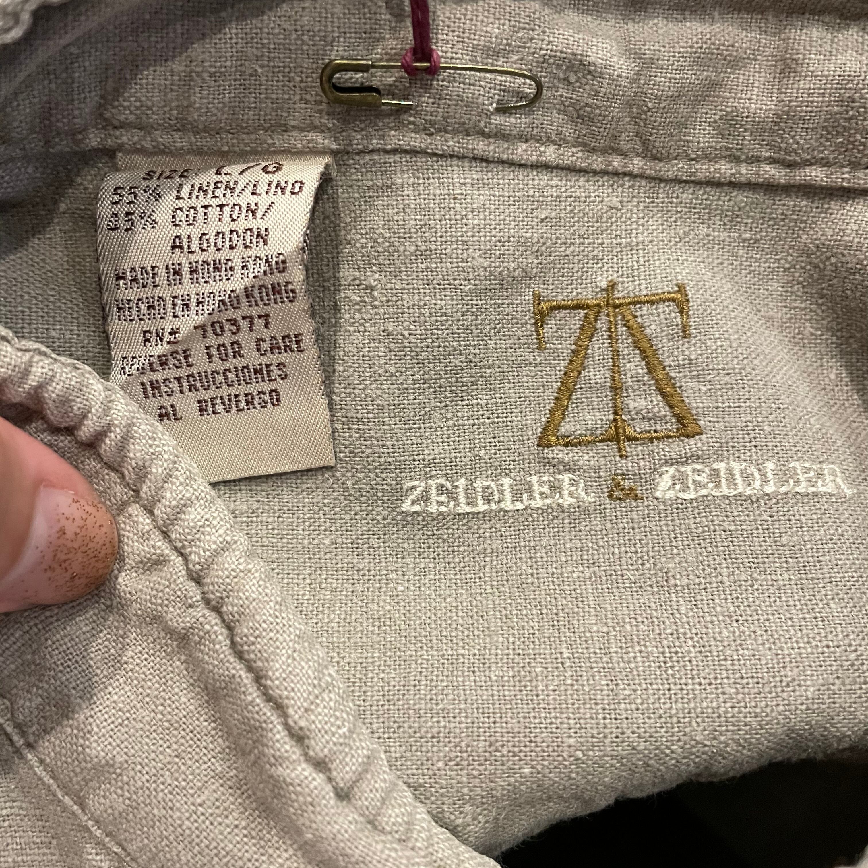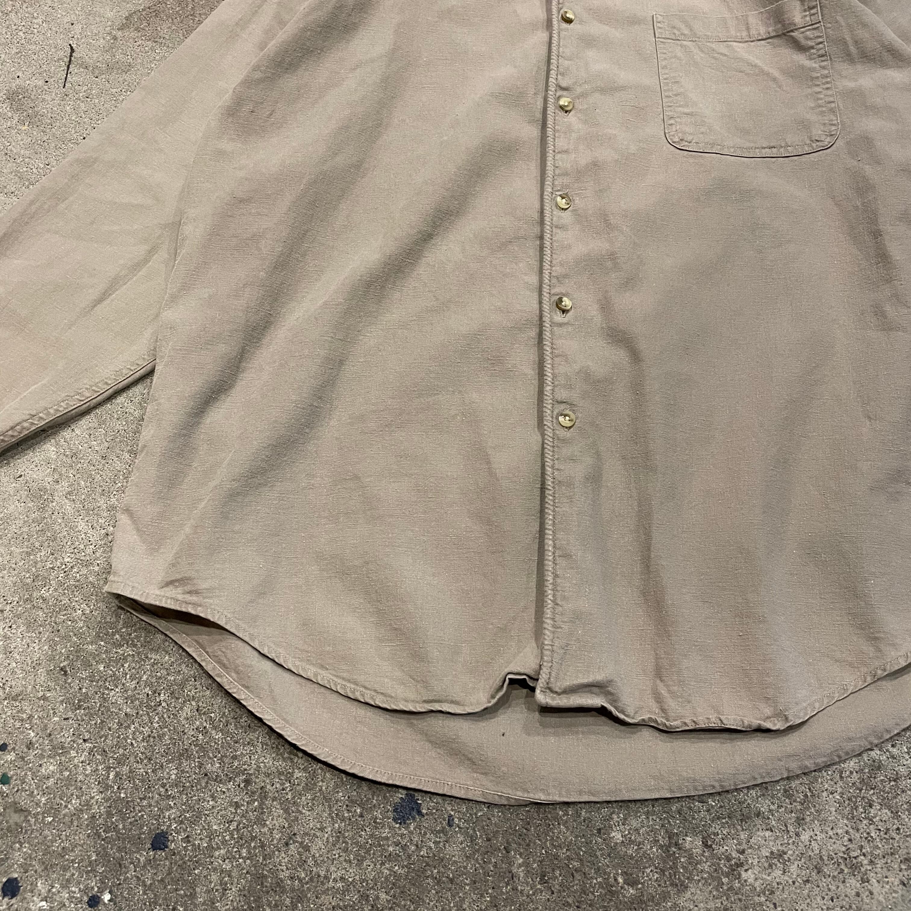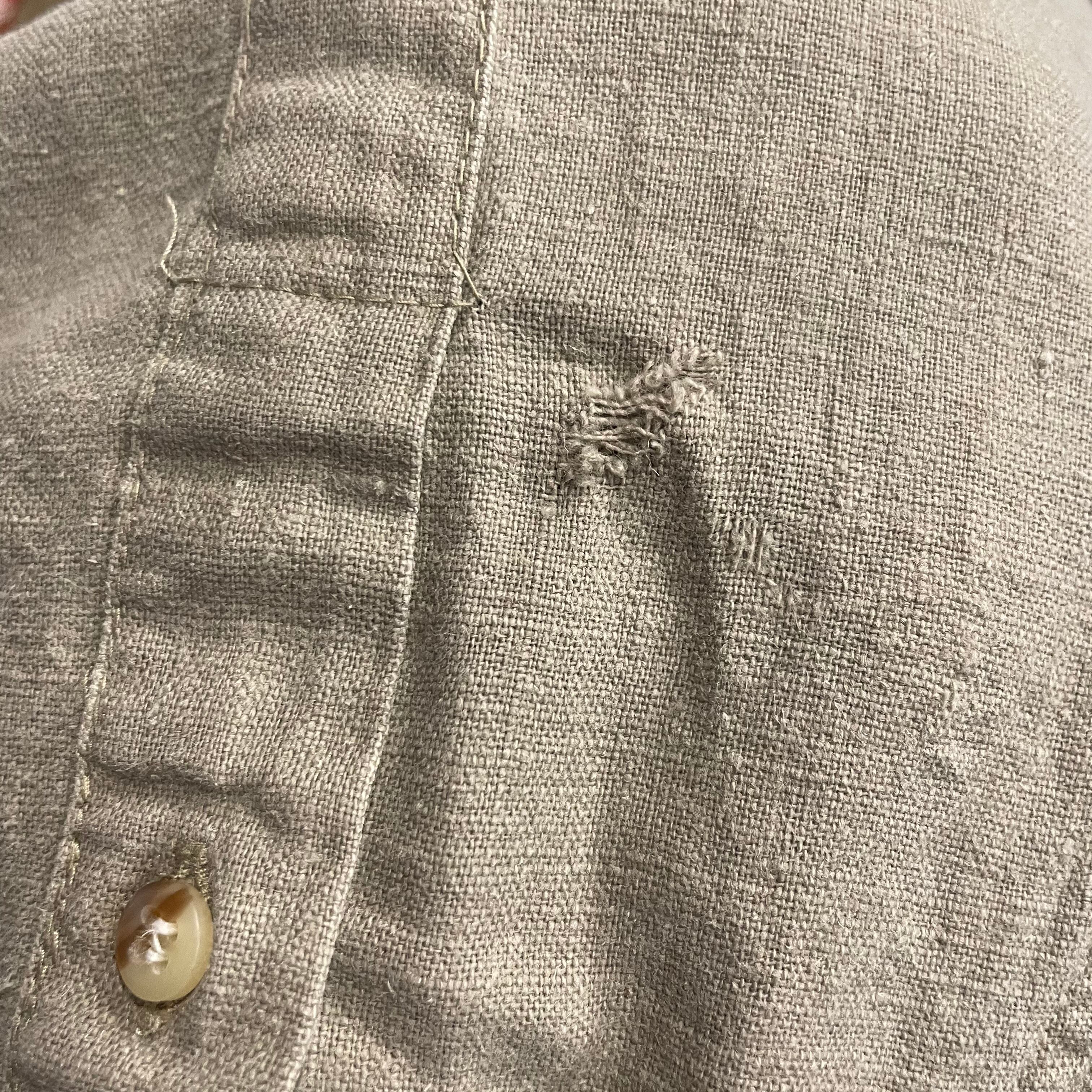 絶妙な色味が良い雰囲気のスタンドカラーシャツです。素材がリネンコットンで、その柔らかすぎずゴワゴワしすぎない肌触りが気持ち良いです。