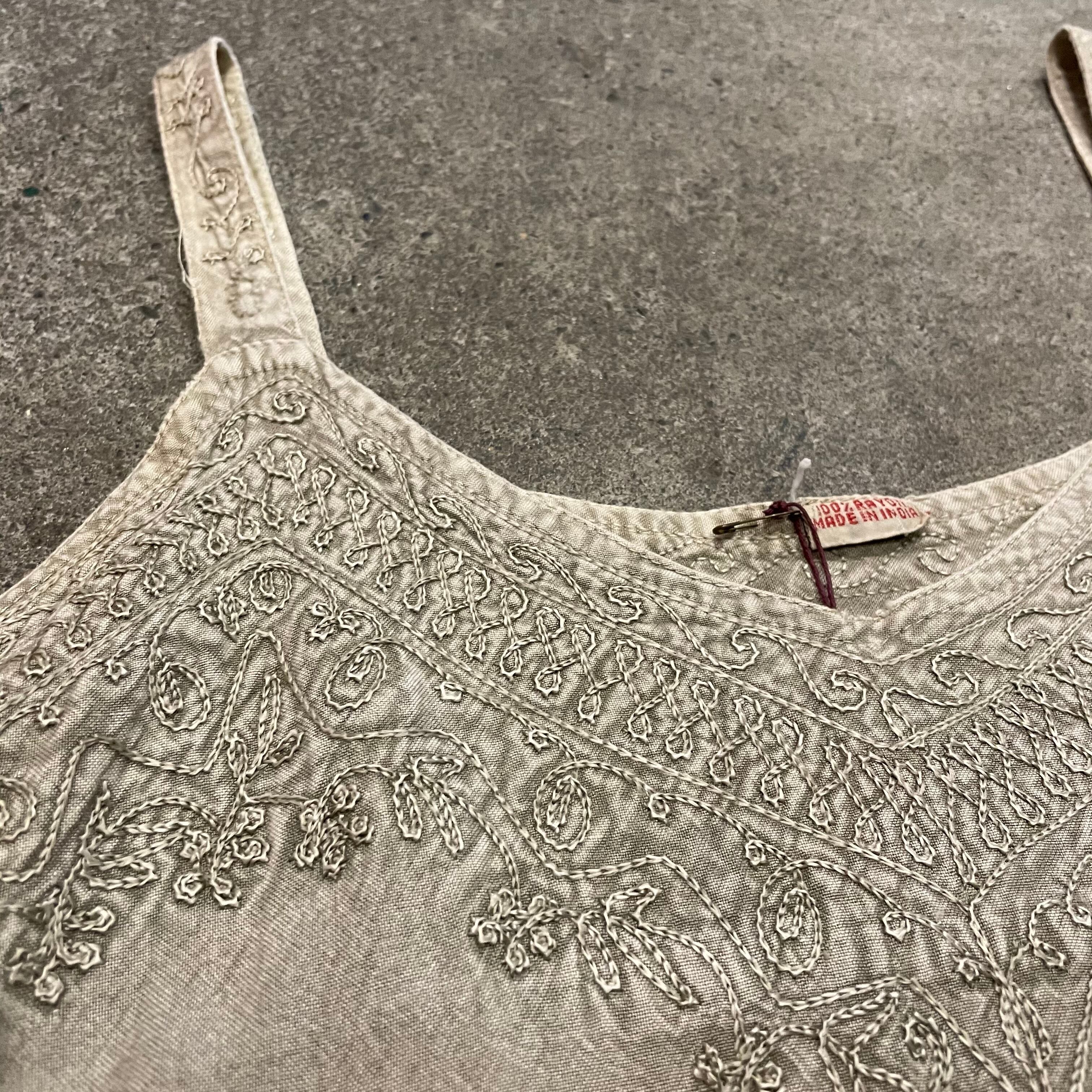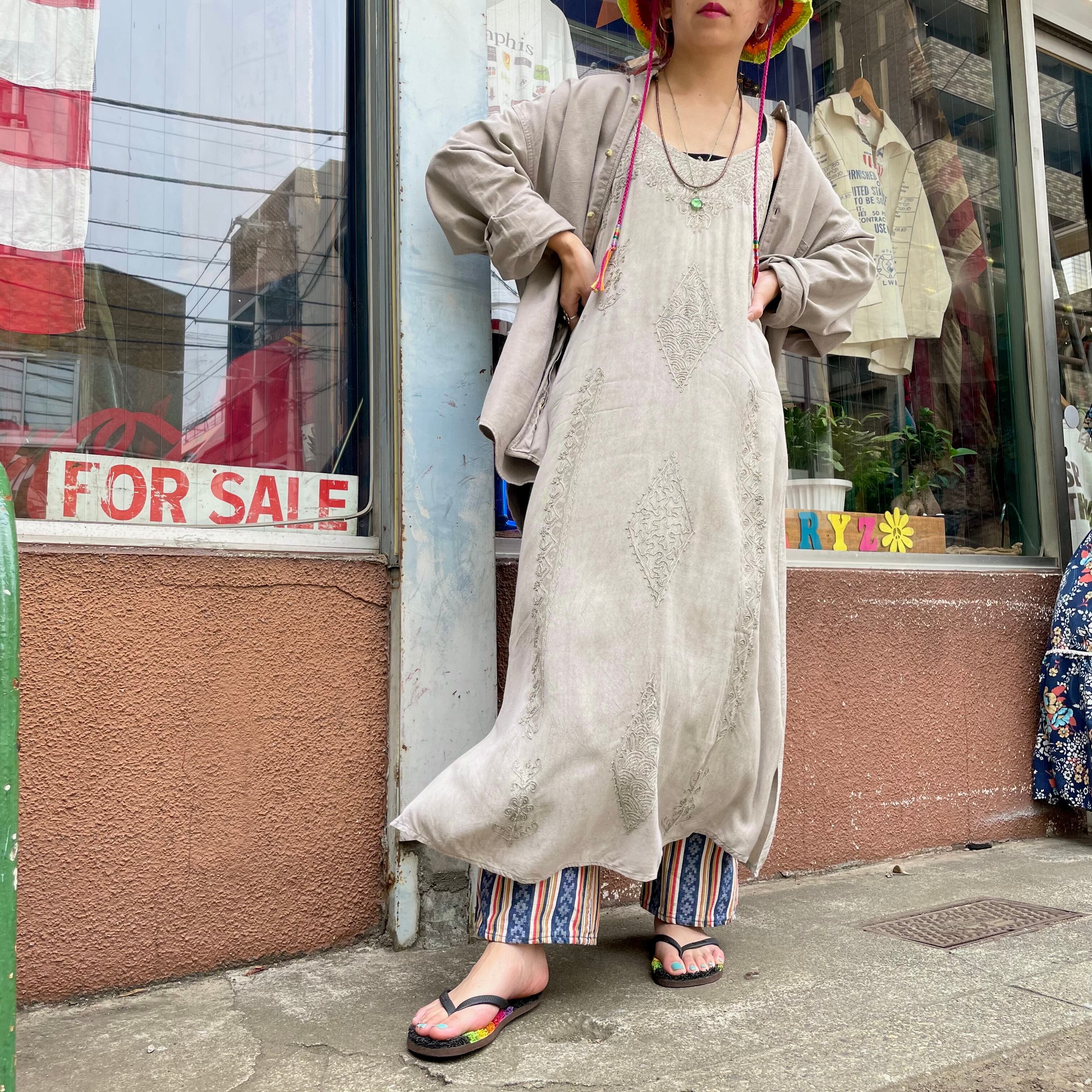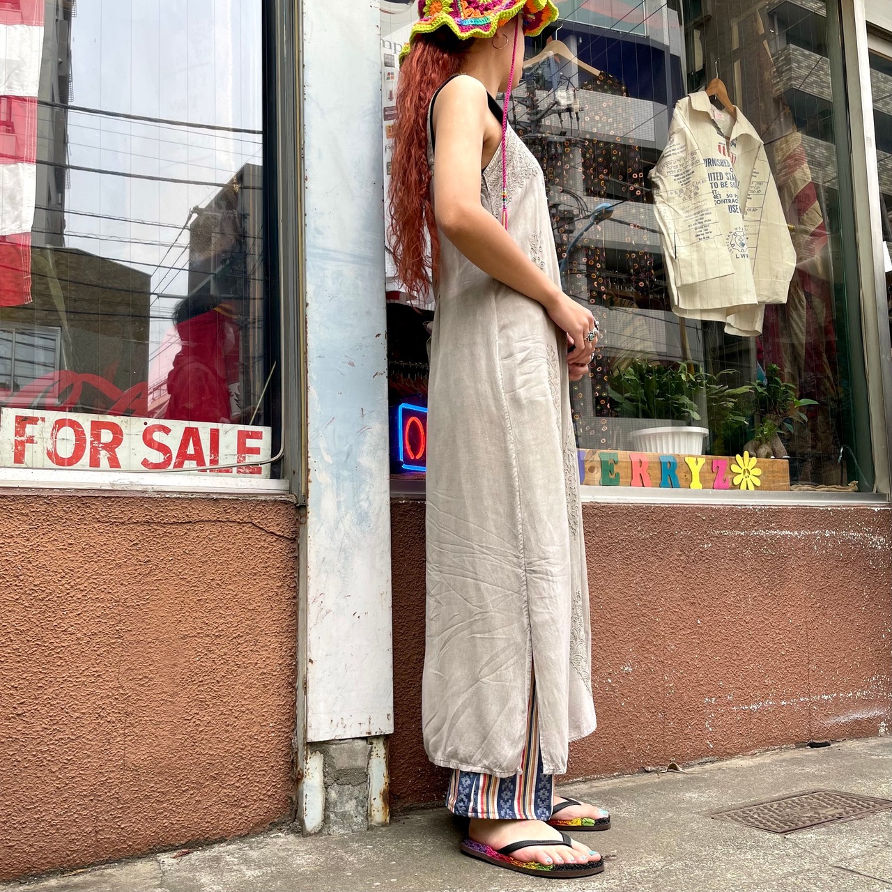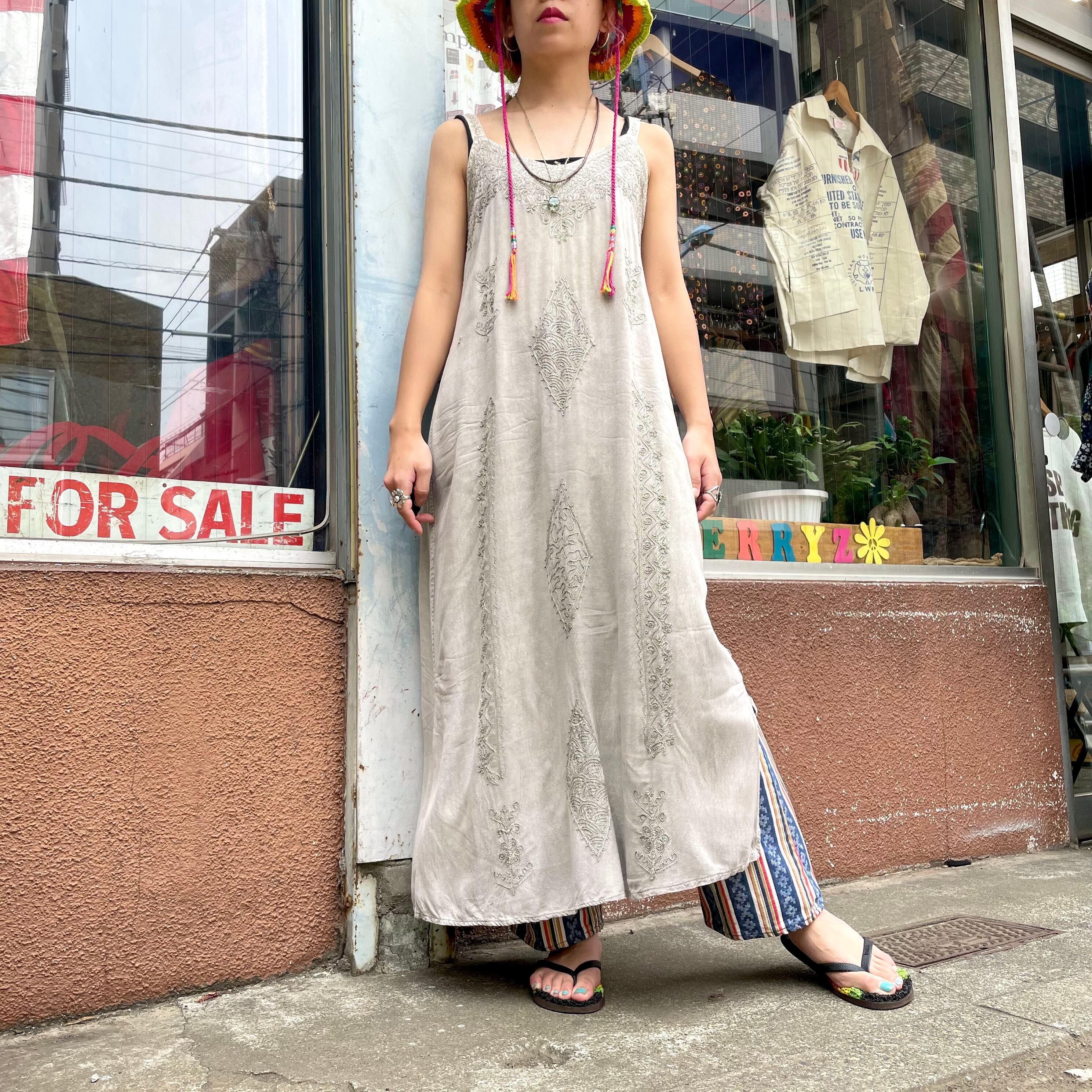 インド製のレーヨンキャミソールワンピースです。テロンと涼しい生地感と程よい異国感がかわいいです。さりげない刺繍も素敵です。