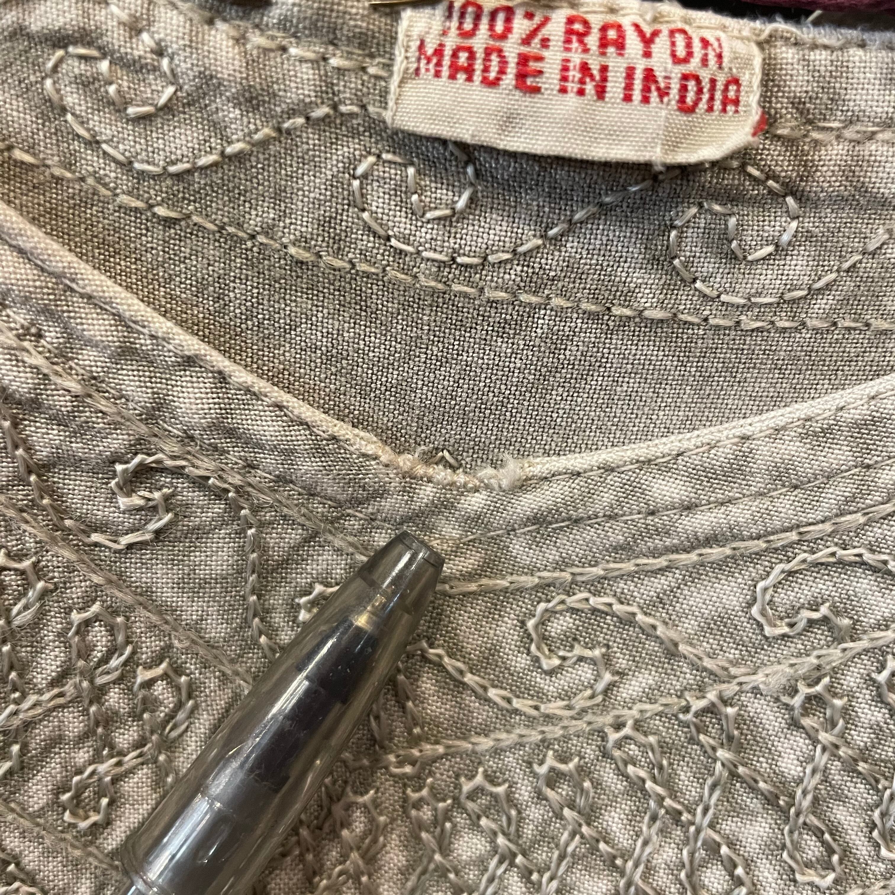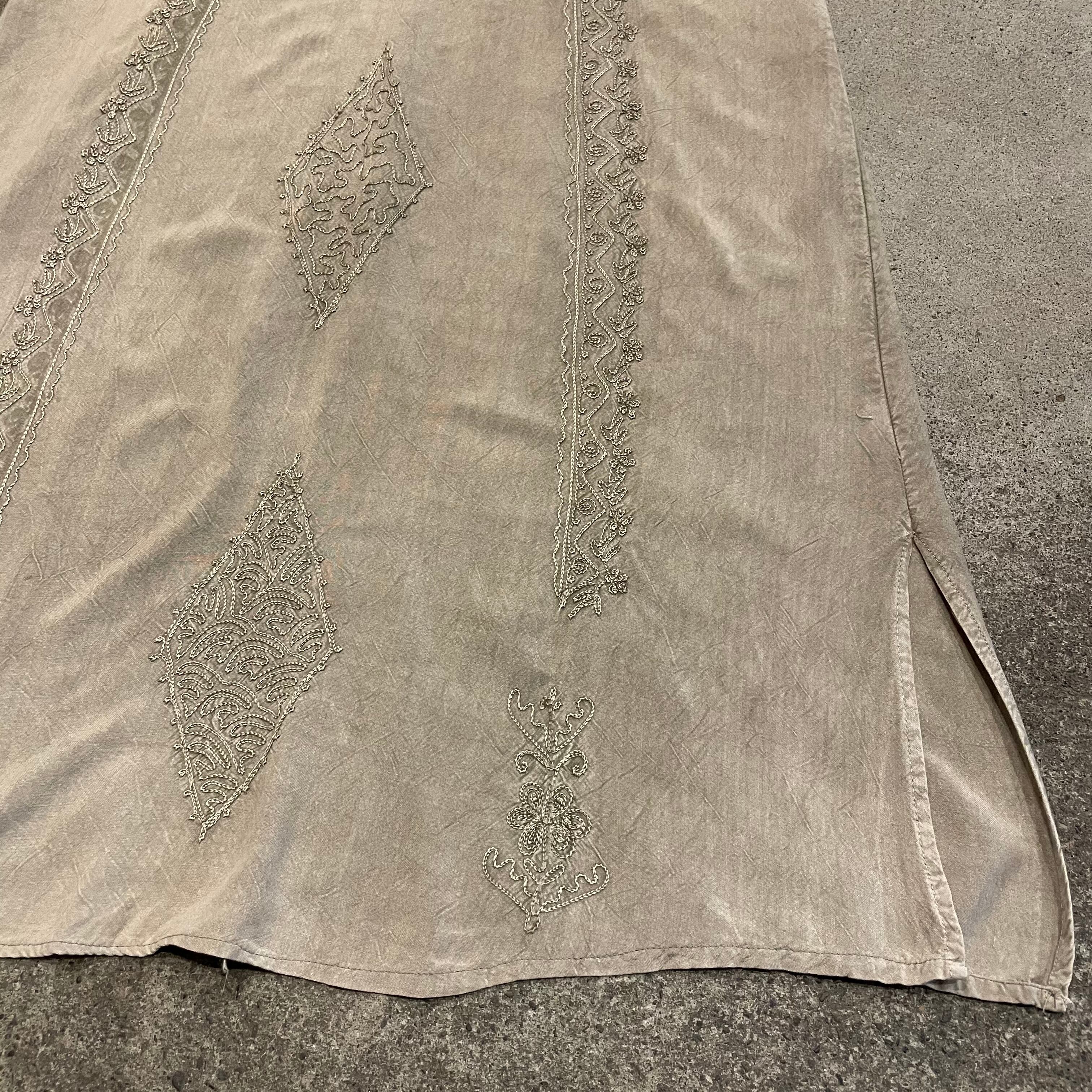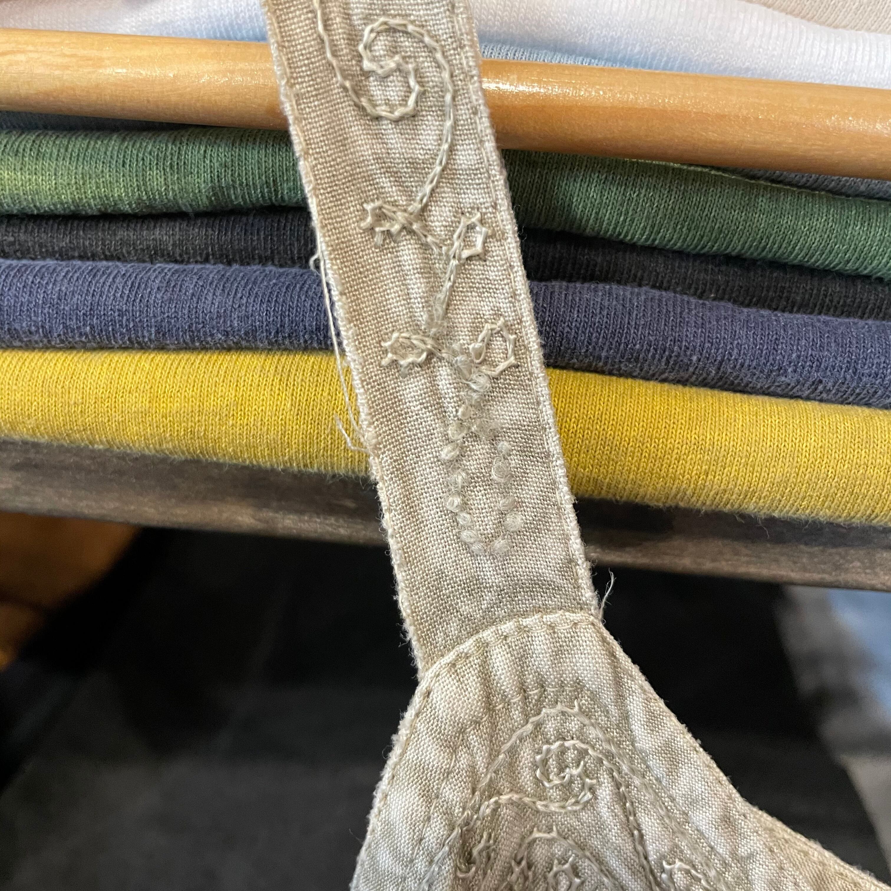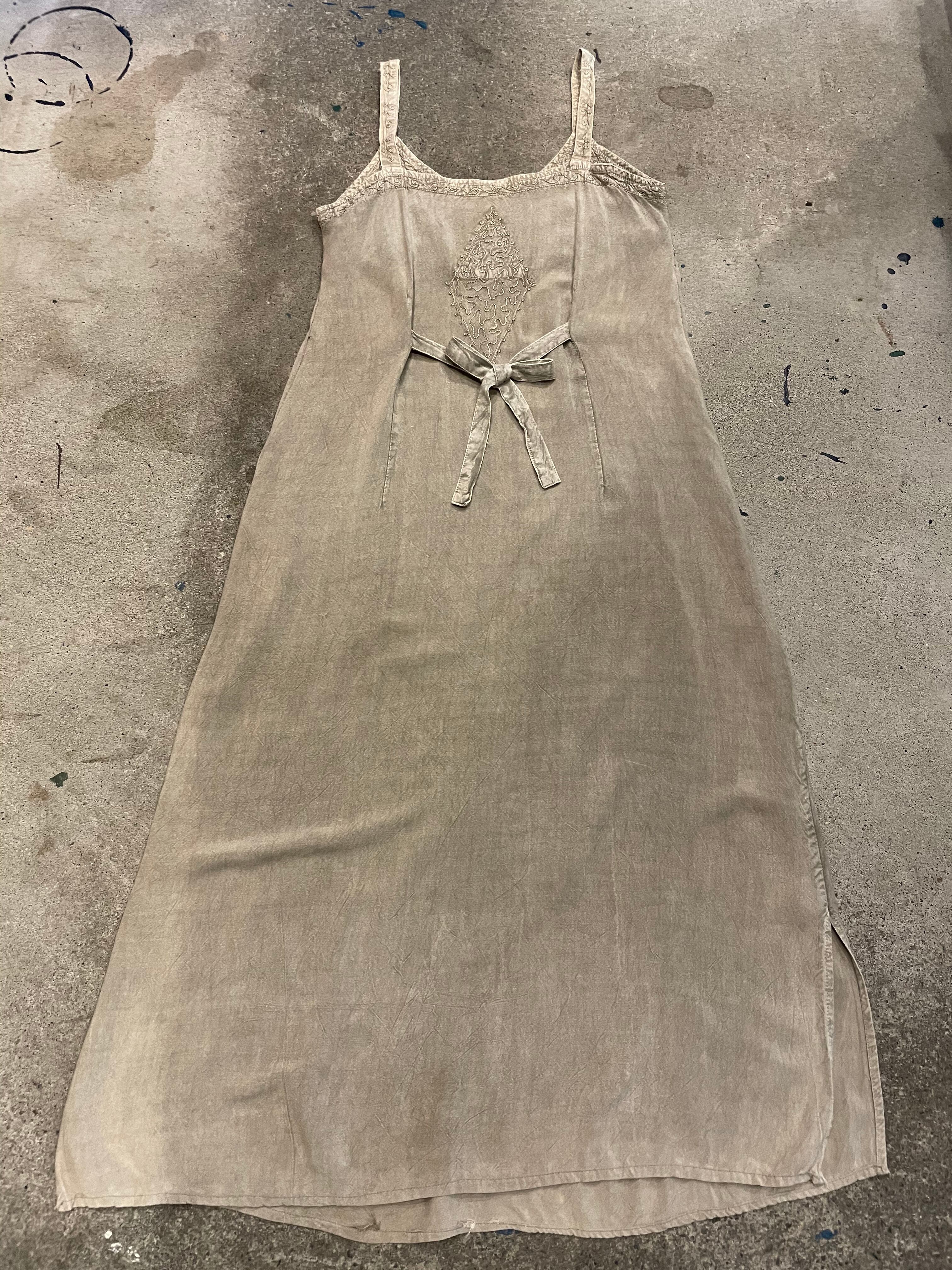 インド製のレーヨンキャミソールワンピースです。テロンと涼しい生地感と程よい異国感がかわいいです。さりげない刺繍も素敵です。
