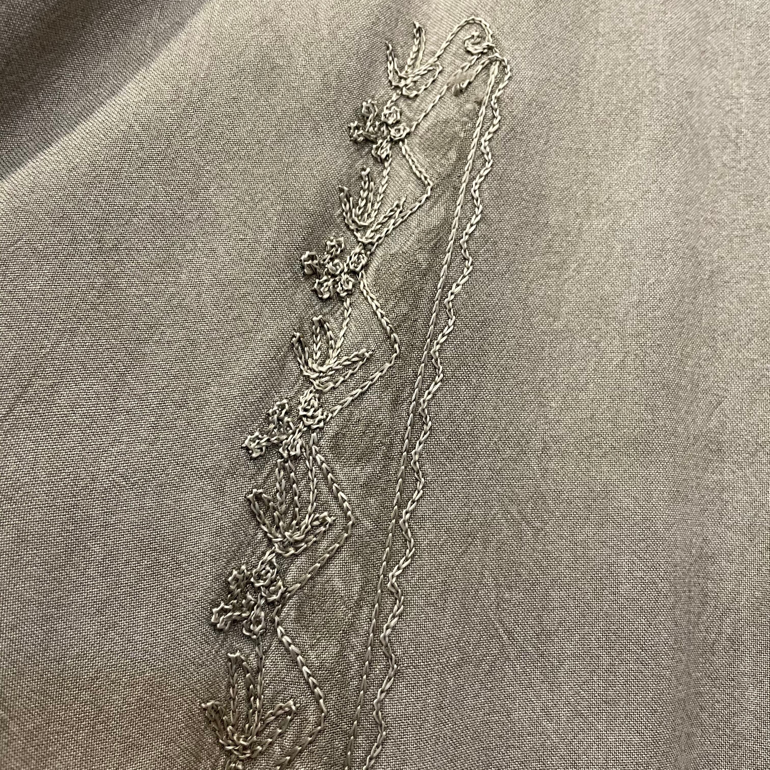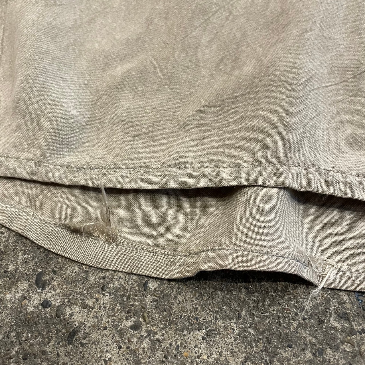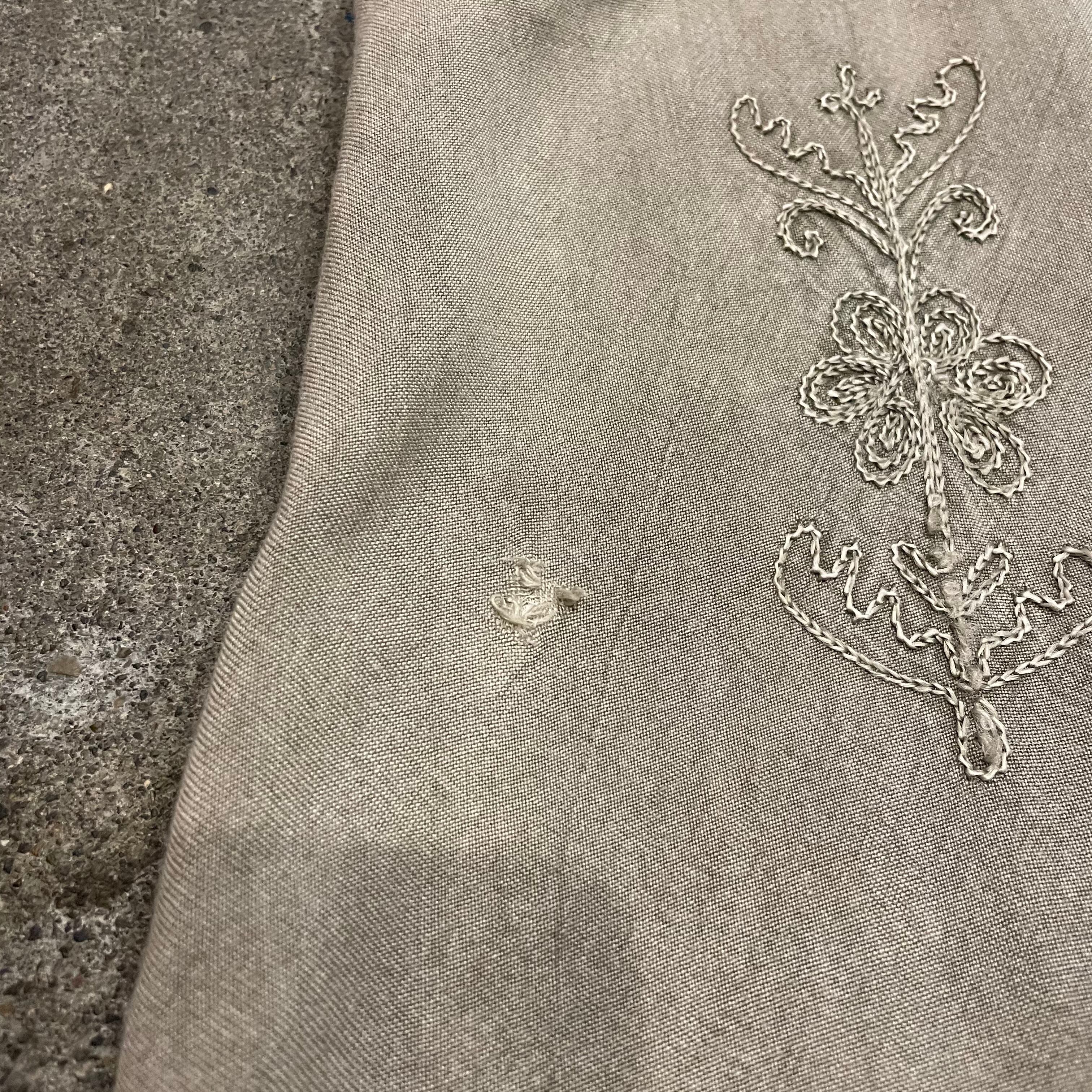 右脇下にキズがあり、裏から接着芯で留めてあります。刺繍糸が取れてしまっている部分、取れかけている部分、裾縫い代のほつれ、全体的な色むら等ダメージが多数ございます。かなり使用感のある商品ですので古着にご理解のある方のご購入をお願い致します。