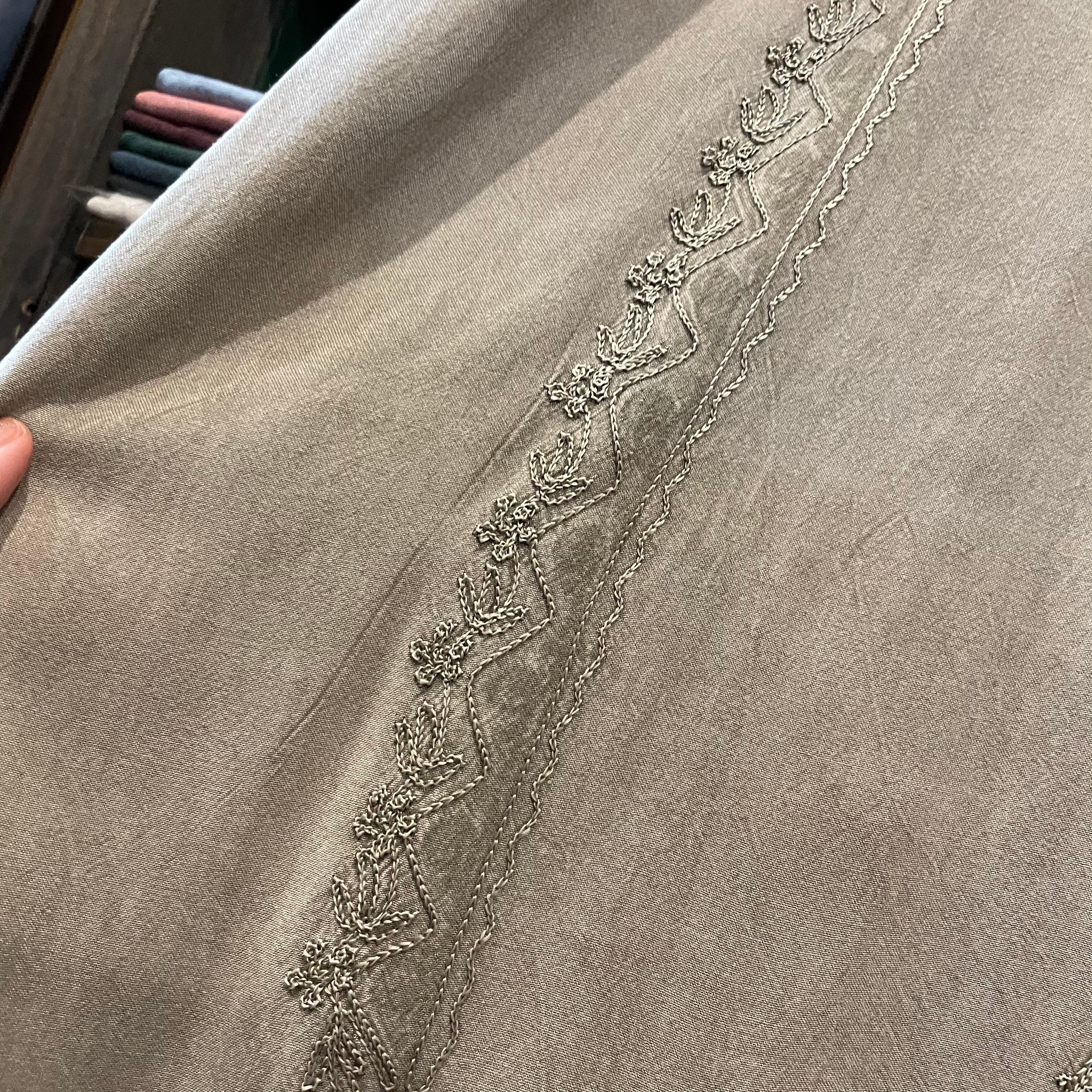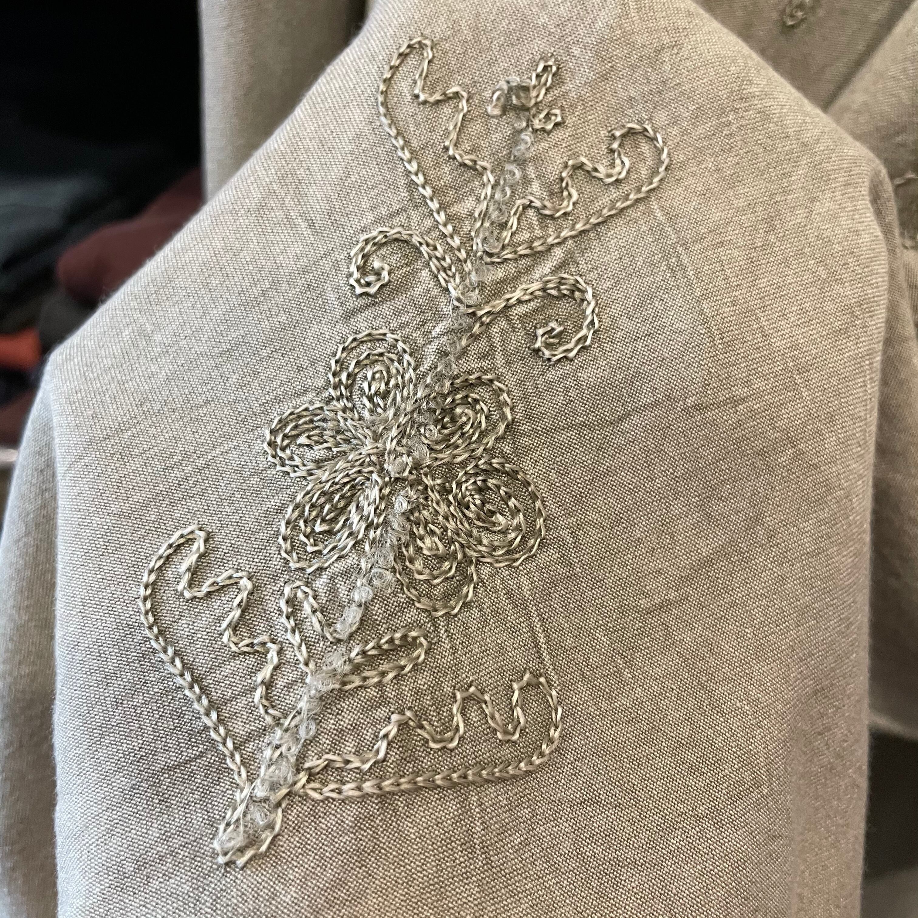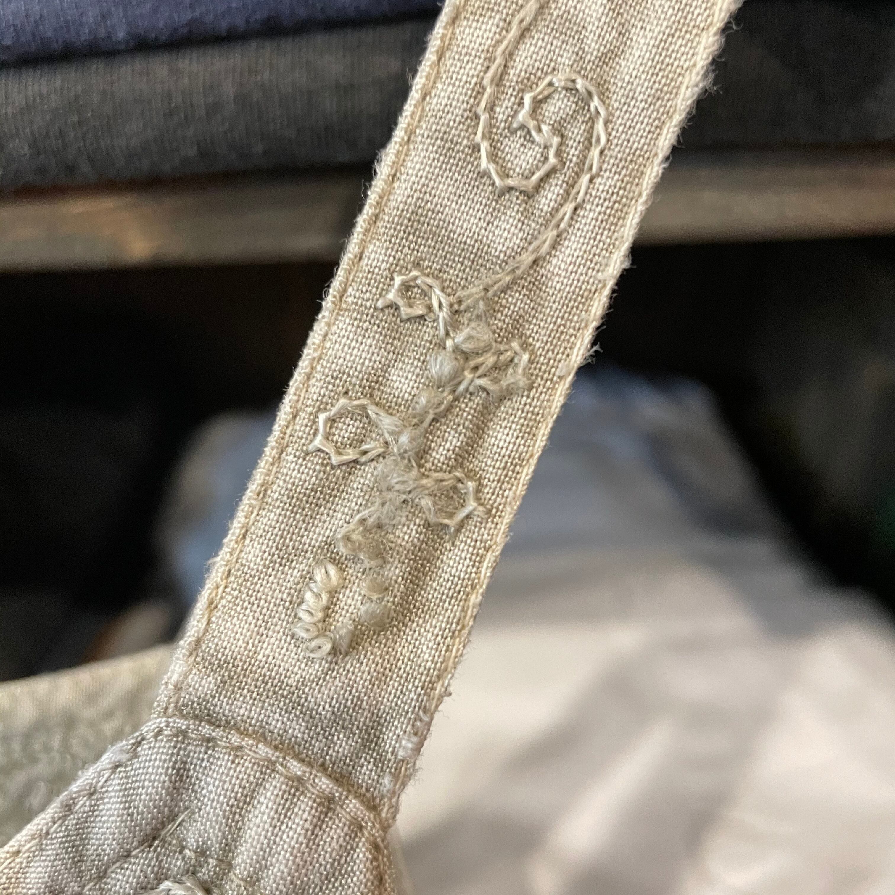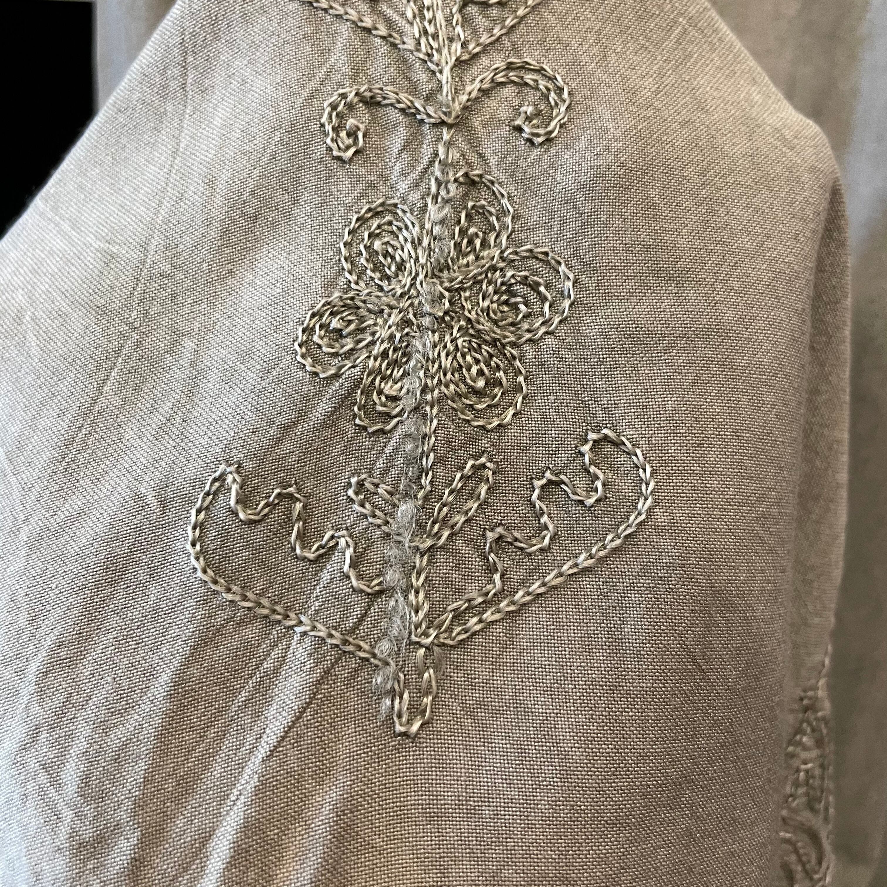 右脇下にキズがあり、裏から接着芯で留めてあります。刺繍糸が取れてしまっている部分、取れかけている部分、裾縫い代のほつれ、全体的な色むら等ダメージが多数ございます。かなり使用感のある商品ですので古着にご理解のある方のご購入をお願い致します。