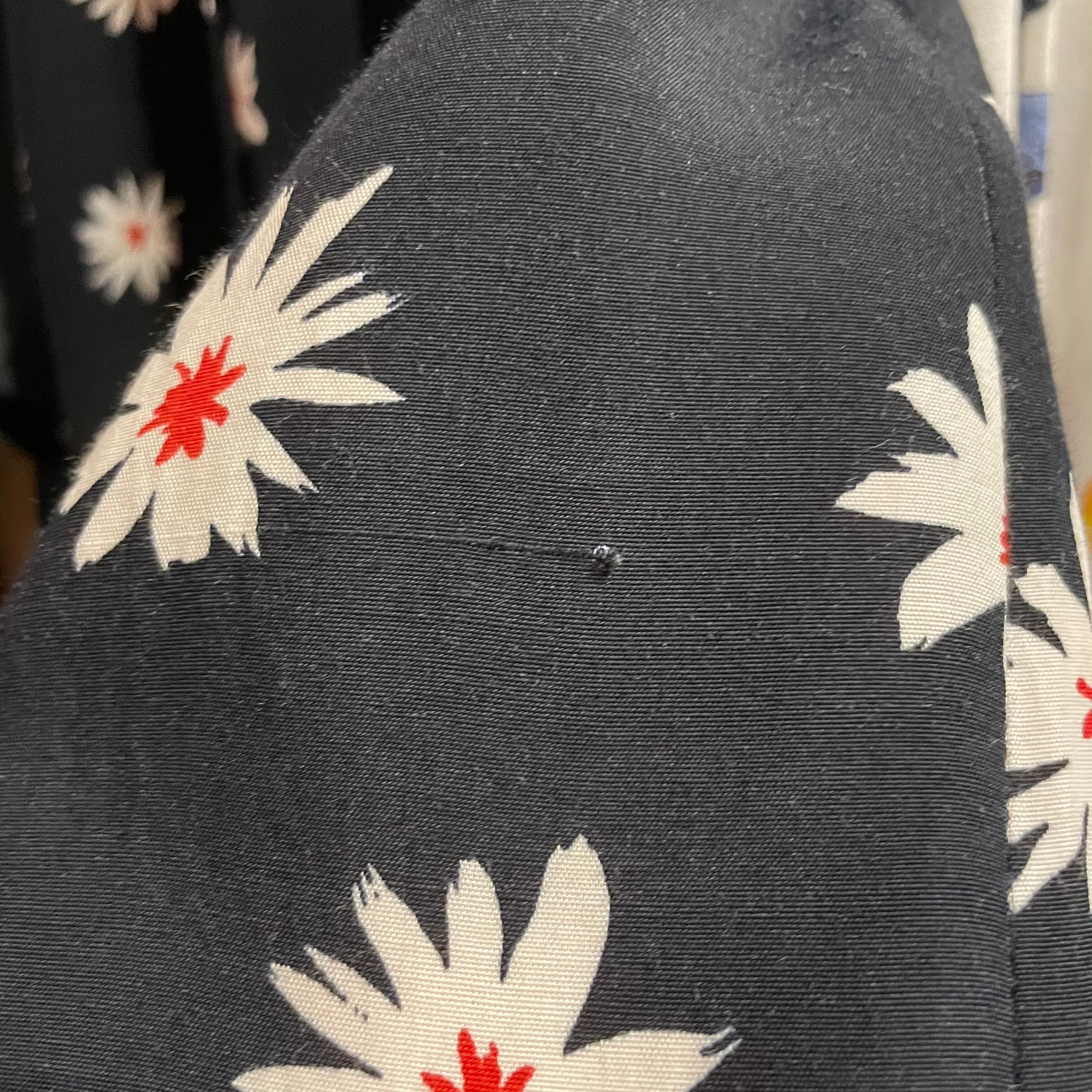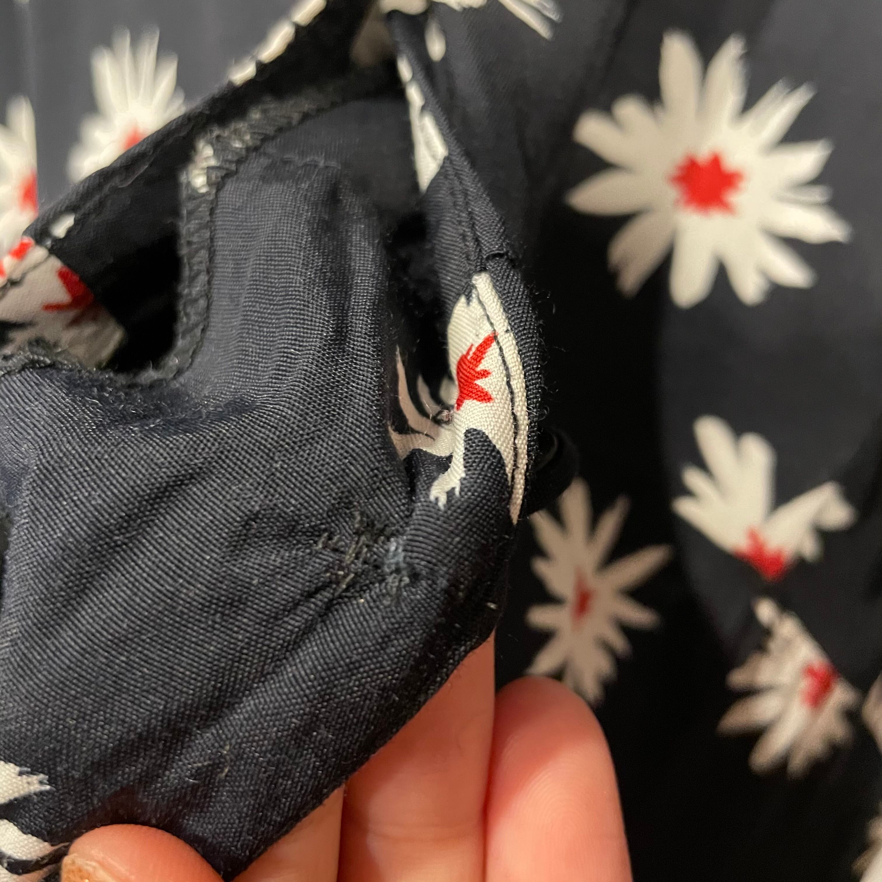 生地に擦れたようなダメージが多数あります。1番目立つところは左肩で、そのほかにも様々な場所に見受けられます。ウエストのボタン部分にリペアがあります。小さいキズがあります。写真をご確認の上、古着にご理解のある方のご購入をお願い致します。
